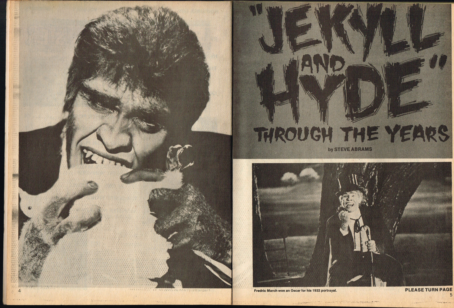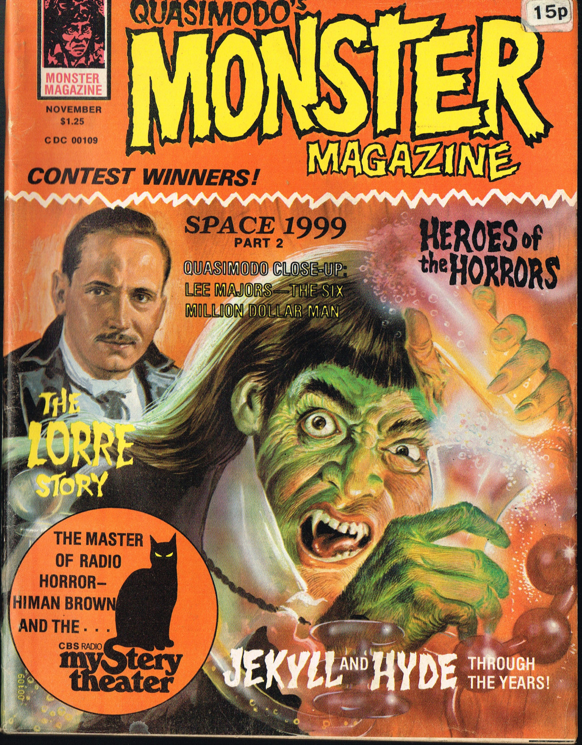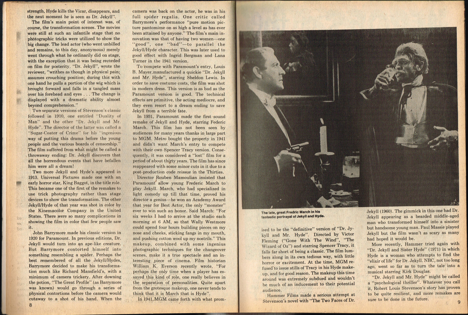 Jekyll and Hyde: Through the Years, by Steve Abrams, kicks off this jam-packed issue 5 of Quasimodo’s Monster Magazine. Ron Weiss’s Heroes of the Horrors gives credit where credit is due as he interviews Calvin Beck, and Judith M. Kass interviews Himan Brown, creator of the CBS Radio Mystery Theater. Television coverage is provided for The Six Million Dollar Man and Space 1999, and Peter Lorre bio is given by Sharon Phillips. And, of course, the Gone Apes! section provides the gag-captioned photos we’ve come to expect from monster magazines published around this time. All in all, a stellar issue of monster coverage that’s informative as well as entertaining.