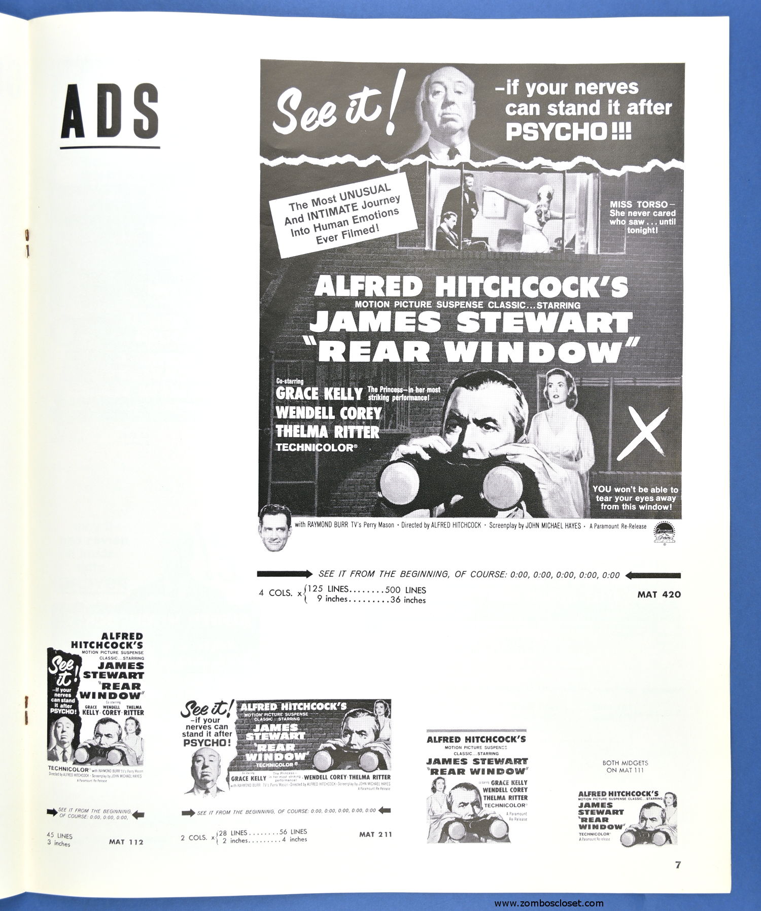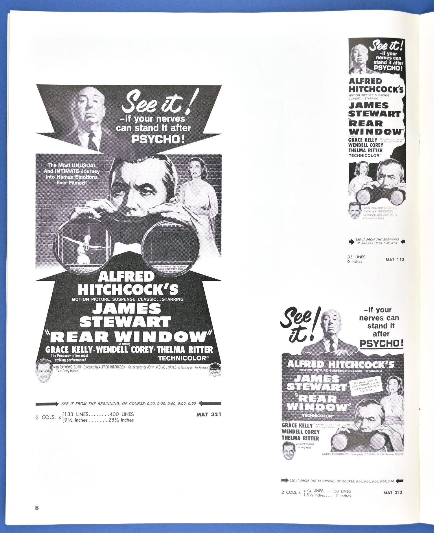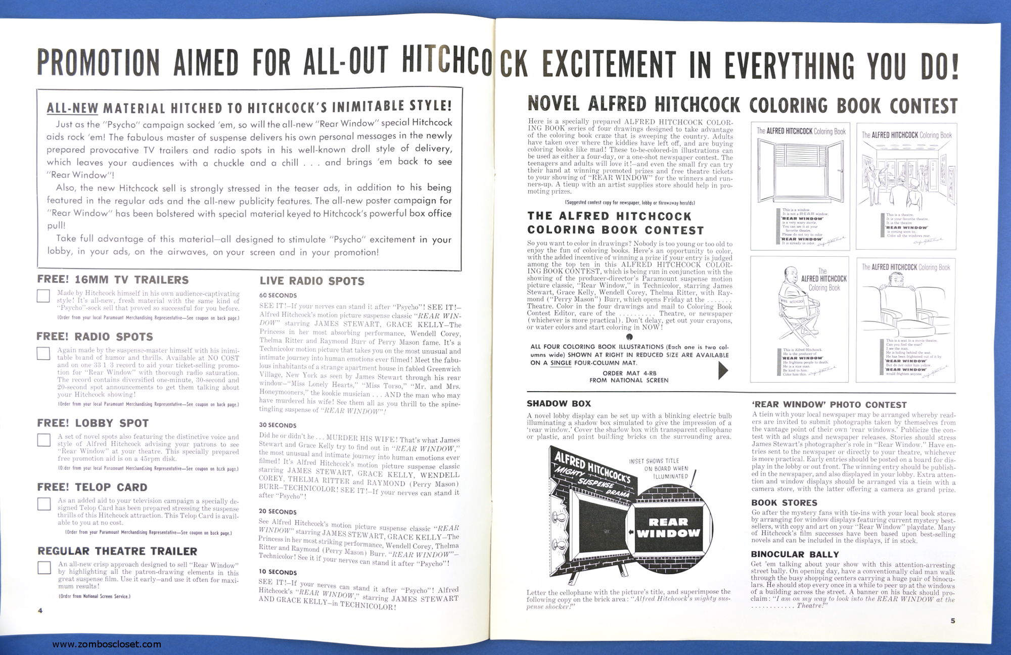 This is the re-release pressbook for 1962. I'm willing to bet you never knew there was an Alfred Hitchcock Coloring Book to promote the movie! Well, only four pages, sure, but the "This is a seat in a movie theatre" page should be colored and framed. And you thought Roger Corman and William Castle were the only ones with a barker-bone in their bodies, didn't you?
