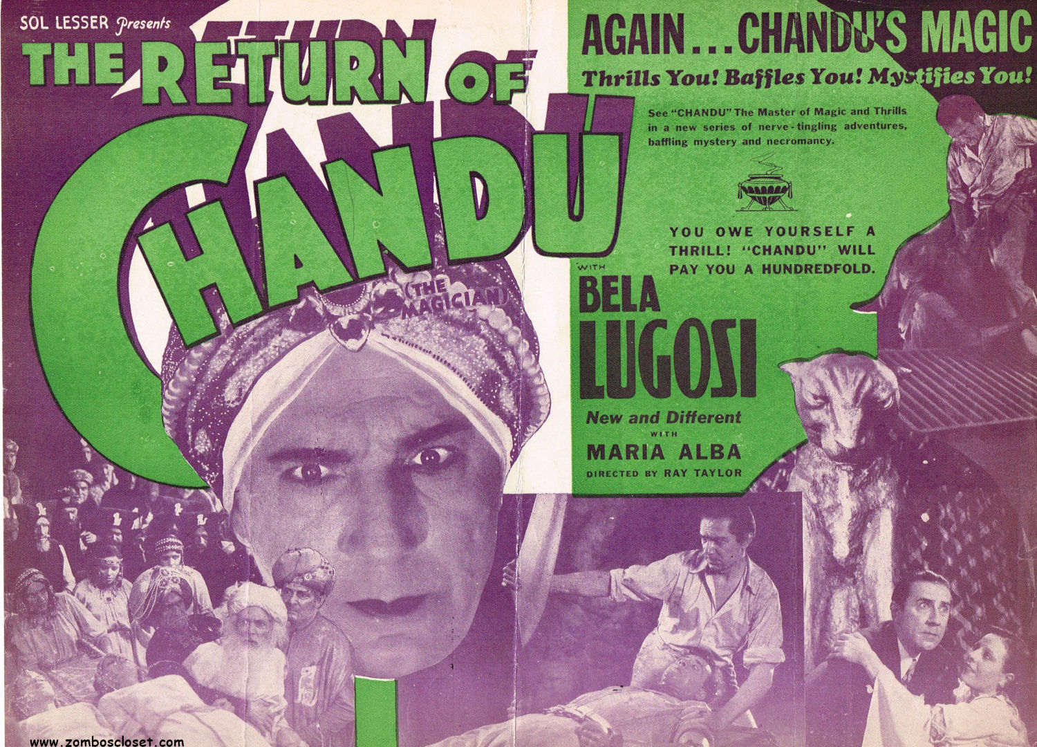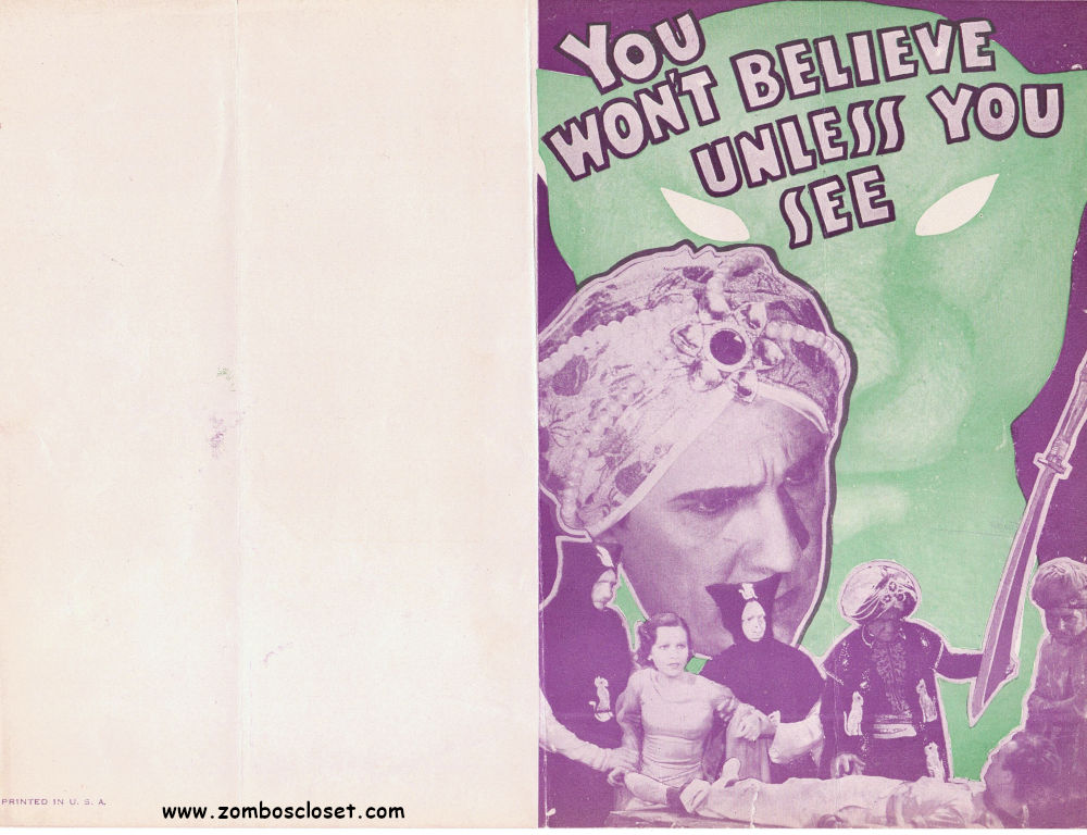 Here’s the promotional herald for Return of Chandu starring Bela Lugosi (he played the villain in the first movie). The blank space on the back was for the theater to print their advertising and location information. It is approximately letter-sized when unfolded.