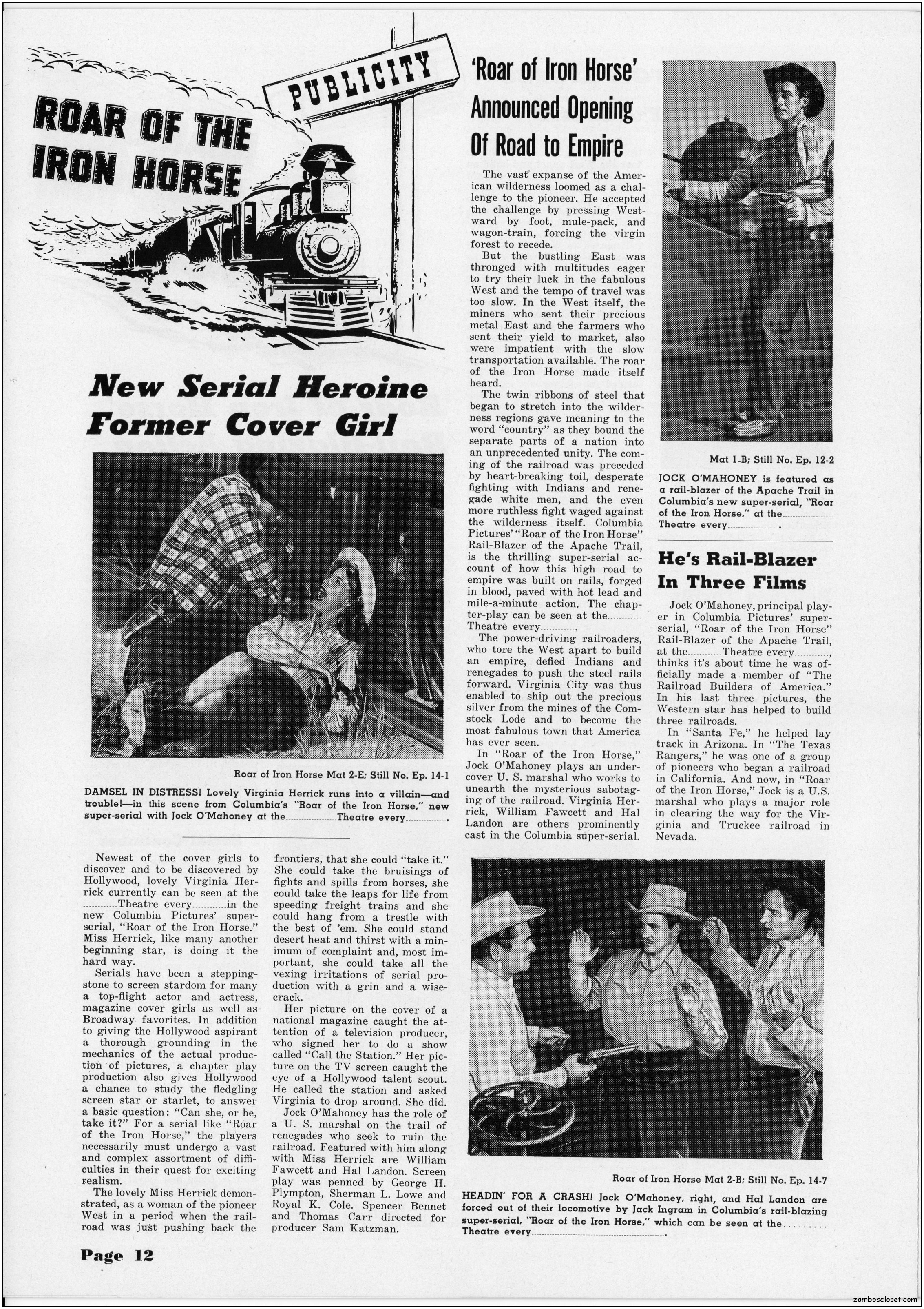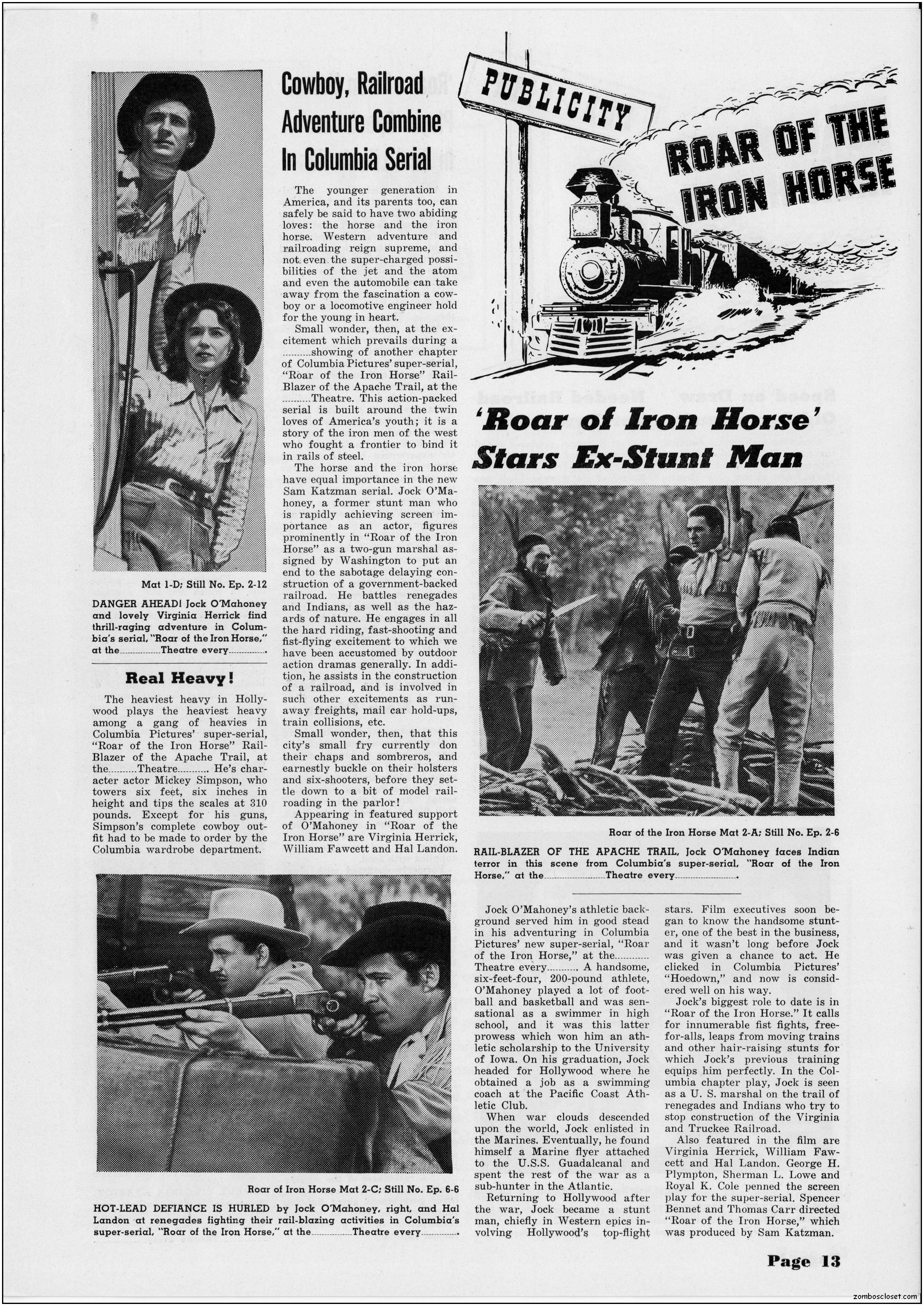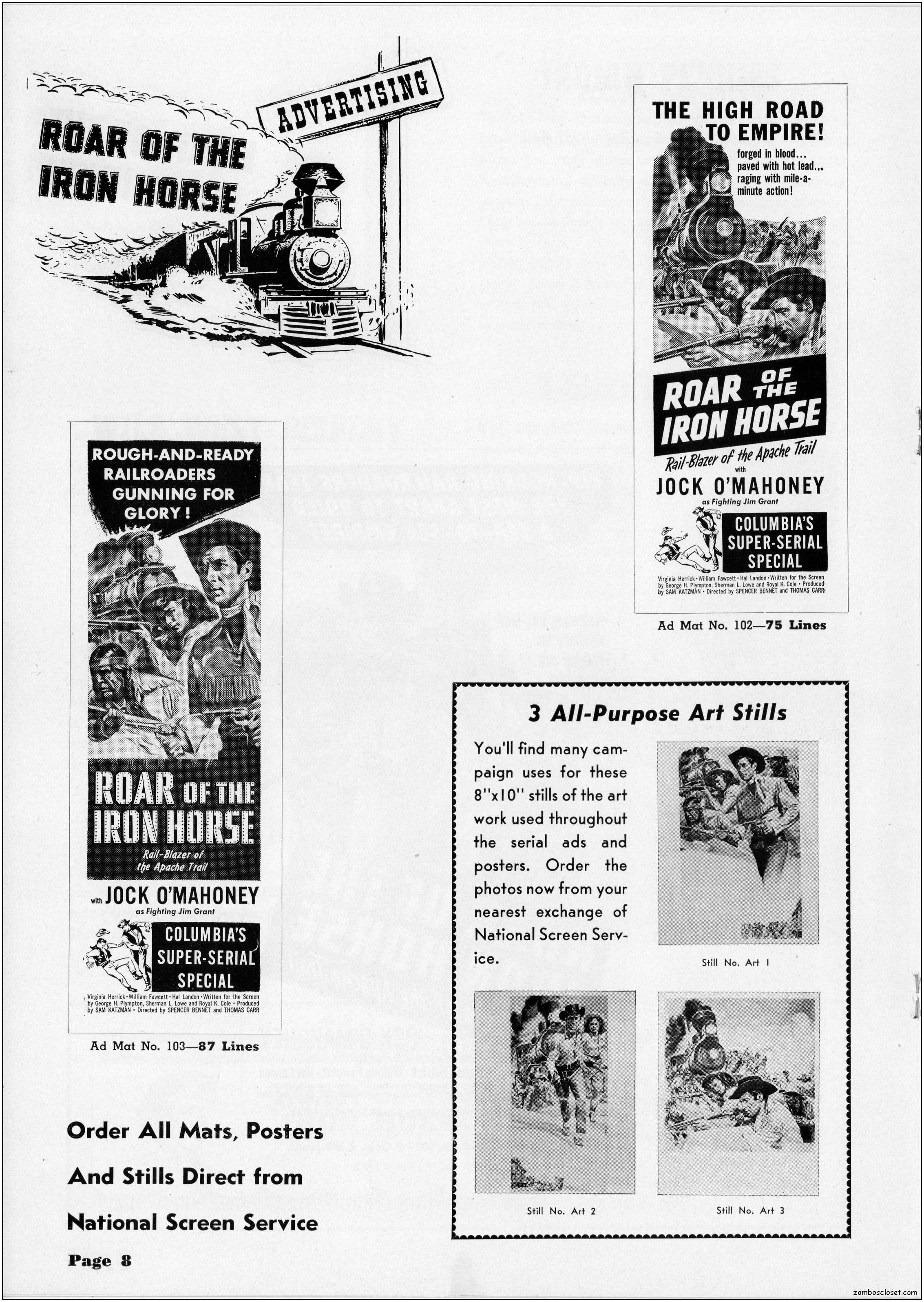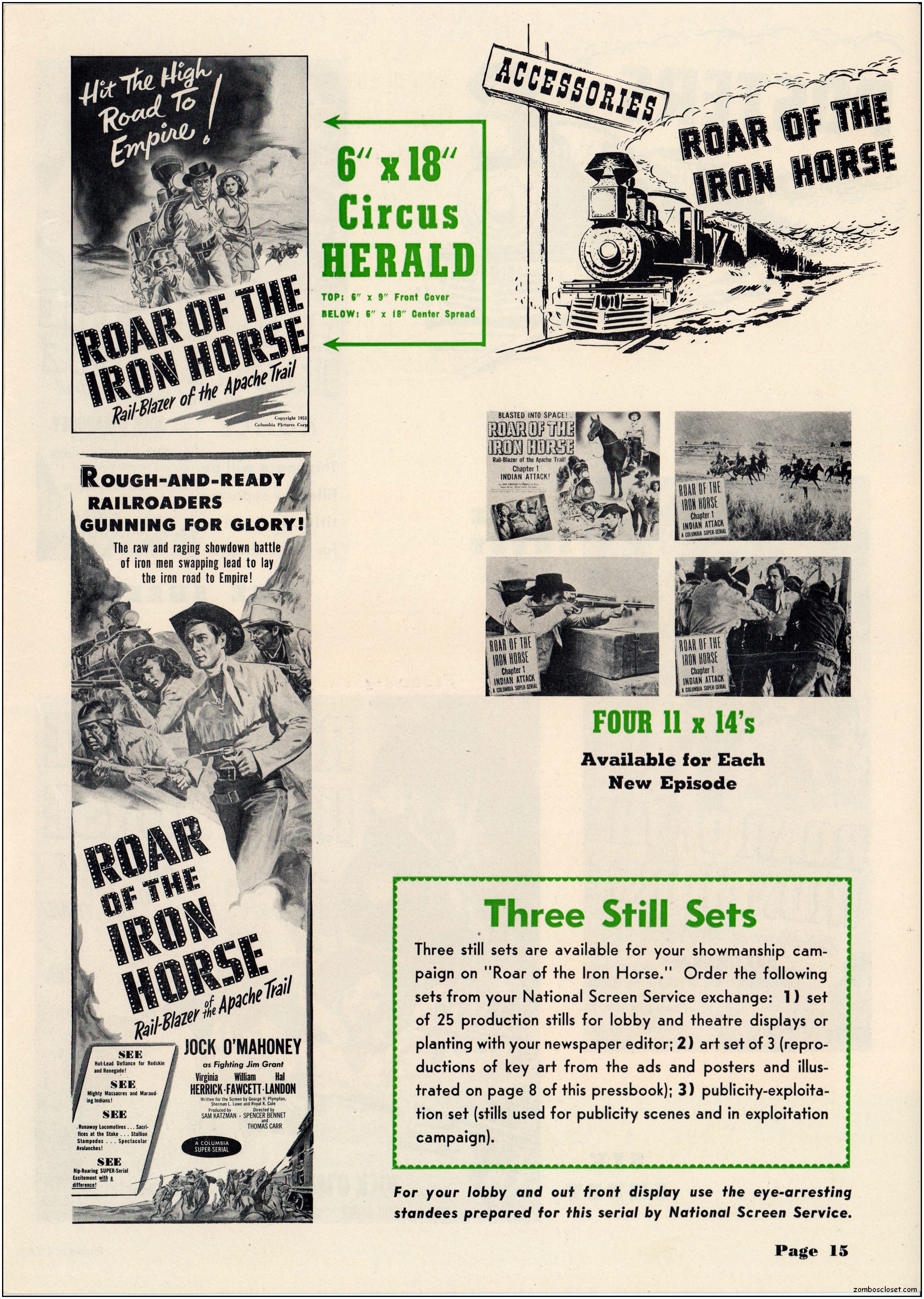 The pressbook for Roar of the Iron Horse contains a lot of promotional information and ideas. Of course, in the 1950s, cowboy movies were an easy draw for the younger set, until mutant monsters and atom bombs creeped out everyone enough to make the classic monsters in the 1960s more inviting. By then, science fiction and detective shows crowded out the Western dramas across television screens while the big screens showed less and less of them too. But in 1951, they were still roaring at the box office.