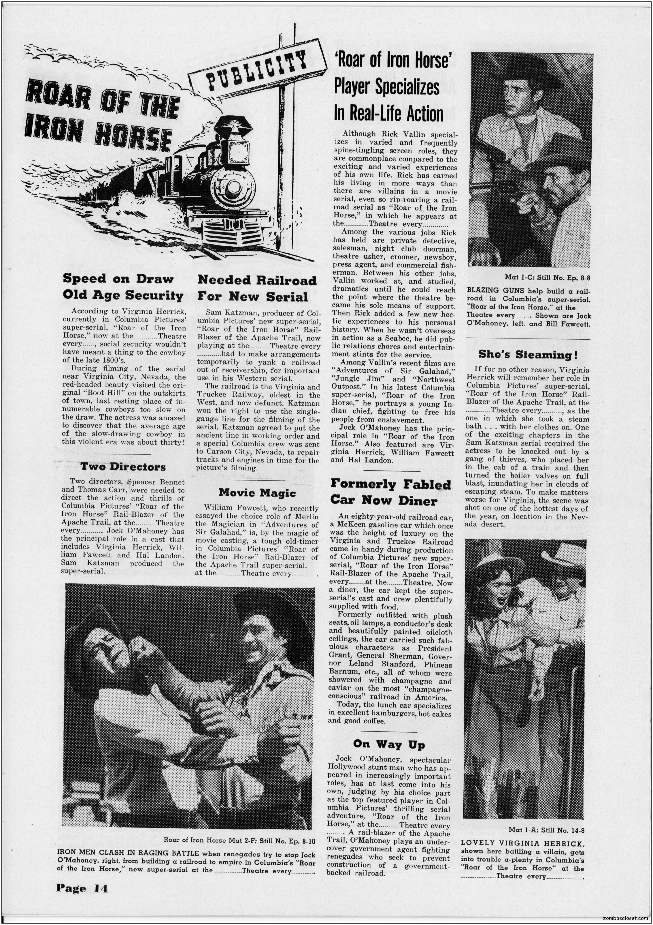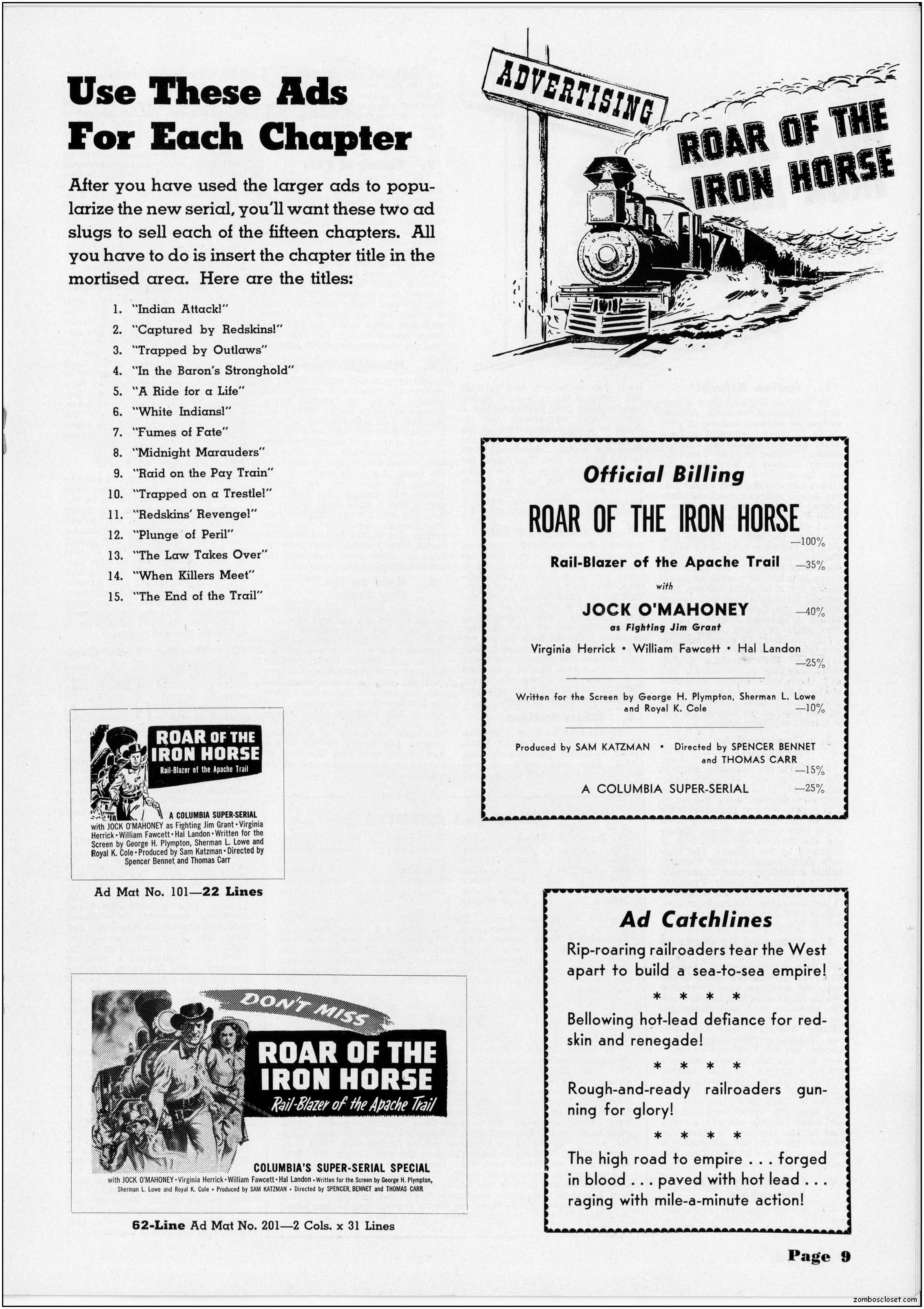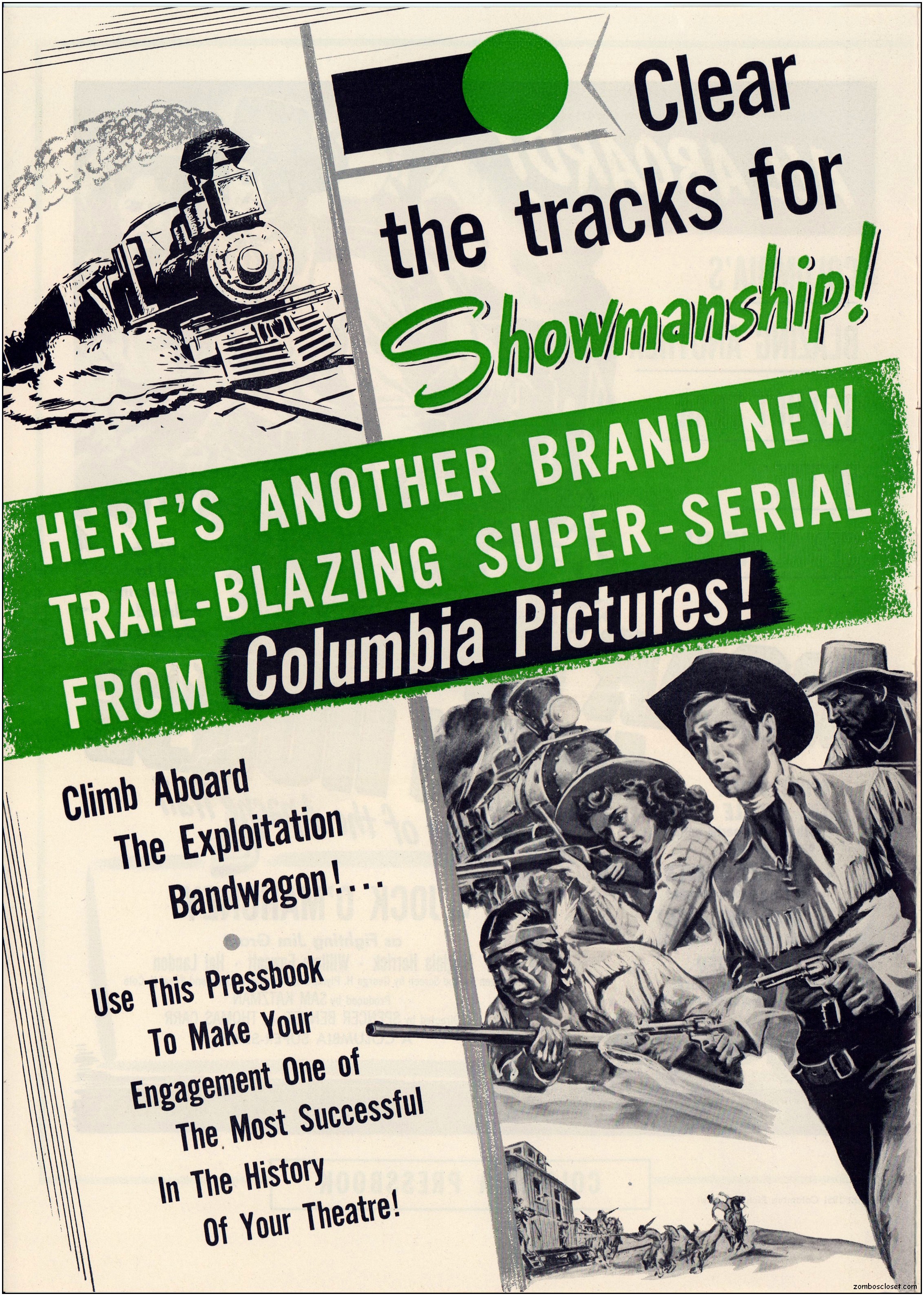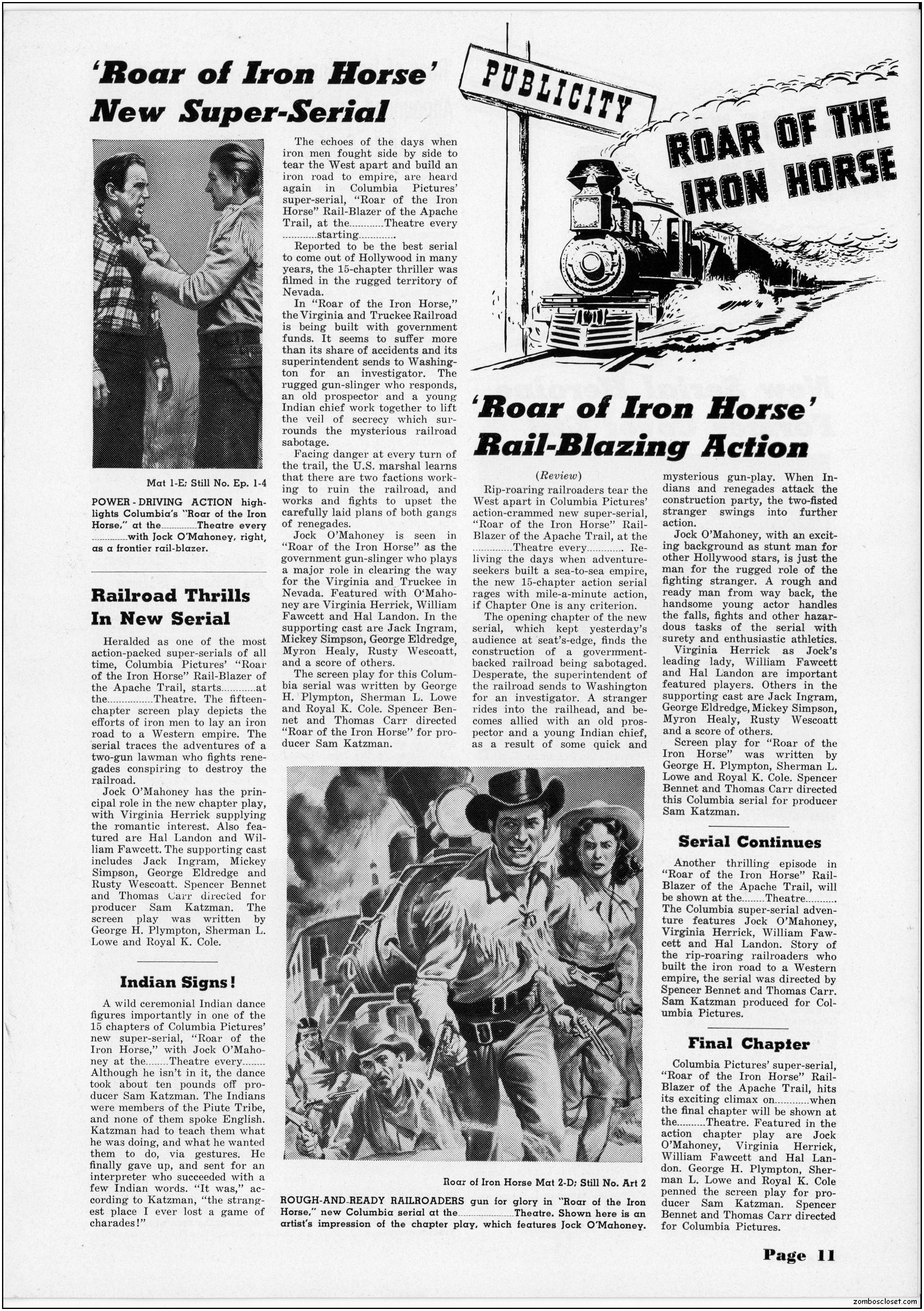The pressbook for Roar of the Iron Horse contains a lot of promotional information and ideas. Of course, in the 1950s, cowboy movies were an easy draw for the younger set, until mutant monsters and atom bombs creeped out everyone enough to make the classic monsters in the 1960s more inviting. By then, science fiction and detective shows crowded out the Western dramas across television screens while the big screens showed less and less of them too. But in 1951, they were still roaring at the box office.