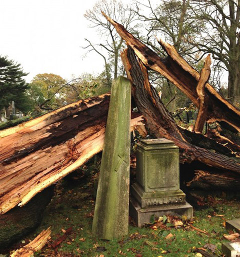 Instead of an entire house being picked up into the middle of a twister (and safely landing on top of a bad witch in a fantastic place), images of mass destruction have been filling the airwaves during the past month’s newscasts. One story which struck a chord was of the damage done to Brooklyn’s Green-wood Cemetery.