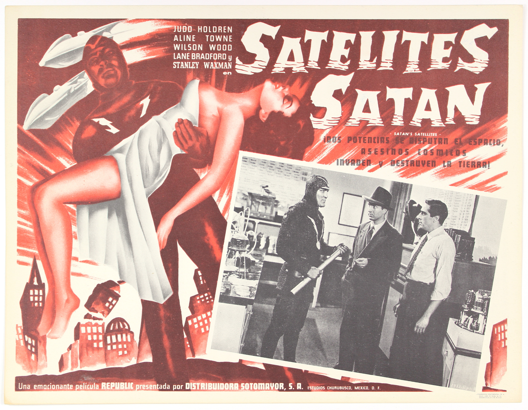 Here's the Mexican lobby card for the feature version of Zombies of the Stratosphere, Satan's Satellites (1958). I fell in love with this movie immediately seeing that cool space outfit Marex (Lane Bradford) is wearing. One of Leonard Nimoy's first screen appearances, as another alien, is to be found here, too.