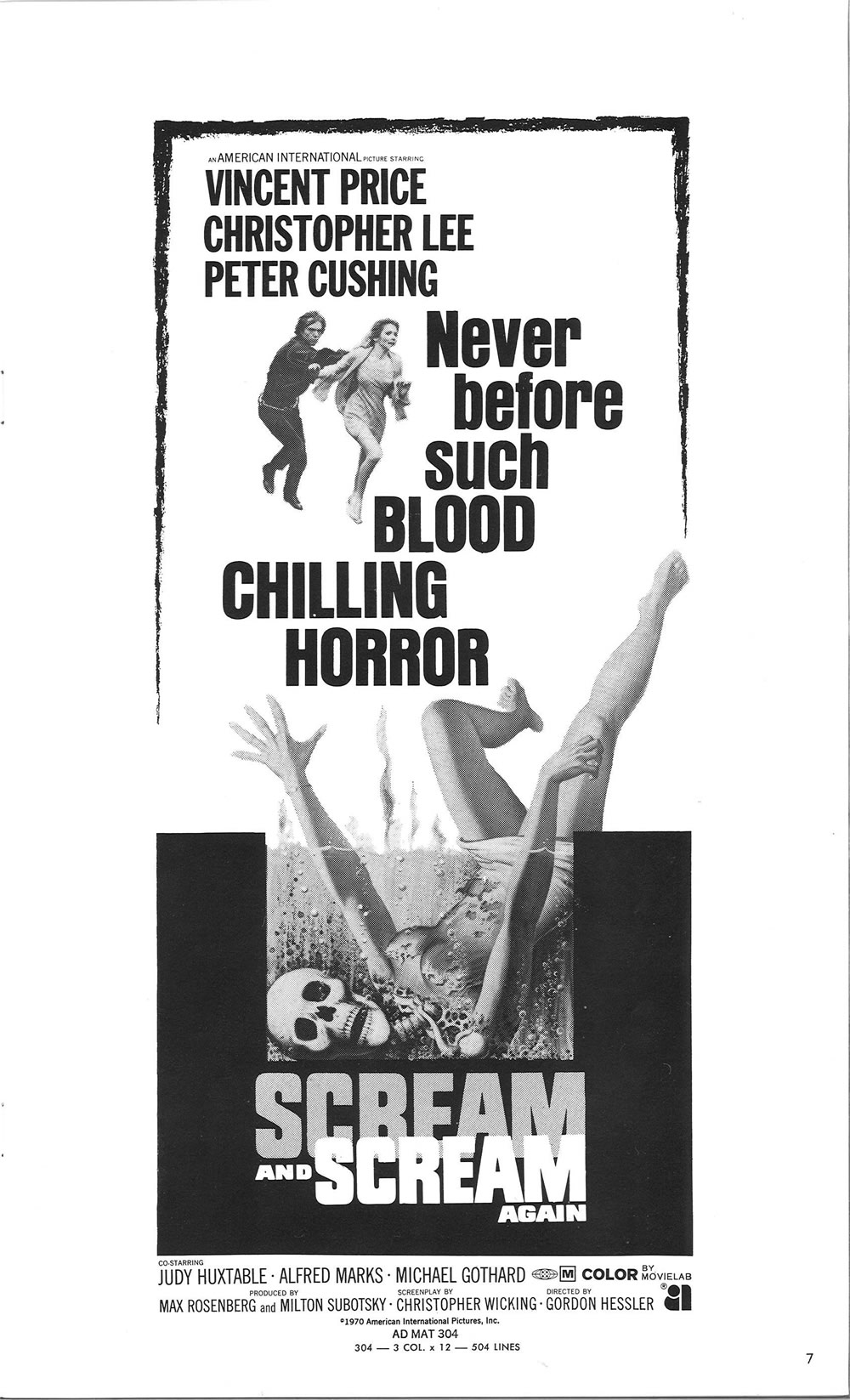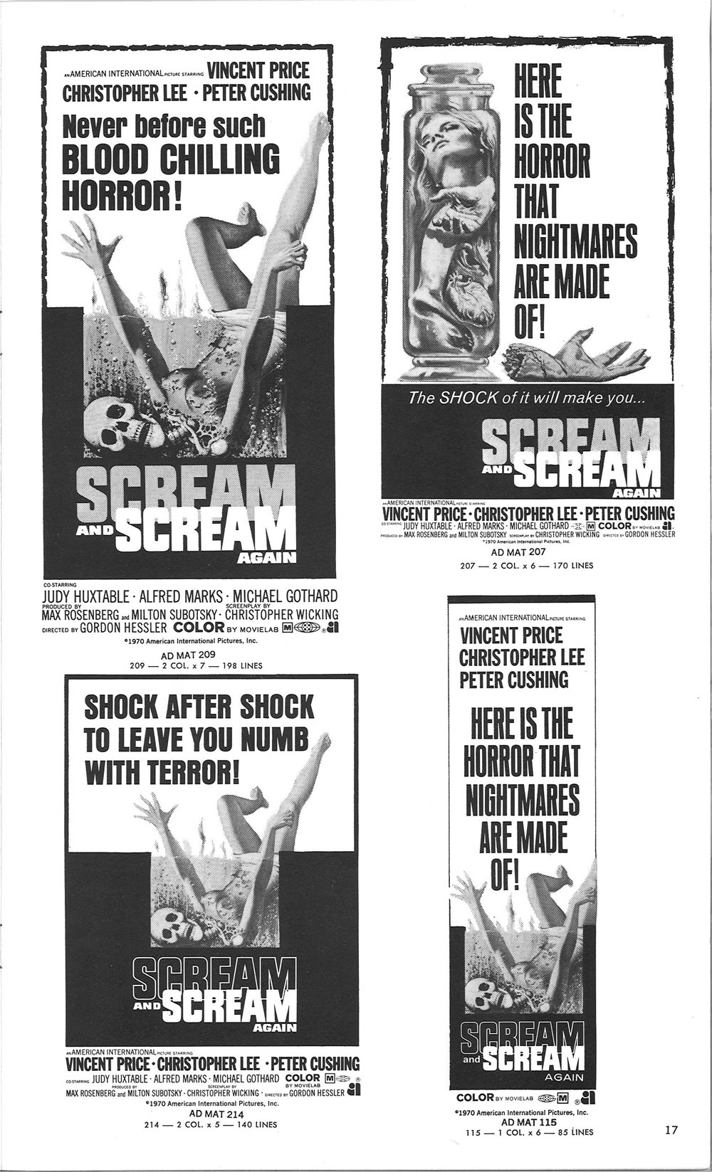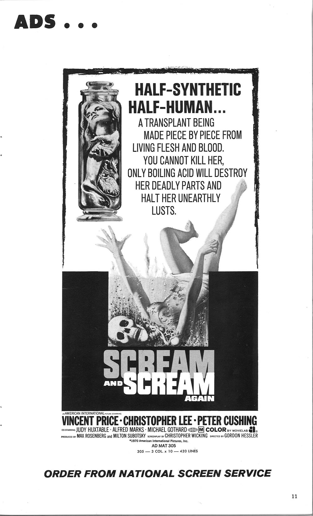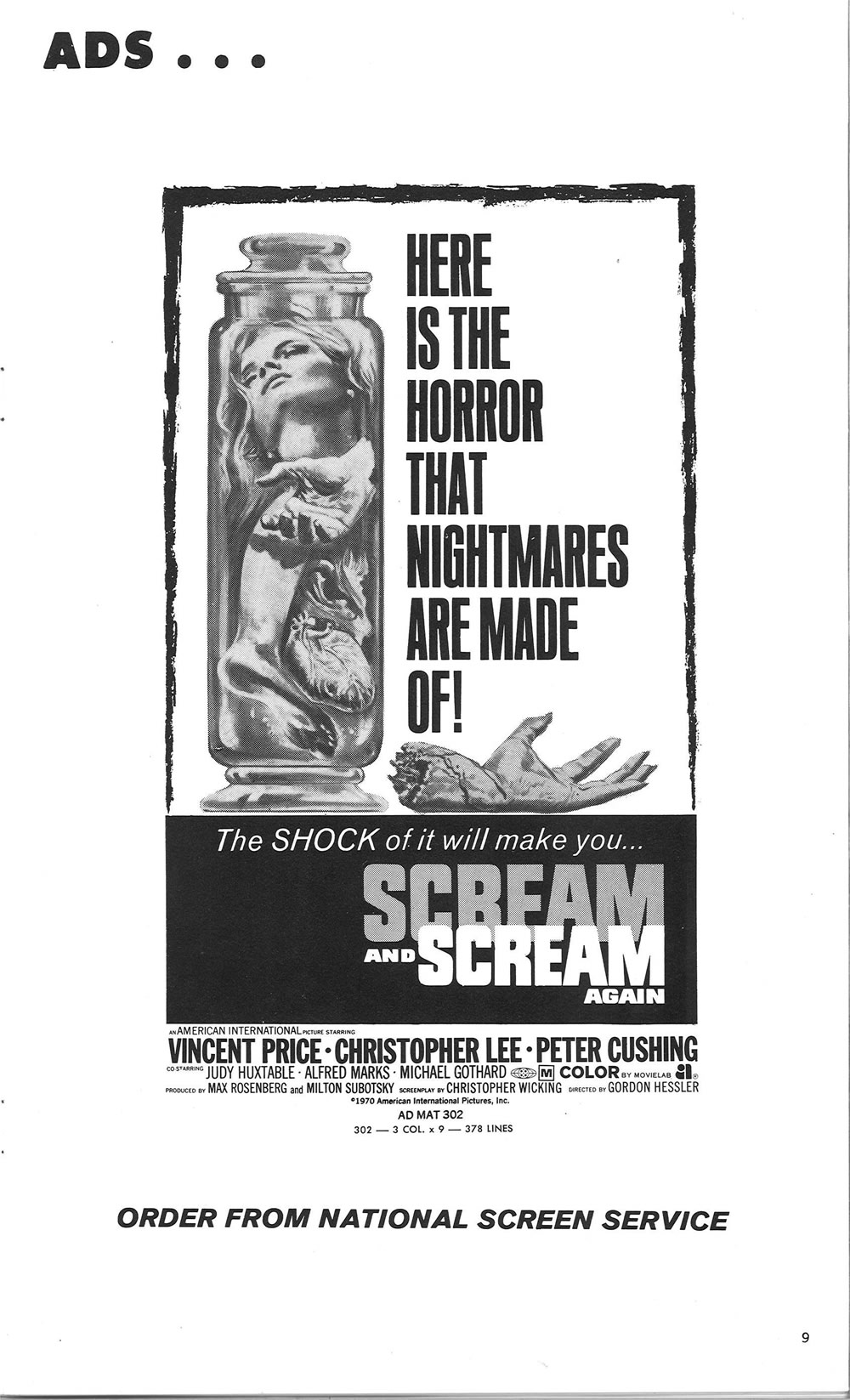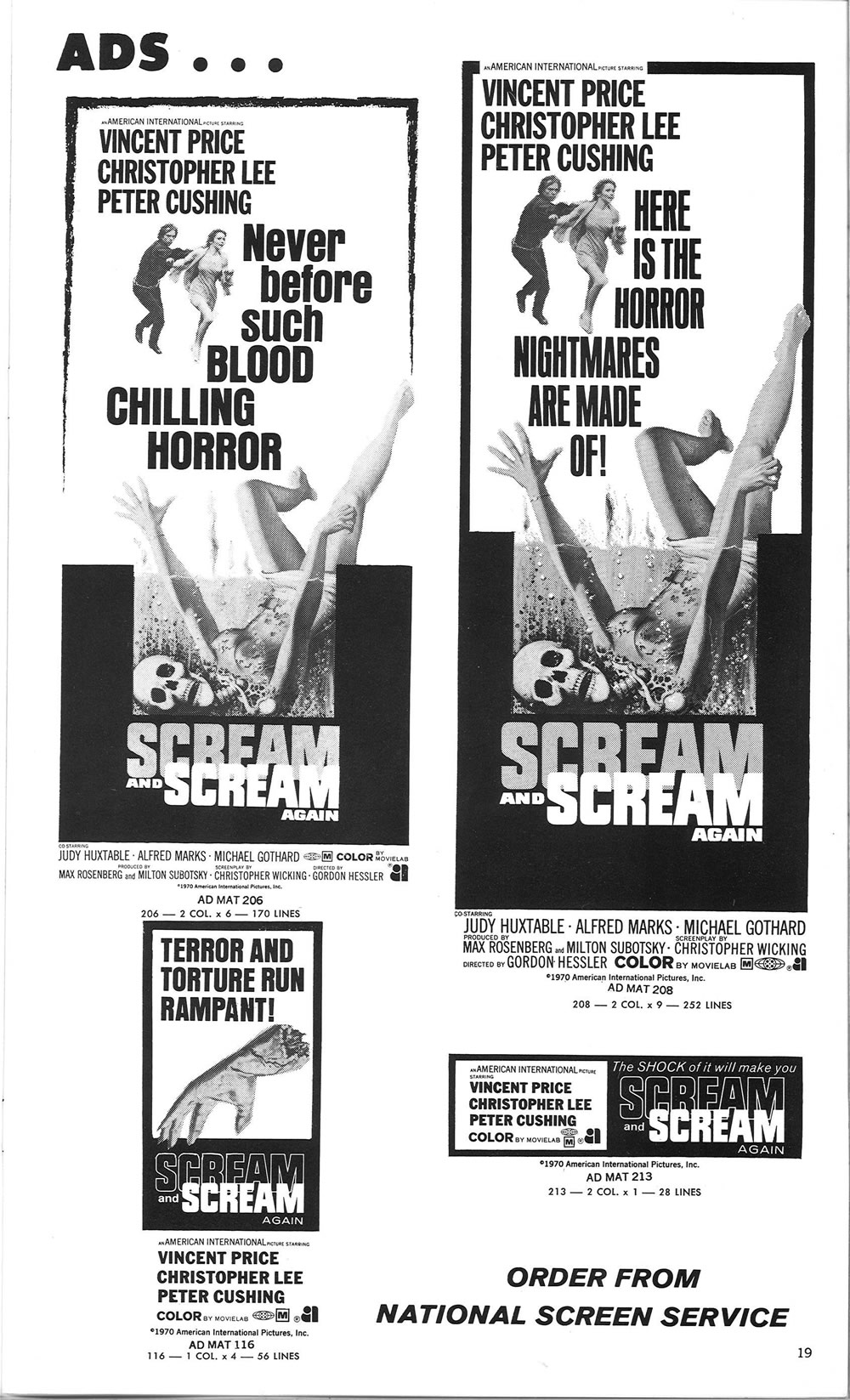 All the pages of this 8.5 x 14 inches movie pressbook for Scream and Scream Again are here, but I've jumbled the order to move the poster ad mats toward the end and bring the text articles toward the front. The poster art does scream horror at you, doesn't it?