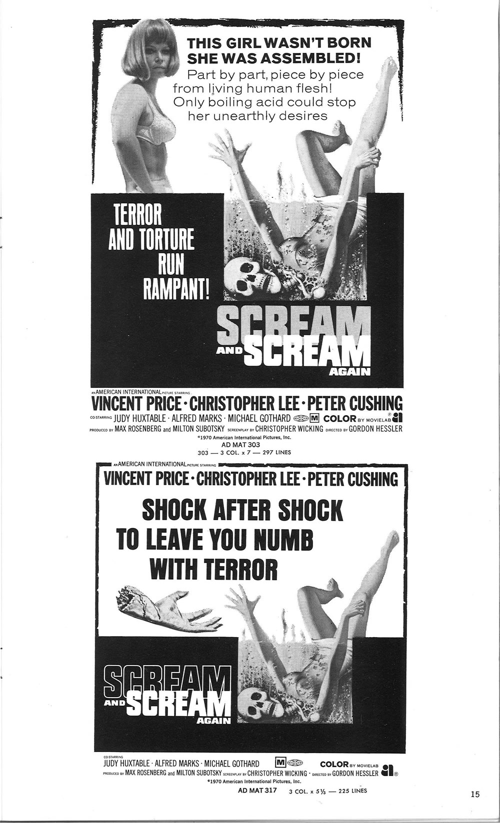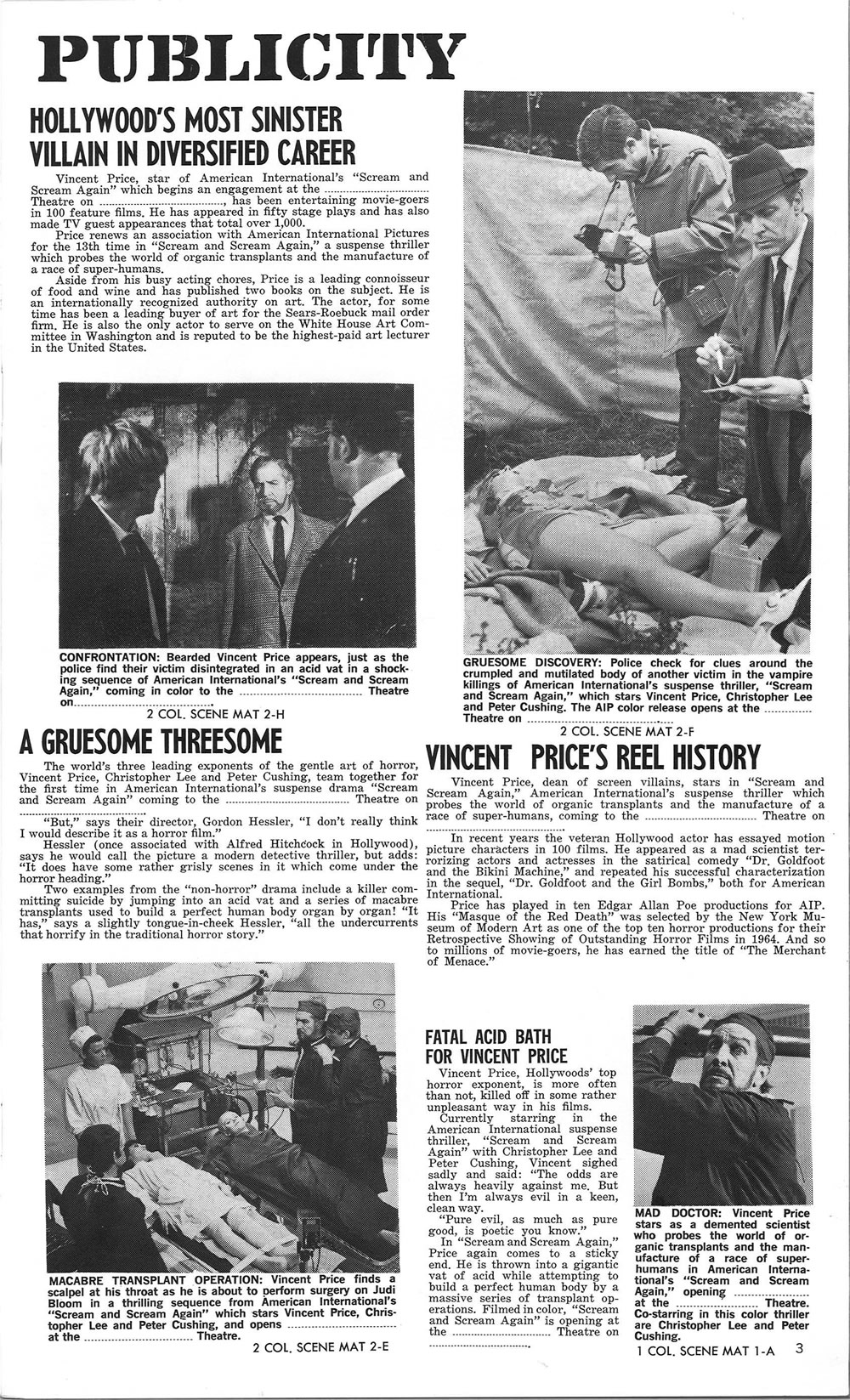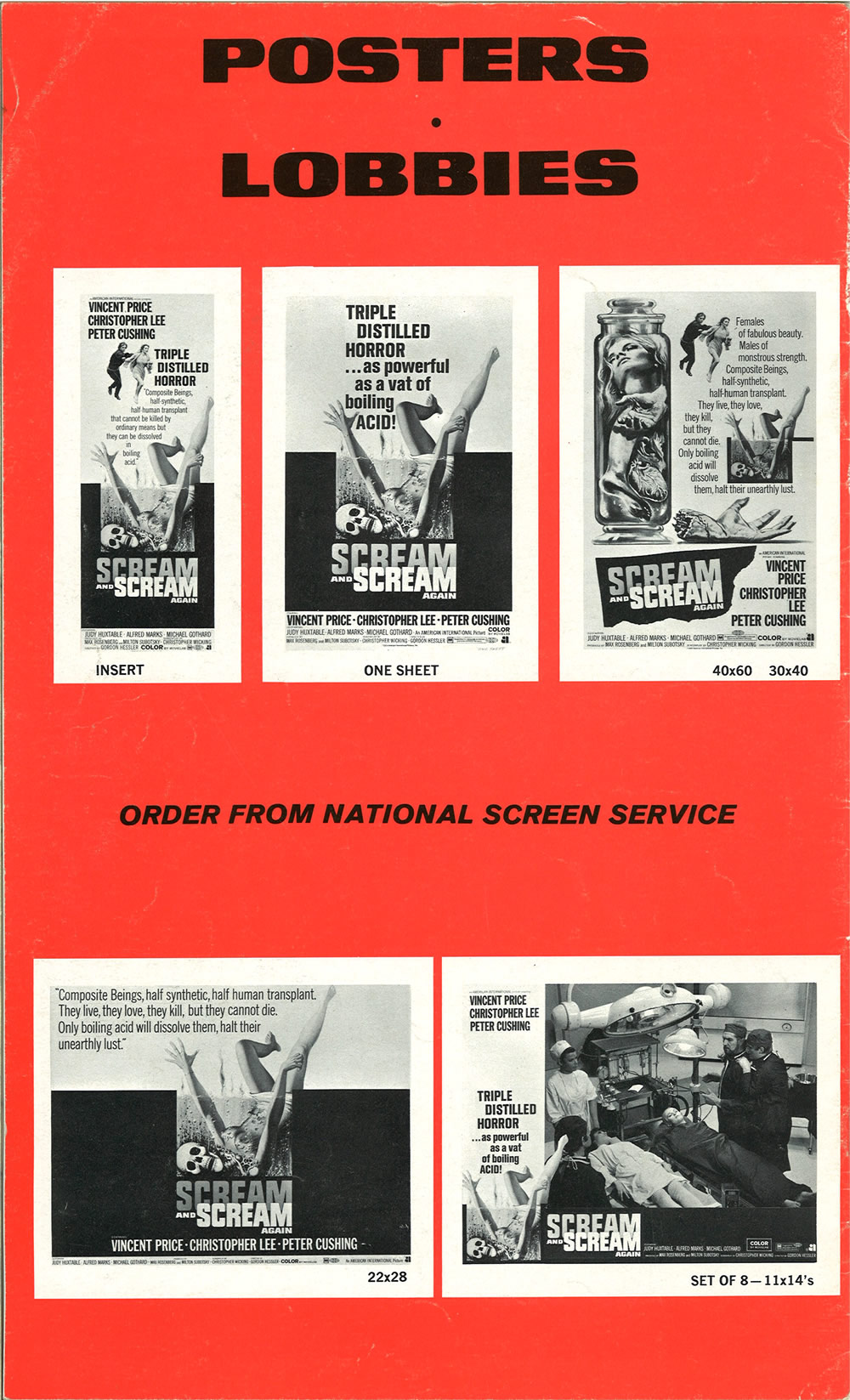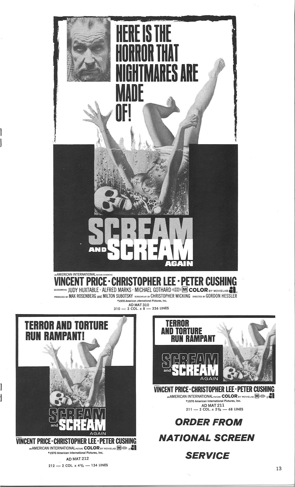 All the pages of this 8.5 x 14 inches movie pressbook for Scream and Scream Again are here, but I've jumbled the order to move the poster ad mats toward the end and bring the text articles toward the front. The poster art does scream horror at you, doesn't it?
