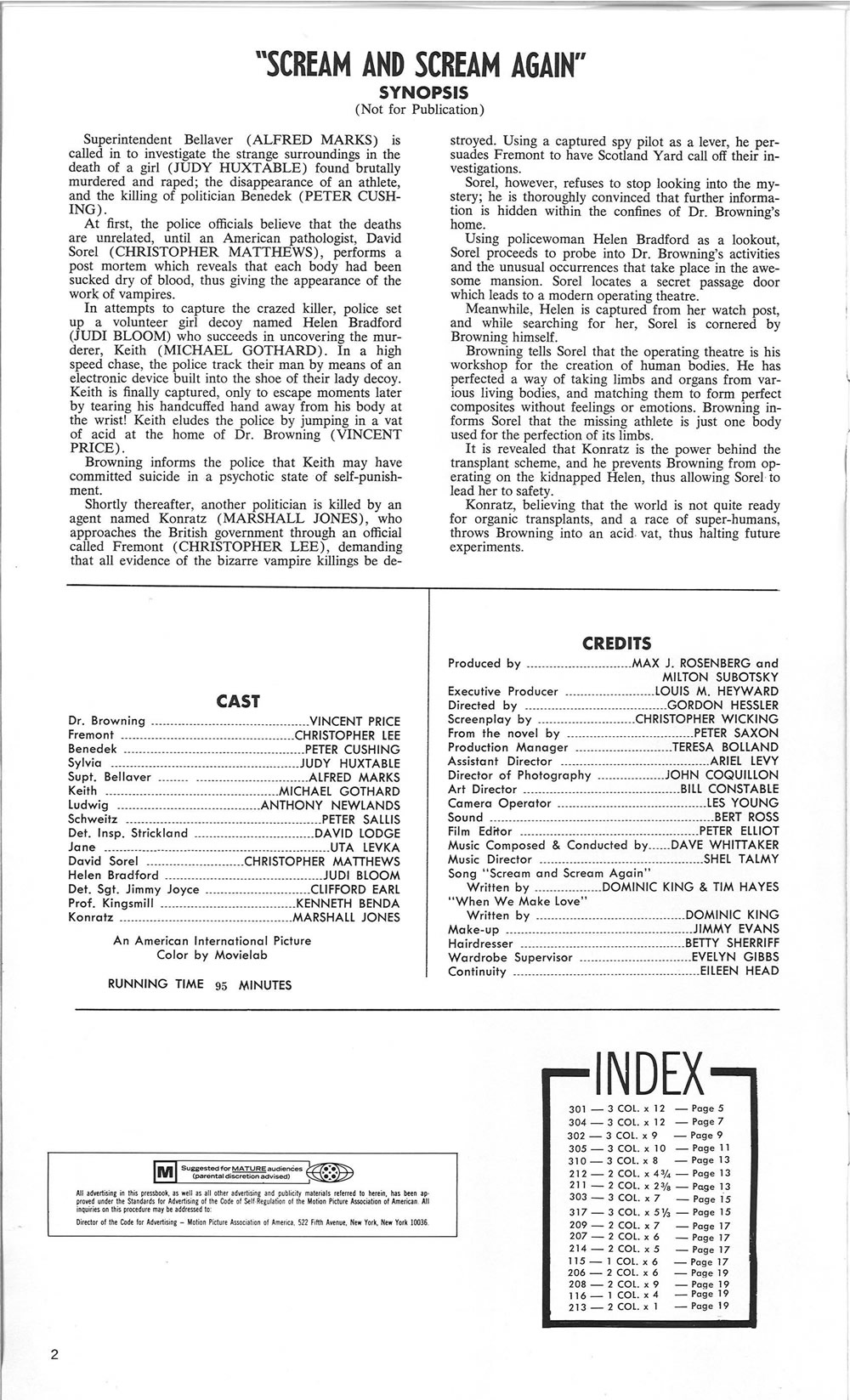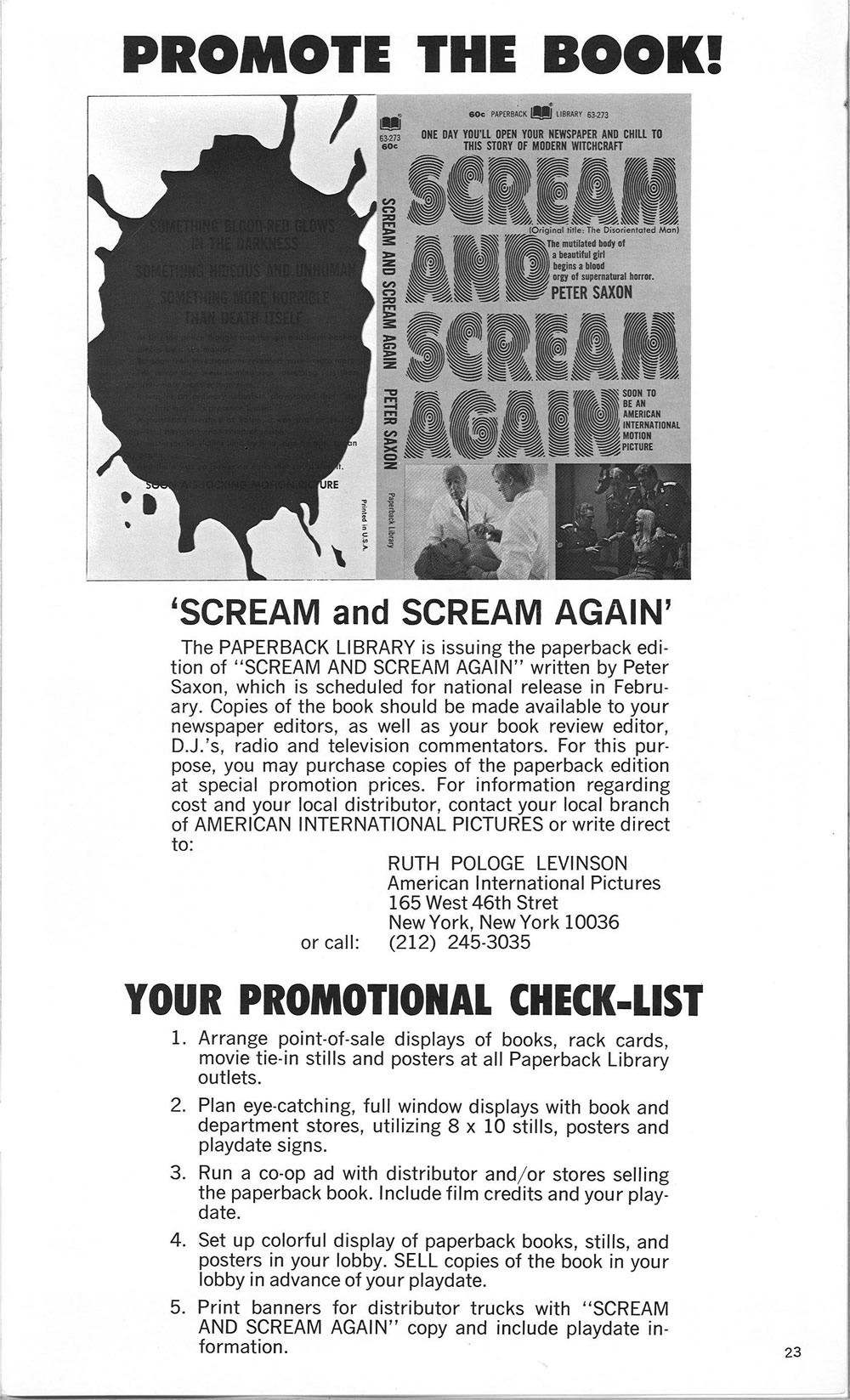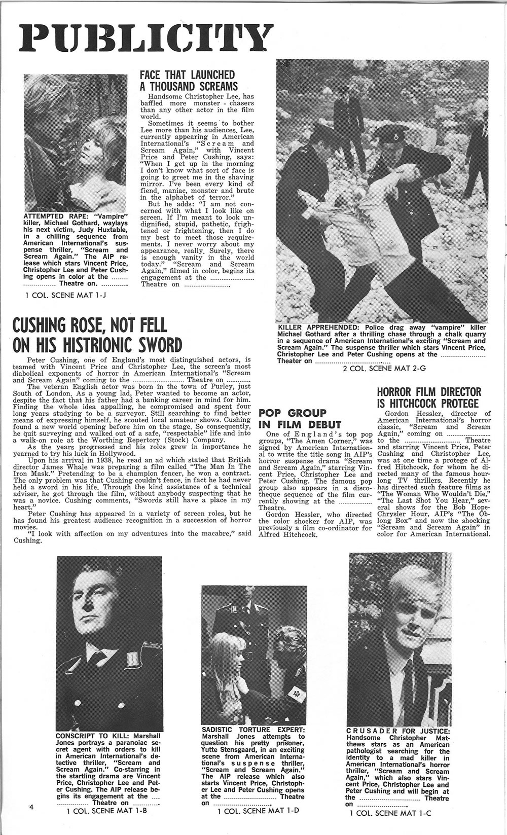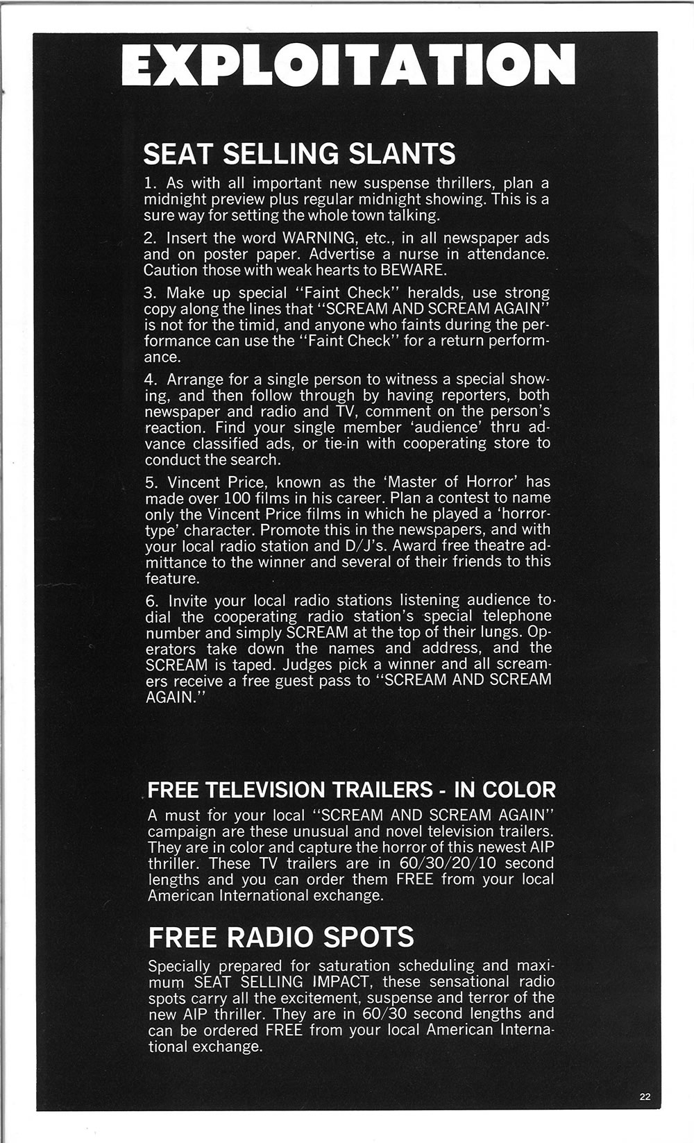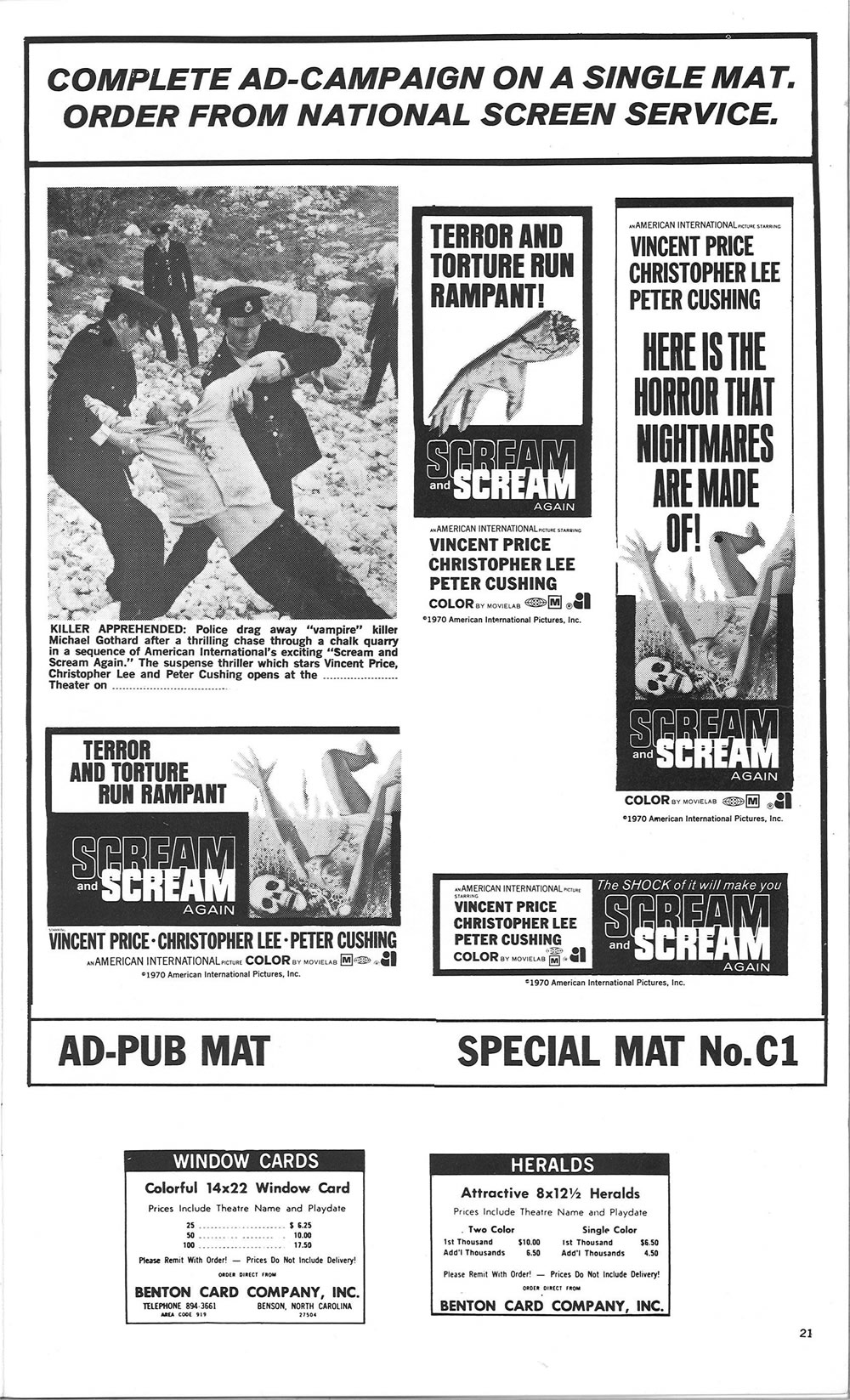 All the pages of this 8.5 x 14 inches movie pressbook for Scream and Scream Again are here, but I've jumbled the order to move the poster ad mats toward the end and bring the text articles toward the front. The poster art does scream horror at you, doesn't it?