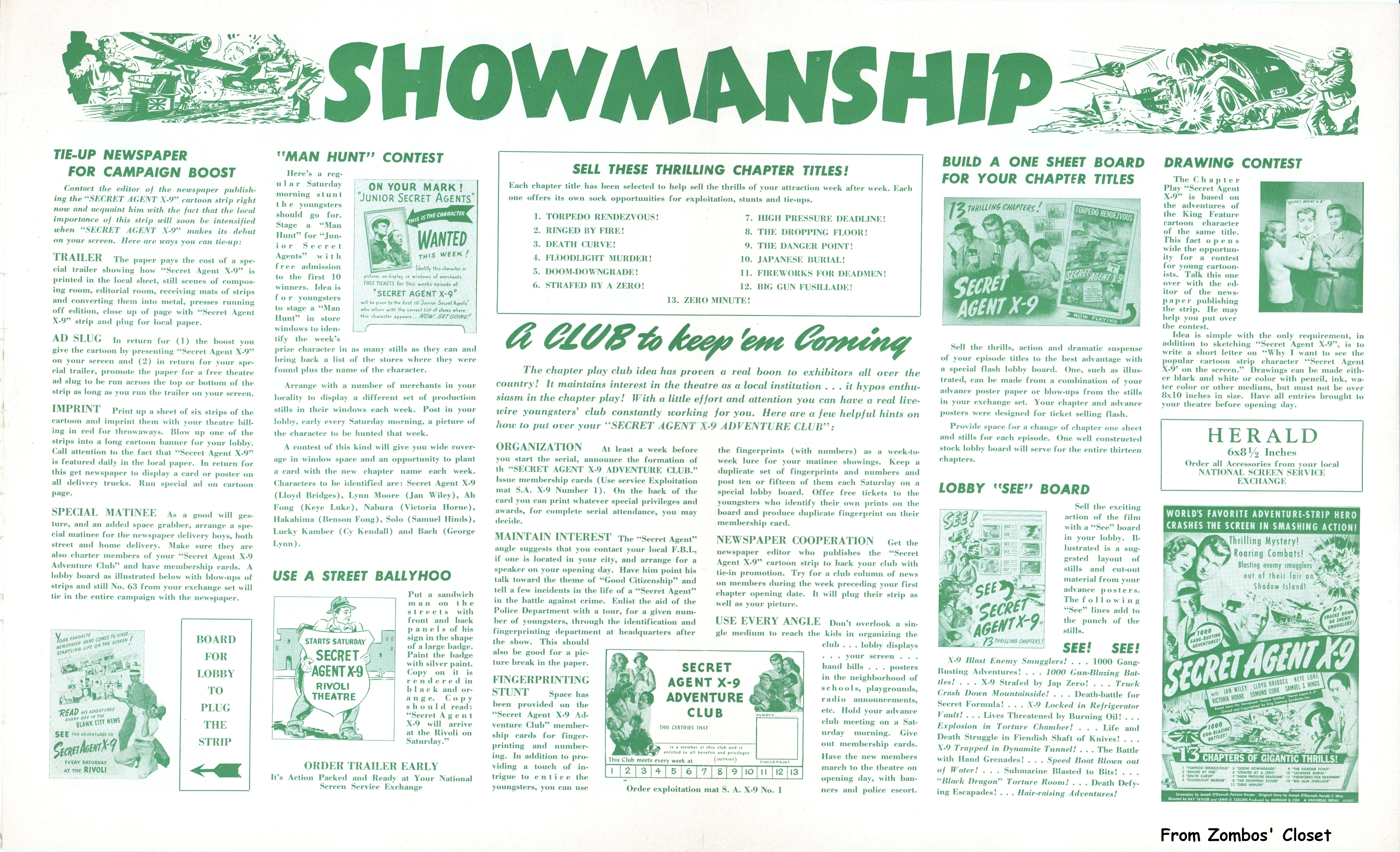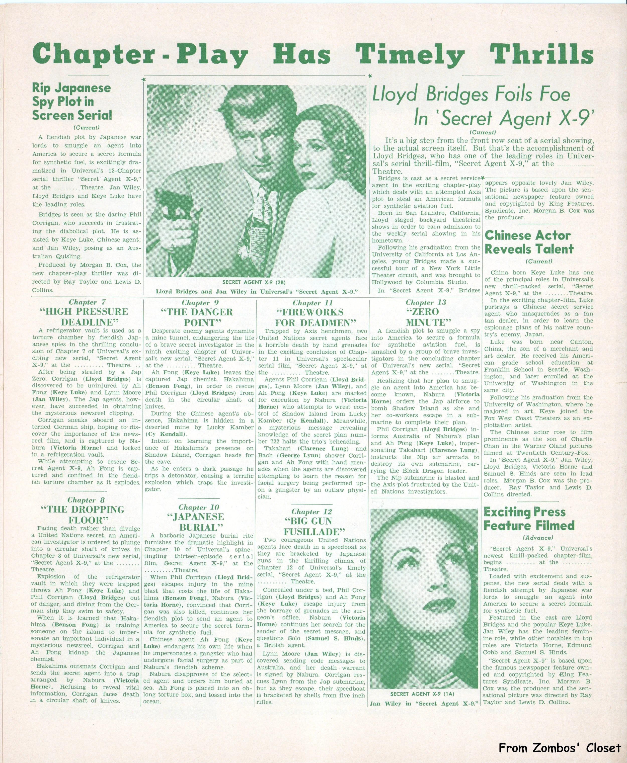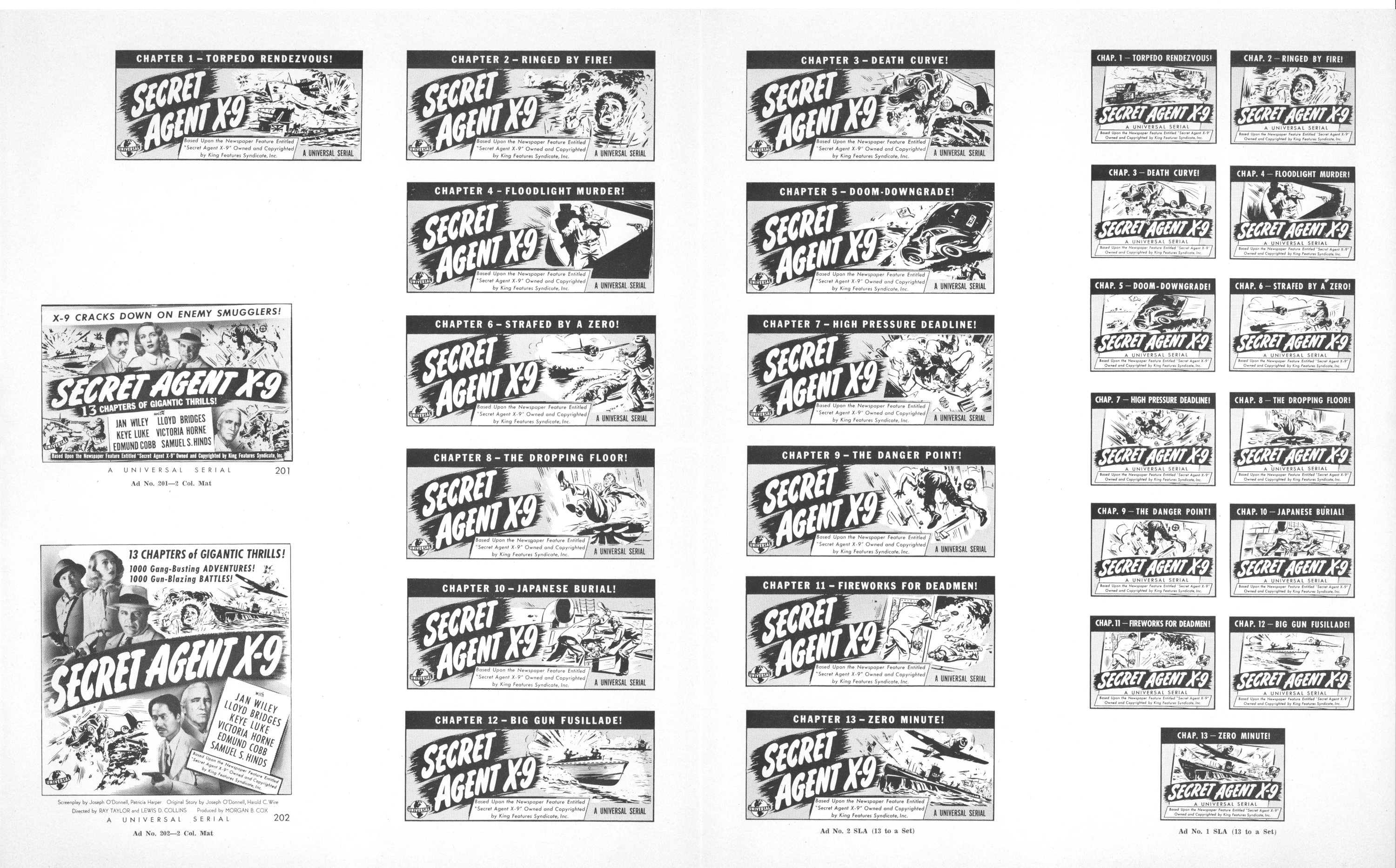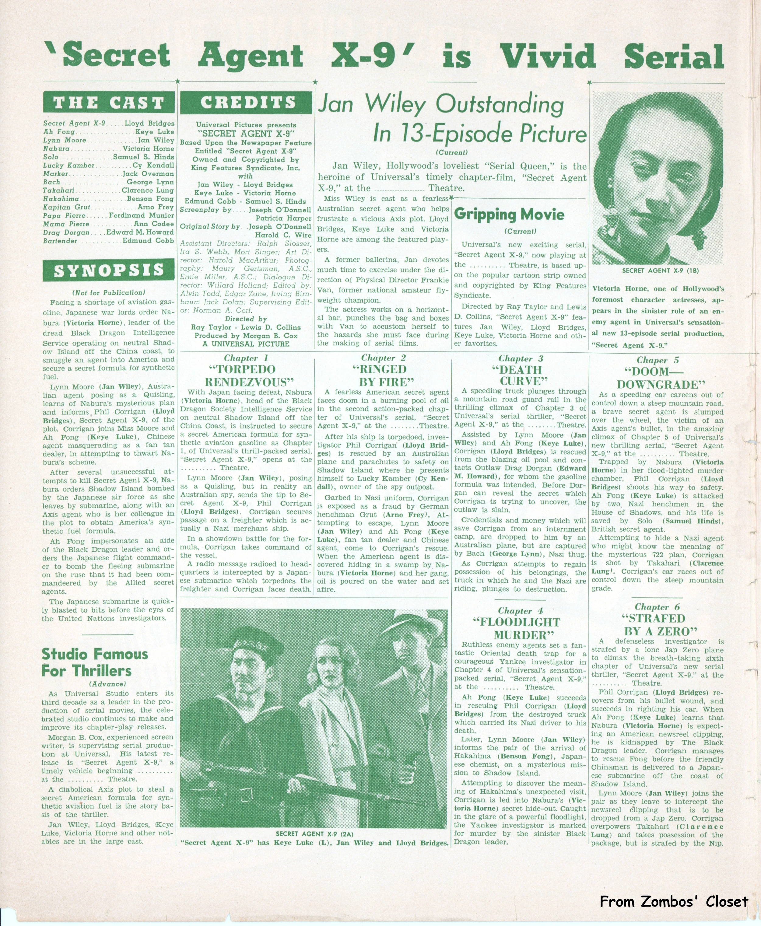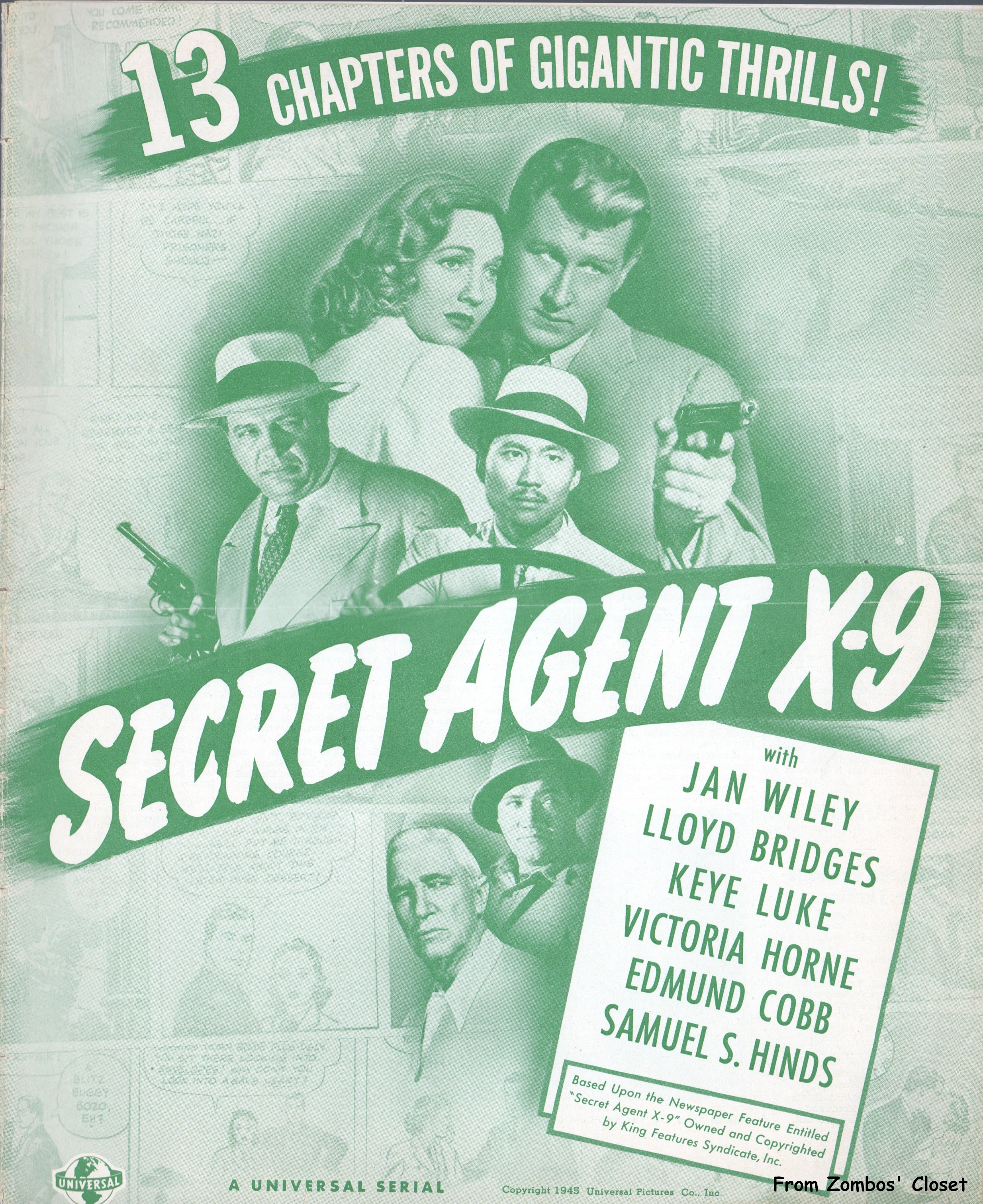 Lloyd Bridges only movie serial, Secret Agent X-9, also featured two actors who played Charlie Chan’s sons in that popular movie series, Key Luke and Benson Fong. Going after a synthetic fuel formula provides the motivation for thirteen chapters of action and cliff hangers. Universal was unique with their serials by not providing the traditional chapter recap of the story so far. Instead, they had characters in a following chapter recap, through their dialog, what transpired in the previous chapter (as noted in Gripping Chapters: The Sound Movie Serial, by Ron Backer, BearManor Media). Universal did a Secret Agent X-9 serial in 1937 too. That storyline centered around stolen jewels. Both serials were based on the comic strip character of the same name written by Dashiell Hammett and drawn by Alex Raymond.