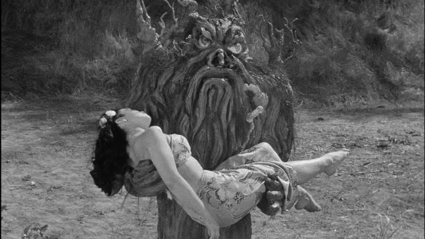 Tabanga in From Hell It Came: High on anyone’s list of seriously silly monsters should be Tabanga. I admit I am a bit torn over this one: I like the storyline and the concept; it is the execution that falls short. Tabanga falls into the slow as molasses category of walking terrors (like in the later Mummy series, but I like the Mummy movies so you won’t see Kharis on this list, no way), and cannot help but bring chuckles as he ploddingly kills people with his, mostly, immobile limbs. For a “half-human animal-stump that grows from a dead native” (according to one pressbook for the movie), he’s a bit too wooden for any real frights. Apparently none of the production crew noticed. The pressbook goes on to list Tabanga’s height at a lumbering 14 feet and misprints his name as Taranga (an actual Maori demi-god). I do not believe anyone noticed the height difference or the name change or cared to.