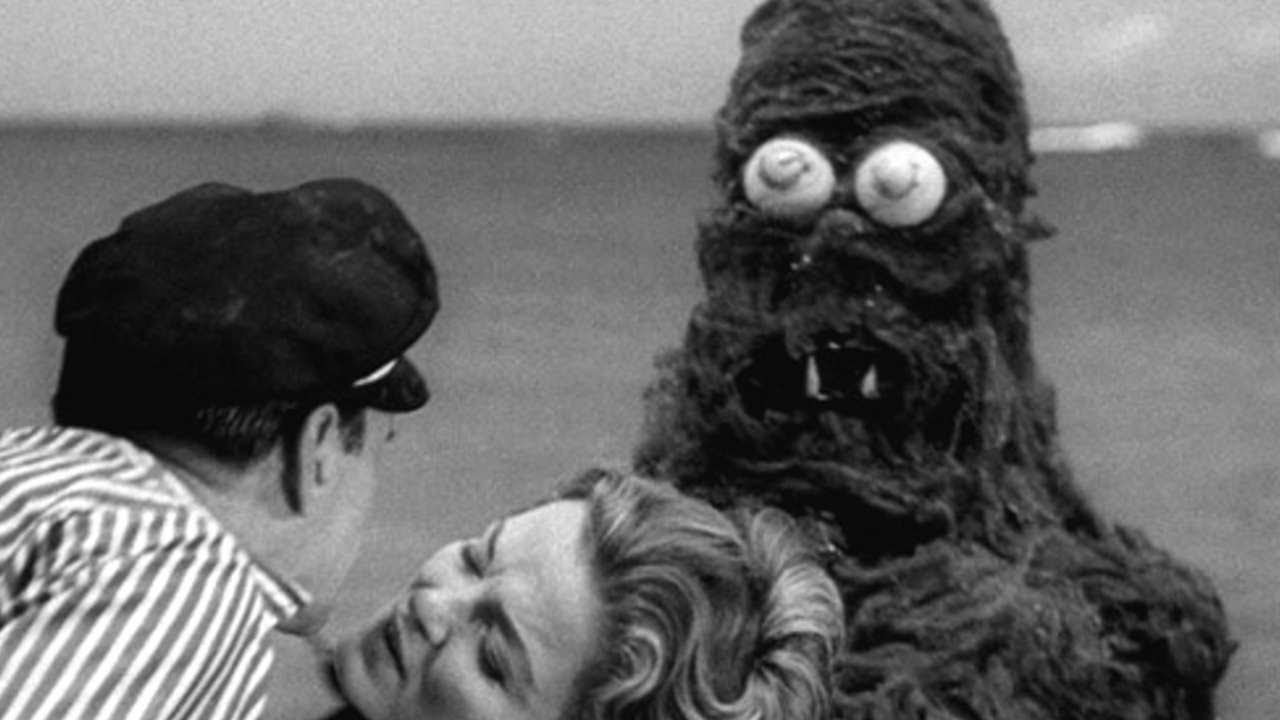 Kooky Monster in Creature from the Haunted Sea: I am not one to nitpick a master like Roger Corman or his movies, but I wonder what he and the production crew were smoking (or drinking) at the time Kooky Monster hit the storyboards. If you took Oscar the Grouch, bashed him numerous times with a frayed mop that had Brillo pads stuck in it, then stuck two tennis balls into his eye-sockets, you would pretty much wind up with Kooky Monster. In some scenes you can see glimpses of human under the costume when skin shows between the costume’s too-short sleeves and pipe-cleaner tipped gloves.