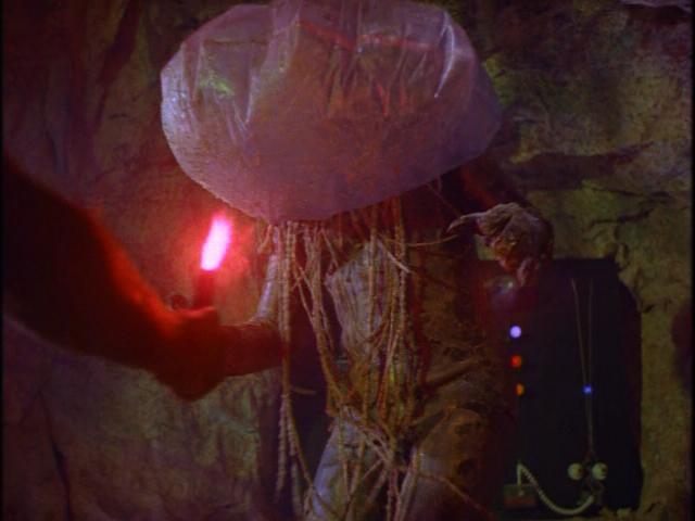 Jellyfish Man in Sting of Death: There are so many aquatic silly monsters, where does one begin? Why, with Jelly Fish Man of course! How can you not rate a wetsuited jellyfish-headed man at the top of any list? Once again a mad scientist creates a mutant on a budget, saving a penny or two by using clothes. Remember the Metaluna Mutant? Wearing pants from the waist down we could not tell if he had nards, but more importantly, it saved a lot of money on creating more creature costume. Like an alien in an Irwin Allen television production, or a H.R. Pufnstuff reject, Jellyfish Man is colorful in concept but flat in appearance. The purple plastic bag for a head does its best to sell the jellyfish monster aspect like no other prop can. Sadly, it does not work. More horrifying are the beach scenes with their jiggling bikini bums in a panic as the smaller jellyfish (smaller sized plastic bags) attack.