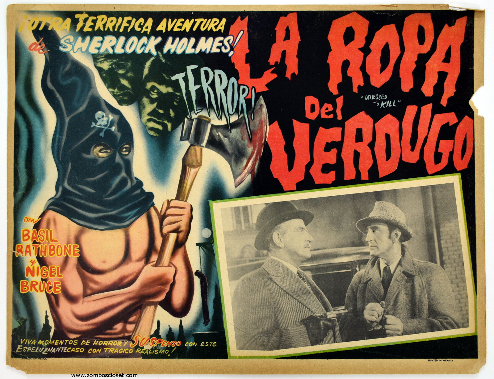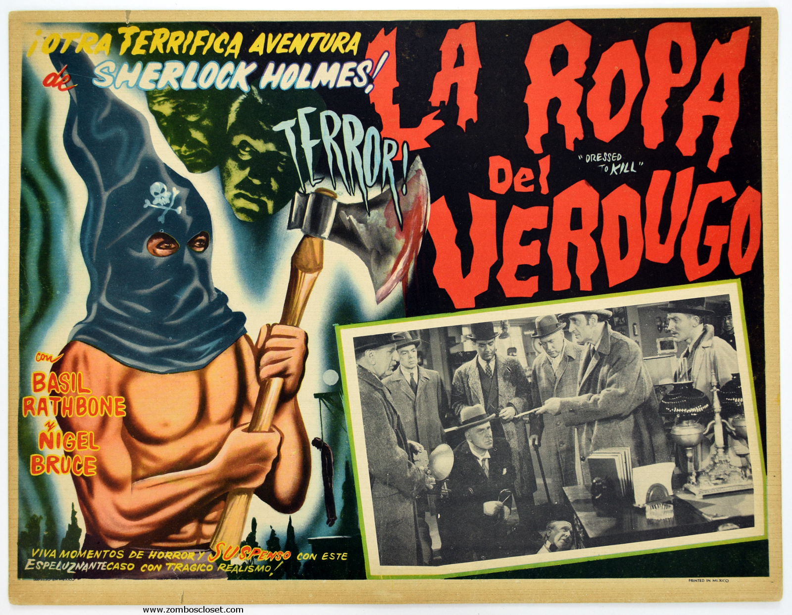 While the hooded executioner, with his blood-dripping axe, shown in this Mexican lobby card for La Ropa Del Verdugo (Dressed to Kill), is certainly dressed to kill, I don’t think Sherlock Holmes needs to worry about him much in this last movie of the series that starred Basil Rathbone as Holmes and Nigel Bruce as Doctor Watson. Nevertheless, this lobby is thrilling to see; from its fear-inducing executioner, to the hanged man, to the vibrant text style and background, it’s a fine example how a lobby card can dress up a movie by outright lying. While Holmes faces danger, its nothing as sharp as that axe. But after seeing this card, wouldn’t you want to see the movie?