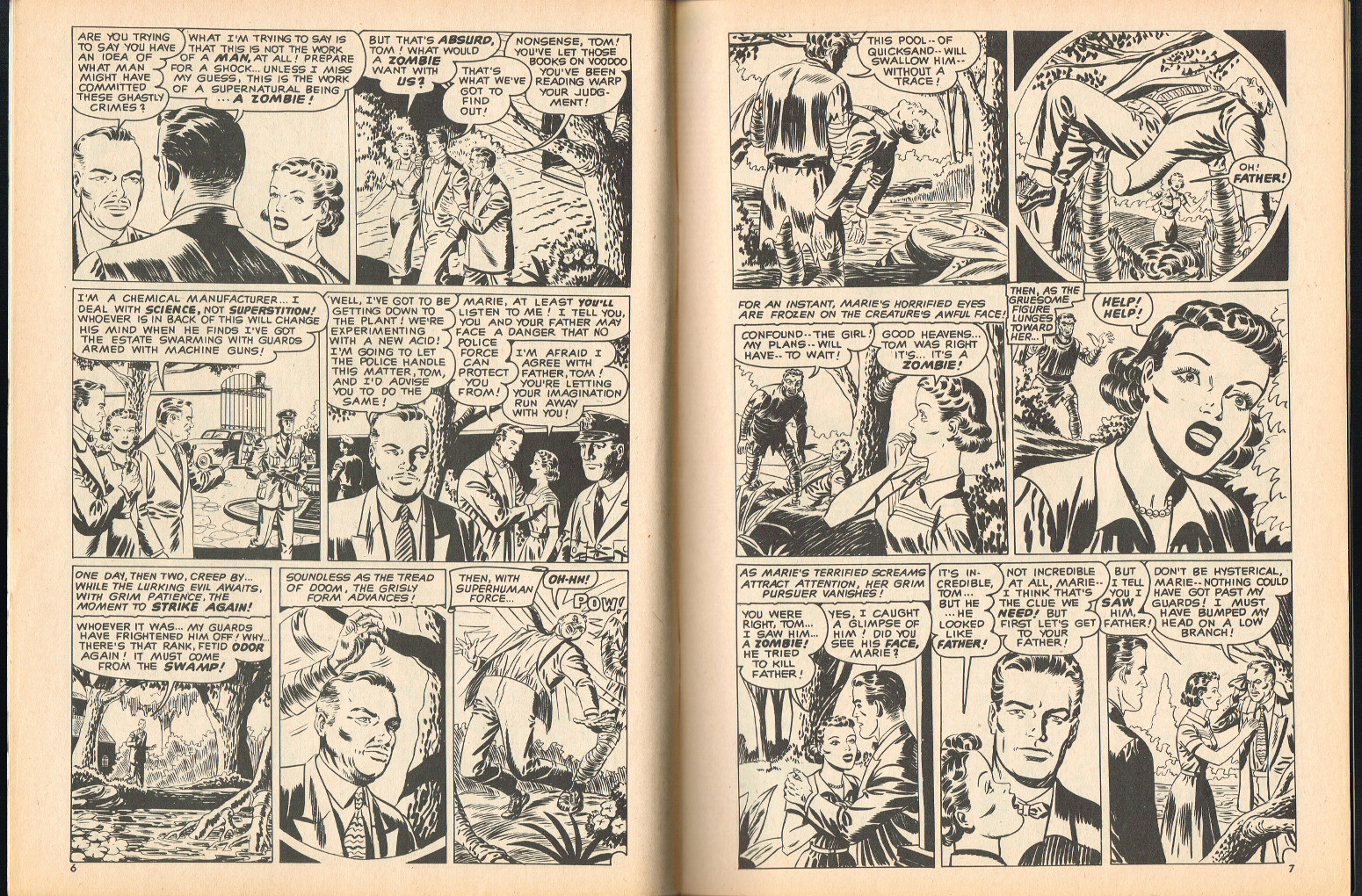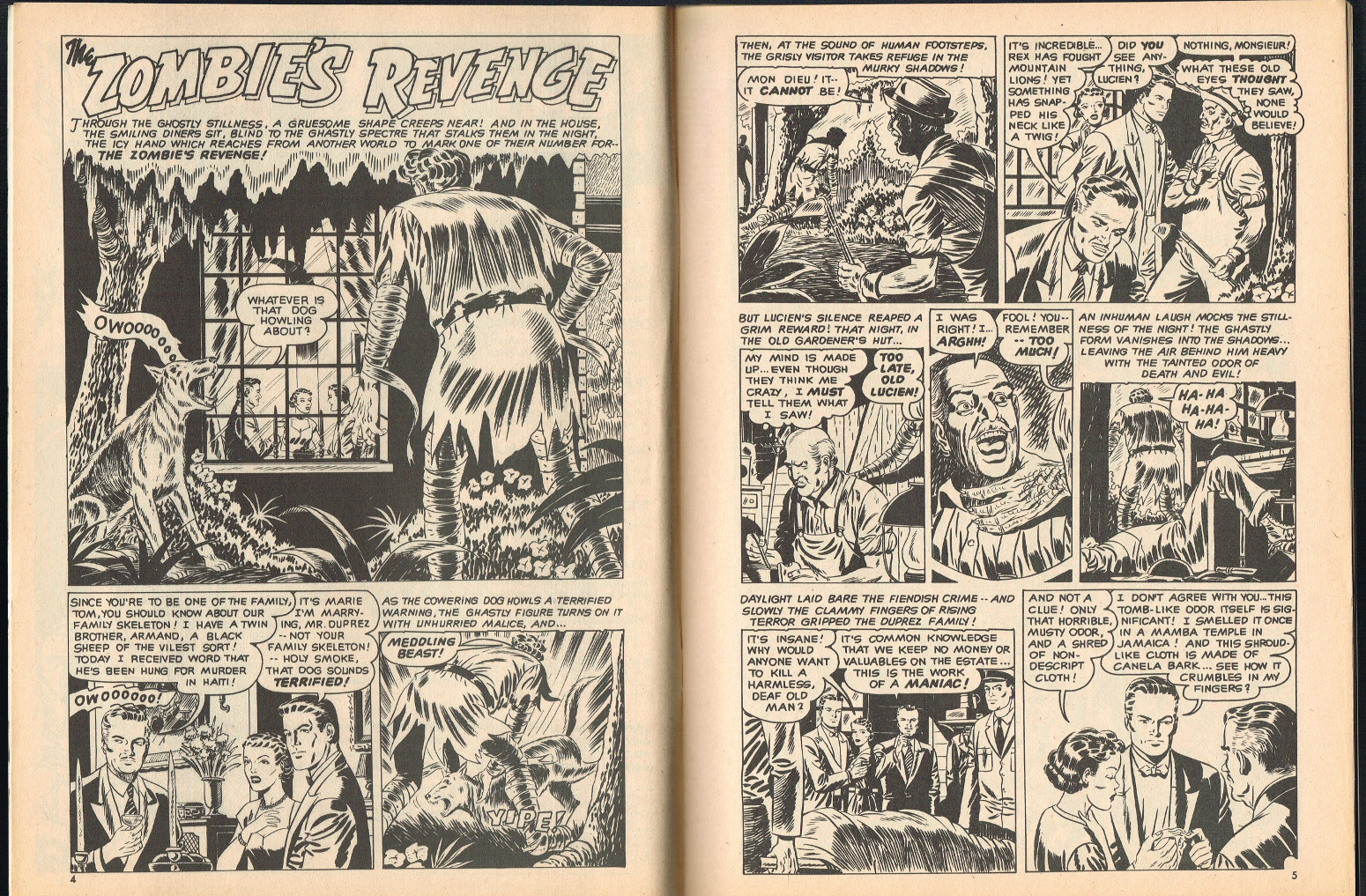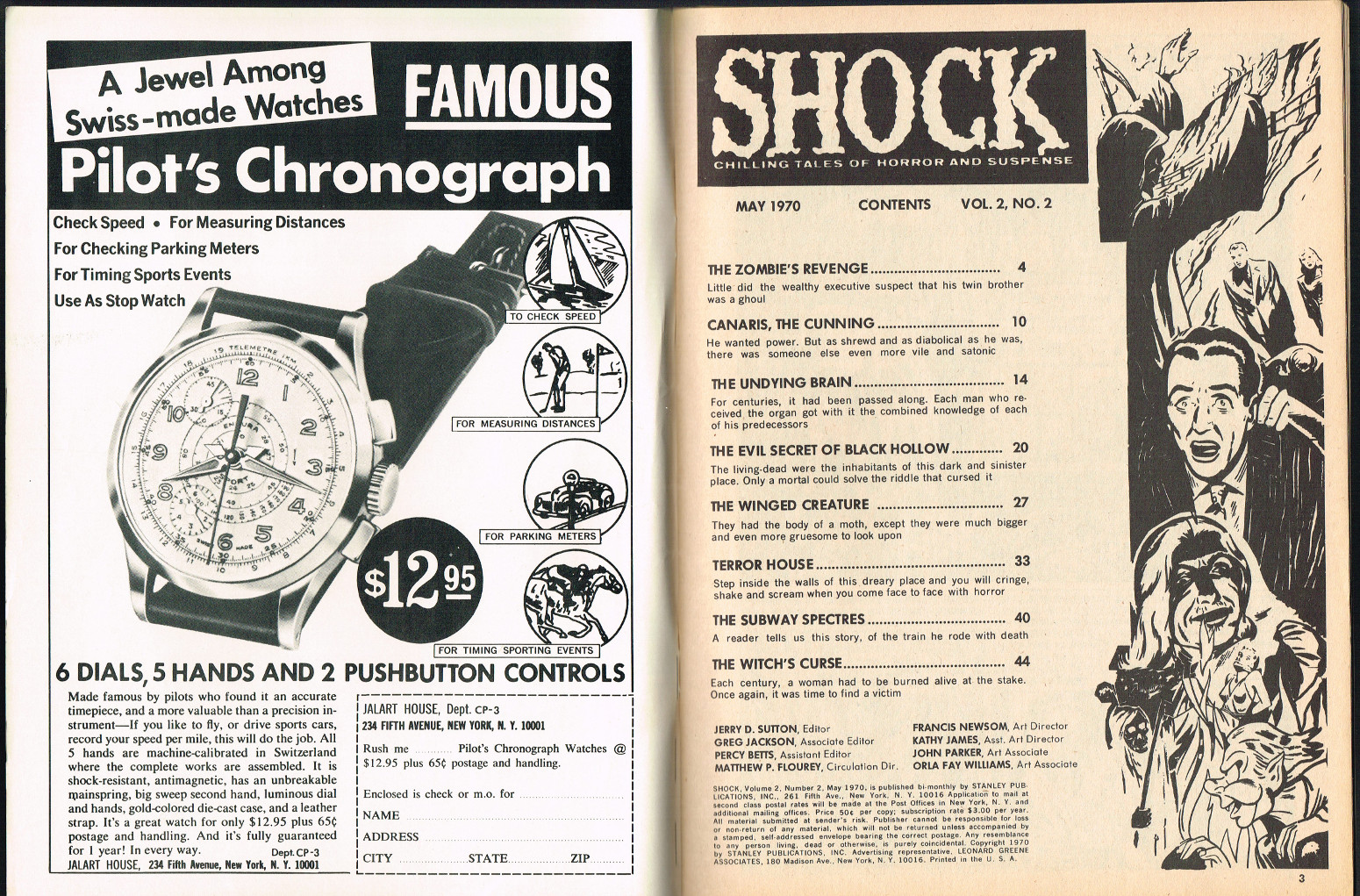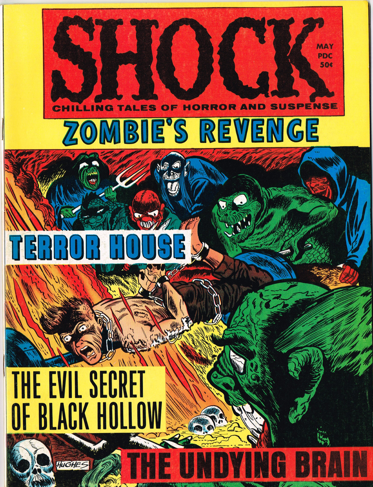 A slick gruesome cover helps to make this issue of Shock: Chilling Tales of Horror and Suspense sizzle. Did you know that salt extracted from Caribbean kelp can kill an unstoppable zombie? Or sharing your brain with others isn't all that hard to do? (How many of you give a piece of your mind to somebody every day?) Or that mummies have good harmony? "We have no grave, we have no bier. But let two mortals enter here, they'll end the curse with human breath, and doom this atmosphere of death!" Enter if you dare, I dare you.