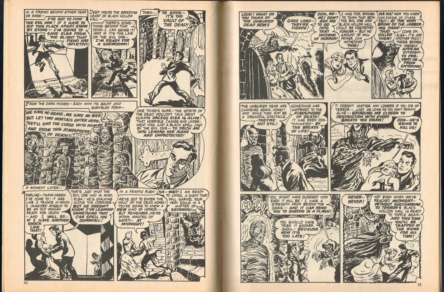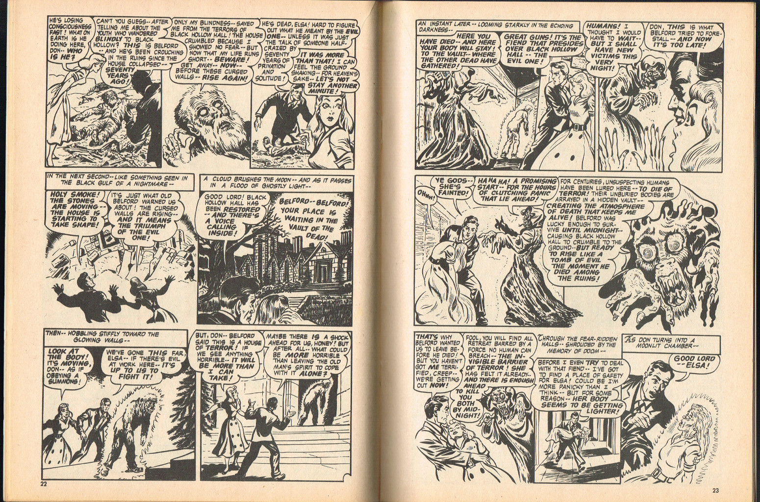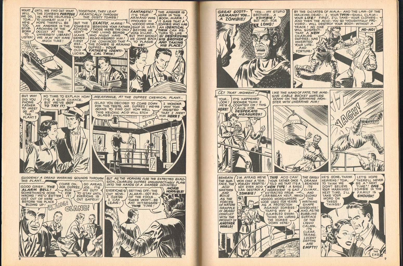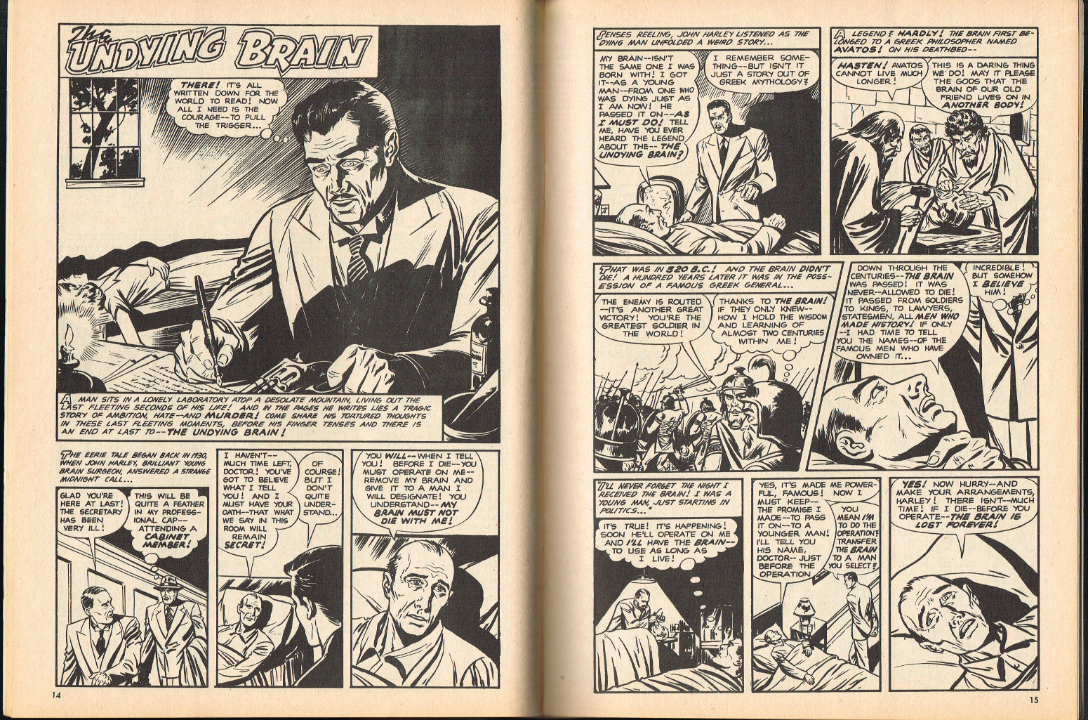 A slick gruesome cover helps to make this issue of Shock: Chilling Tales of Horror and Suspense sizzle. Did you know that salt extracted from Caribbean kelp can kill an unstoppable zombie? Or sharing your brain with others isn't all that hard to do? (How many of you give a piece of your mind to somebody every day?) Or that mummies have good harmony? "We have no grave, we have no bier. But let two mortals enter here, they'll end the curse with human breath, and doom this atmosphere of death!" Enter if you dare, I dare you.