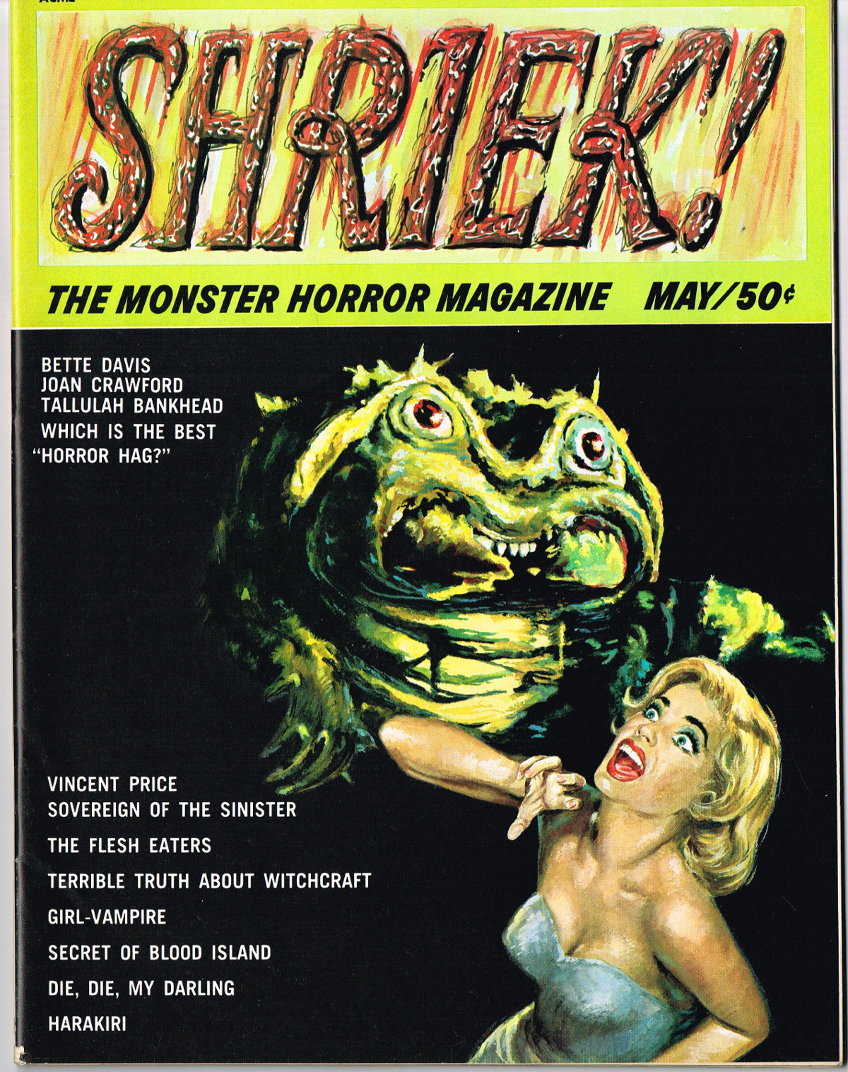 In this first issue, the Sovereign of the Sinister interview with Vincent Price begins, Isobel Black tells Shriek! about A Day in the Life of a Vampire, and Tallulah Bankhead is interviewed. ( Download Comic Reader Version of Shriek Issue 1)