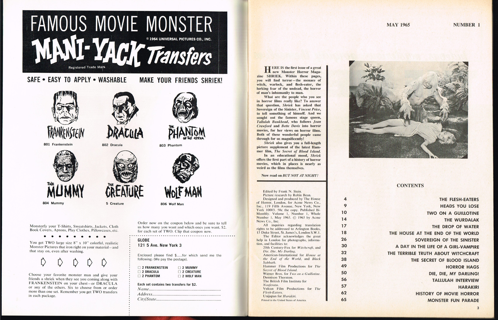 In this first issue, the Sovereign of the Sinister interview with Vincent Price begins, Isobel Black tells Shriek! about A Day in the Life of a Vampire, and Tallulah Bankhead is interviewed. ( Download Comic Reader Version of Shriek Issue 1)