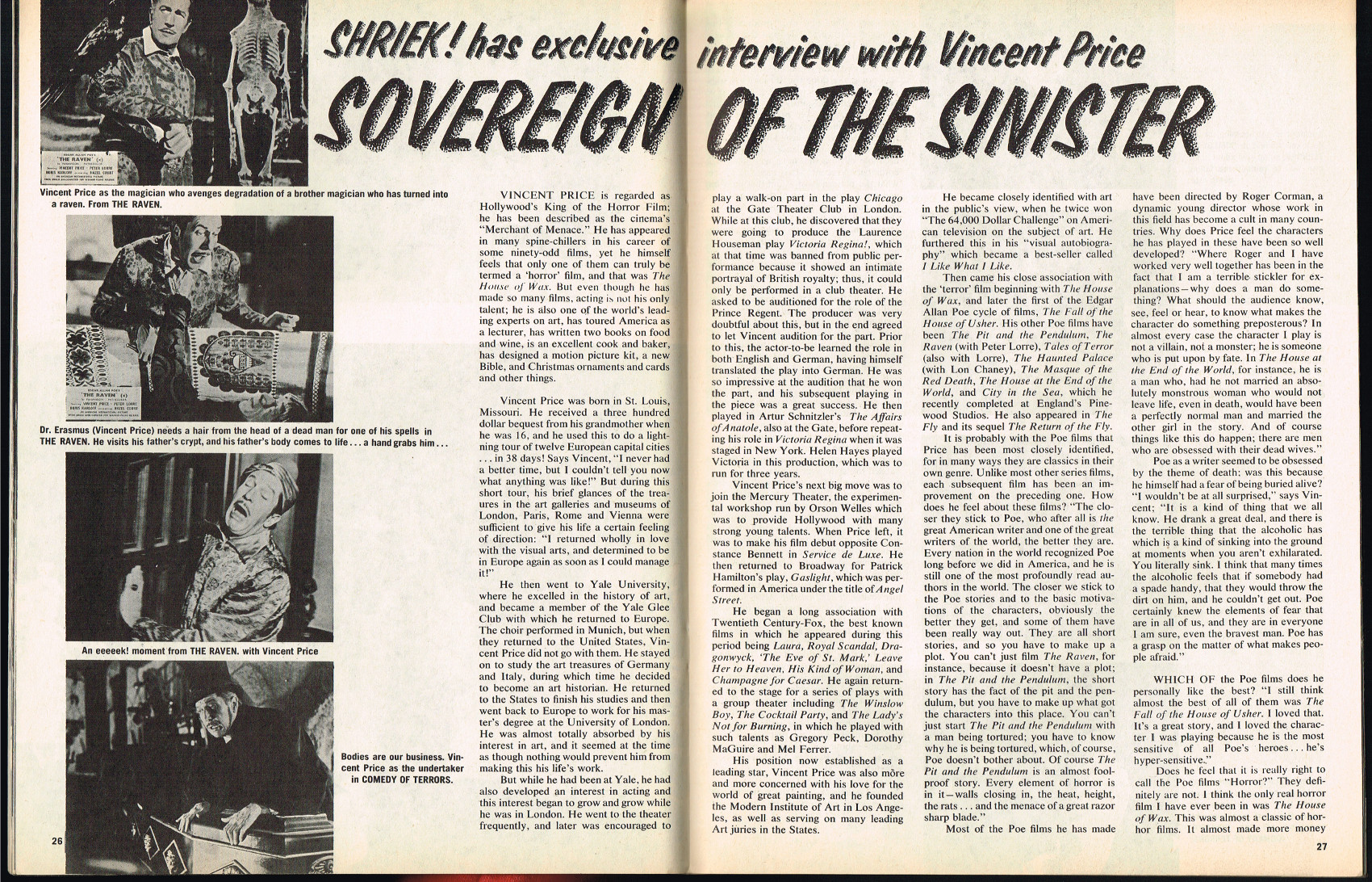 In this first issue, the Sovereign of the Sinister interview with Vincent Price begins, Isobel Black tells Shriek! about A Day in the Life of a Vampire, and Tallulah Bankhead is interviewed. ( Download Comic Reader Version of Shriek Issue 1)