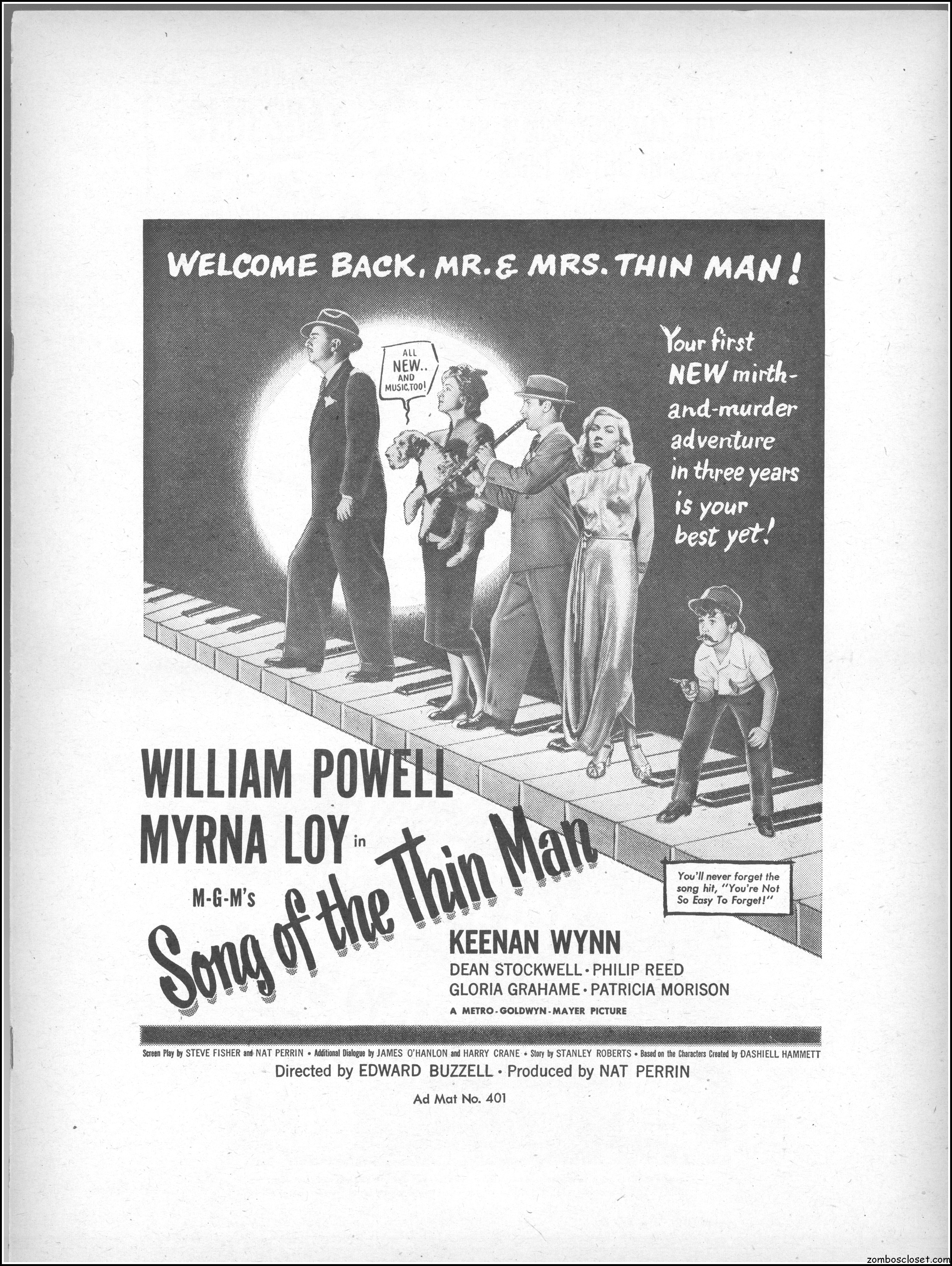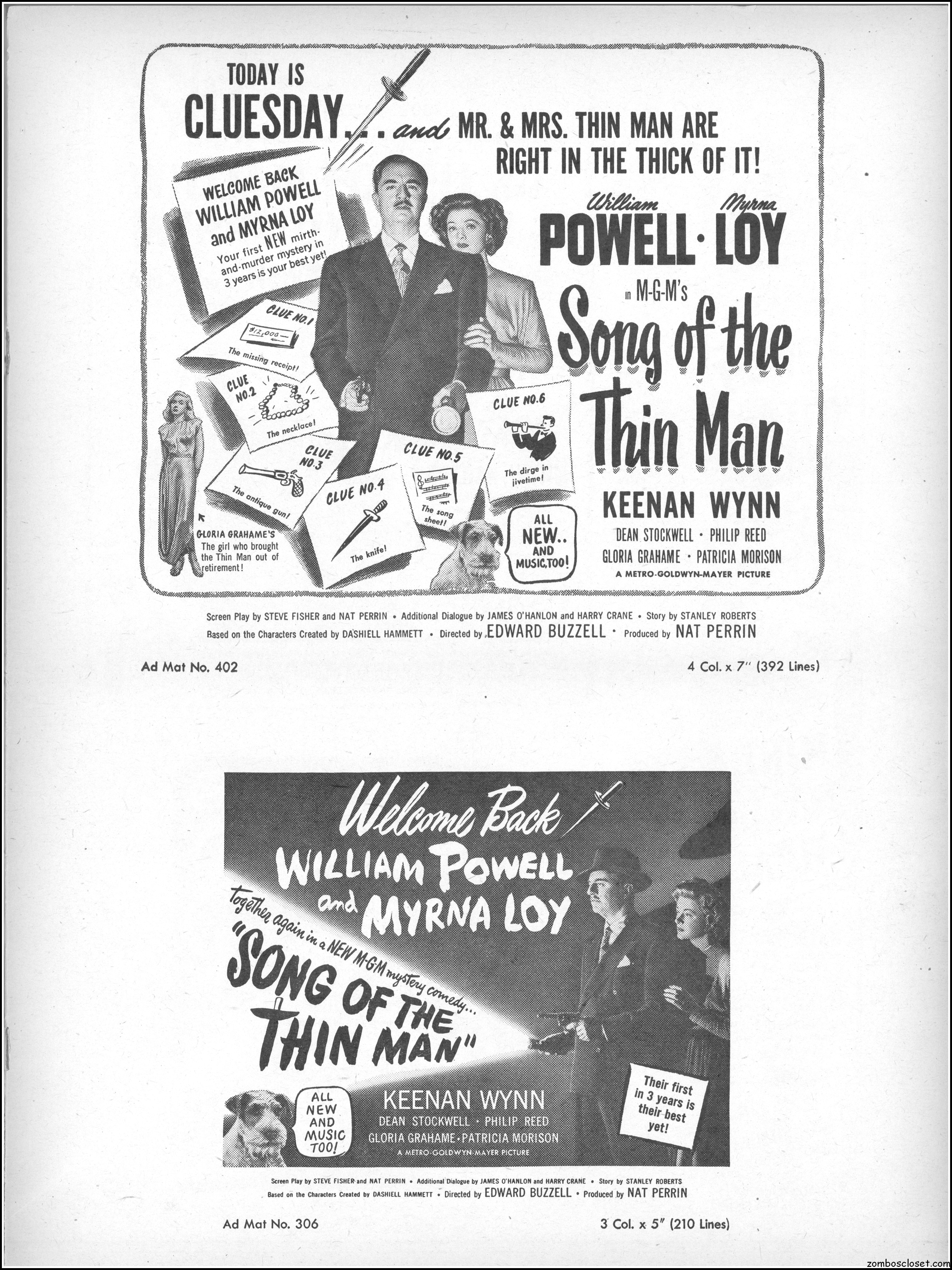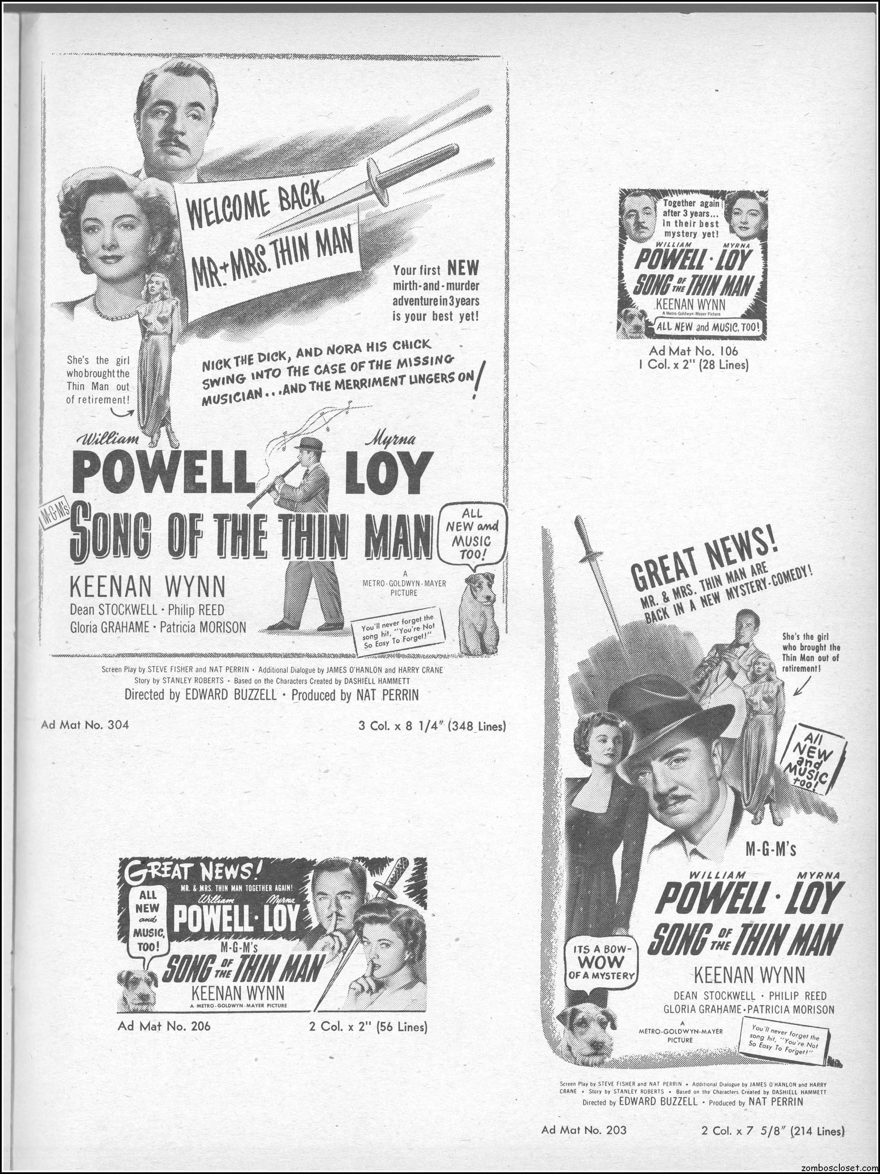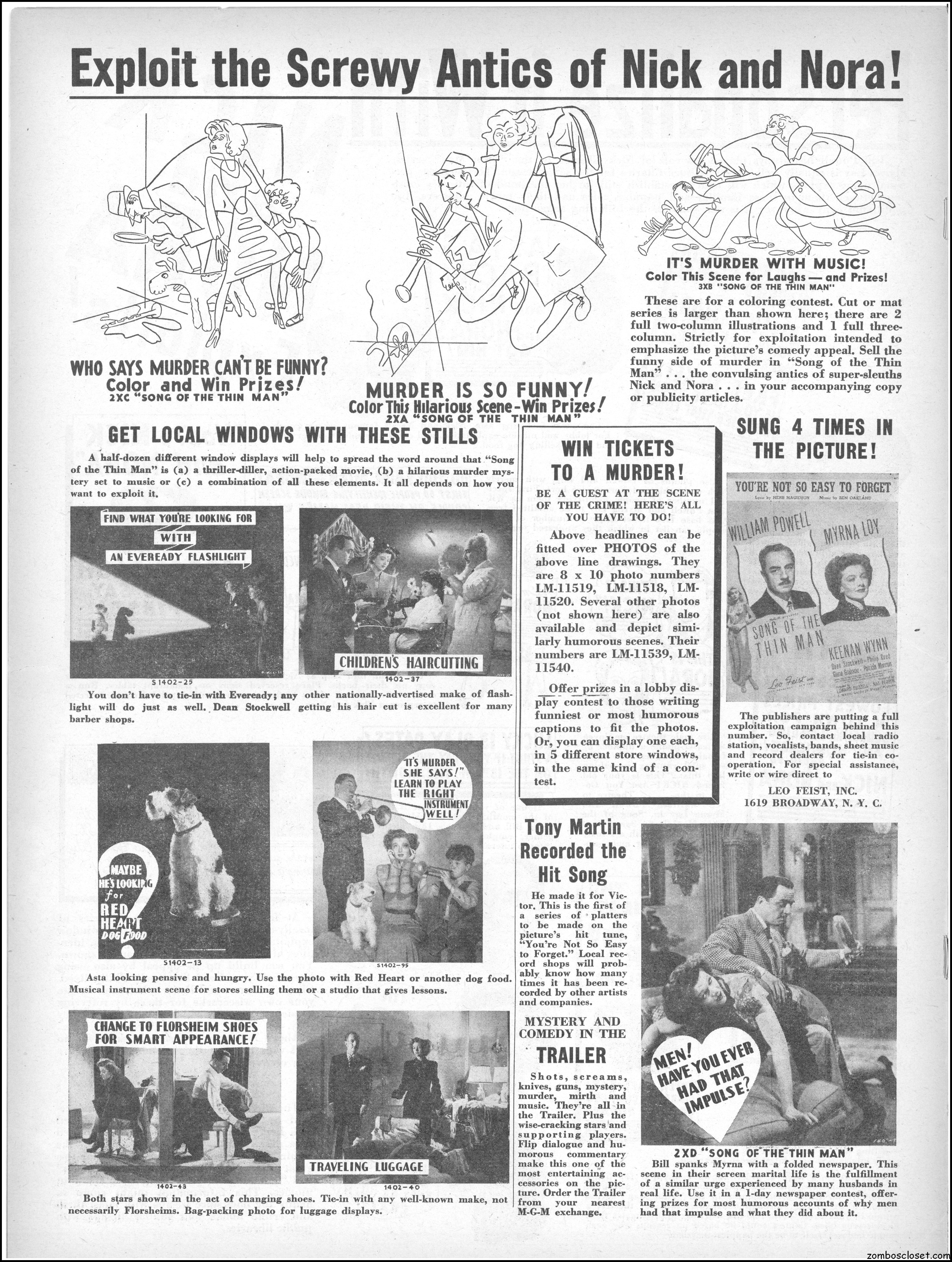 This is the rare and quite fragile pressbook for Song of the Thin Man, an enjoyable detective movie from an enjoyable MGM series of Thin Man movies). Unfortunately, MGM, around this time period, liked to print their pressbooks on cheap newsprint pulpy paper, which doesn’t hold up well over time. I had to be extremely careful while scanning this beauty, but even then I added more rips in the browning paper. But there’s a wealth of creative promotion and style here, so it was worth it. I hope you think so too. This movie was the sixth and last one in the series.