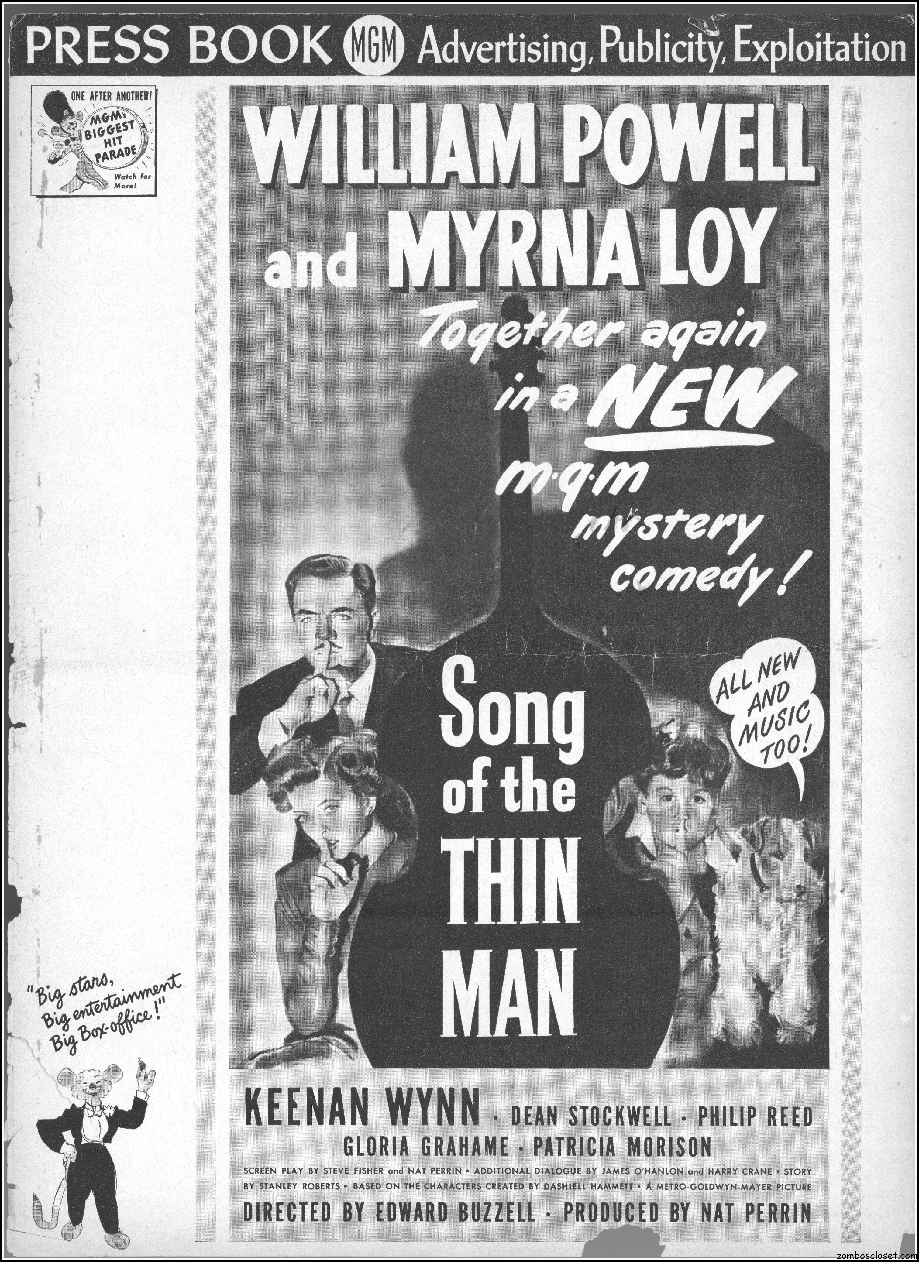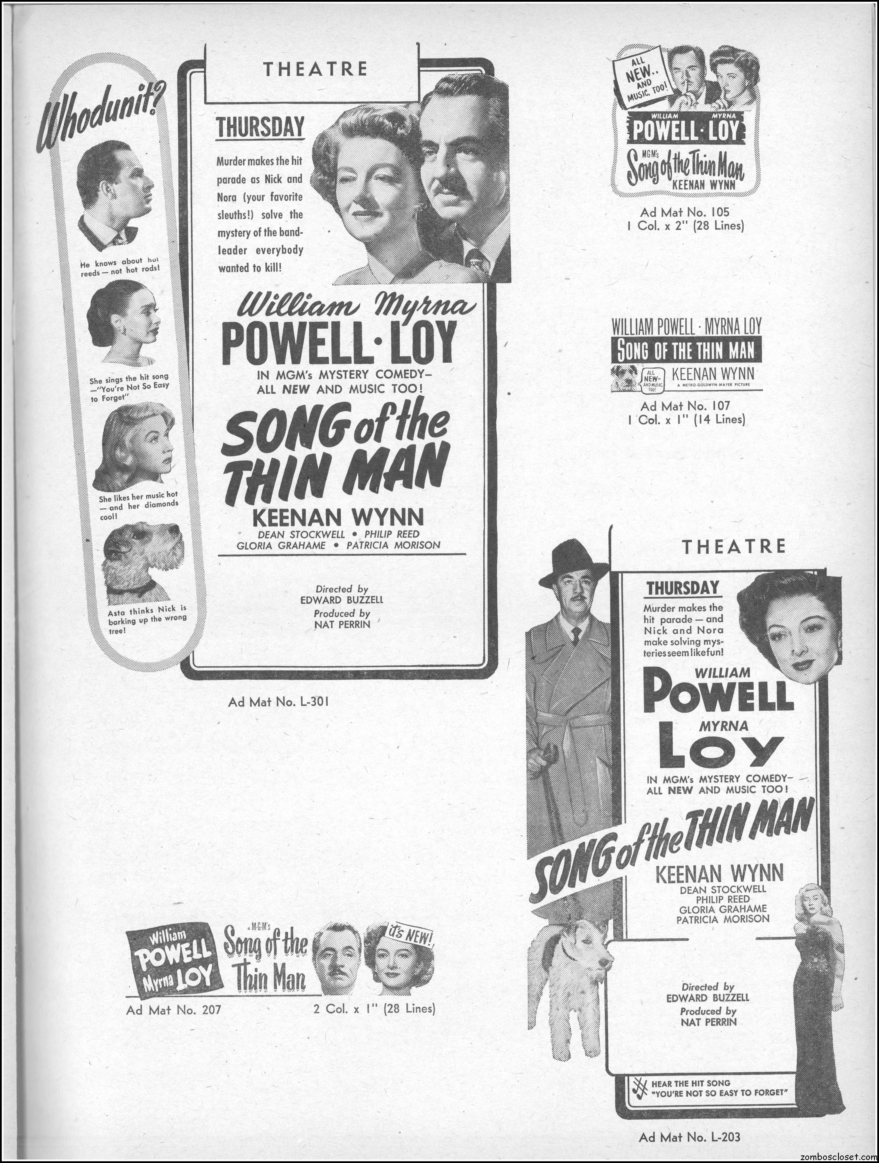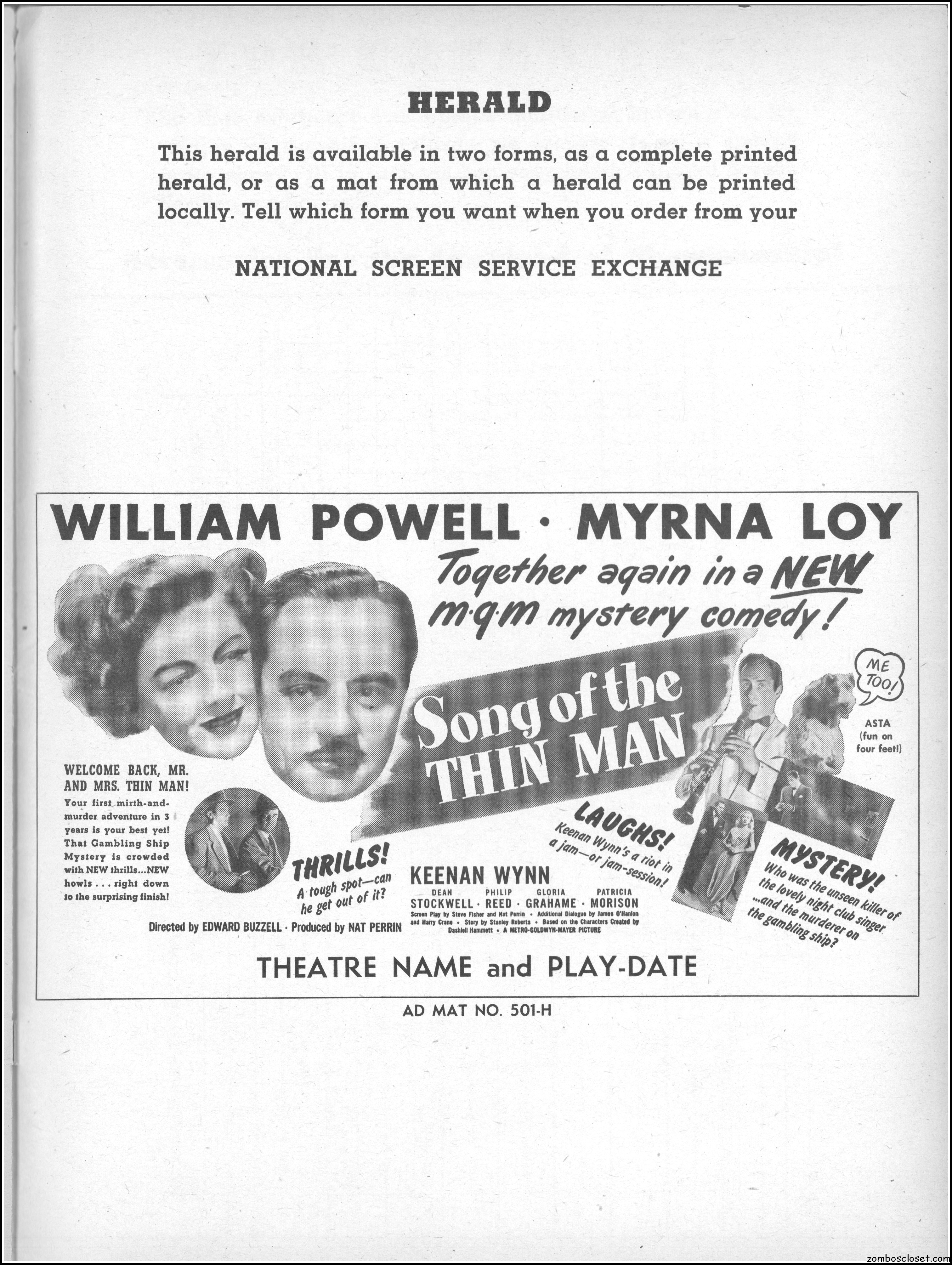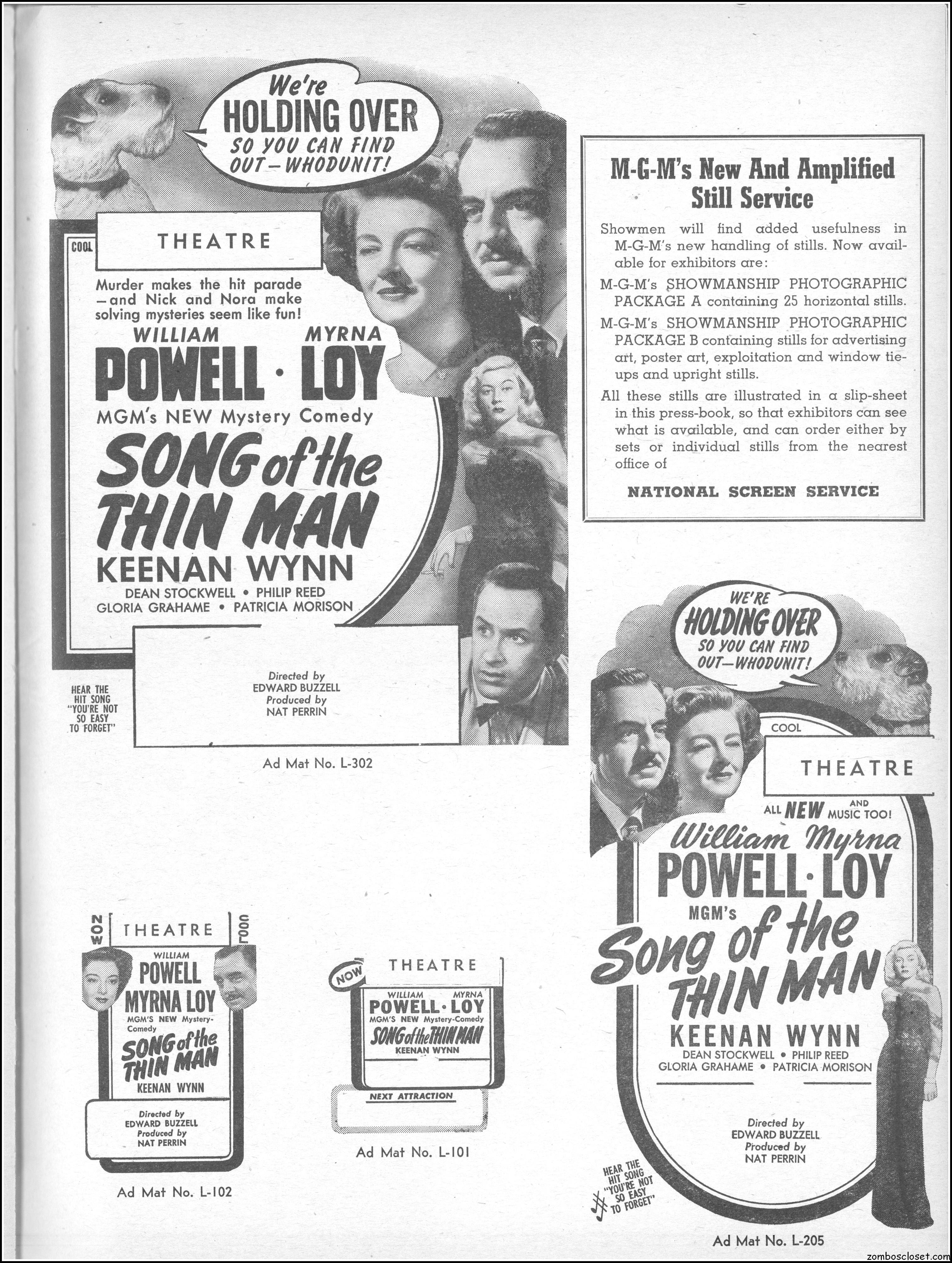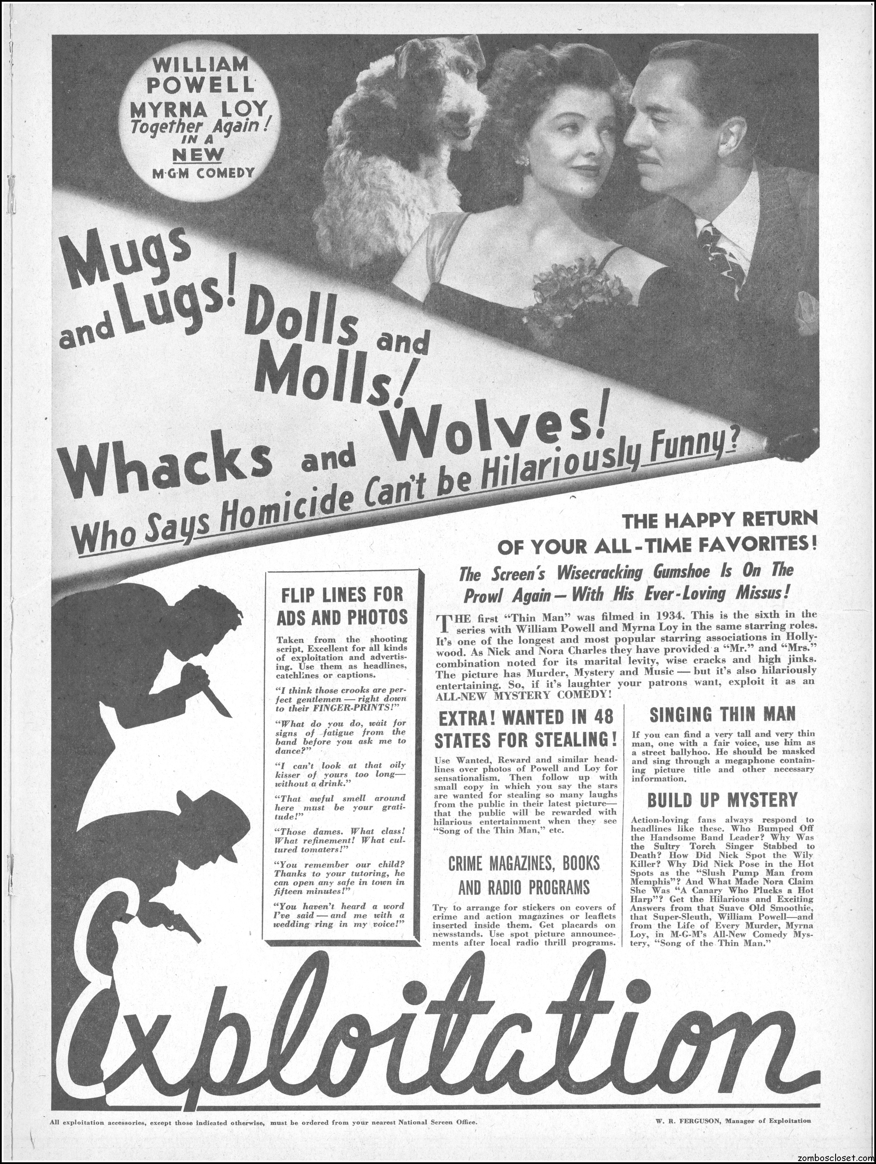 This is the rare and quite fragile pressbook for Song of the Thin Man, an enjoyable detective movie from an enjoyable MGM series of Thin Man movies). Unfortunately, MGM, around this time period, liked to print their pressbooks on cheap newsprint pulpy paper, which doesn’t hold up well over time. I had to be extremely careful while scanning this beauty, but even then I added more rips in the browning paper. But there’s a wealth of creative promotion and style here, so it was worth it. I hope you think so too. This movie was the sixth and last one in the series.