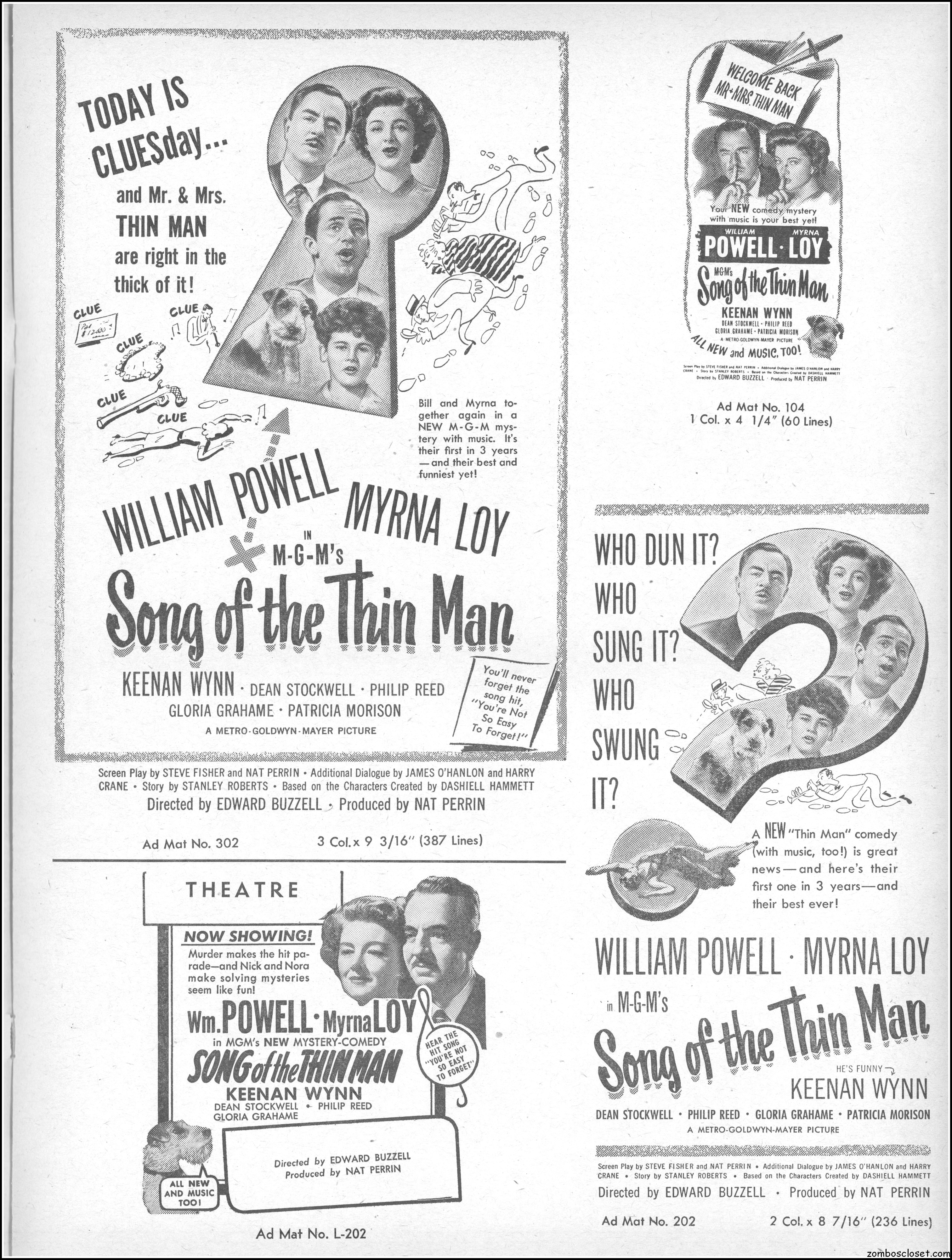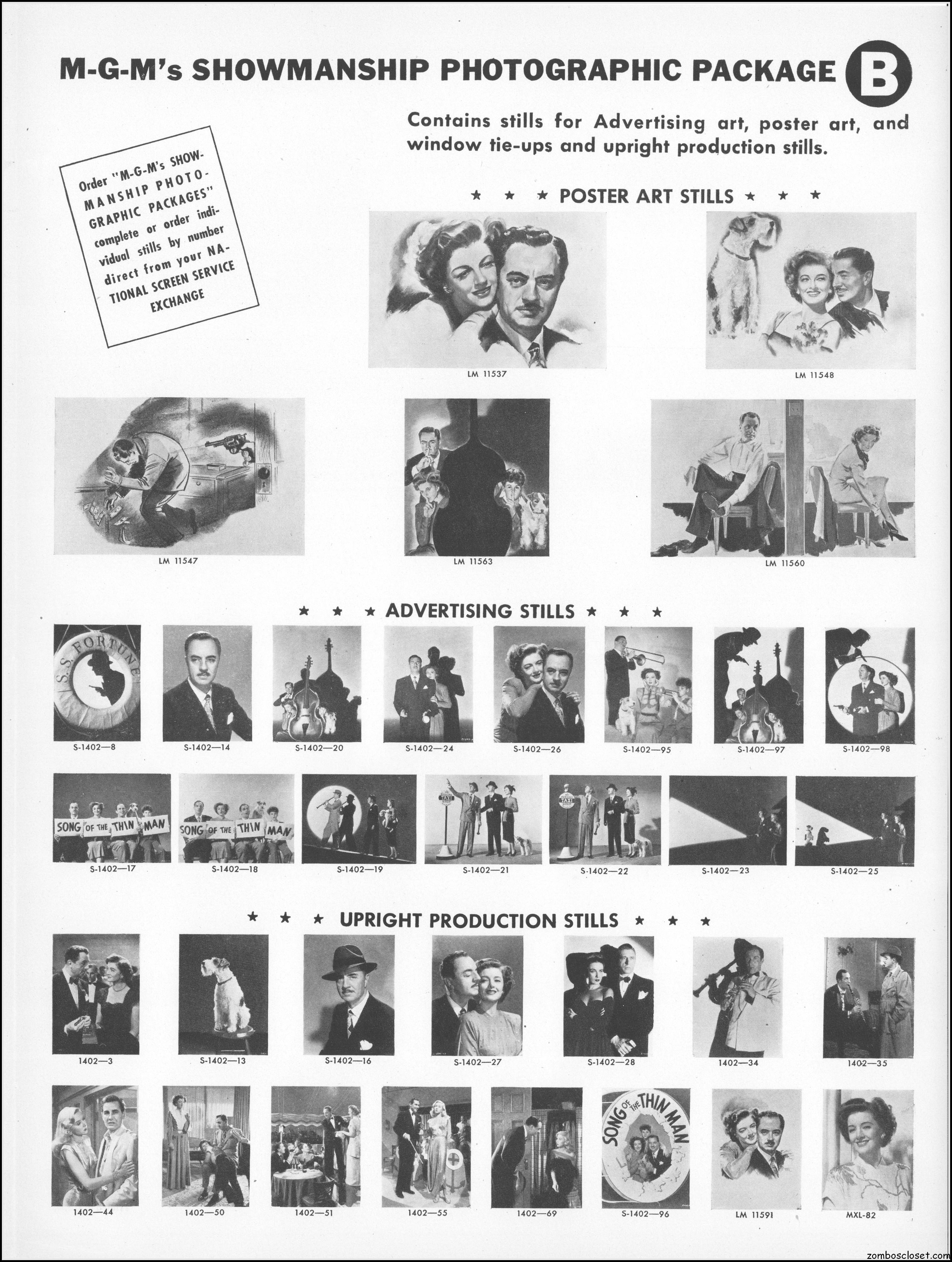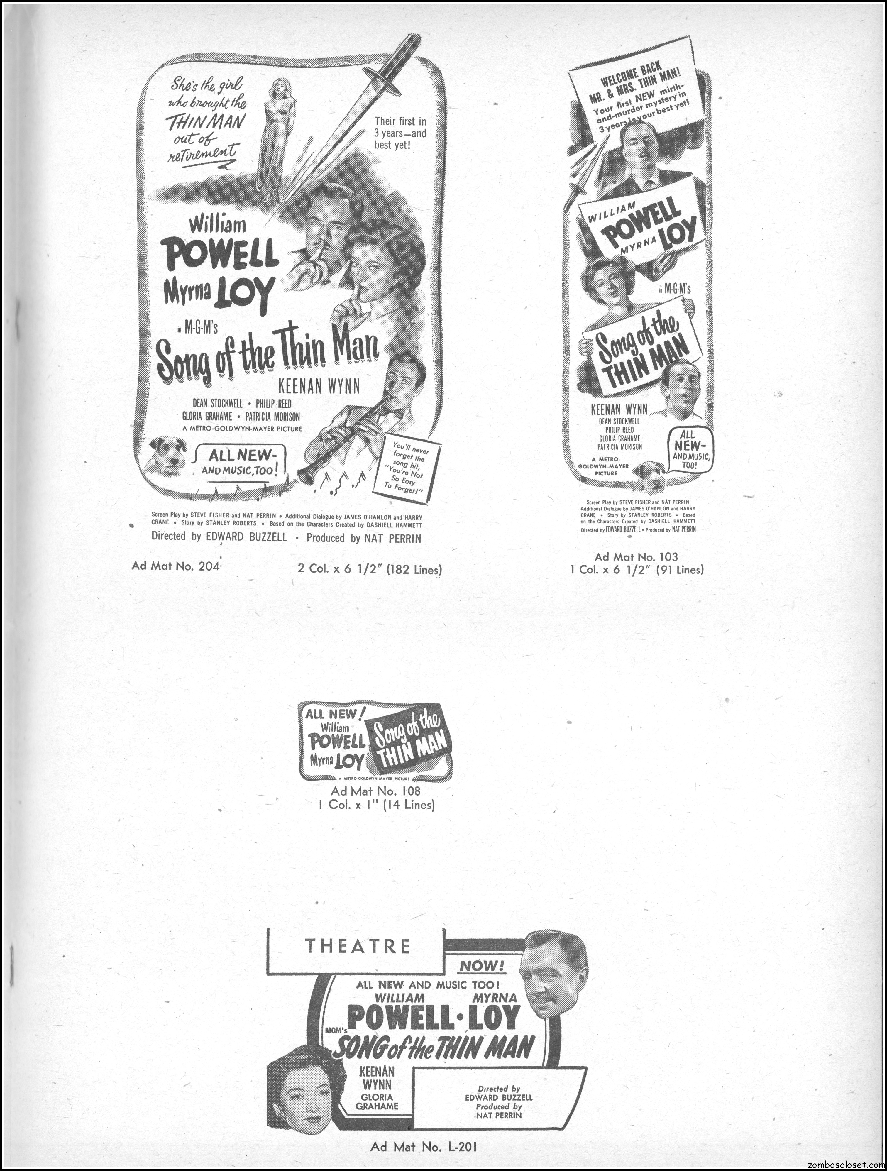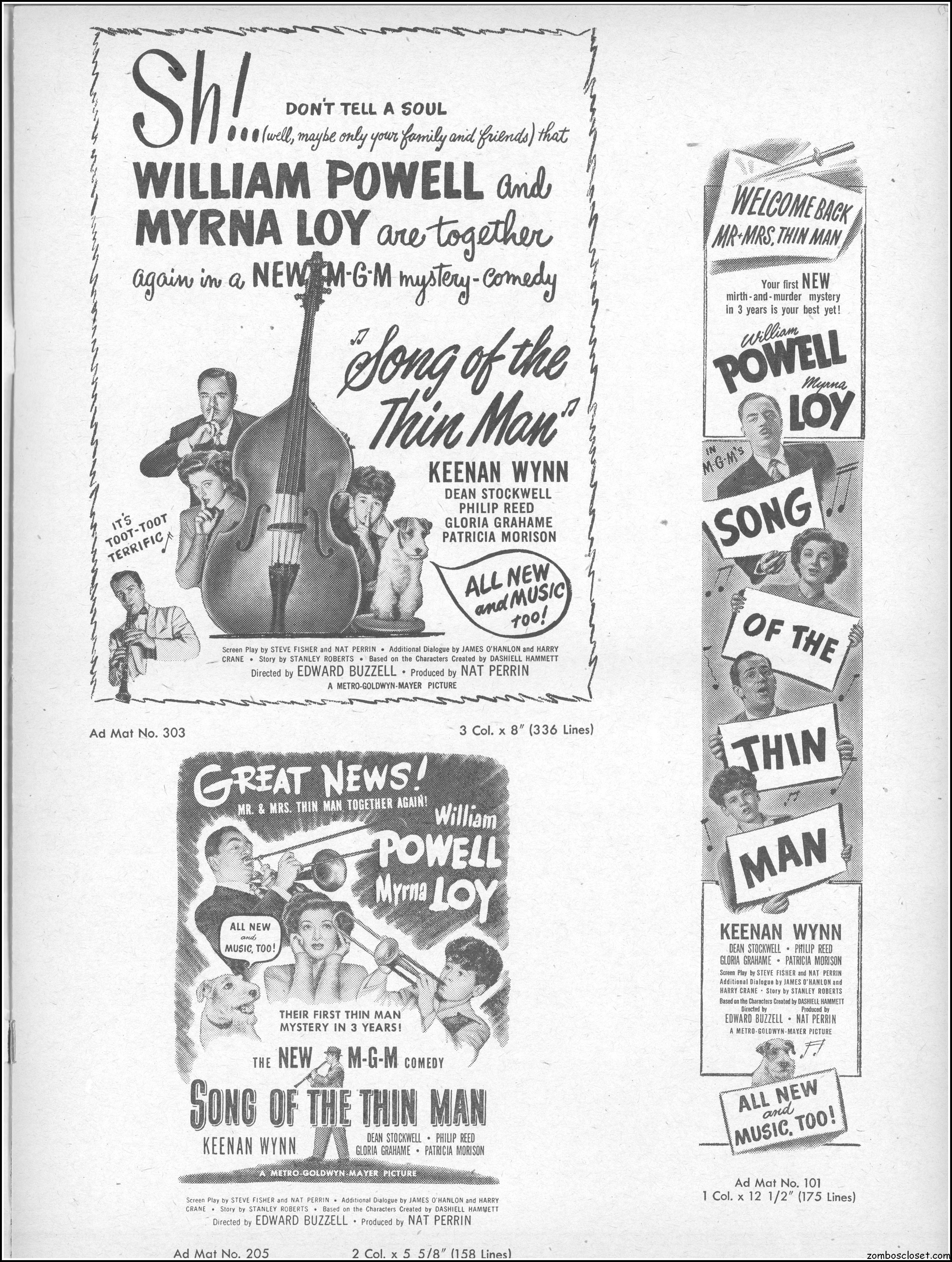 This is the rare and quite fragile pressbook for Song of the Thin Man, an enjoyable detective movie from an enjoyable MGM series of Thin Man movies). Unfortunately, MGM, around this time period, liked to print their pressbooks on cheap newsprint pulpy paper, which doesn’t hold up well over time. I had to be extremely careful while scanning this beauty, but even then I added more rips in the browning paper. But there’s a wealth of creative promotion and style here, so it was worth it. I hope you think so too. This movie was the sixth and last one in the series.