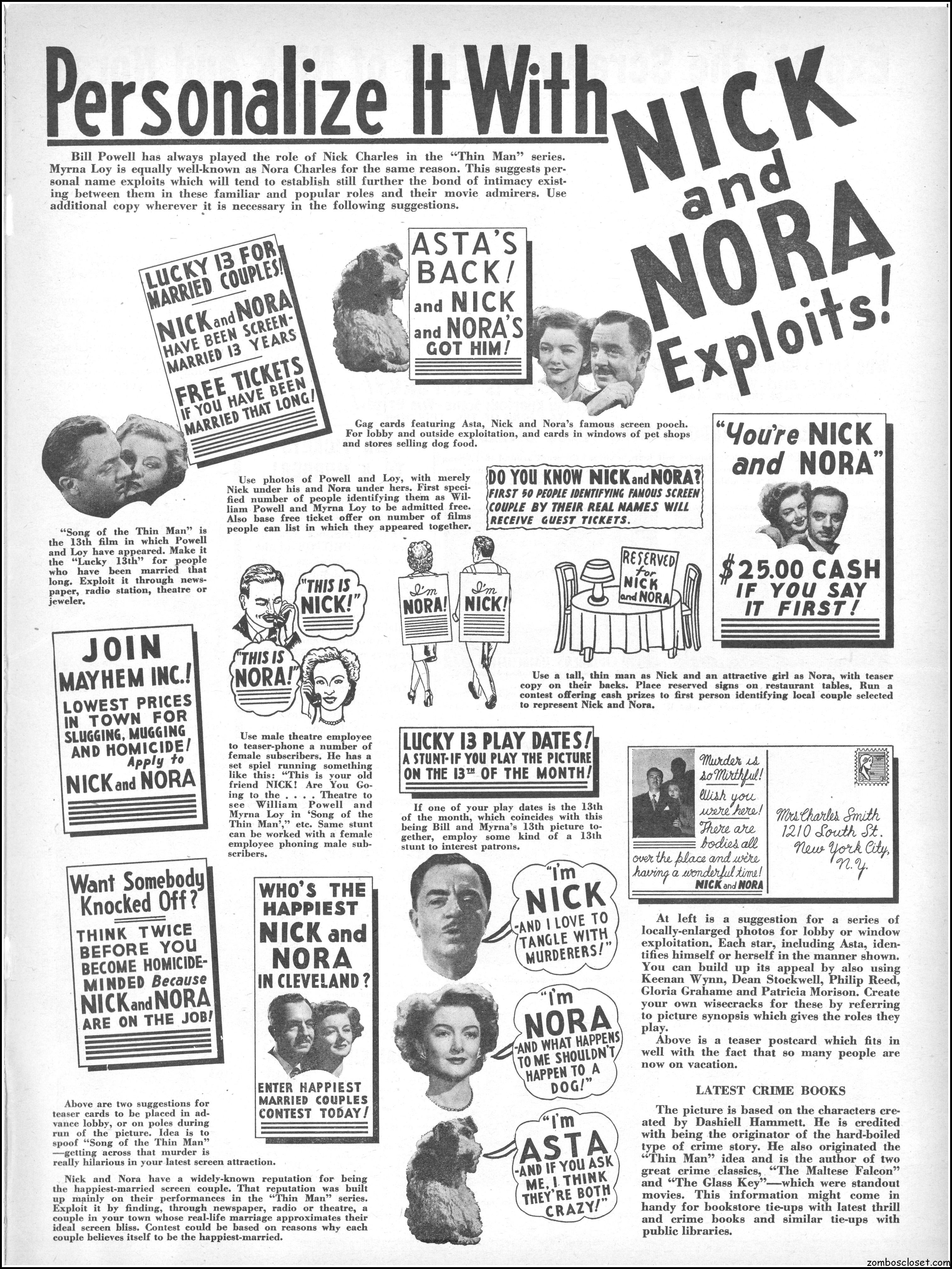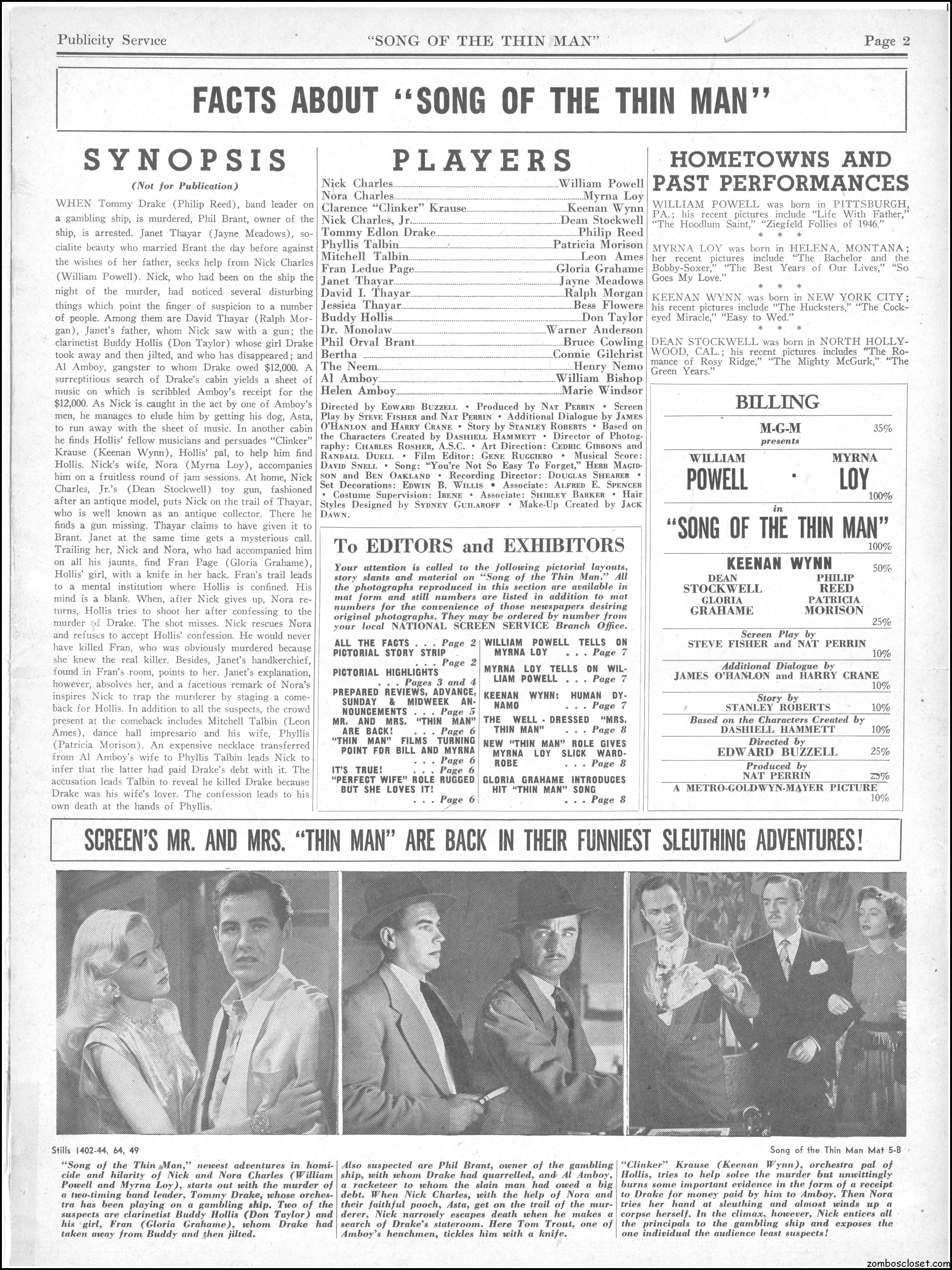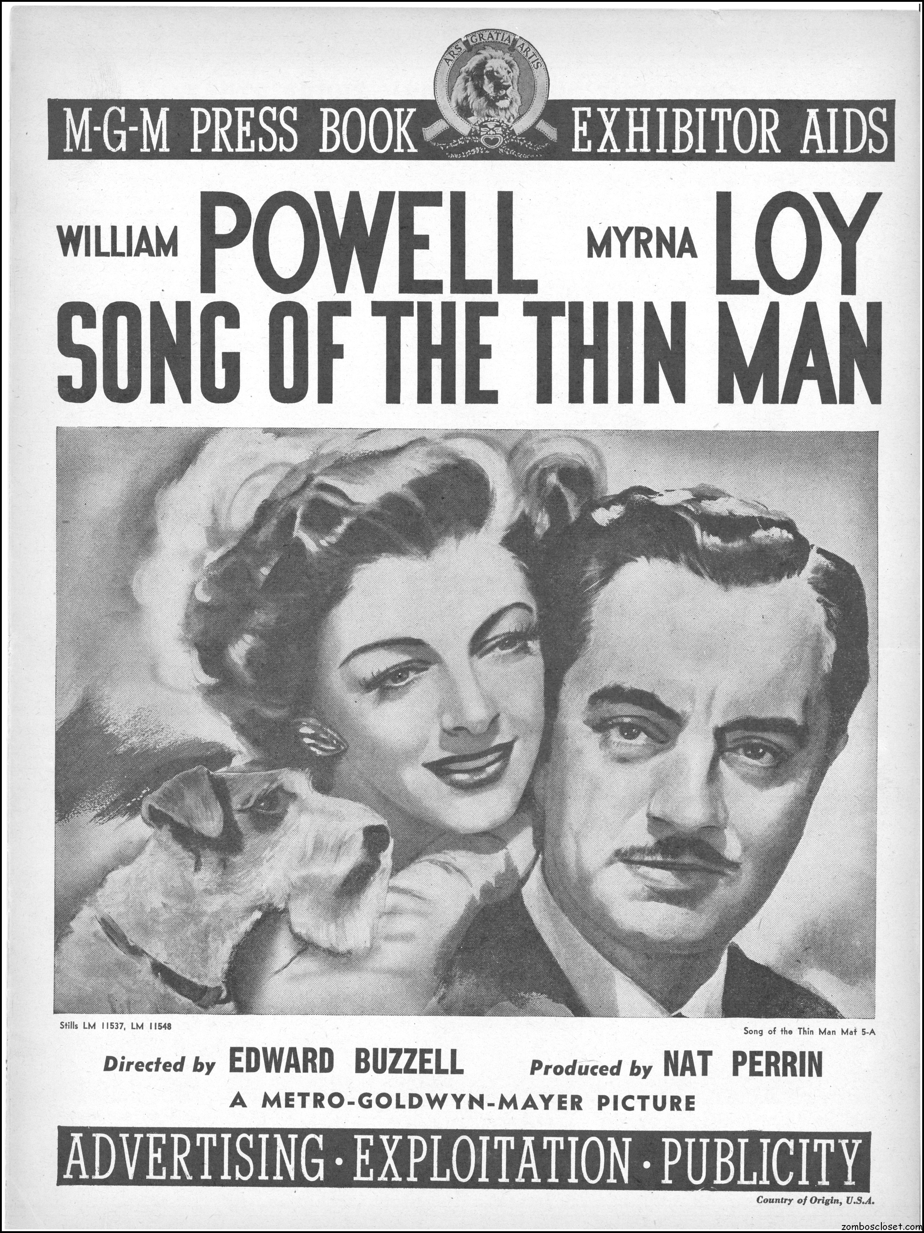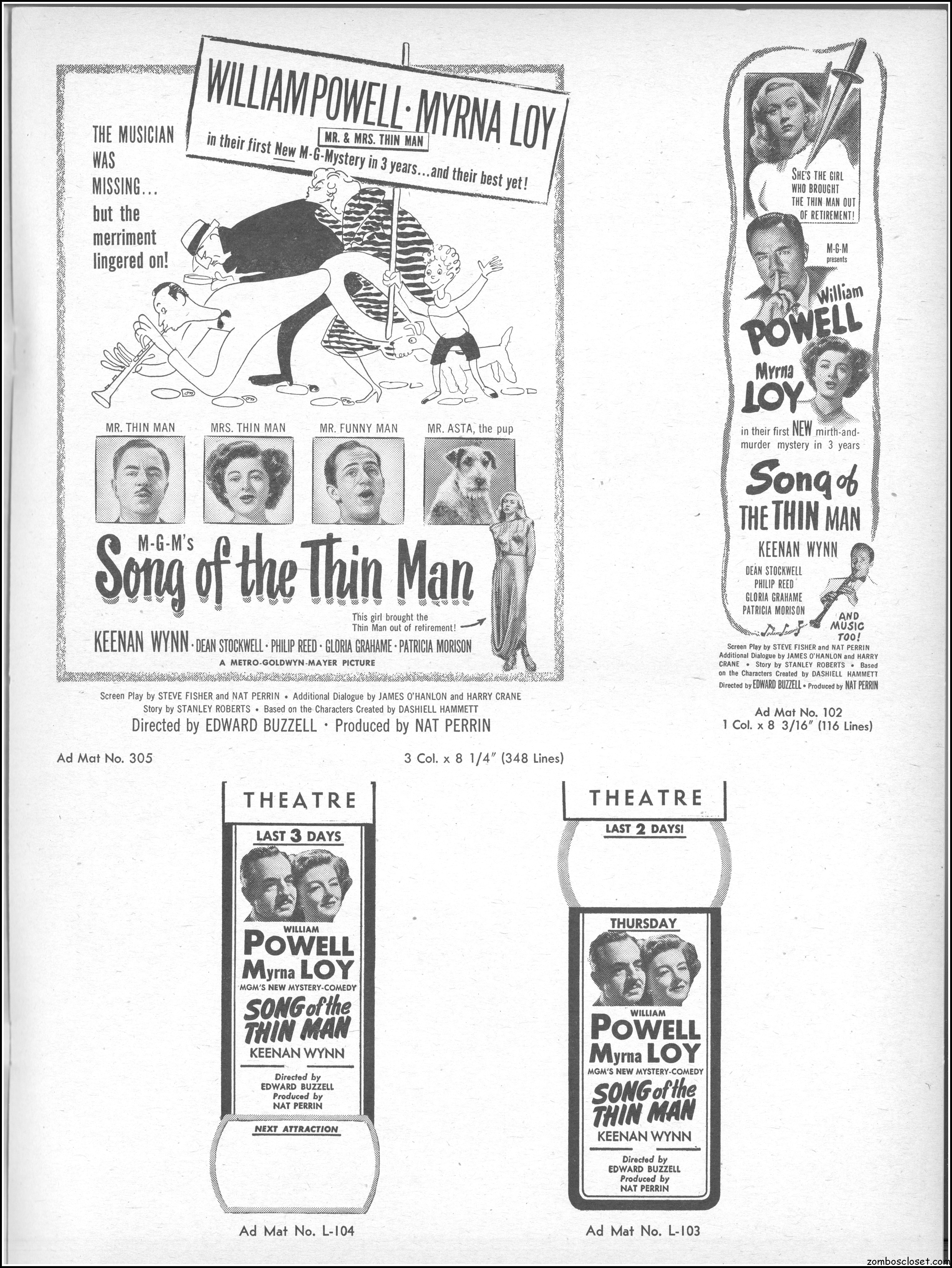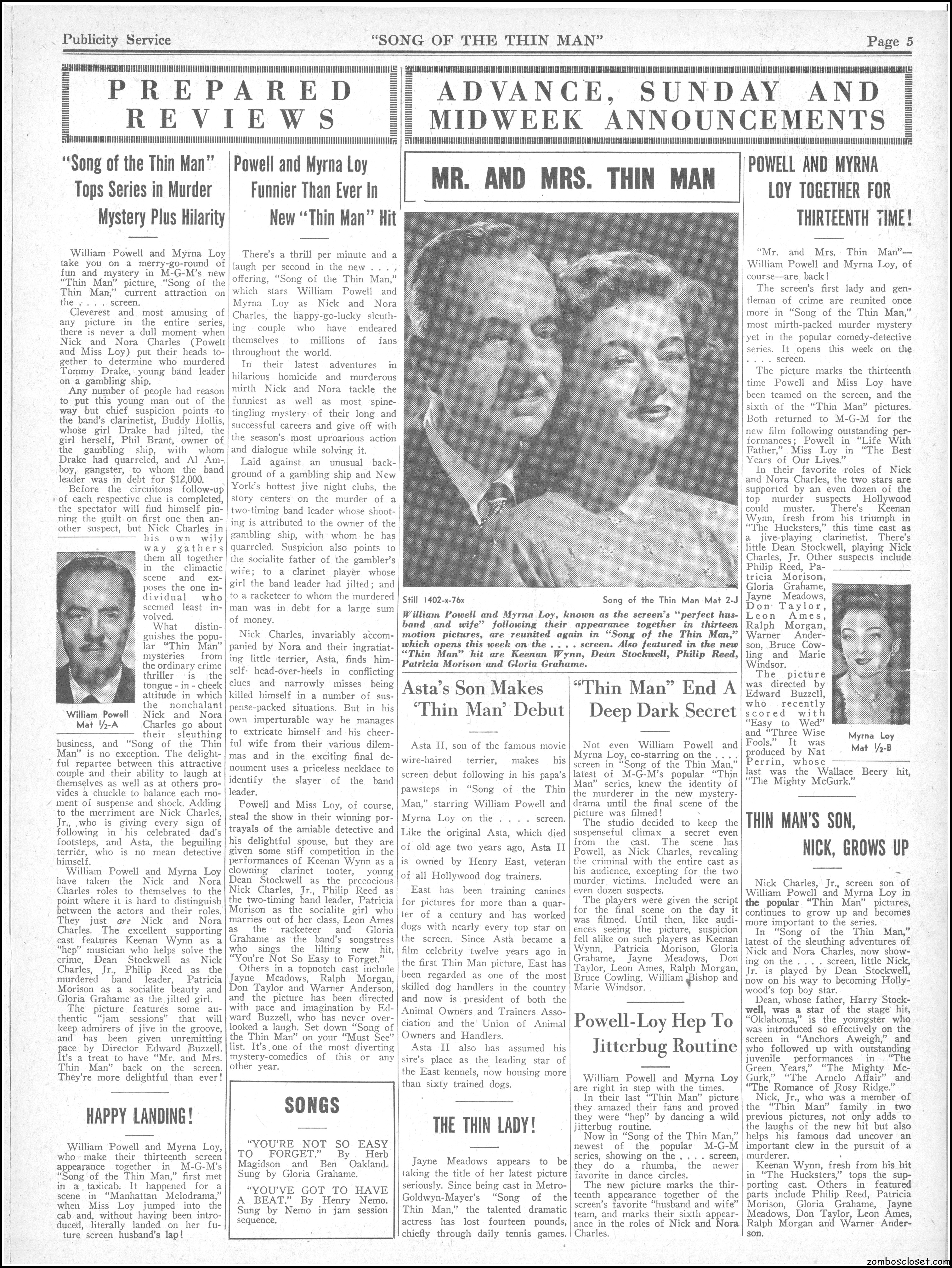 This is the rare and quite fragile pressbook for Song of the Thin Man, an enjoyable detective movie from an enjoyable MGM series of Thin Man movies). Unfortunately, MGM, around this time period, liked to print their pressbooks on cheap newsprint pulpy paper, which doesn’t hold up well over time. I had to be extremely careful while scanning this beauty, but even then I added more rips in the browning paper. But there’s a wealth of creative promotion and style here, so it was worth it. I hope you think so too. This movie was the sixth and last one in the series.