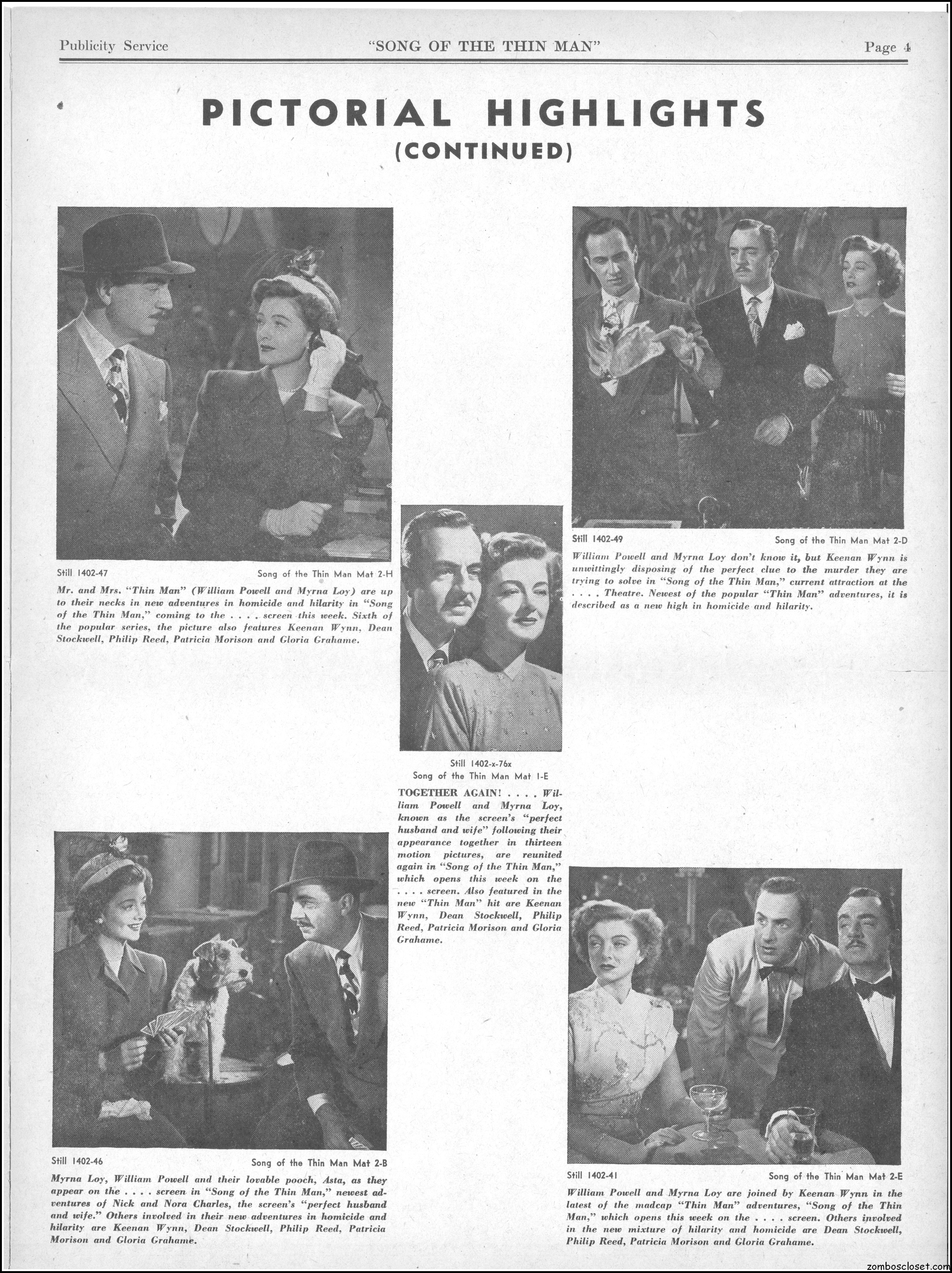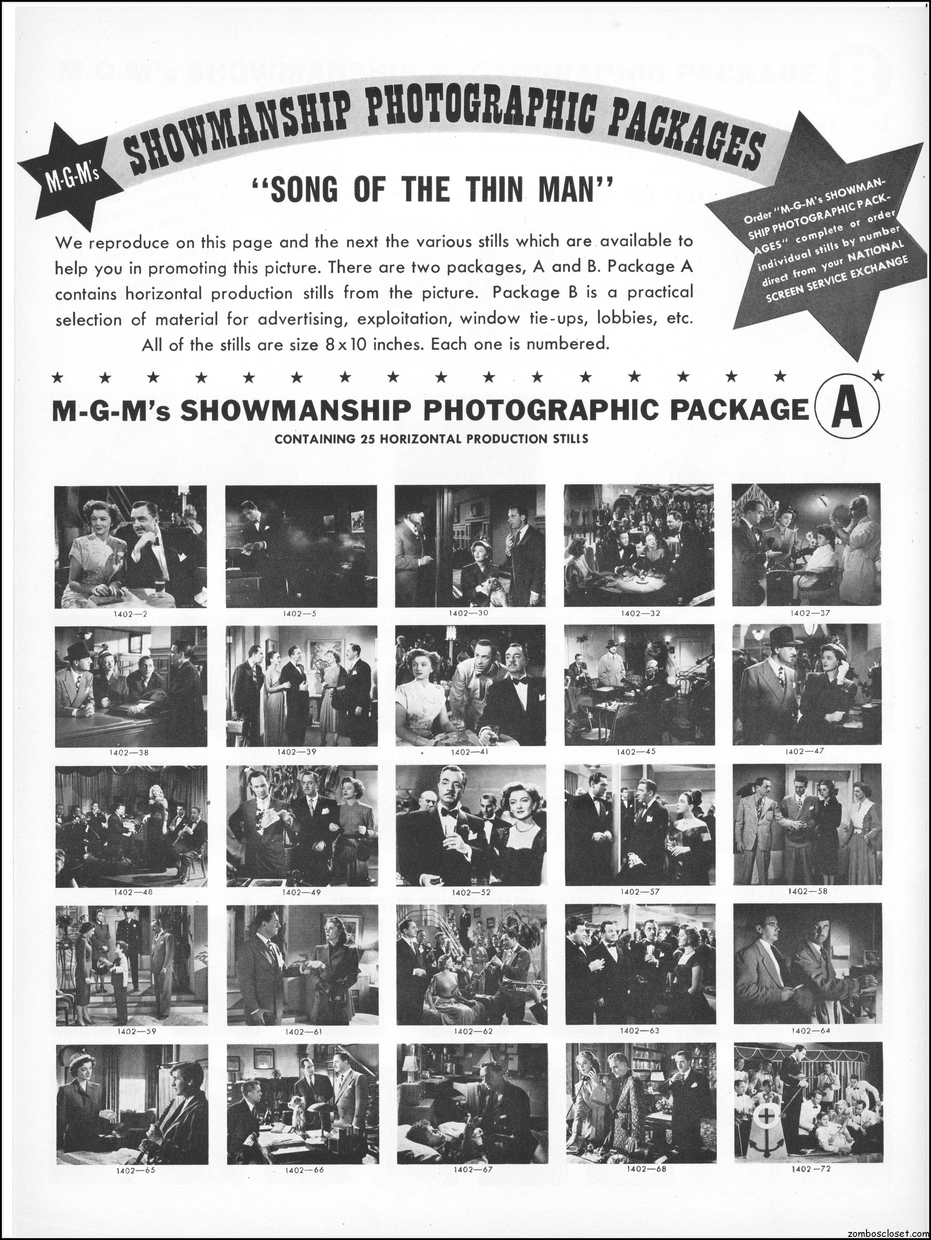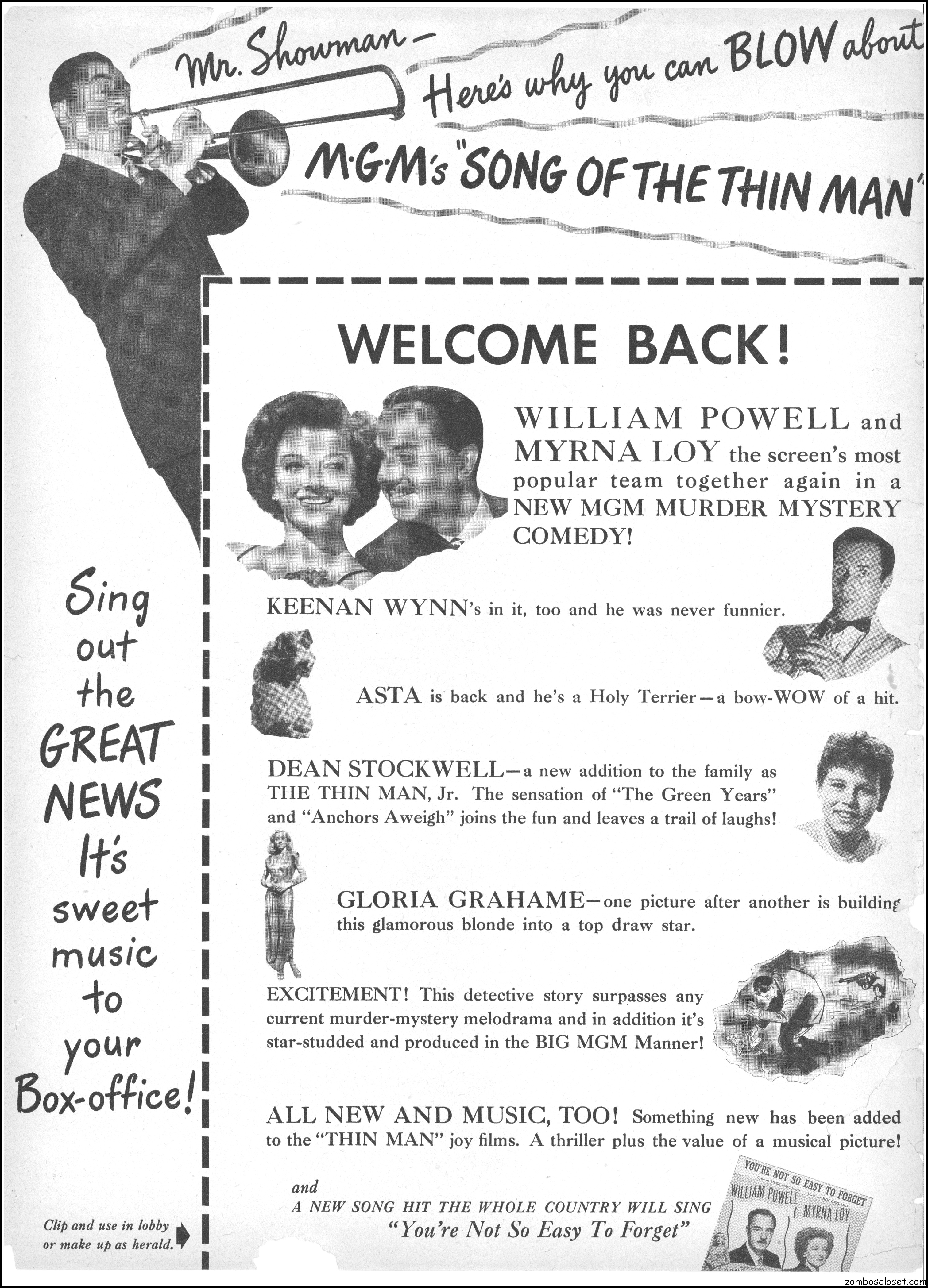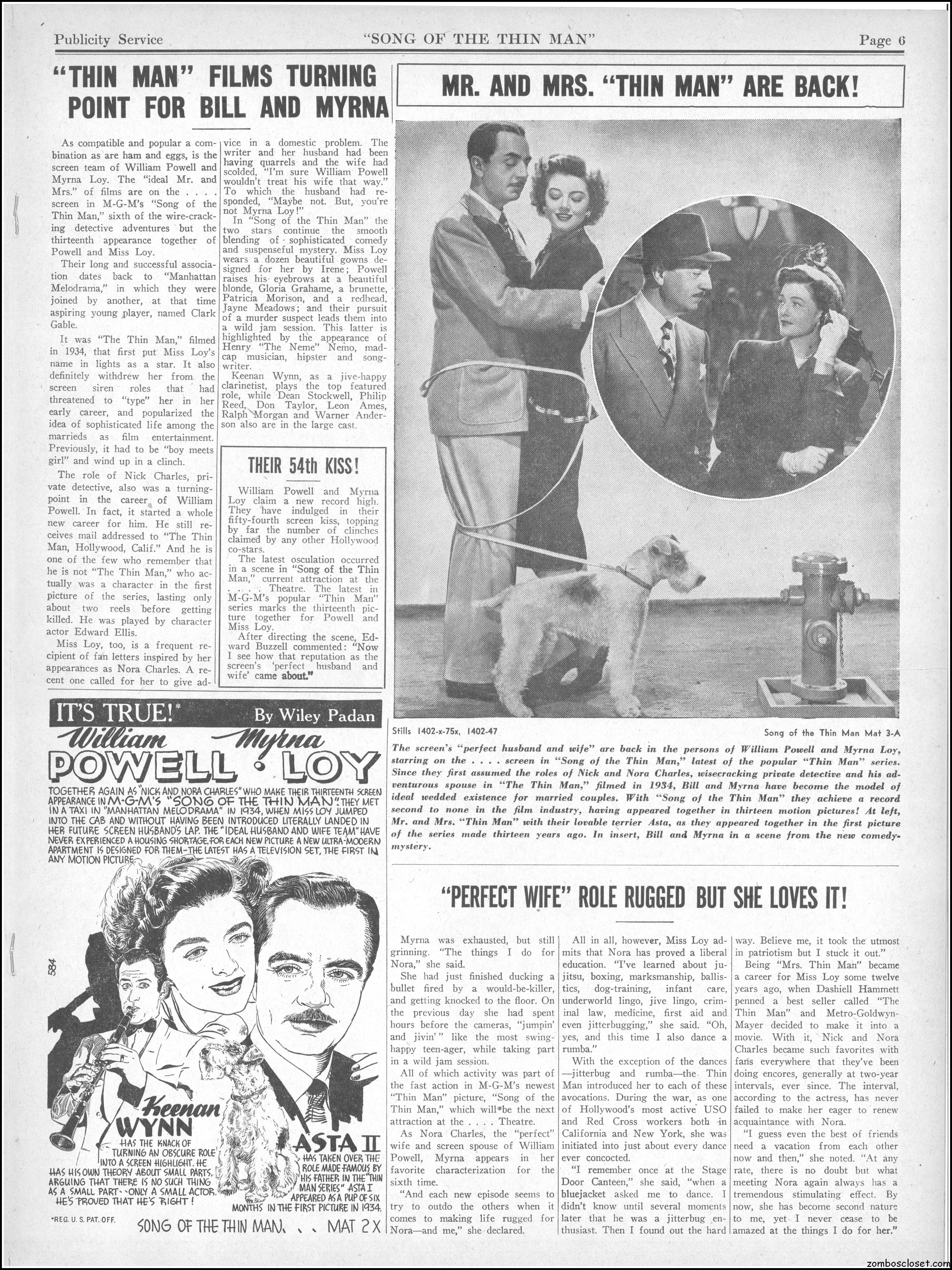 This is the rare and quite fragile pressbook for Song of the Thin Man, an enjoyable detective movie from an enjoyable MGM series of Thin Man movies). Unfortunately, MGM, around this time period, liked to print their pressbooks on cheap newsprint pulpy paper, which doesn’t hold up well over time. I had to be extremely careful while scanning this beauty, but even then I added more rips in the browning paper. But there’s a wealth of creative promotion and style here, so it was worth it. I hope you think so too. This movie was the sixth and last one in the series.