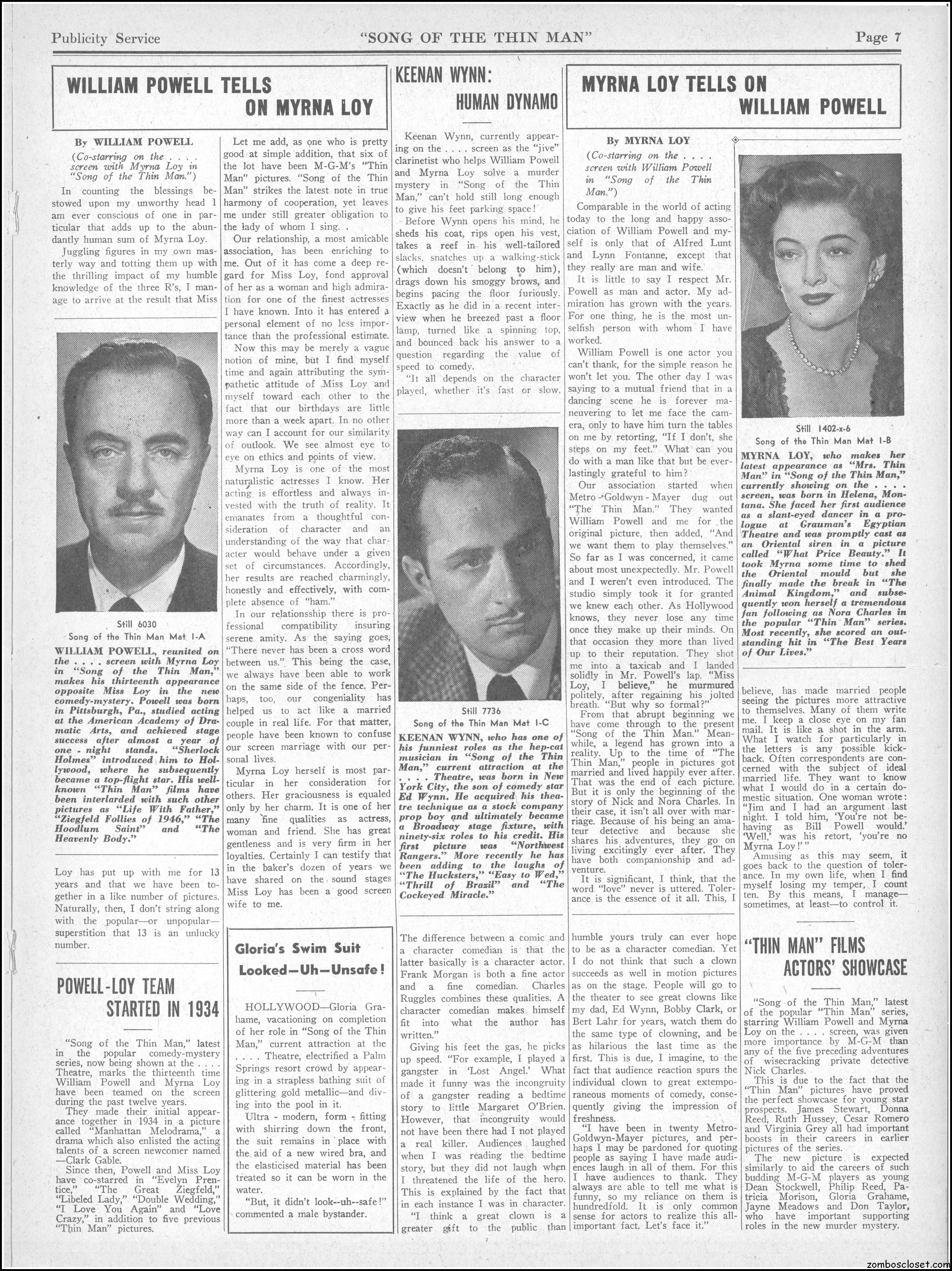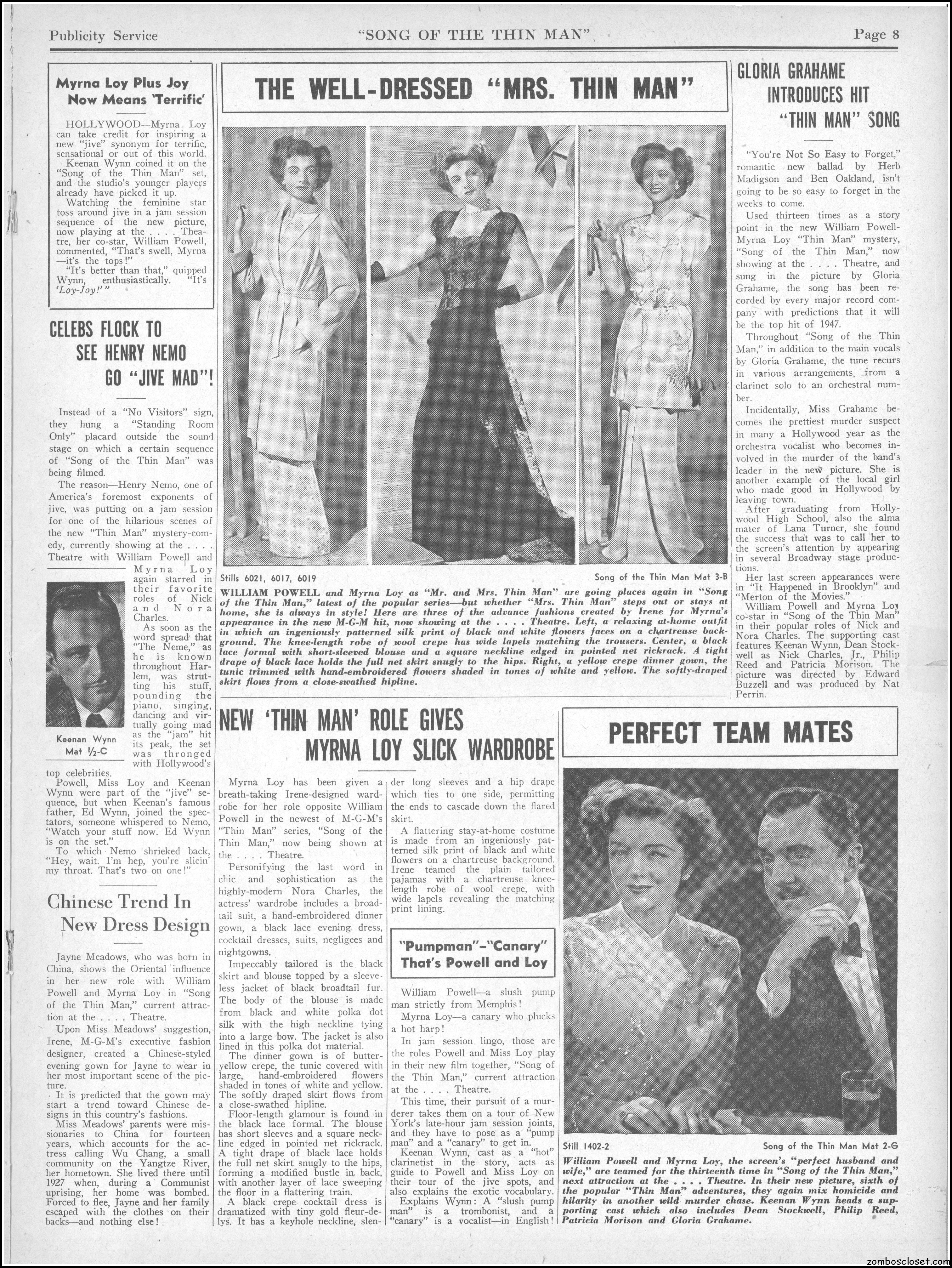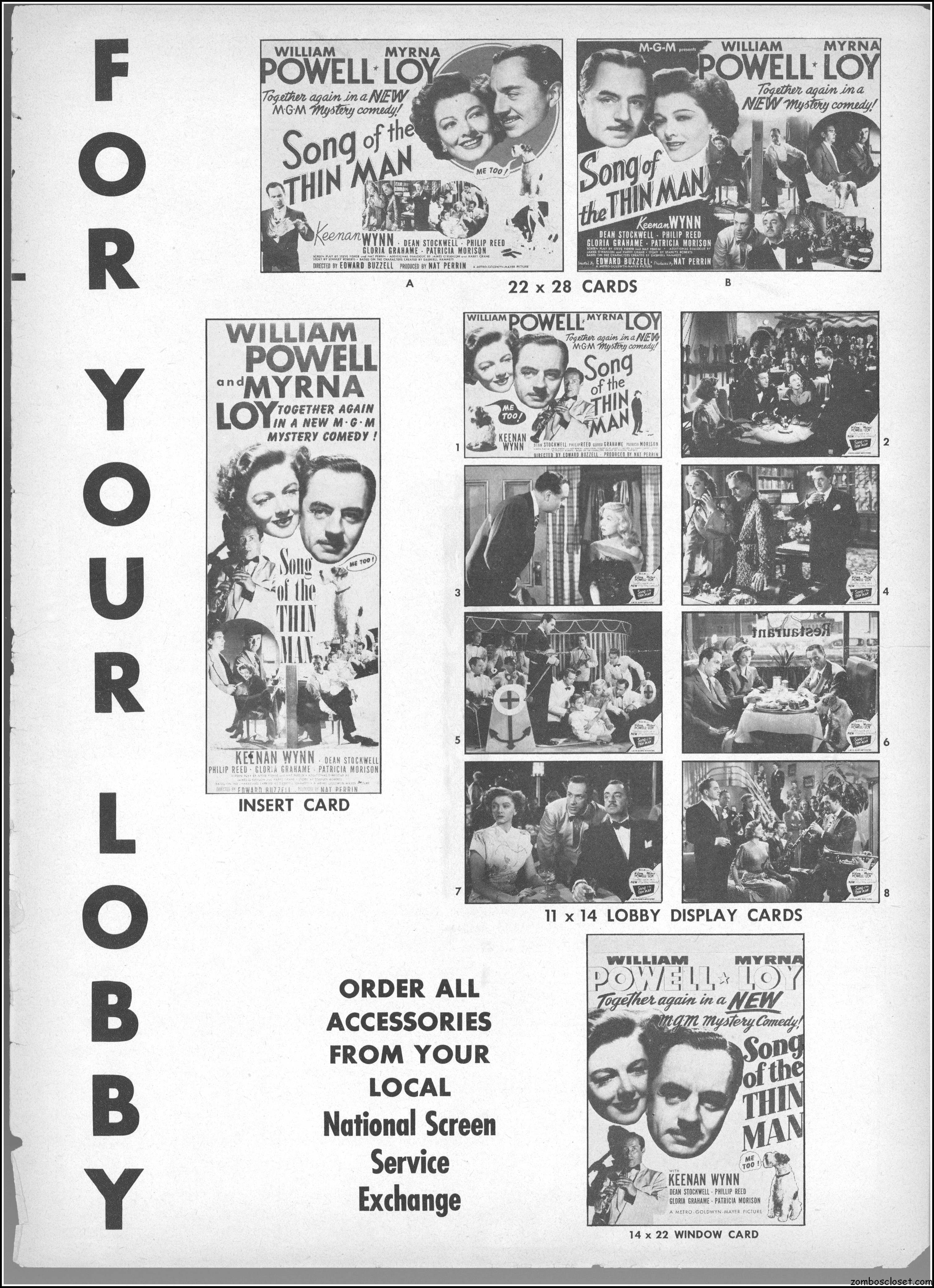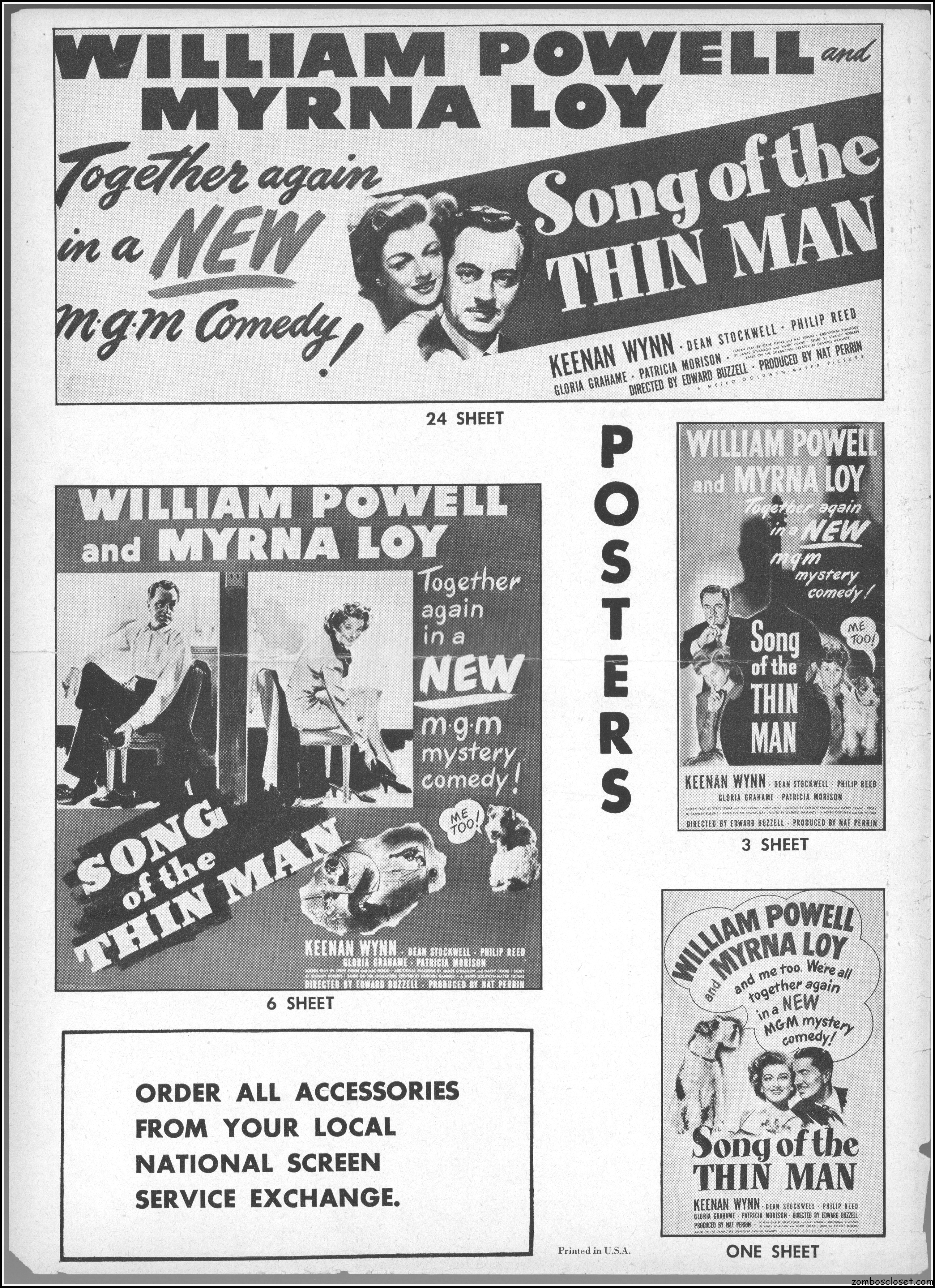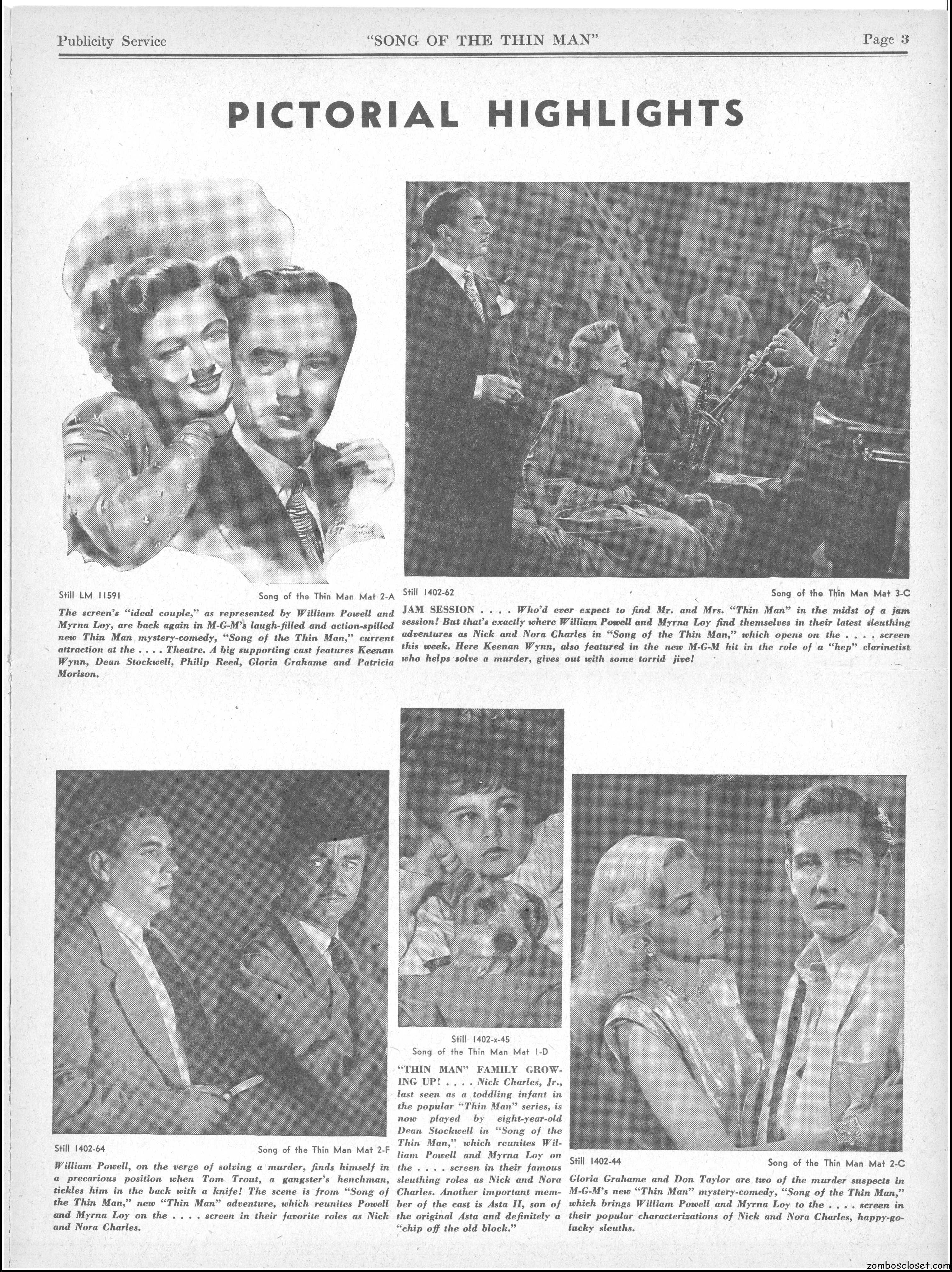 This is the rare and quite fragile pressbook for Song of the Thin Man, an enjoyable detective movie from an enjoyable MGM series of Thin Man movies). Unfortunately, MGM, around this time period, liked to print their pressbooks on cheap newsprint pulpy paper, which doesn’t hold up well over time. I had to be extremely careful while scanning this beauty, but even then I added more rips in the browning paper. But there’s a wealth of creative promotion and style here, so it was worth it. I hope you think so too. This movie was the sixth and last one in the series.