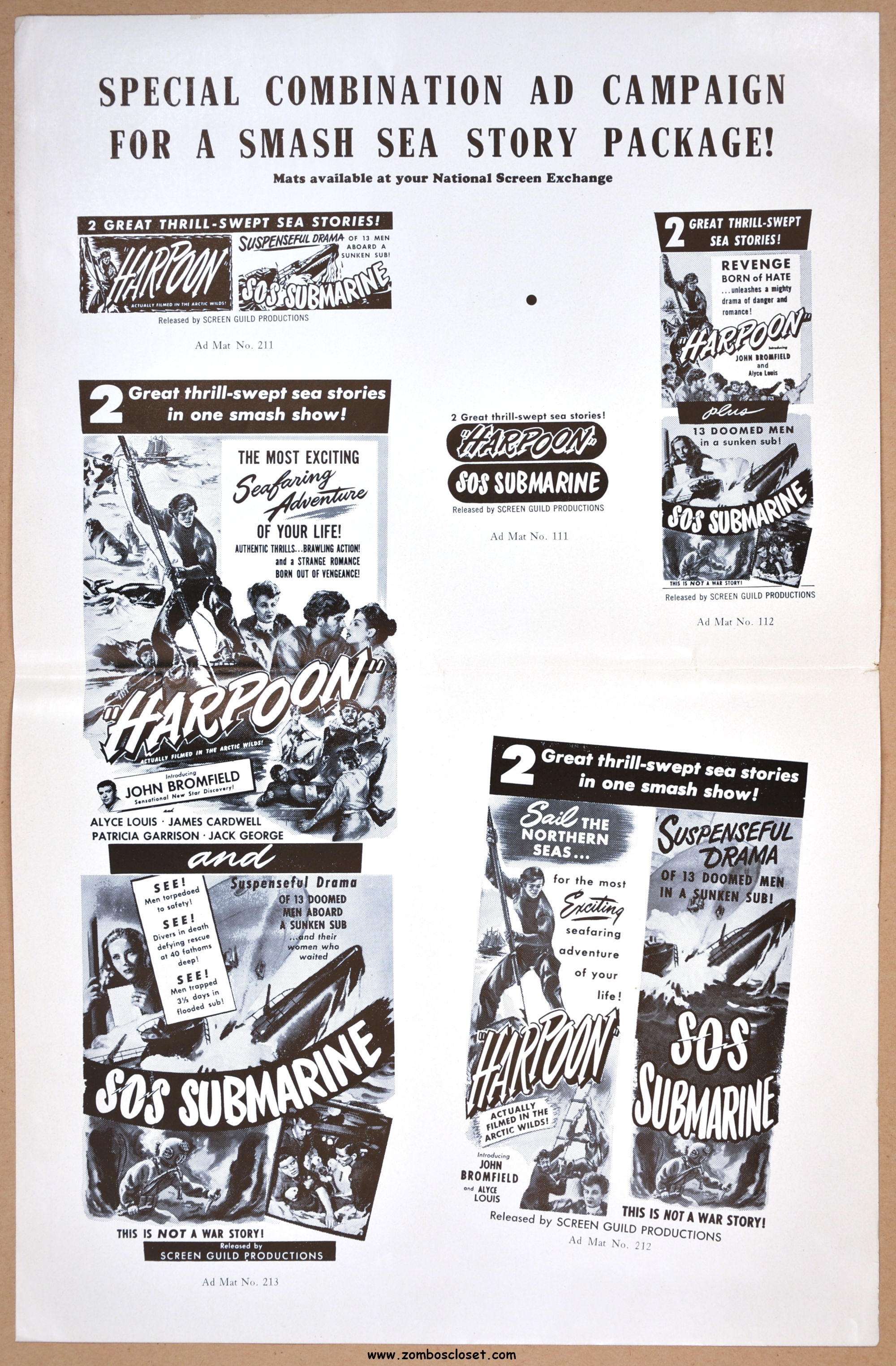 SOS Submarine, the American title for the Italian movie, Men on the Sea Floor (1941), had a surprisingly interesting pressbook created for it. While only four pages, plus a one-page supplement for double-billing with Harpoon, its cover is more sophisticated in design and execution than most foreign movies pressbooks. The American-dubbed version hit theaters in 1948.