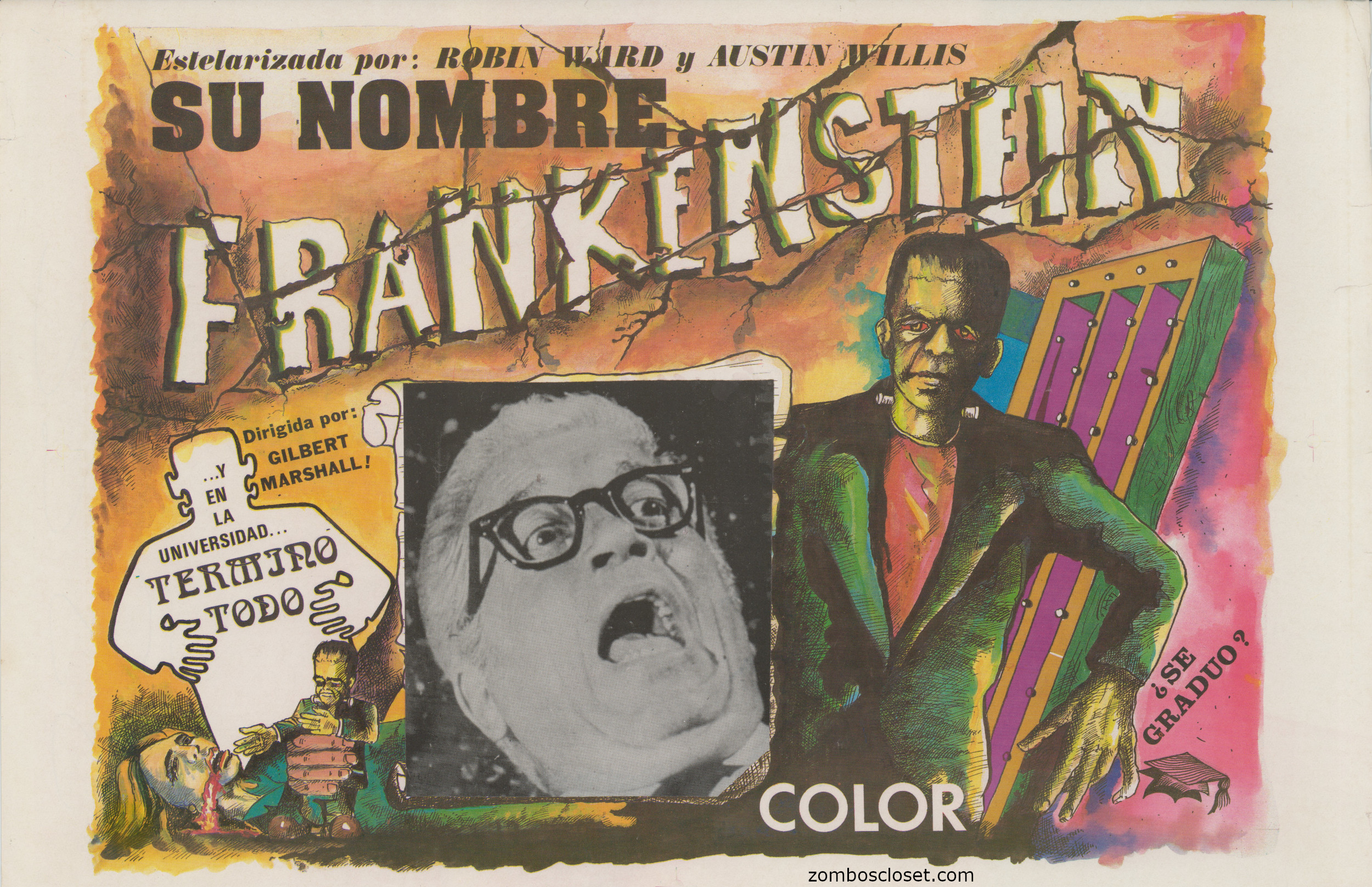 I admit I'm stumped with this one. The inset photo reminds me of a scene in Frankenstein 1970, but the rather wild, contemporary-ish, illustration doesn't quite click with any movie I can think of that remotely matches the title. With the little Frankie in the bottom left corner, I'm also thinking Amicus' Asylum, especially with the "color" mention. What do you think?