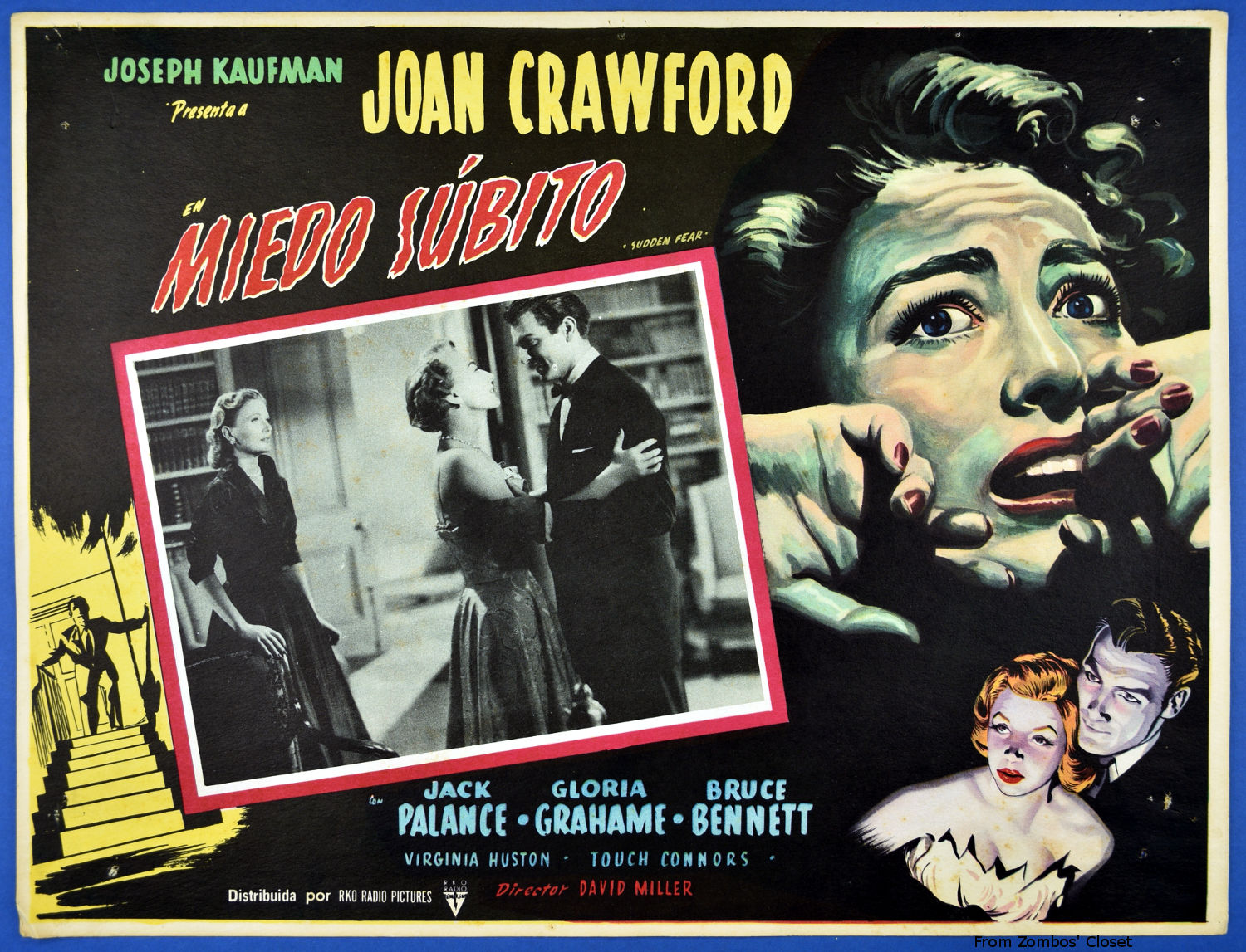 From Wikipedia: "In 1984, film noir historian Spencer Selby noted, "Undoubtedly one of the most stylish and refined woman-in-distress noirs." This Mexican lobby card for Sudden Fear illustrates that tone quite well with a beautiful closeup of Joan Crawford at her histrionic-best. Notice, also, how the lighting for the couple at the bottom right embellishes them with a sinister patina.