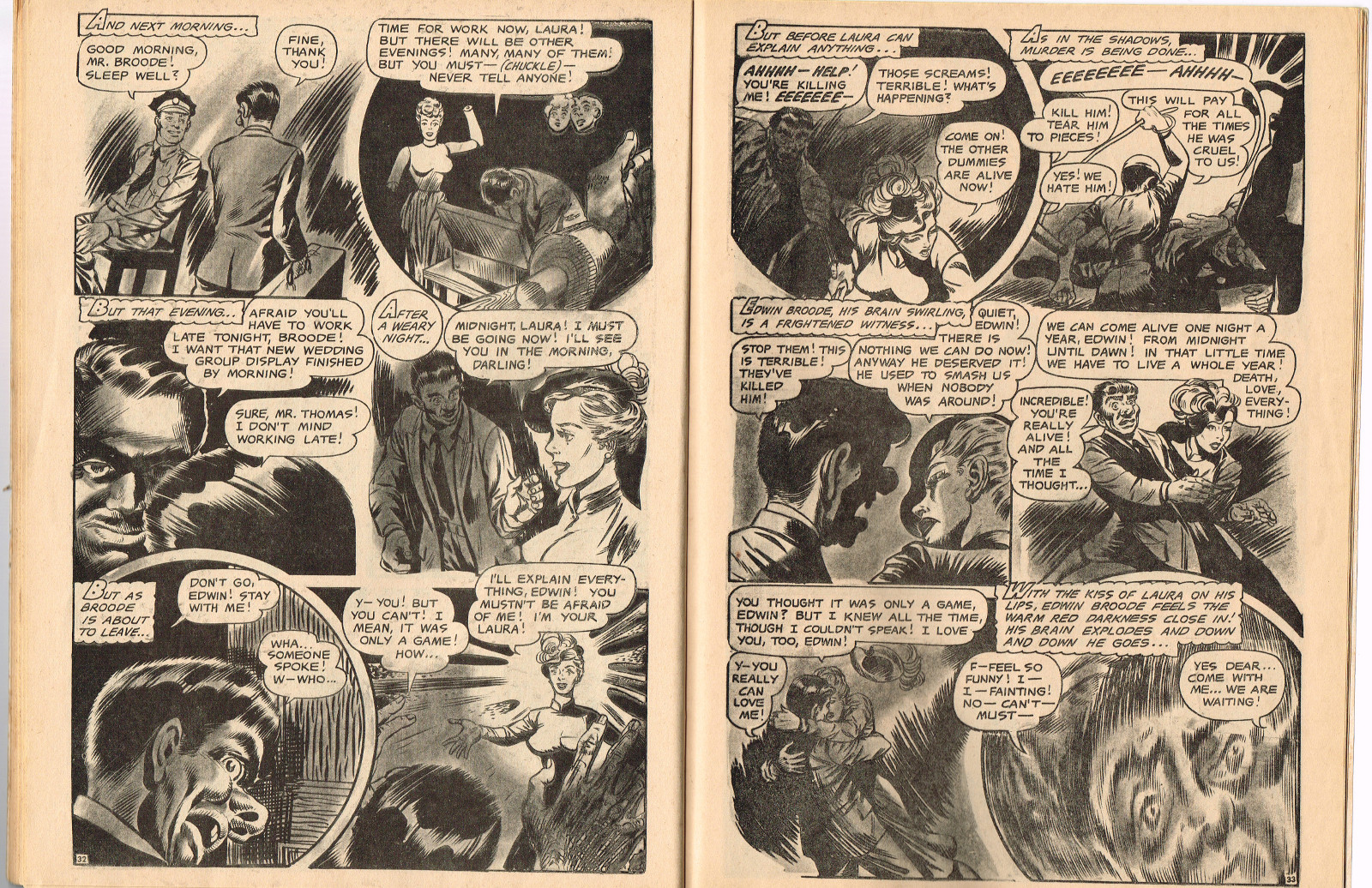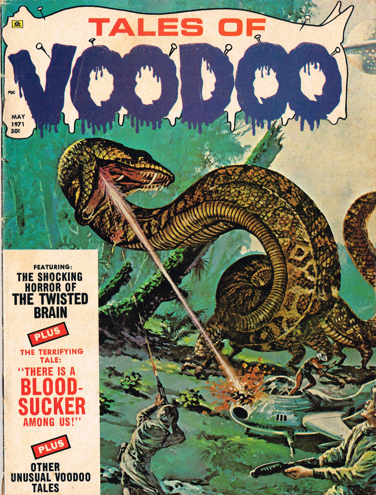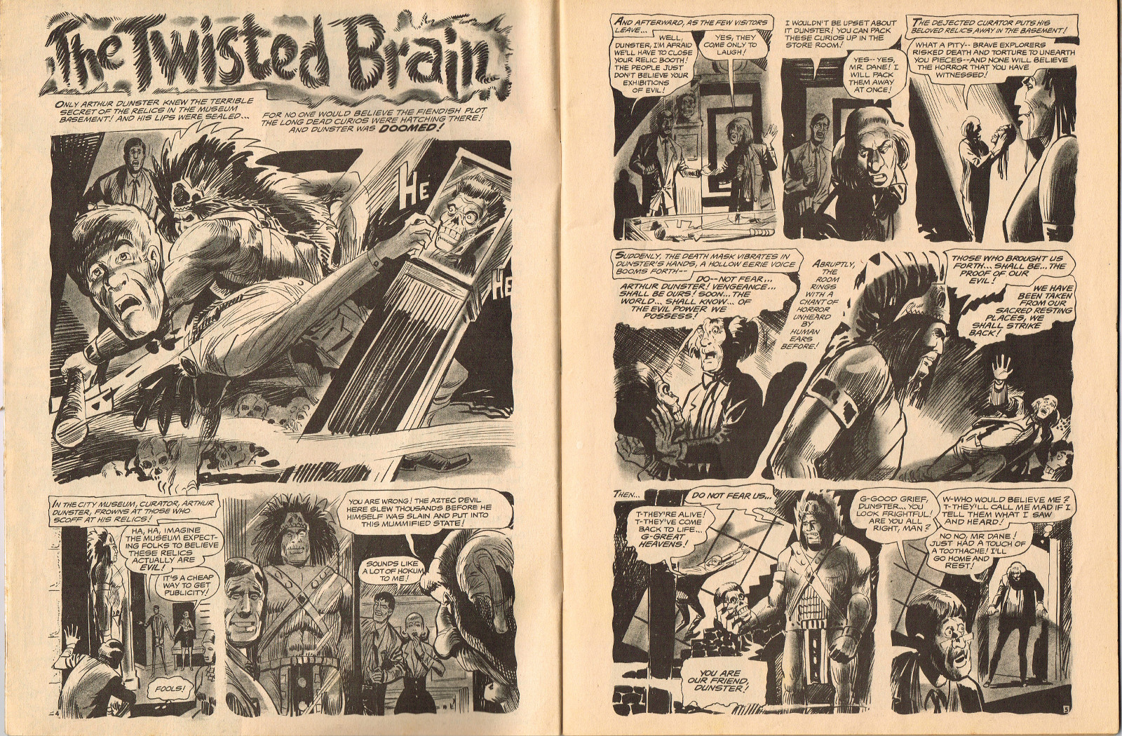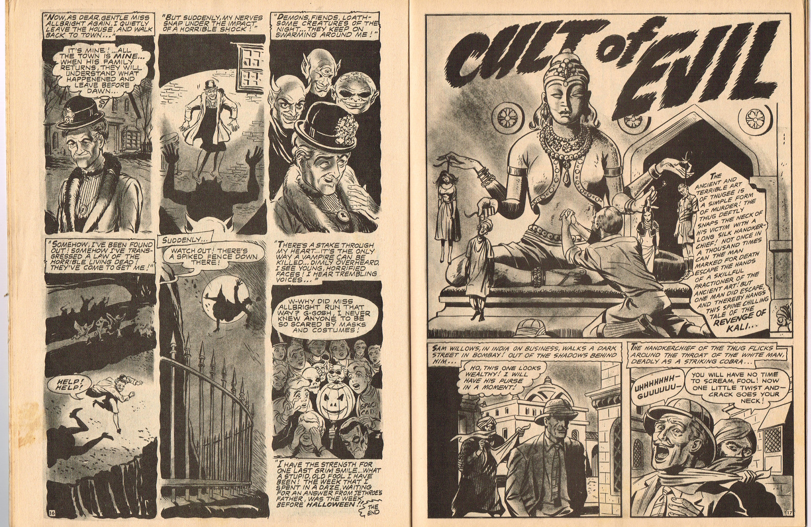 In this creepy and terrifying issue 3, volume 4, of Tales of Voodoo, there's a head filled with vengeance, a little boy with a vampire daddy (some similarity here to the vampire story in Dr. Terror's House of Horrors), and the Cult of Kali has everyone choked up with horror. There's also a ghost in the wet swamp and smartly dressed dummies come to life. To kill! And soon you'll learn that no one laughs at Chun, the snake charmer, when he says "You stabbed a dummy, Joe! A dummy–like yourself!"