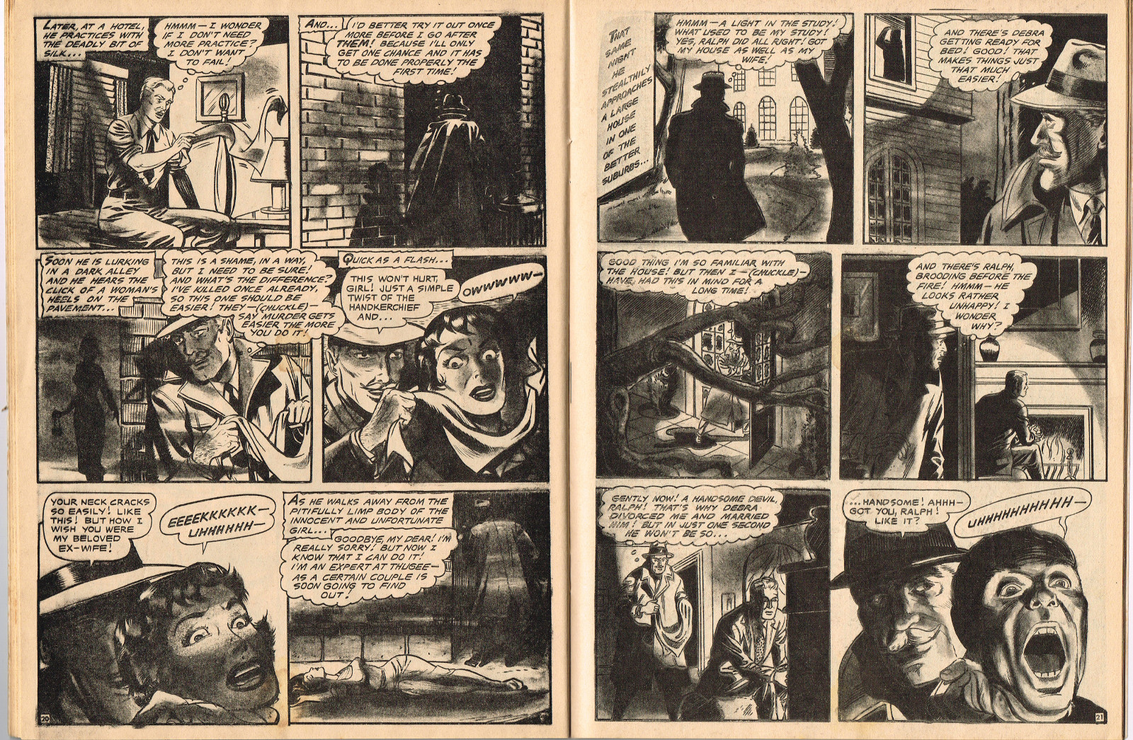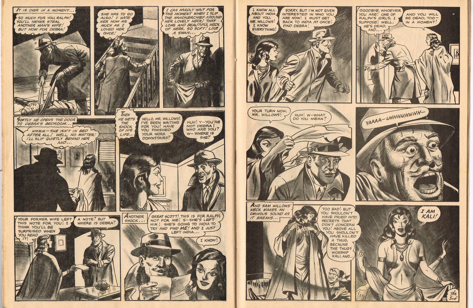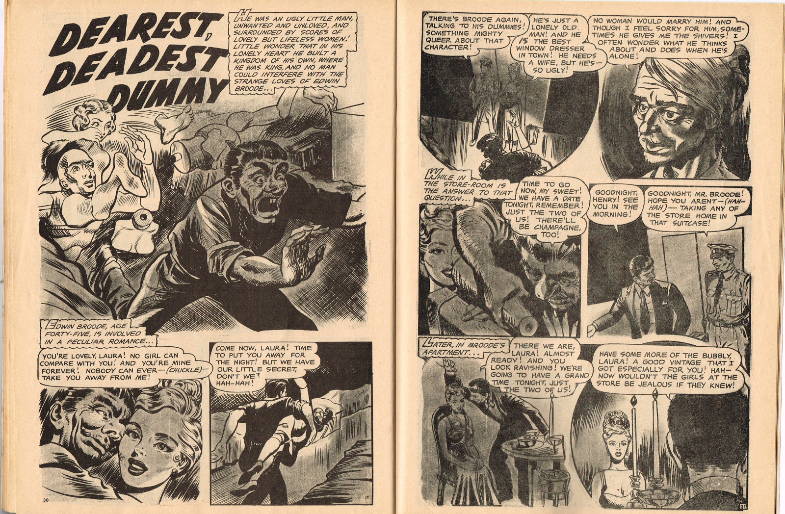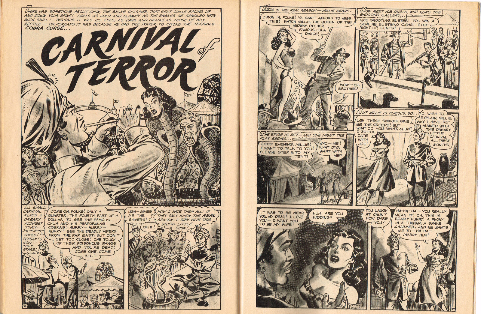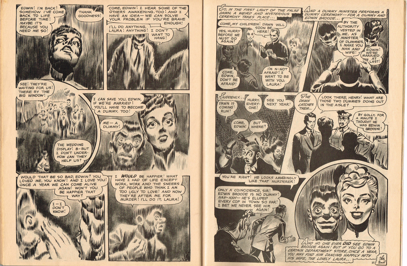 In this creepy and terrifying issue 3, volume 4, of Tales of Voodoo, there's a head filled with vengeance, a little boy with a vampire daddy (some similarity here to the vampire story in Dr. Terror's House of Horrors), and the Cult of Kali has everyone choked up with horror. There's also a ghost in the wet swamp and smartly dressed dummies come to life. To kill! And soon you'll learn that no one laughs at Chun, the snake charmer, when he says "You stabbed a dummy, Joe! A dummy–like yourself!"