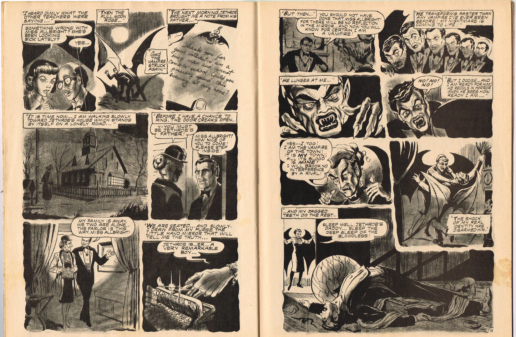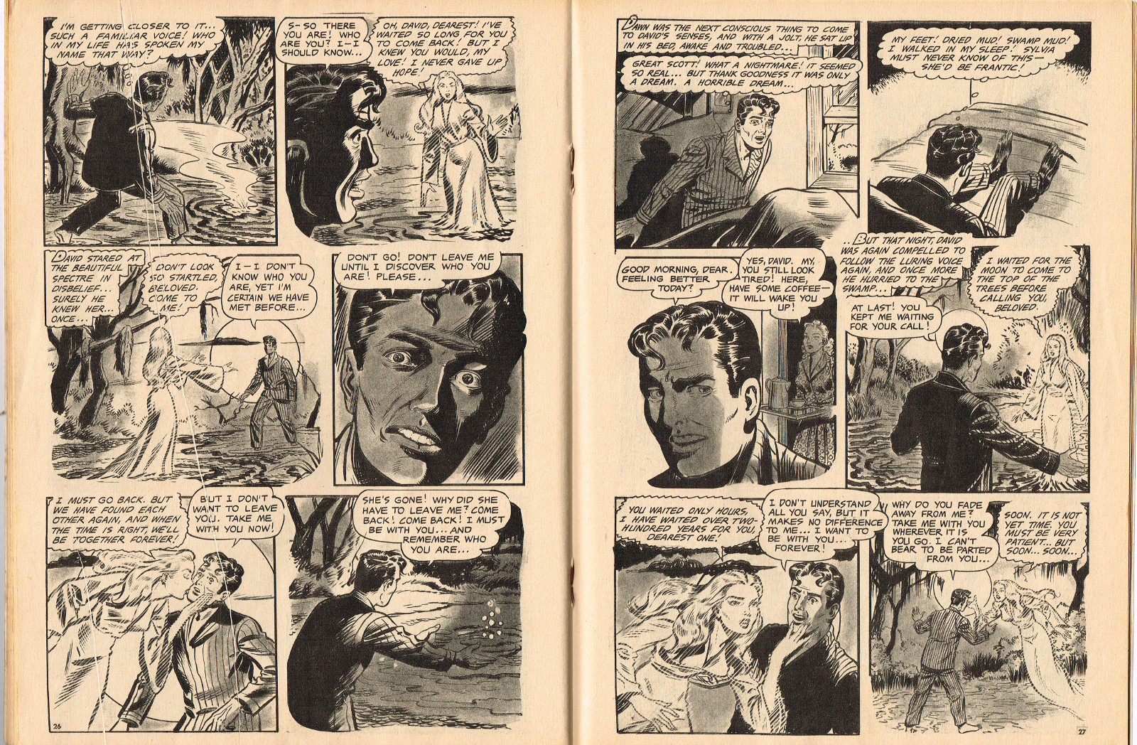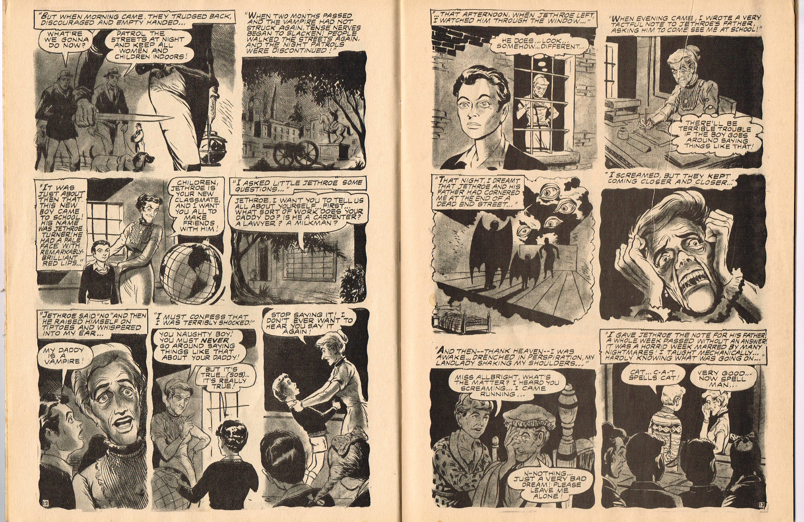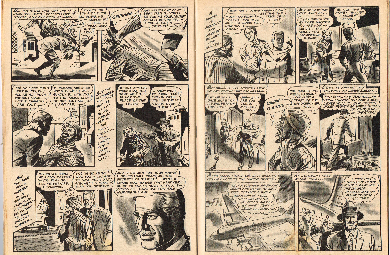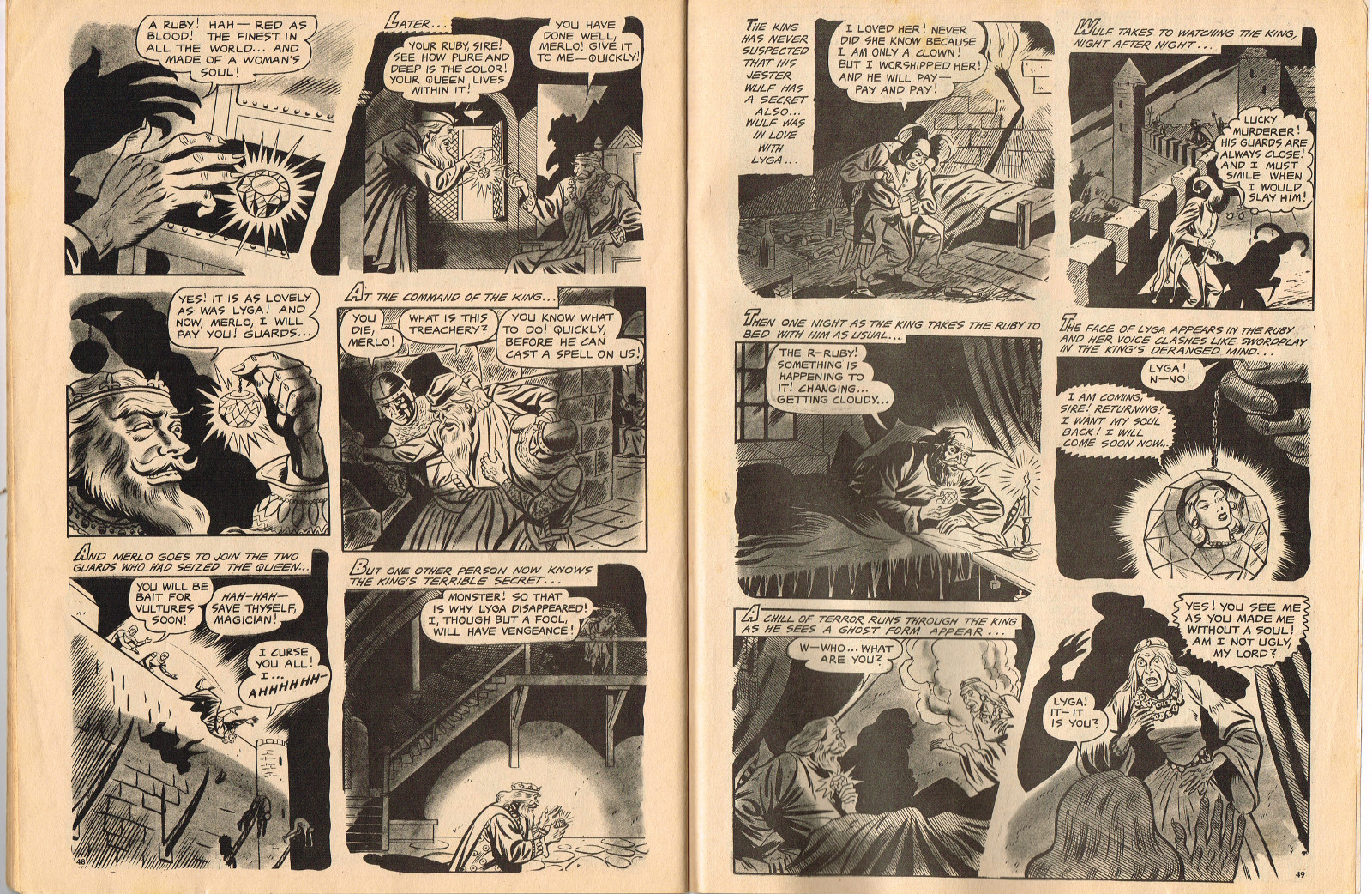 In this creepy and terrifying issue 3, volume 4, of Tales of Voodoo, there's a head filled with vengeance, a little boy with a vampire daddy (some similarity here to the vampire story in Dr. Terror's House of Horrors), and the Cult of Kali has everyone choked up with horror. There's also a ghost in the wet swamp and smartly dressed dummies come to life. To kill! And soon you'll learn that no one laughs at Chun, the snake charmer, when he says "You stabbed a dummy, Joe! A dummy–like yourself!"