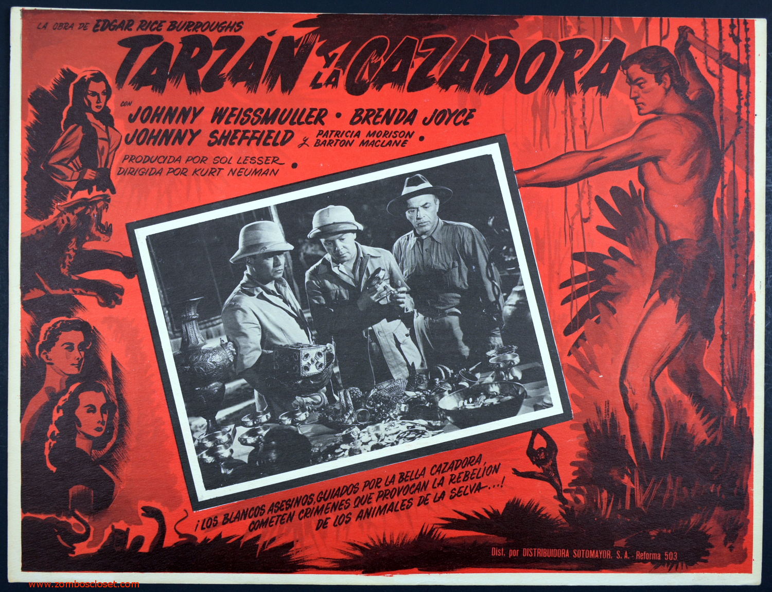 A fantastic Mexican lobby card for Tarzan and the Huntress (Tarzan Y La Cazadora), the color, main image of Tarzan, and the inset scene are well balanced for dramatic effect. Leaving the left hand hidden behind the picture does slightly mar an otherwise eye-catching layout.