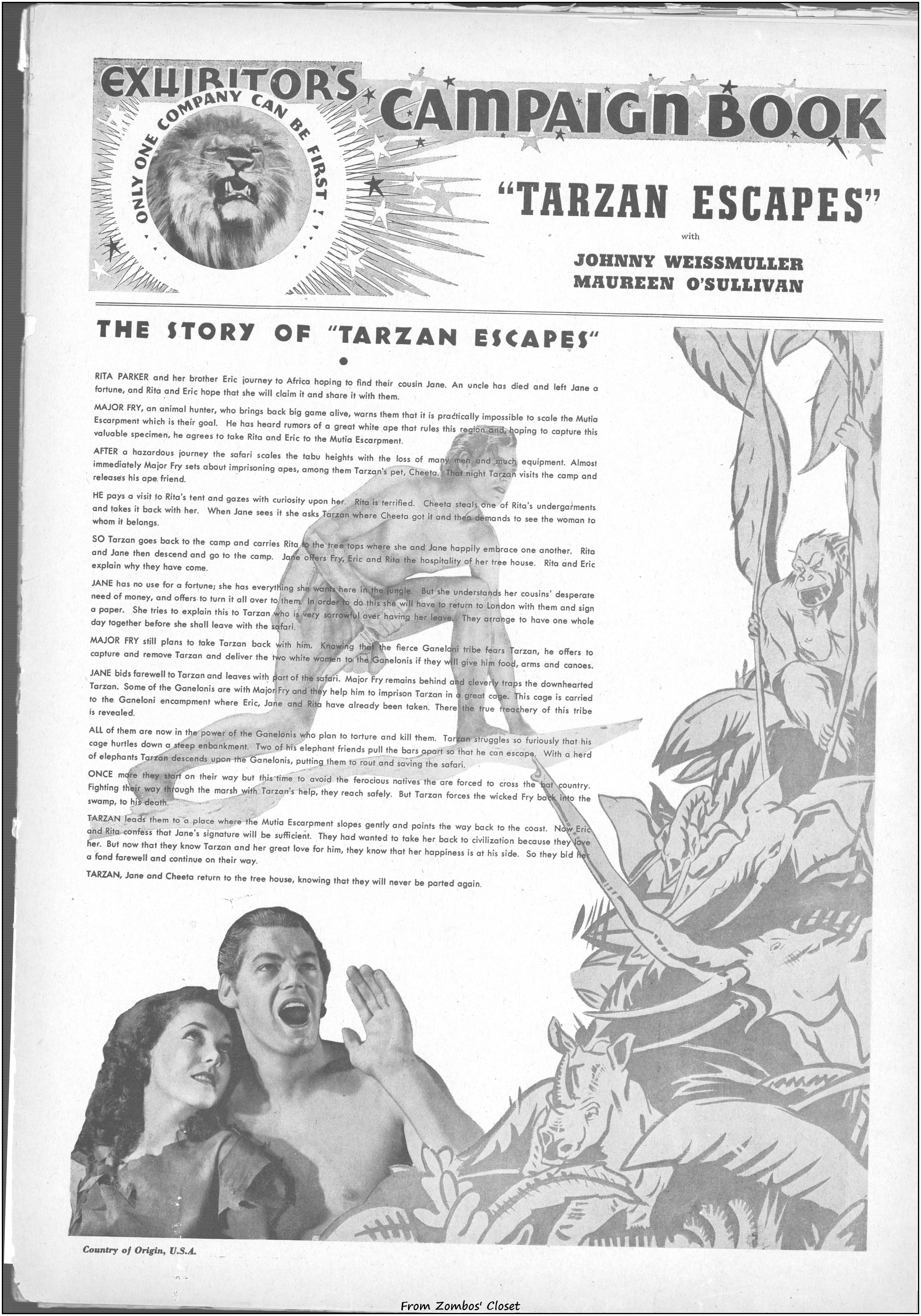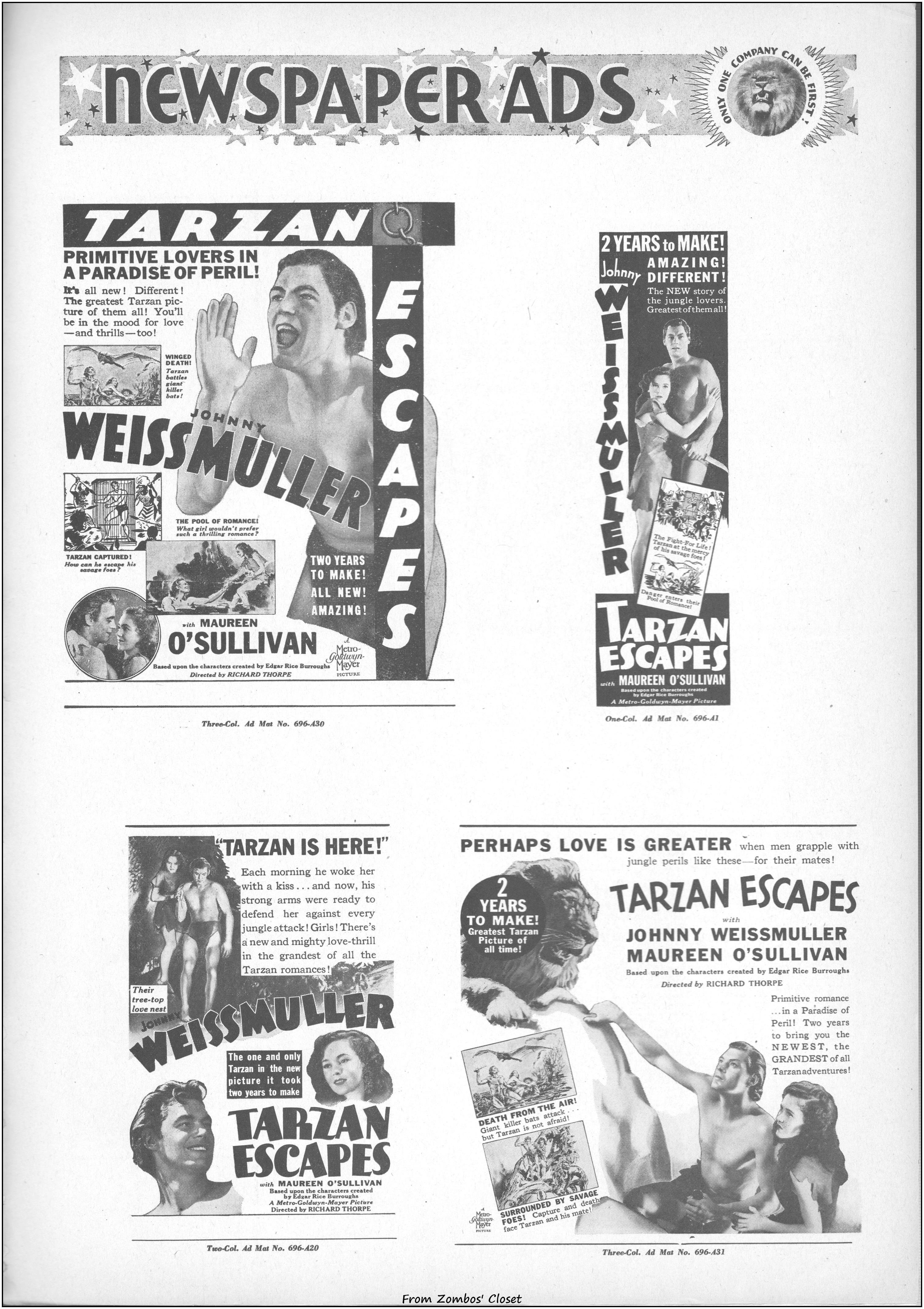 MGM created wonderful pressbooks, but kept the costs down by using paper that wouldn’t last. Of course, who would have thought there would be people like me, eventually, who would collect such disposable movie advertising? Johnny Weismuller and Maureen O’Sullivan were a perfect match for Tarzan and Jane; and the movies turned out to be thrilling and fun at the same time. Check out Cafe Roxy for their blog entry on this movie (https://caferoxy.blogspot.com/2010/10/still-batty-about-tarzan-escapes.html). American audiences didn’t get to see the deleted vampire bats scene and due to a problem with the initial direction, the movie was reshot, so many earlier scenes–some gruesome–were excised. Bummer.