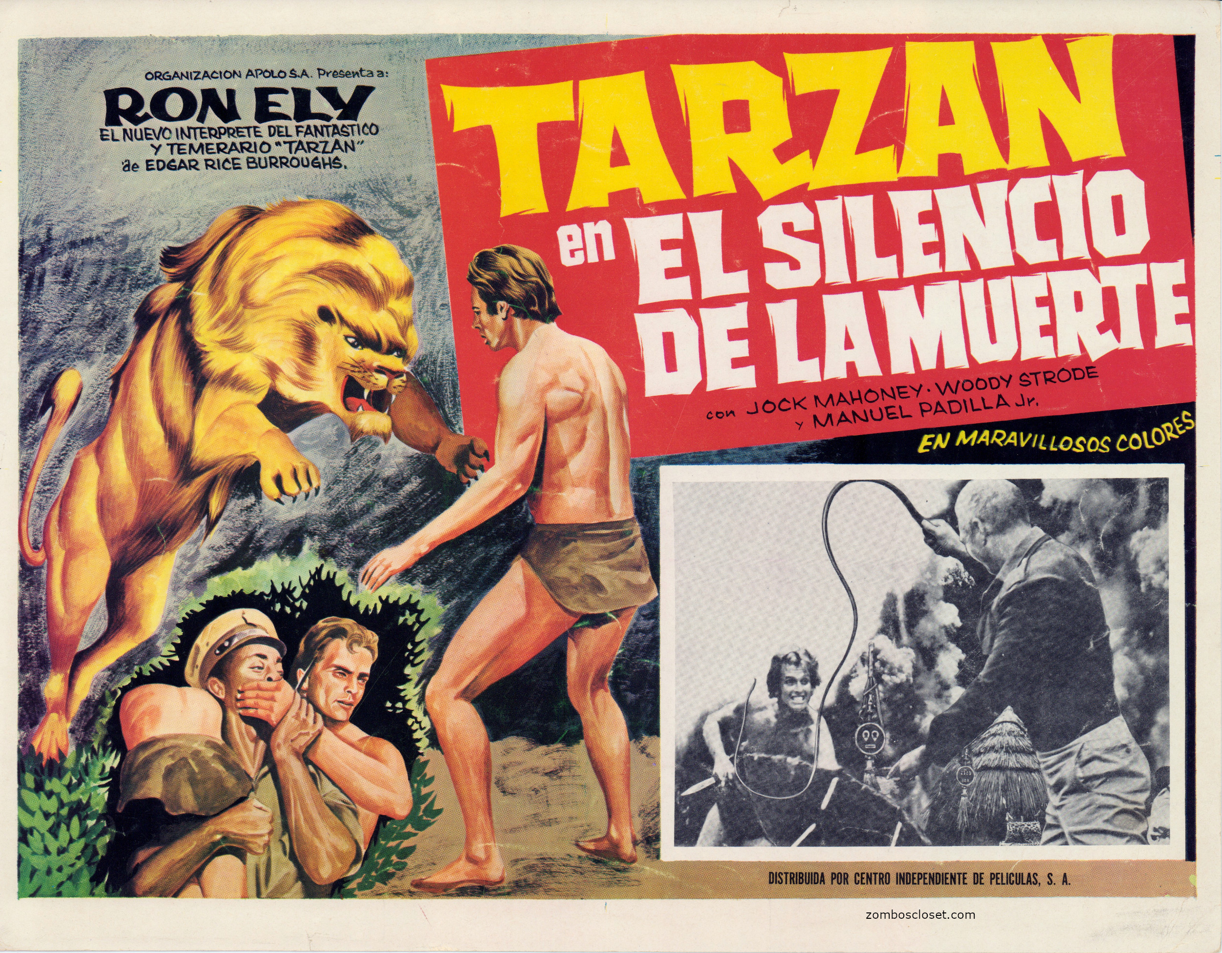 Exciting illustration and inset scene makes this Mexican lobby card for Tarzan en El Silencio De La Muerte, an eye-grabber. Interestingly, there's archive footage of Jock Mahoney, who also played Tarzan, to help lessen the budget, even though this movie was already edited from two episodes of Ron Ely's 1960s Tarzan television series. Is it me, or does that lion look a bit like the ID Beast from Forbidden Planet?