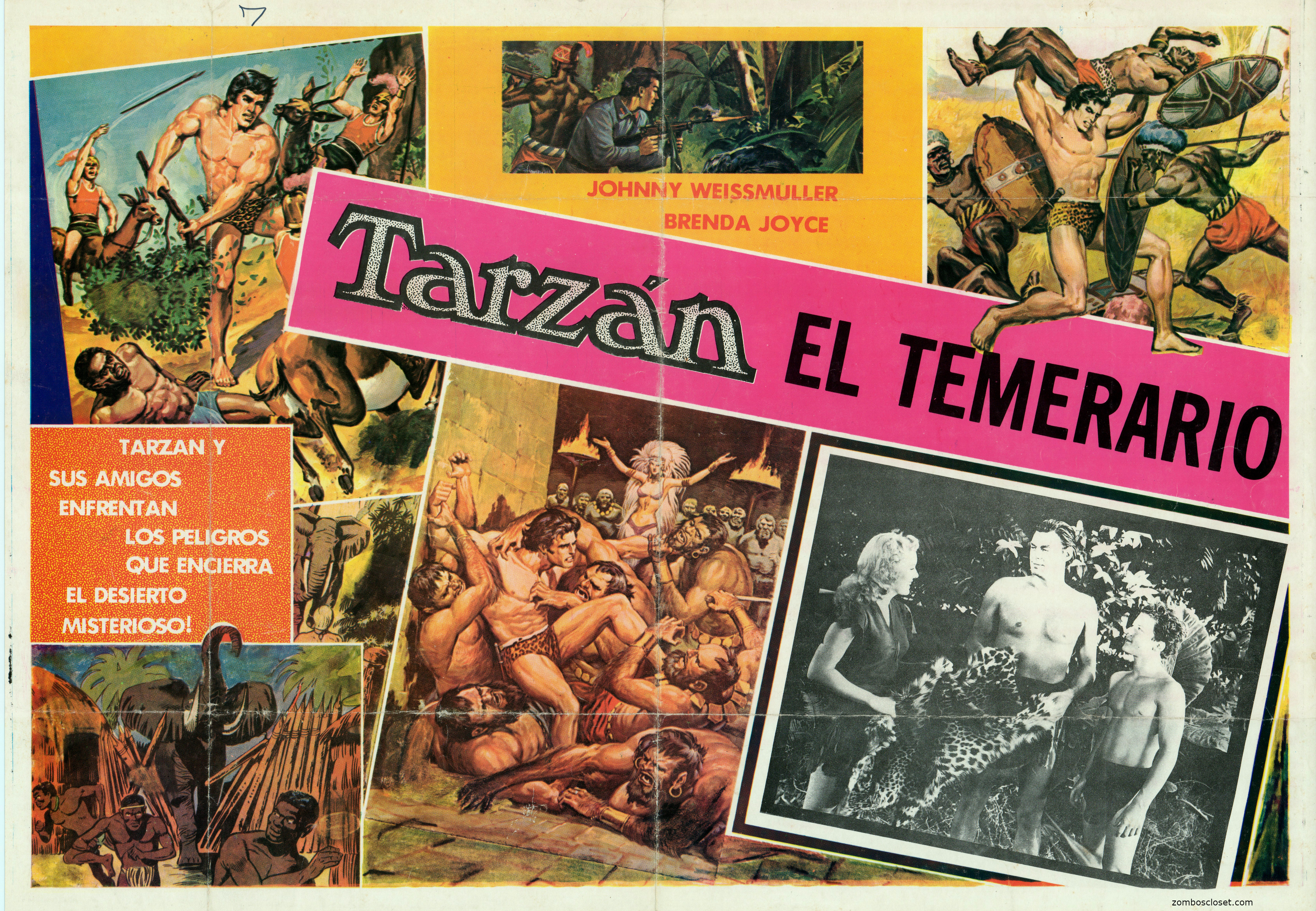 Here's a rather large, 15.5 x 22.5 inches, Mexican lobby card for Tarzan's Desert Mystery movie (Tarzan el Temerario). What differentiates this from being a small poster instead of a lobby card is the inset movie scene. Interestingly, the inset scene is about the only thing from the movie on this lobby. The other scenes appear to be illustrations taken from various sources, but not ones based on the movie. These types of lobbies were printed on slick, thinner paper, and are for later runs of the movie in theaters.