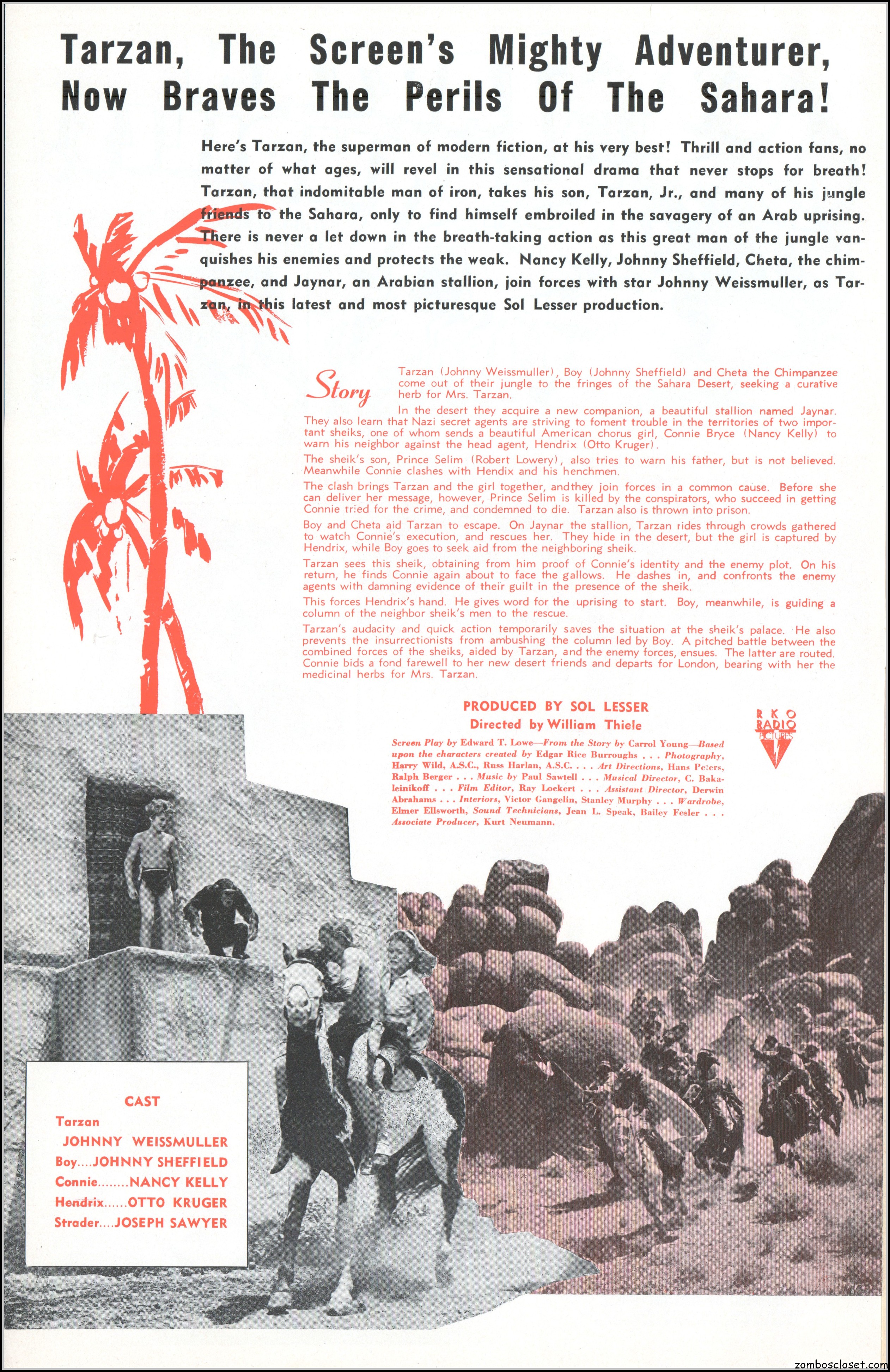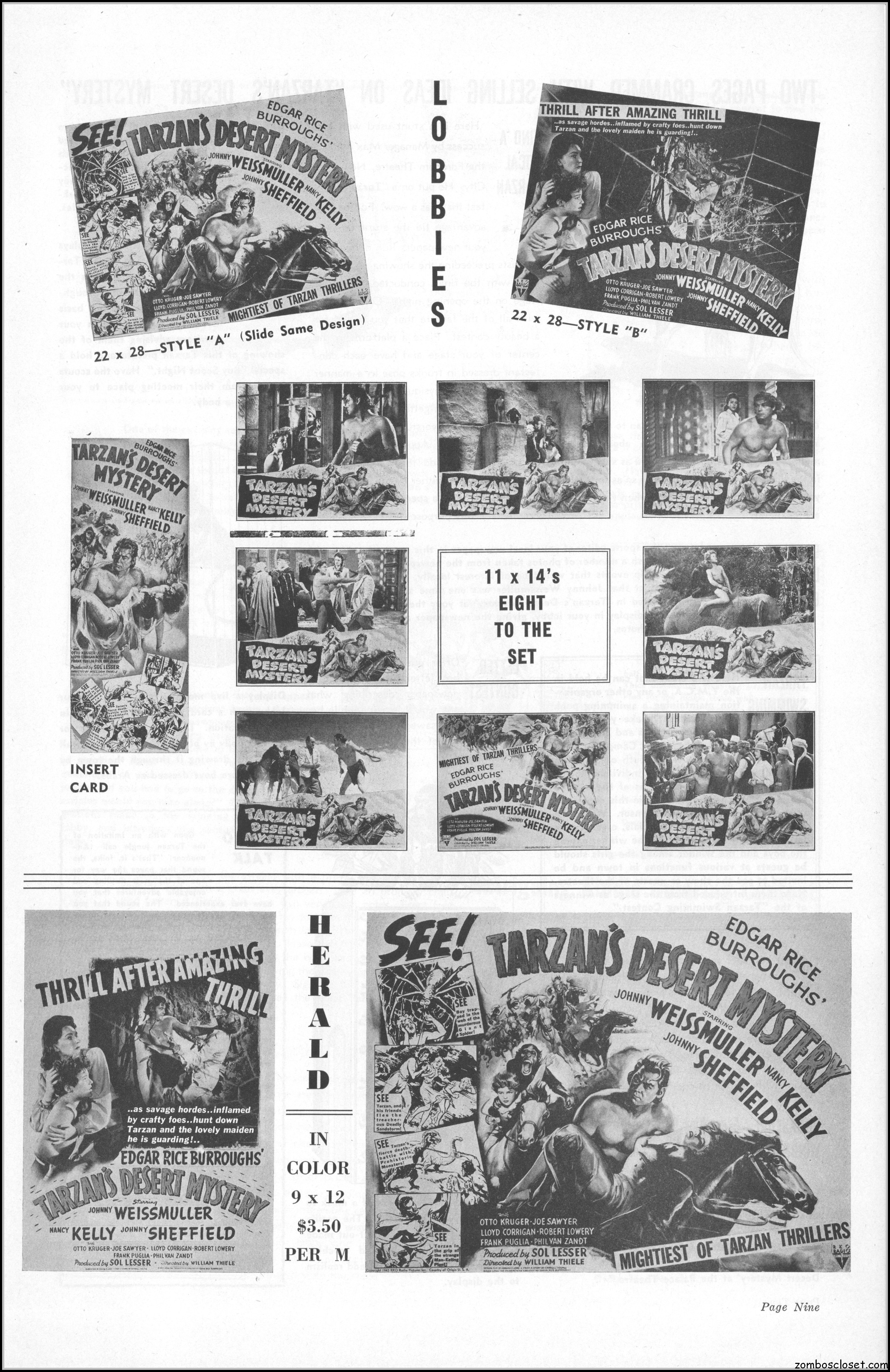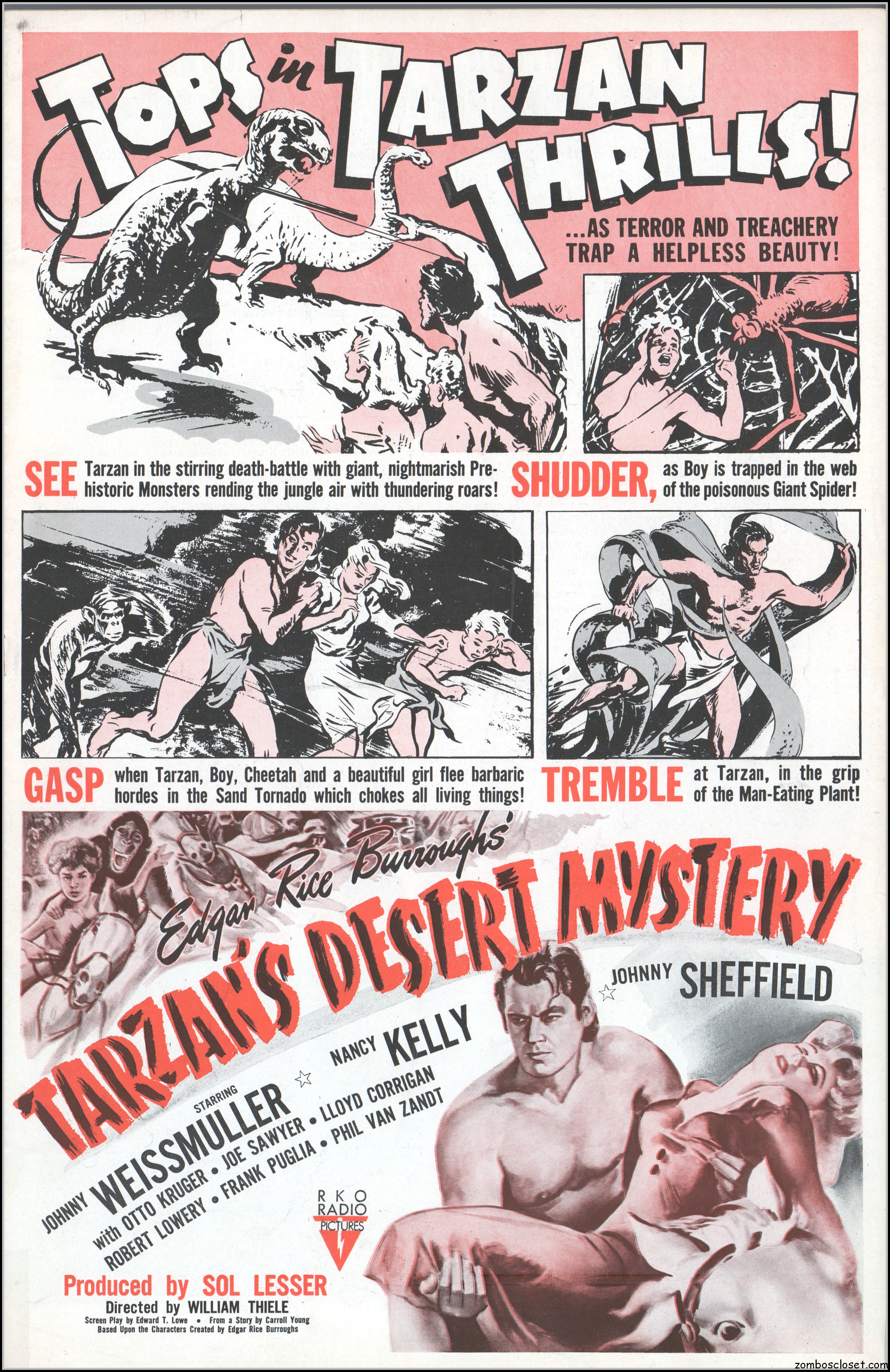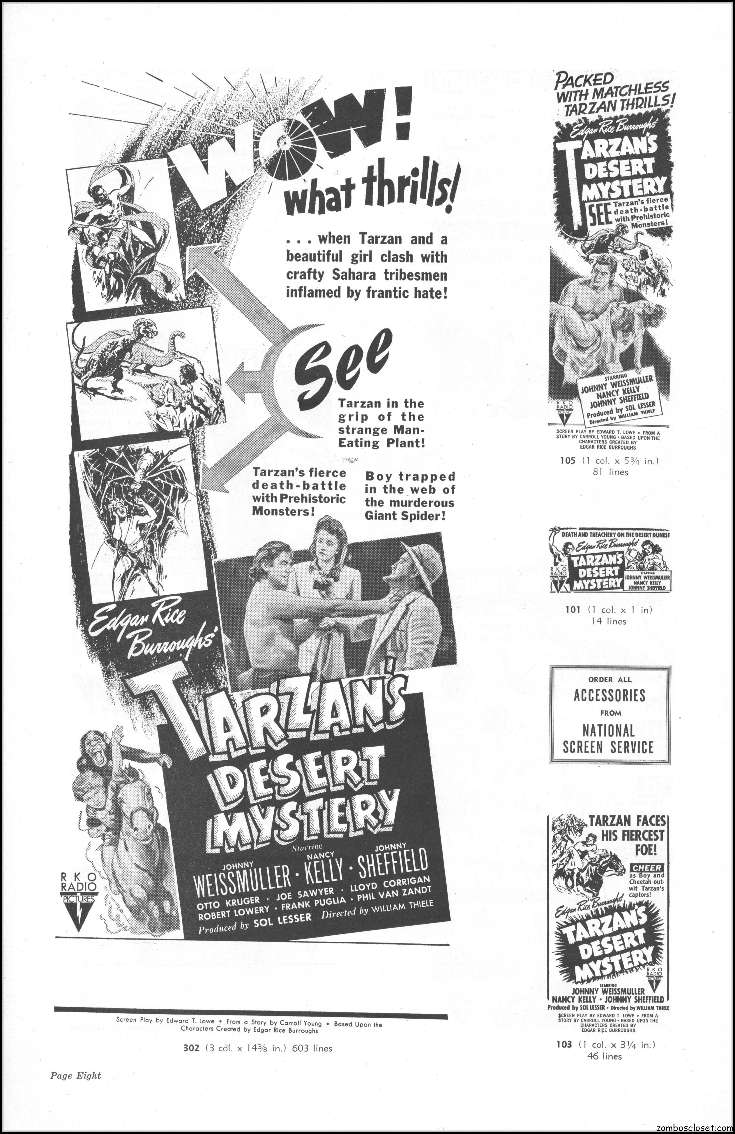 Here's the 11×17 inches pressbook for Tarzan's Desert Mystery. While Jane is away helping the war effort, Tarzan must contend with Nazis, hungry plants, and a pesky giant spider. A fun matinee romp in the series, this is the 8th movie for Johnny Weissmuller as Tarzan. Amazingly, while I'm a big fan of the Tarzan movies, this is the one I have yet to see. It's on my bucket list.