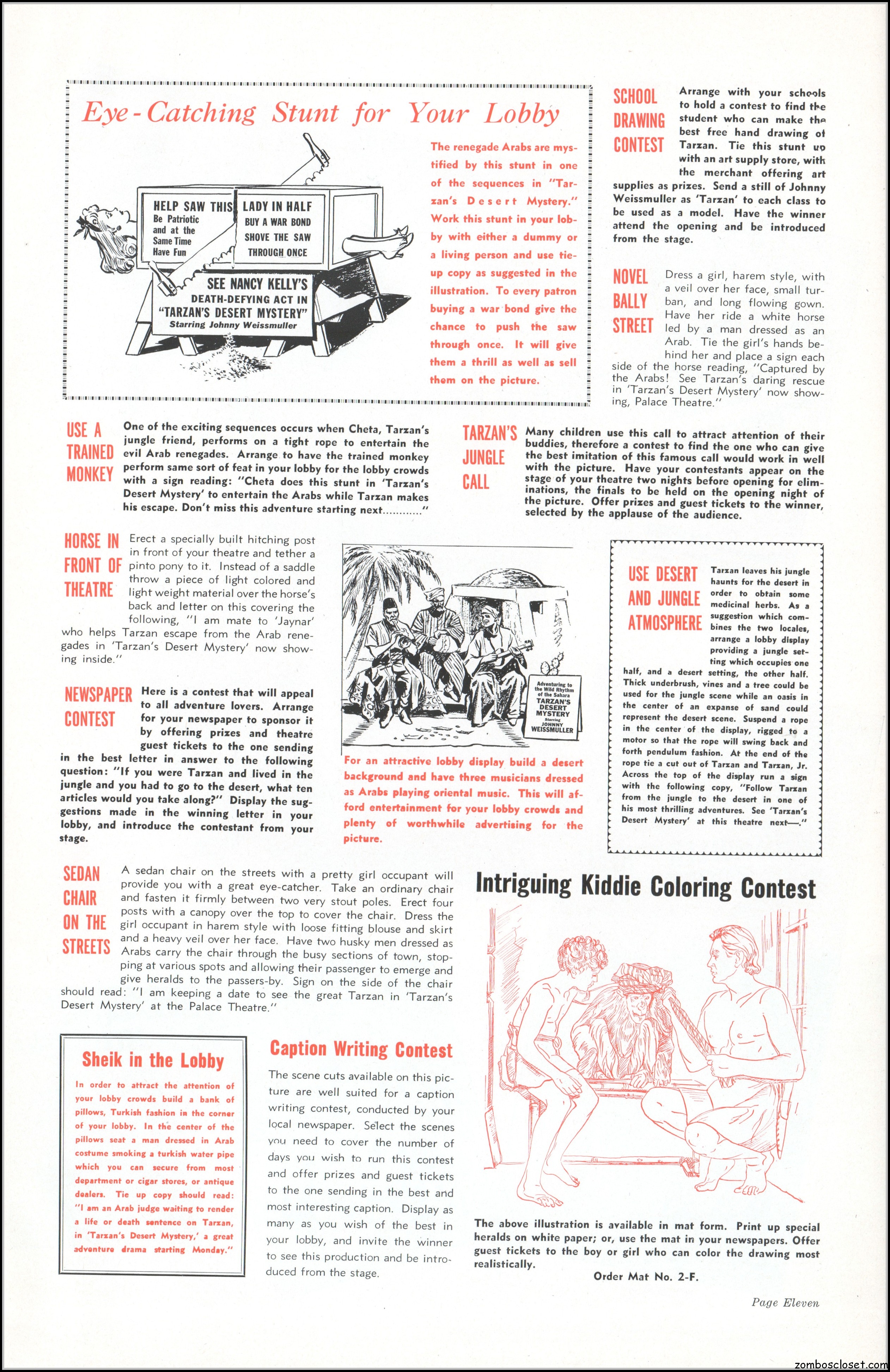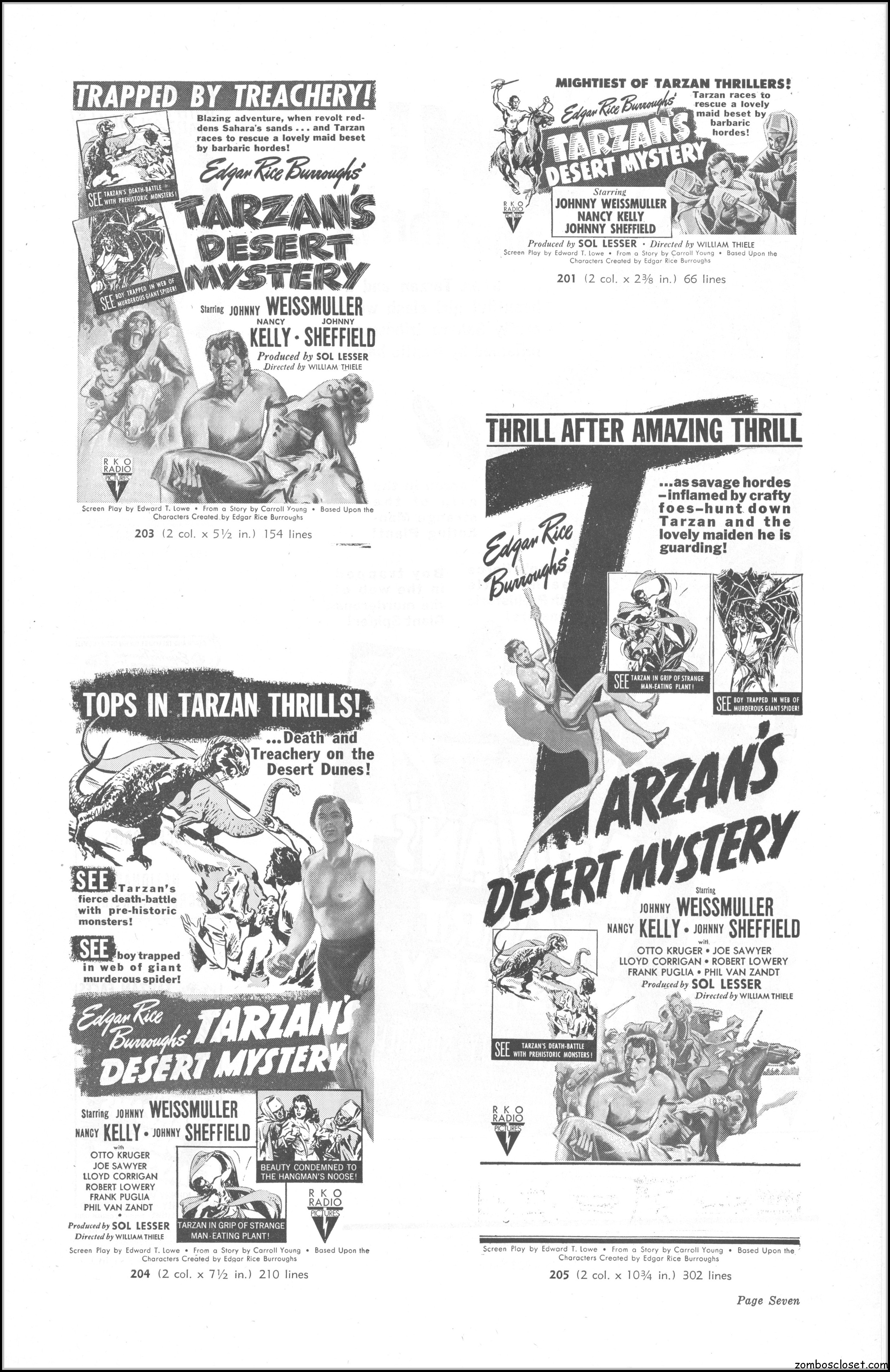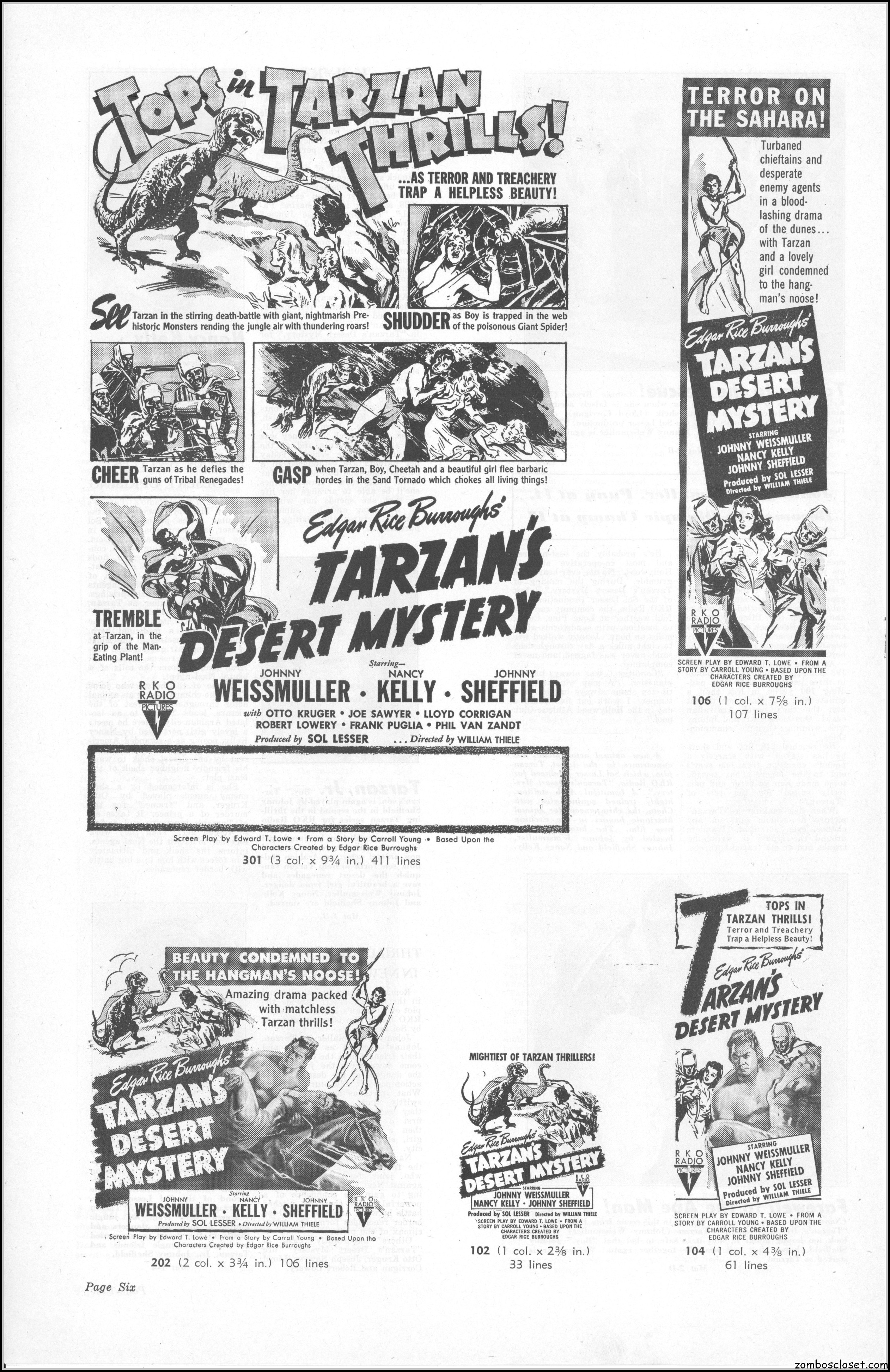 Here's the 11×17 inches pressbook for Tarzan's Desert Mystery. While Jane is away helping the war effort, Tarzan must contend with Nazis, hungry plants, and a pesky giant spider. A fun matinee romp in the series, this is the 8th movie for Johnny Weissmuller as Tarzan. Amazingly, while I'm a big fan of the Tarzan movies, this is the one I have yet to see. It's on my bucket list.