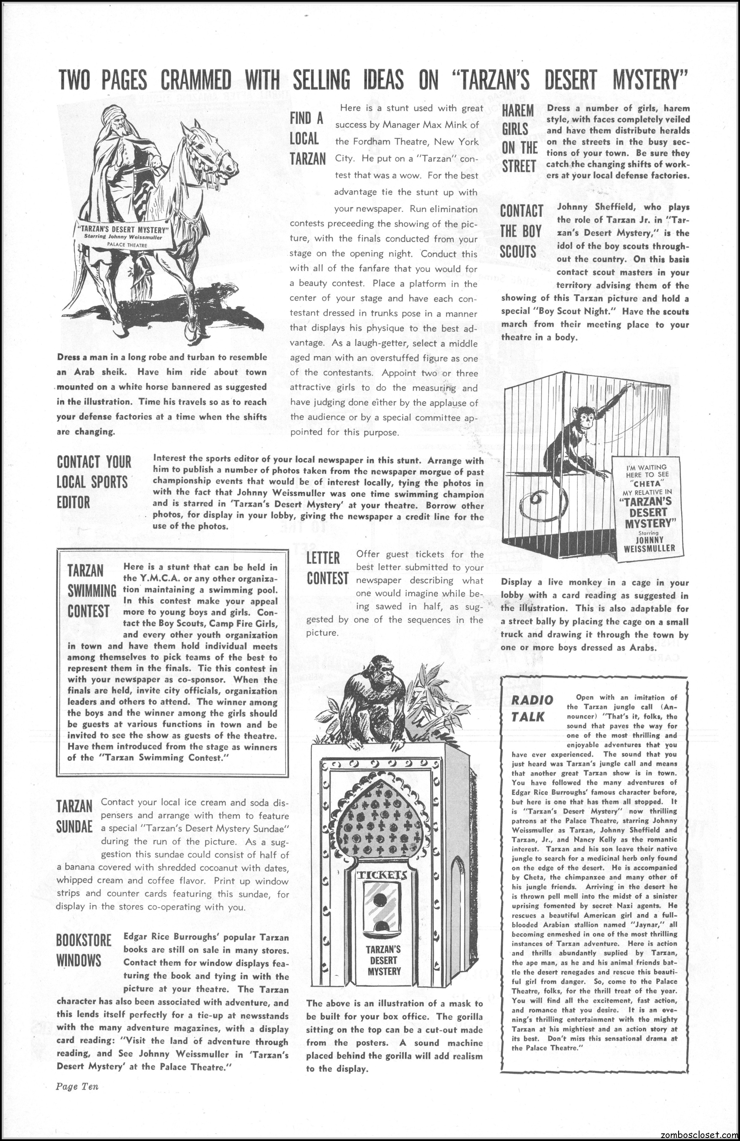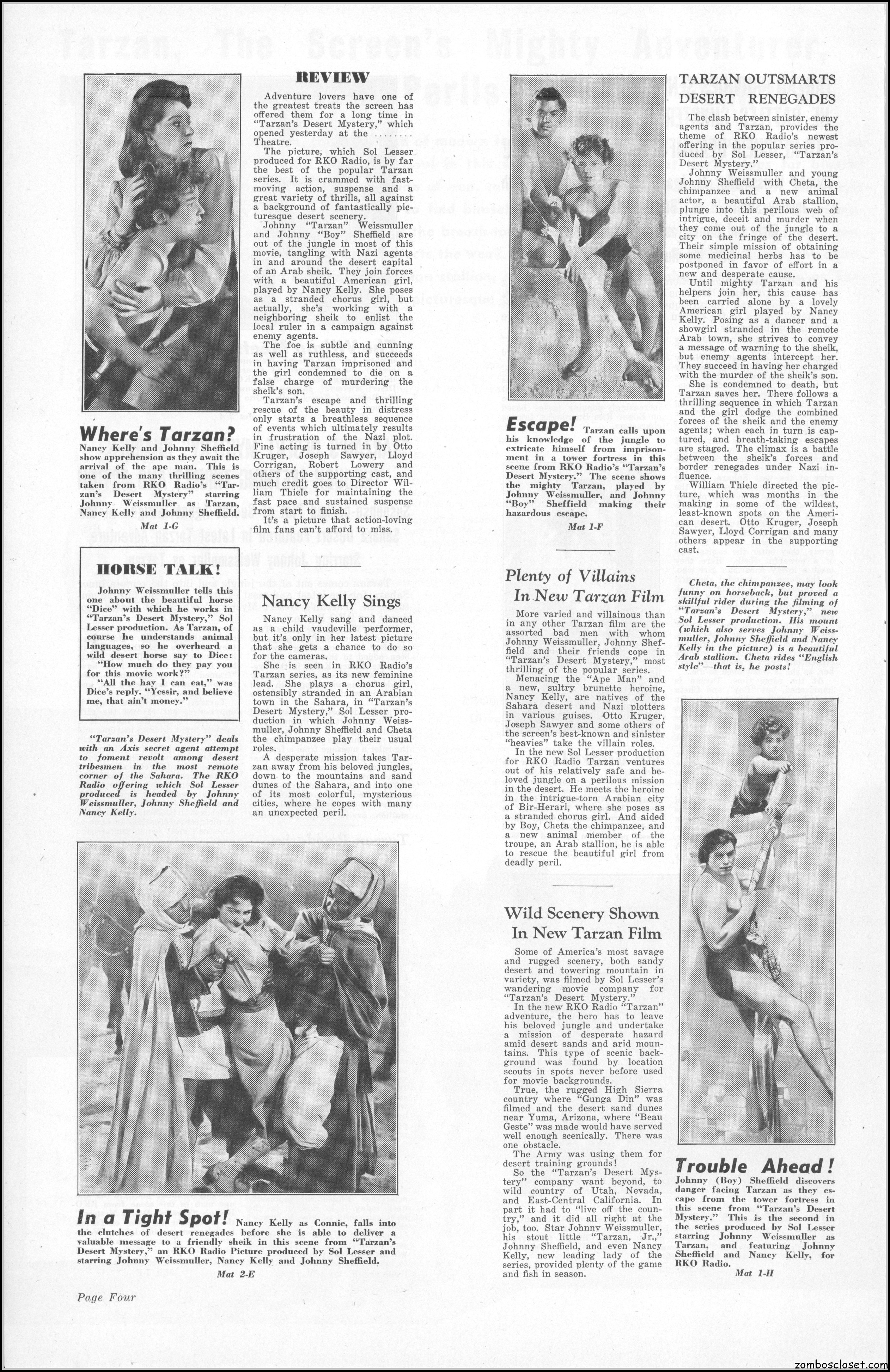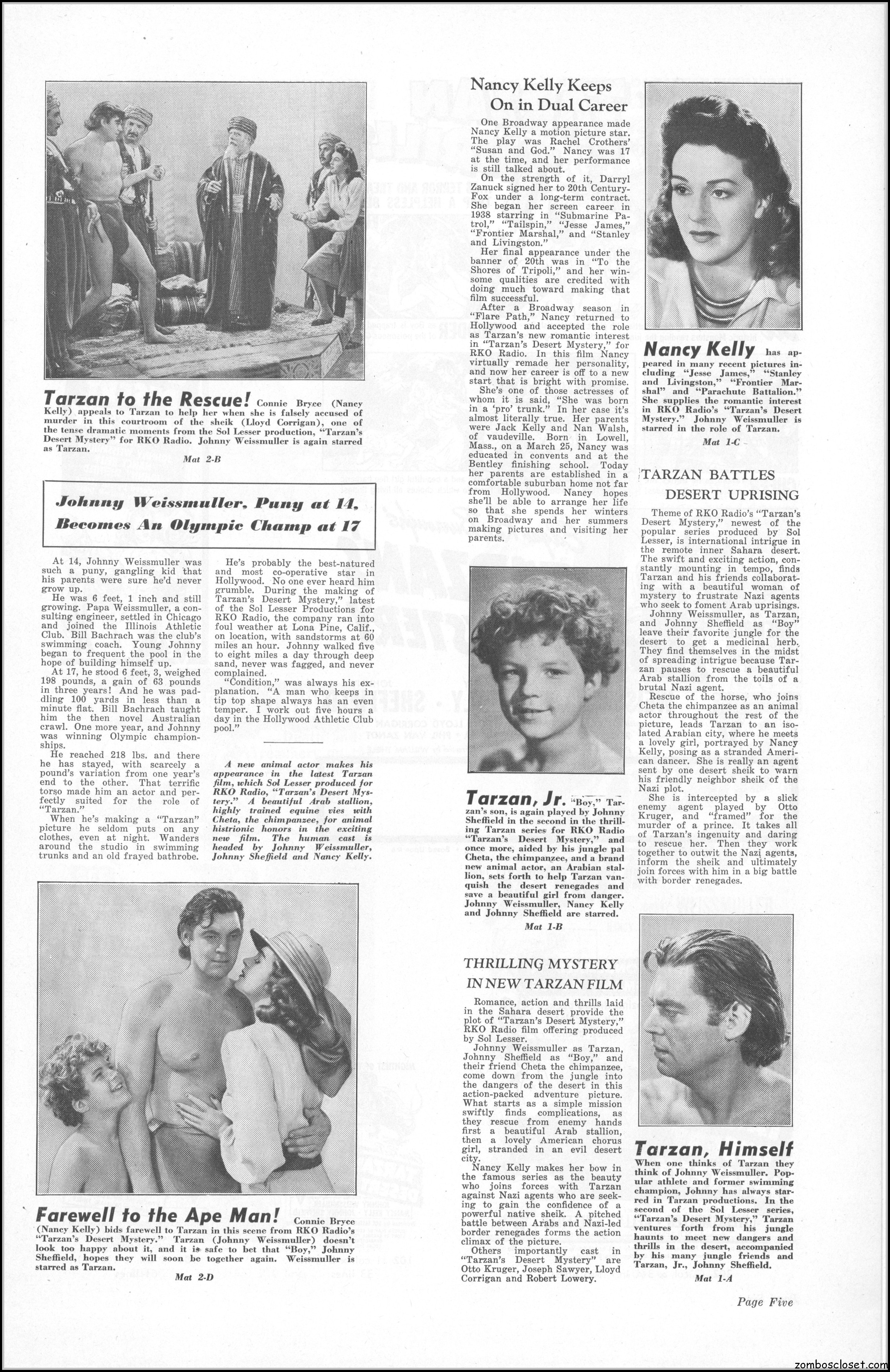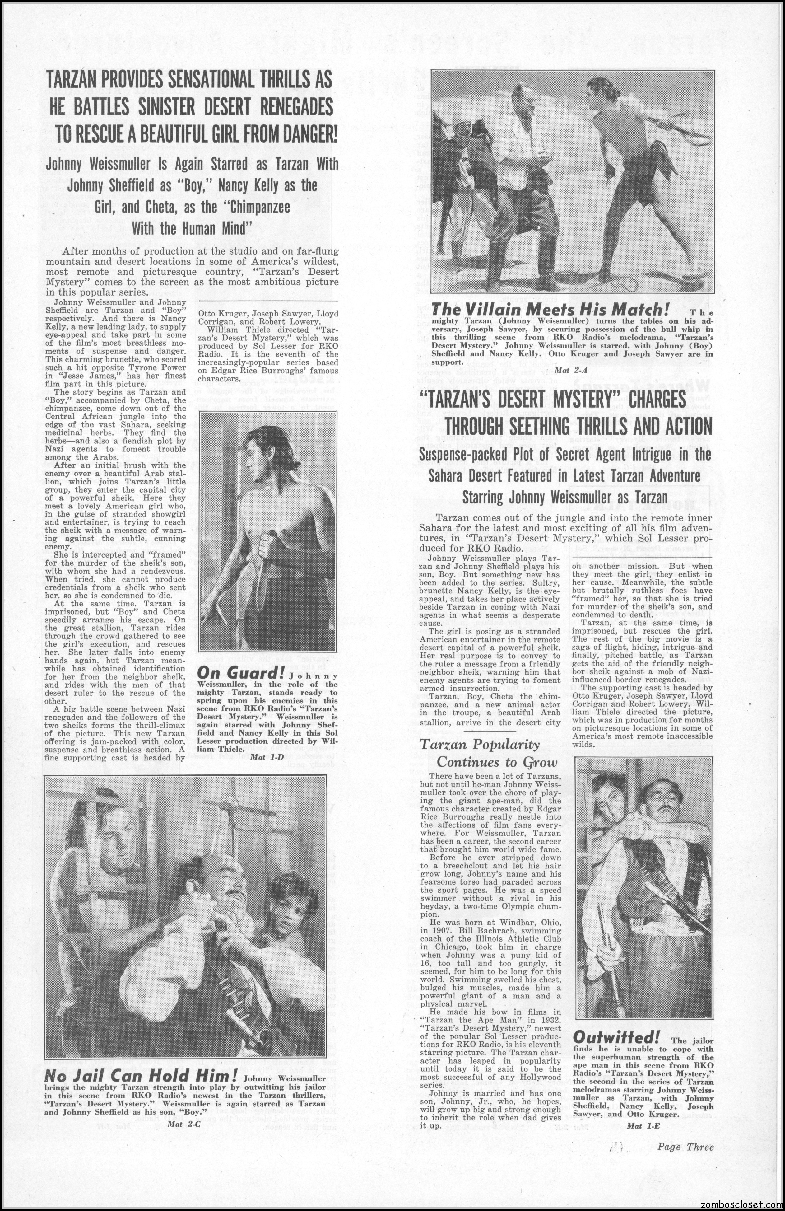 Here's the 11×17 inches pressbook for Tarzan's Desert Mystery. While Jane is away helping the war effort, Tarzan must contend with Nazis, hungry plants, and a pesky giant spider. A fun matinee romp in the series, this is the 8th movie for Johnny Weissmuller as Tarzan. Amazingly, while I'm a big fan of the Tarzan movies, this is the one I have yet to see. It's on my bucket list.