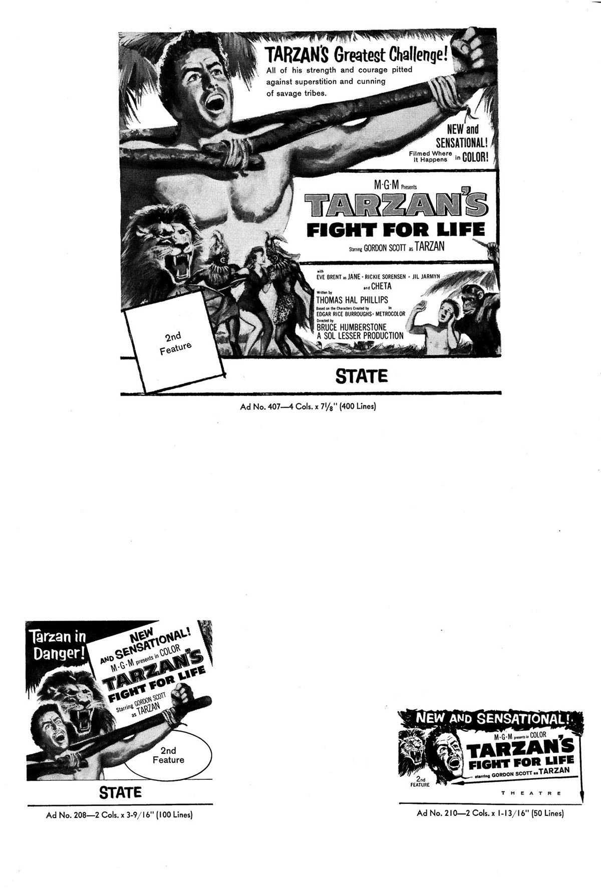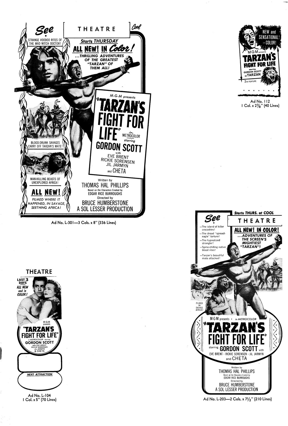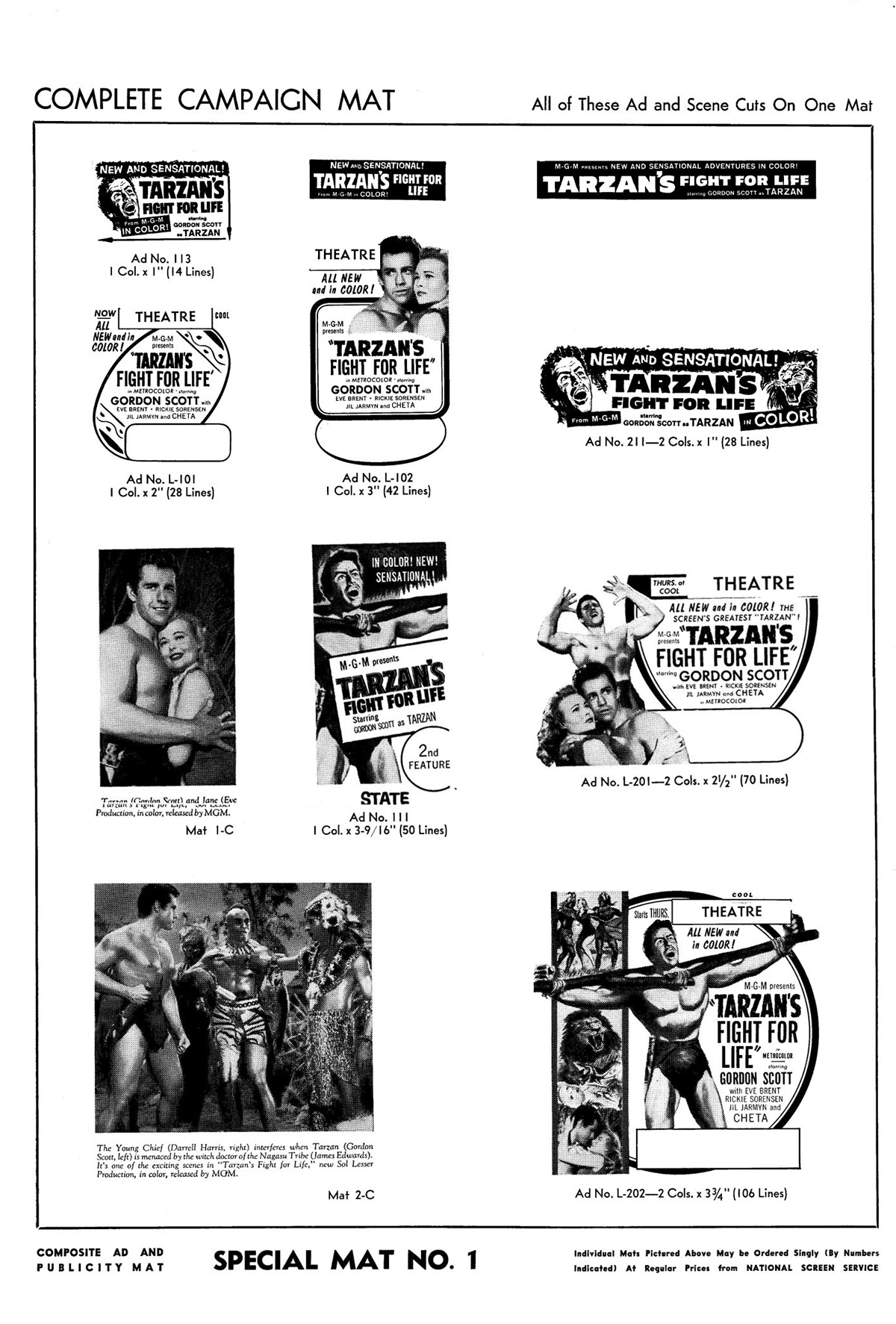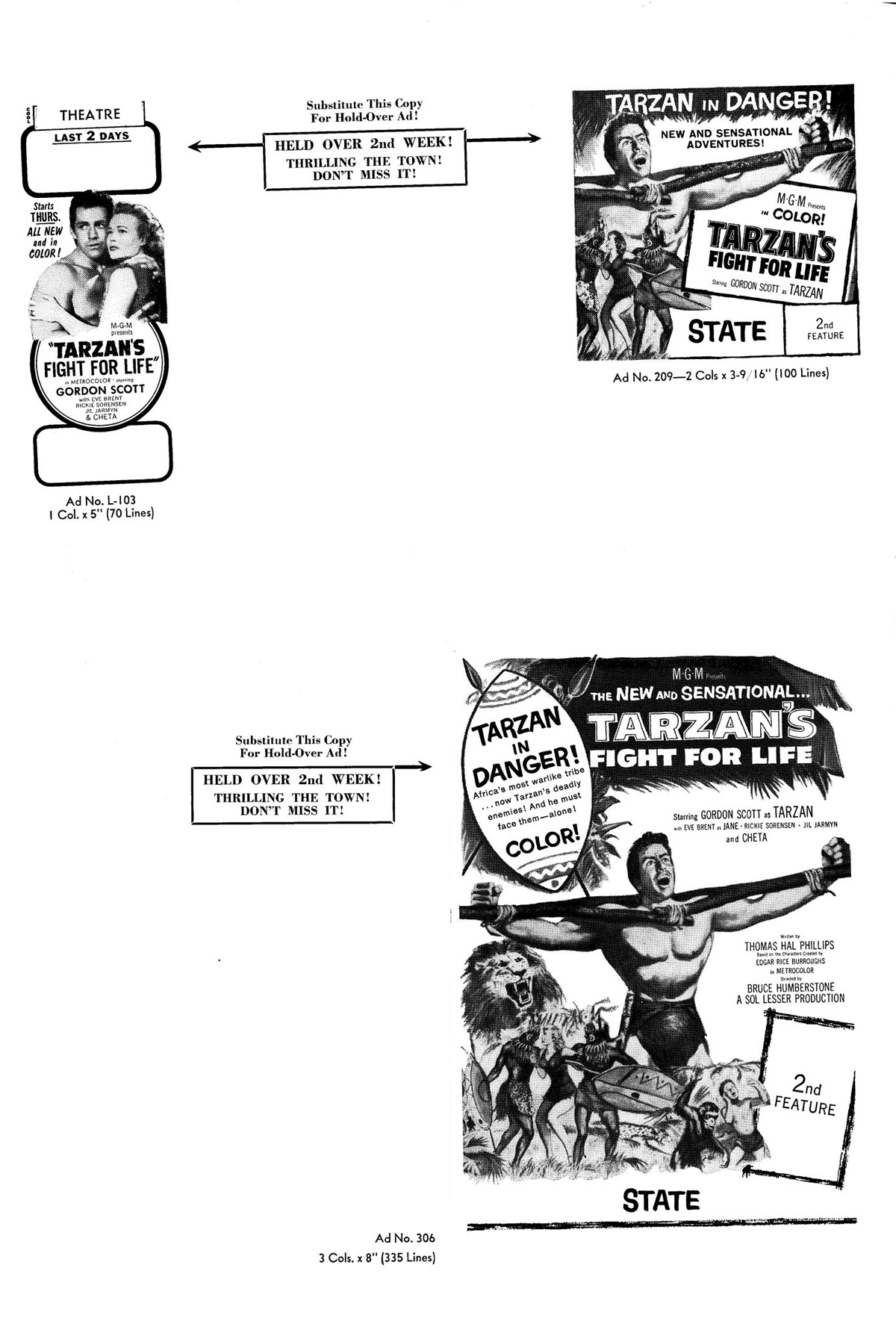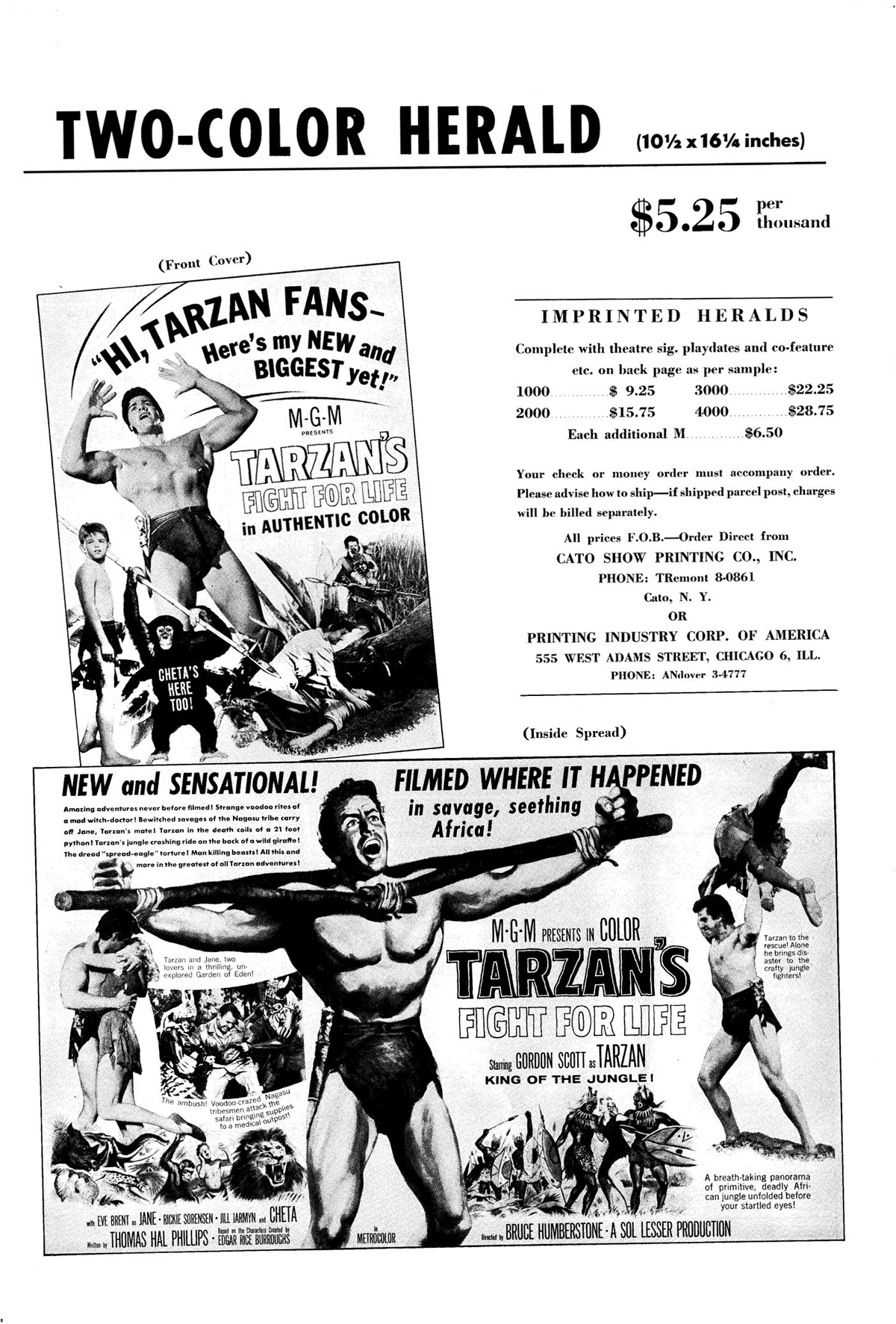 Tony Rivers, from the Classic Horror Film Board, guides us through the jungle one more time with Tarzan’s Fight for Life pressbook……Tony says: “Here’s the last of my Tarzan pressbooks (for now; still looking to get TARZAN’S HIDDEN JUNGLE again to replace the one I had), a 12 page MGM pressbook celebrating the 40th anniversary of Tarzan back in 1958. [The movie] has Jane (Eve Brent) and “Tartu” (shortened version of Tarzan2 or a new version of Boy) and native tribes causing unrest in the jungle. Tarzan to the rescue. Jil Jarmyn, who plays Ann Sturdy, lost out for the role of Jane to Eve Brent as they were the two finalists for the role. They made the right choice!”