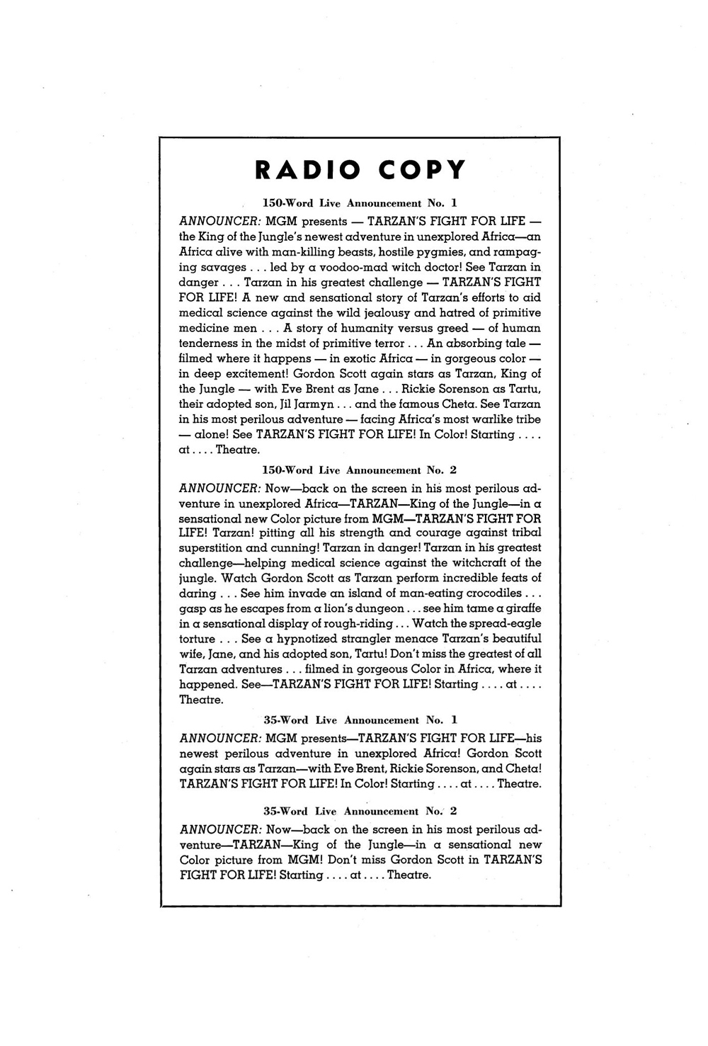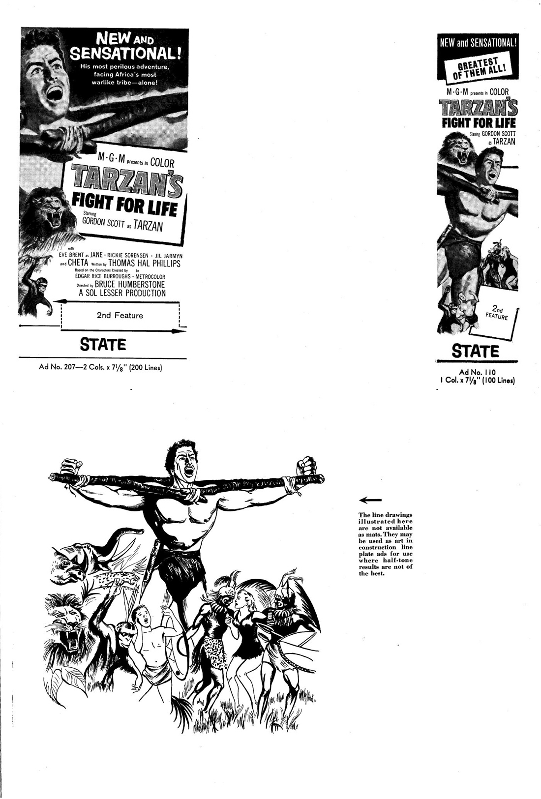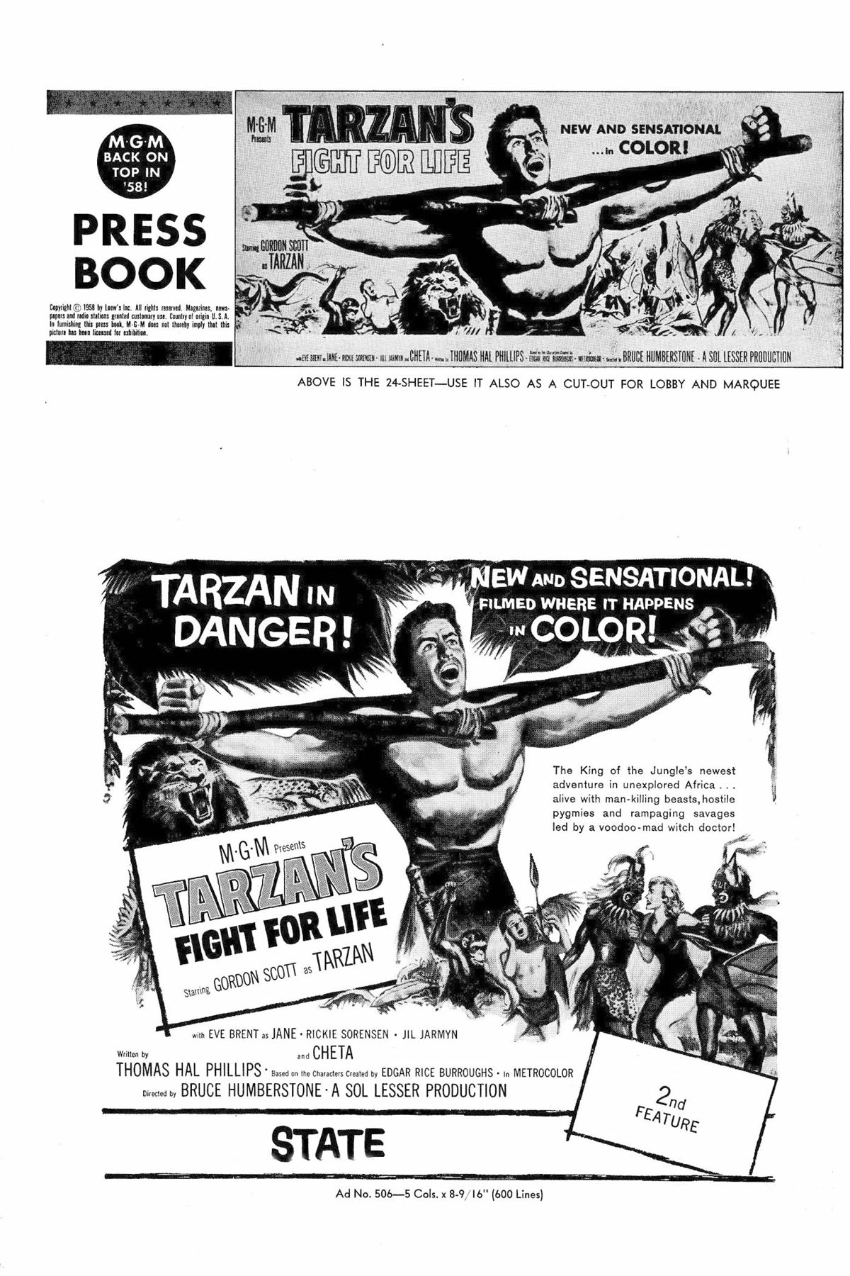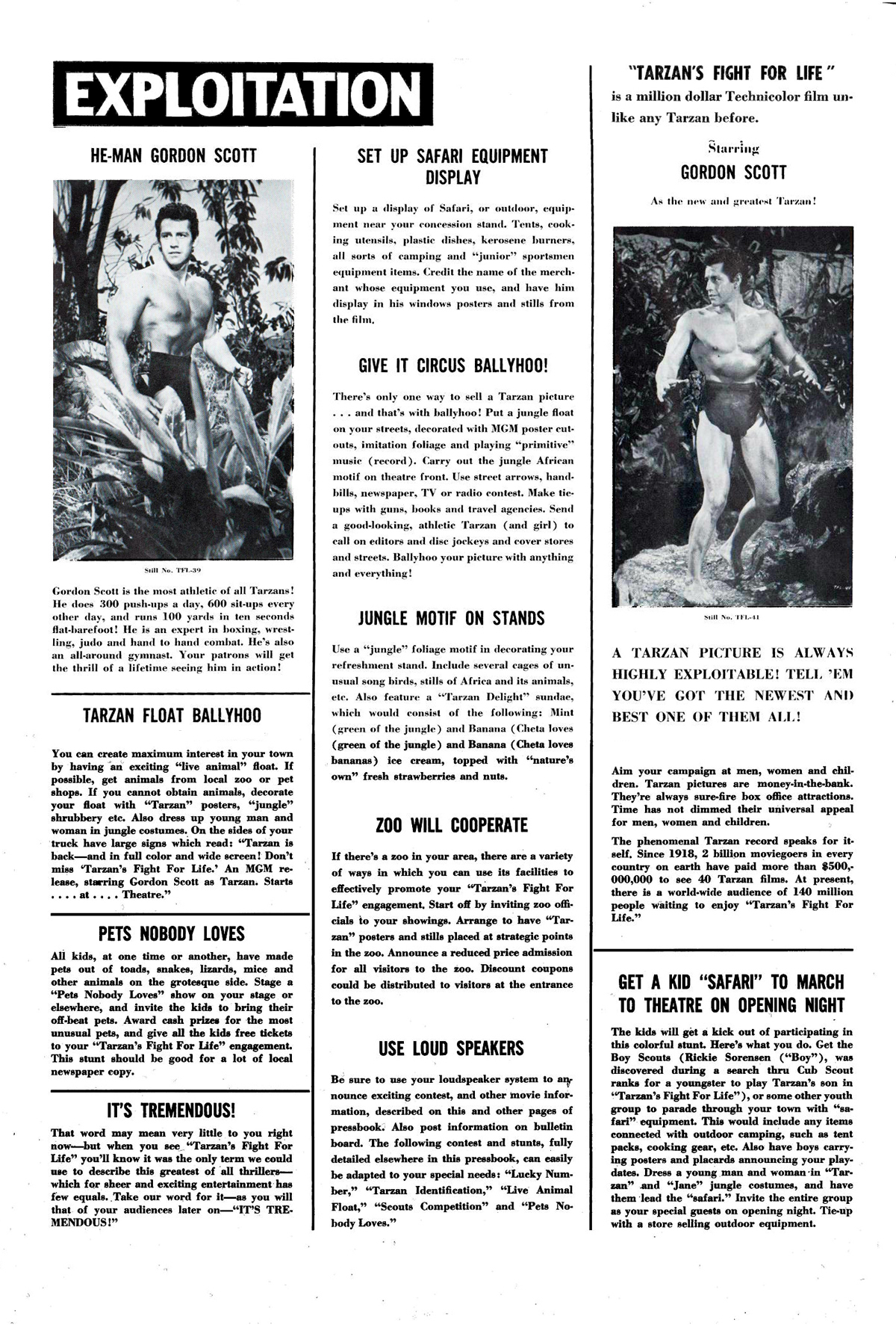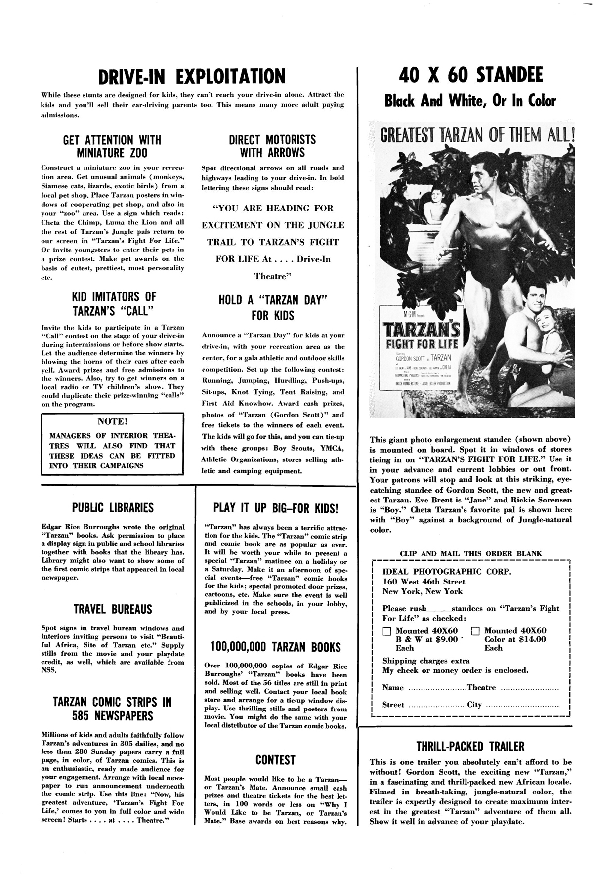 Tony Rivers, from the Classic Horror Film Board, guides us through the jungle one more time with Tarzan’s Fight for Life pressbook……Tony says: “Here’s the last of my Tarzan pressbooks (for now; still looking to get TARZAN’S HIDDEN JUNGLE again to replace the one I had), a 12 page MGM pressbook celebrating the 40th anniversary of Tarzan back in 1958. [The movie] has Jane (Eve Brent) and “Tartu” (shortened version of Tarzan2 or a new version of Boy) and native tribes causing unrest in the jungle. Tarzan to the rescue. Jil Jarmyn, who plays Ann Sturdy, lost out for the role of Jane to Eve Brent as they were the two finalists for the role. They made the right choice!”