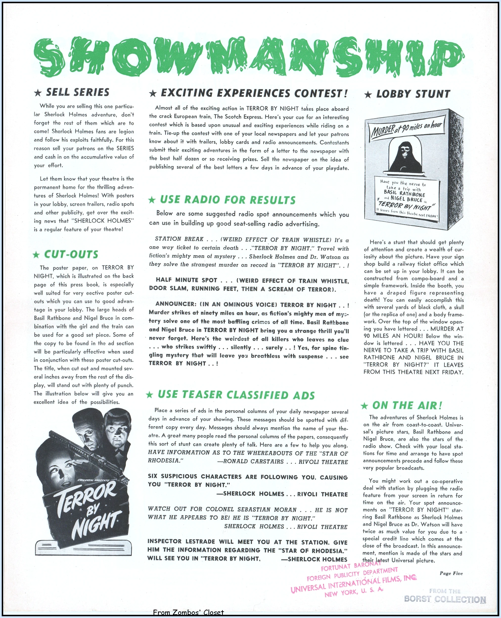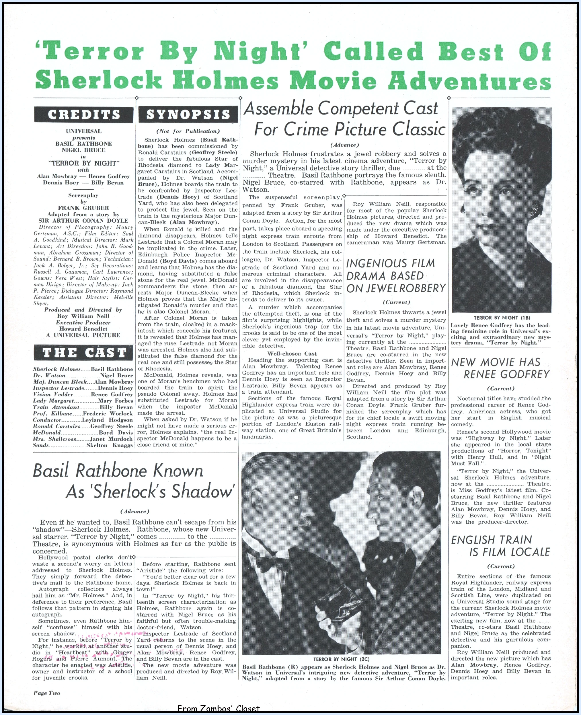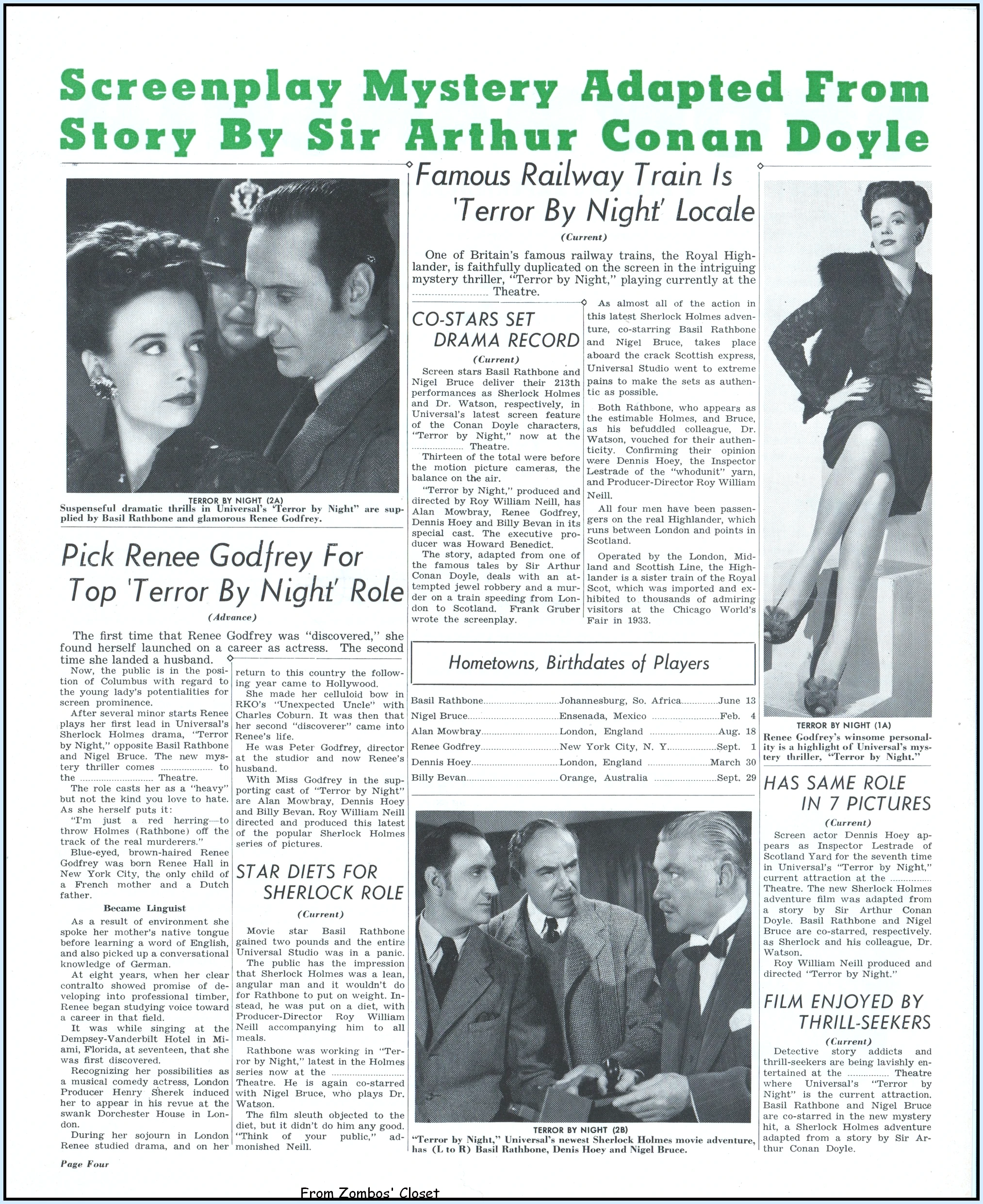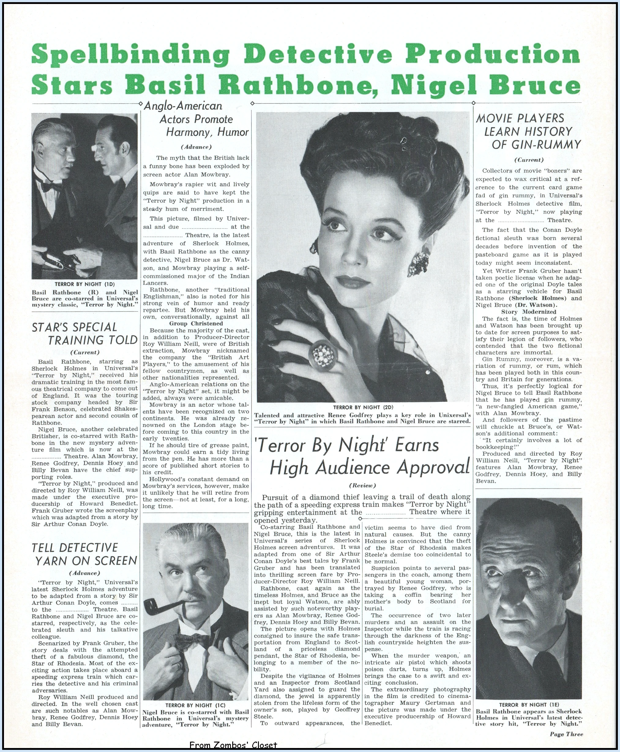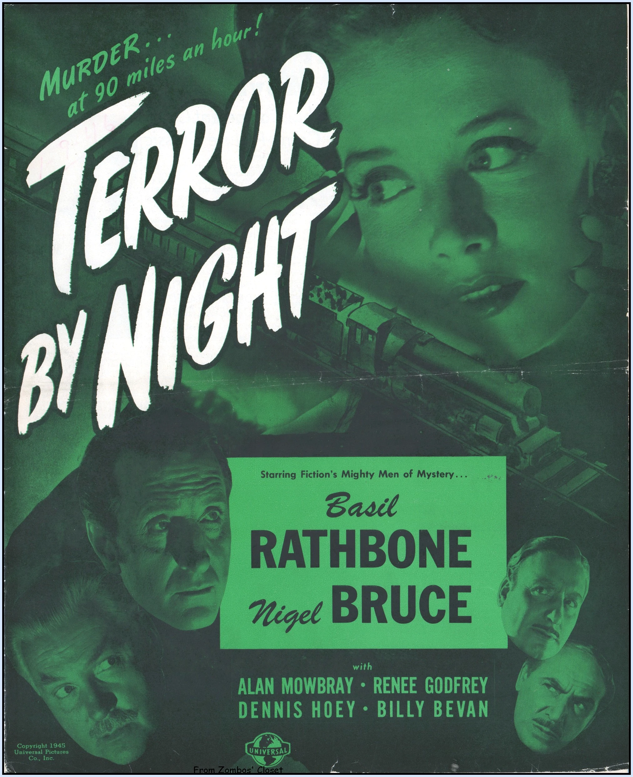 An enjoyable entry in the Sherlock Holmes series by Universal, Terror By Night is a solid 60 minutes of whodunit that director Roy William Neill keeps fast-paced and tensely mysterious given the confined setting of a “moving” train. Significant back projection helps maintain realism and Neill’s high-contrast lighting adds to the noirish look. The one failing movies taking place on trains or boats or planes have is the instability of simple motions of people walking or standing on something moving, sailing or flying; characters are always so motionless and stable while the normal jerks and bumps normally experienced in real life are not shown onscreen. The production costs for such realism can be high, but would be a welcomed sight. You can see a good copy of this movie on YouTube. The character actors appearing in the Sherlock Holmes movies were superb. To learn more about them I highly recommend reading Sherlock Holmes and the Fabulous Faces: The Universal Pictures Repertory Company by Michael A. Hoey.