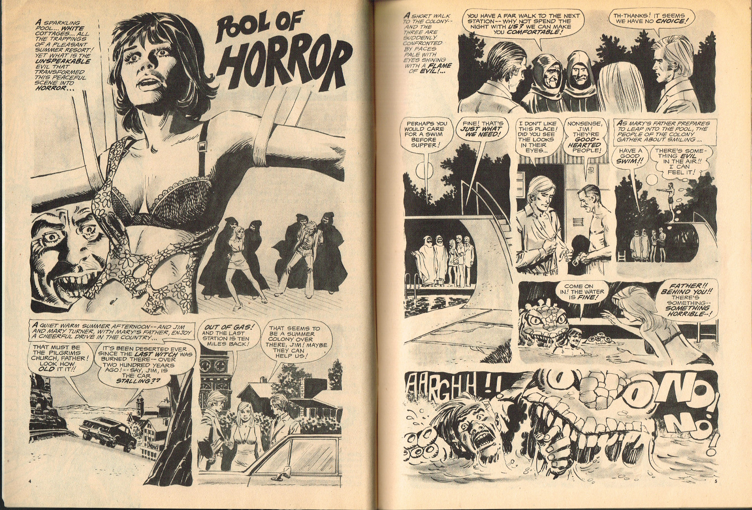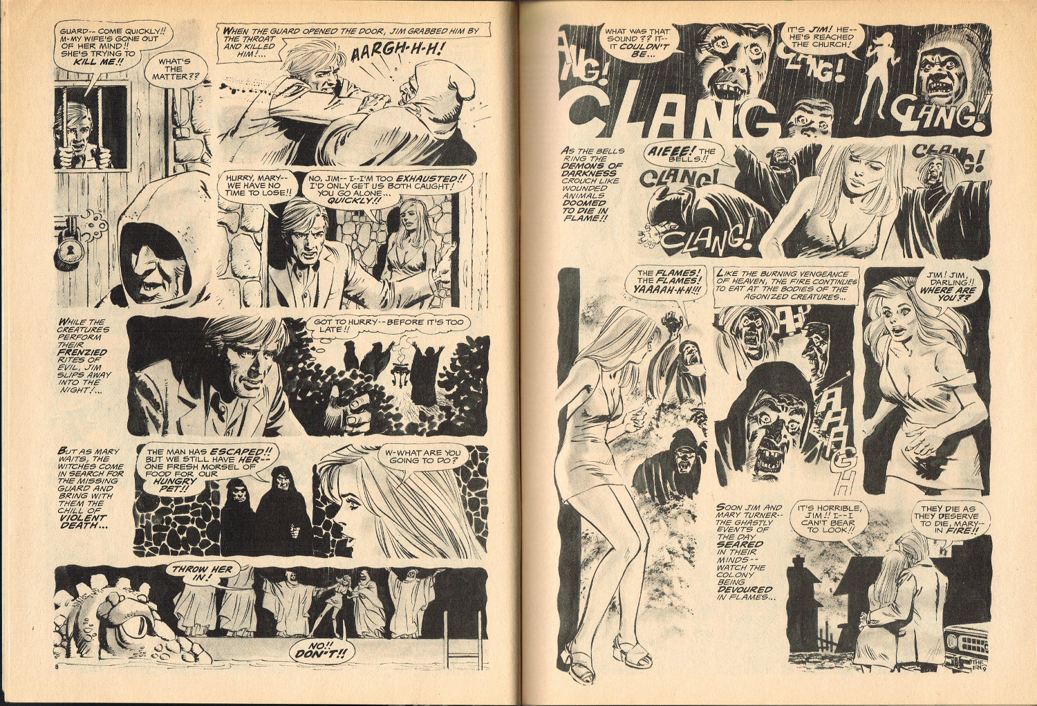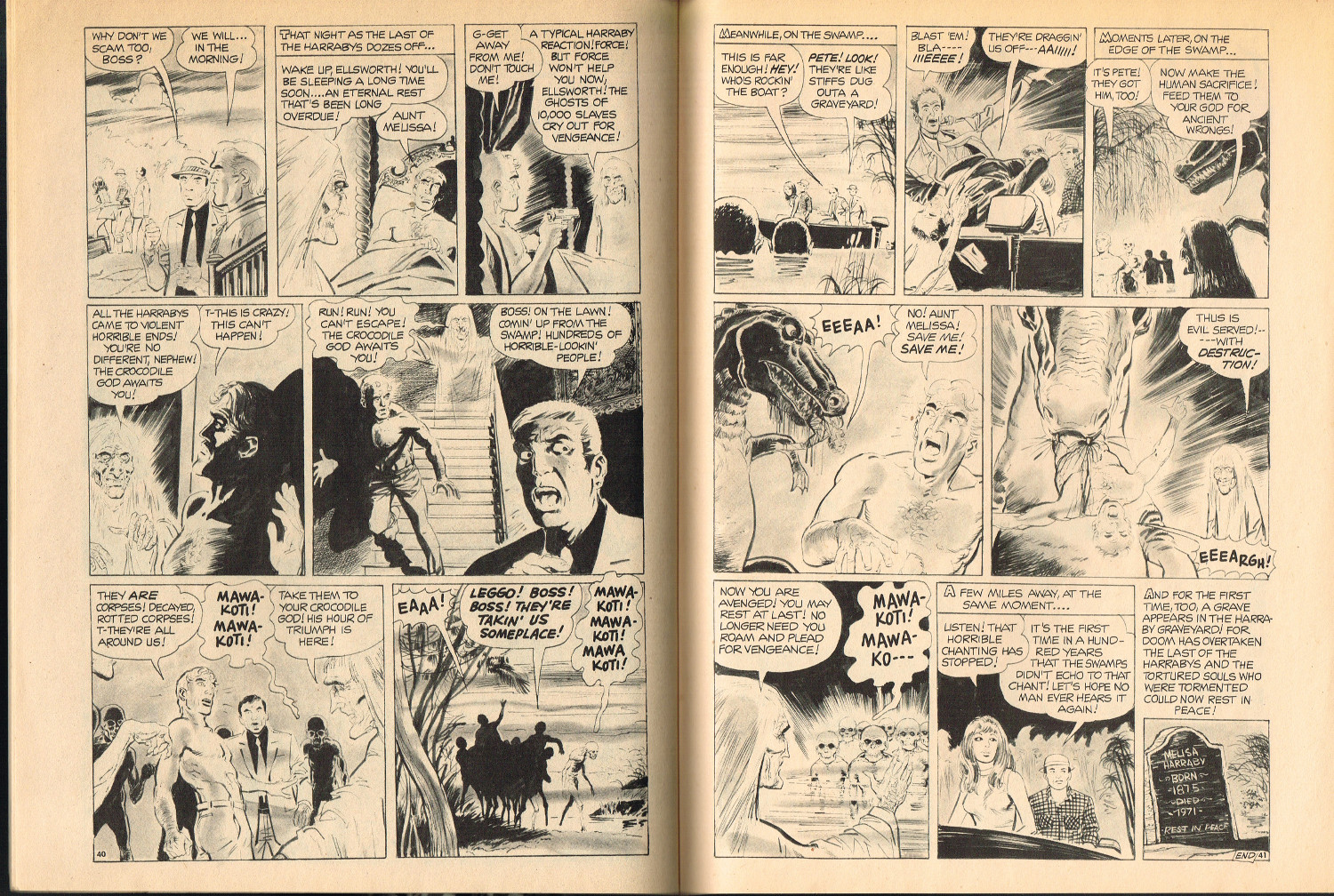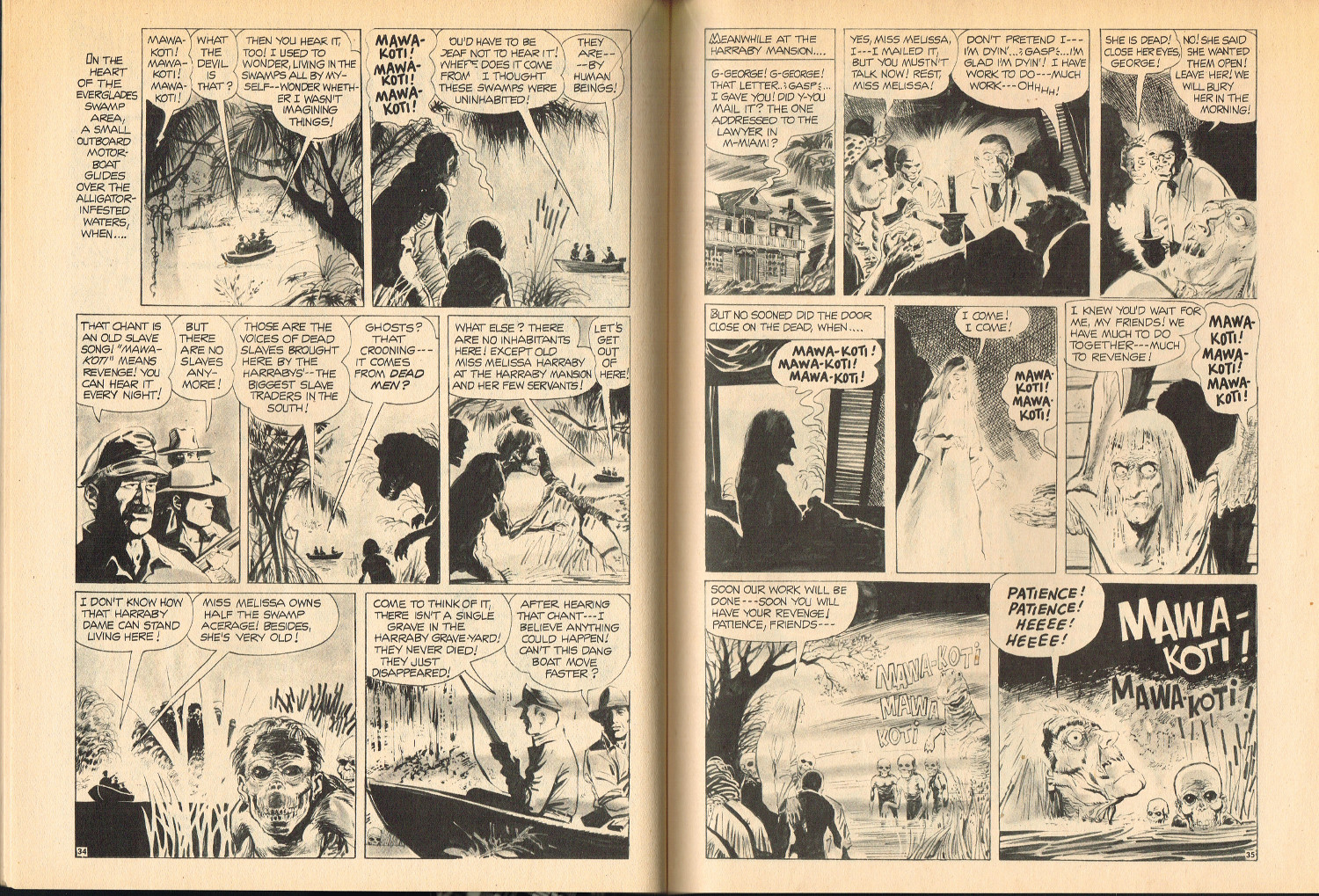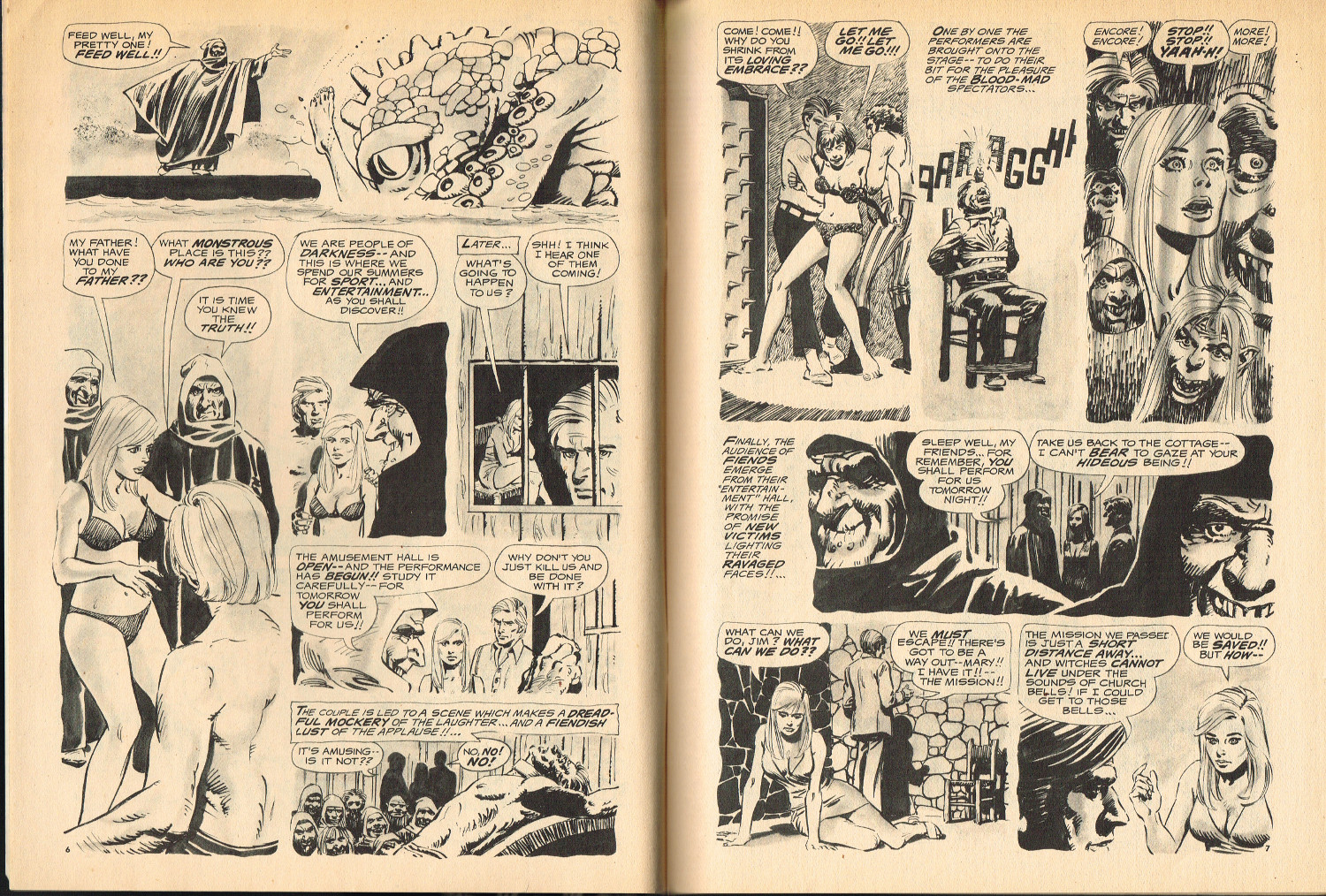 With Eerie Publications not one to waste artwork dollars, the cover for volume 5, issue 4, of Terror Tales combines covers from Tales from the Tomb, August and October issues from 1970. So if you think it's a bit incoherent you're thinking right. In this issue, splendidly murky and swirling panels from Reynoso makes Ghoulish Feast a moody read. Pool of Horror, which leads off this issue, is also good, albeit with word balloons like "There's something evil in the air, I can feel it!" it is a tad contrived. The Swamp Devils hunger for revenge as the Harrabys can't escape their doom, and creatures that look like human moles in Doom Creatures are oblivious to fire and bullets, but not barium! (Say, wasn't barium salts the poison used on Frank Bigelow in the 1950 noir classic, D.O.A?)