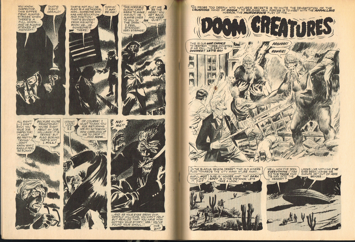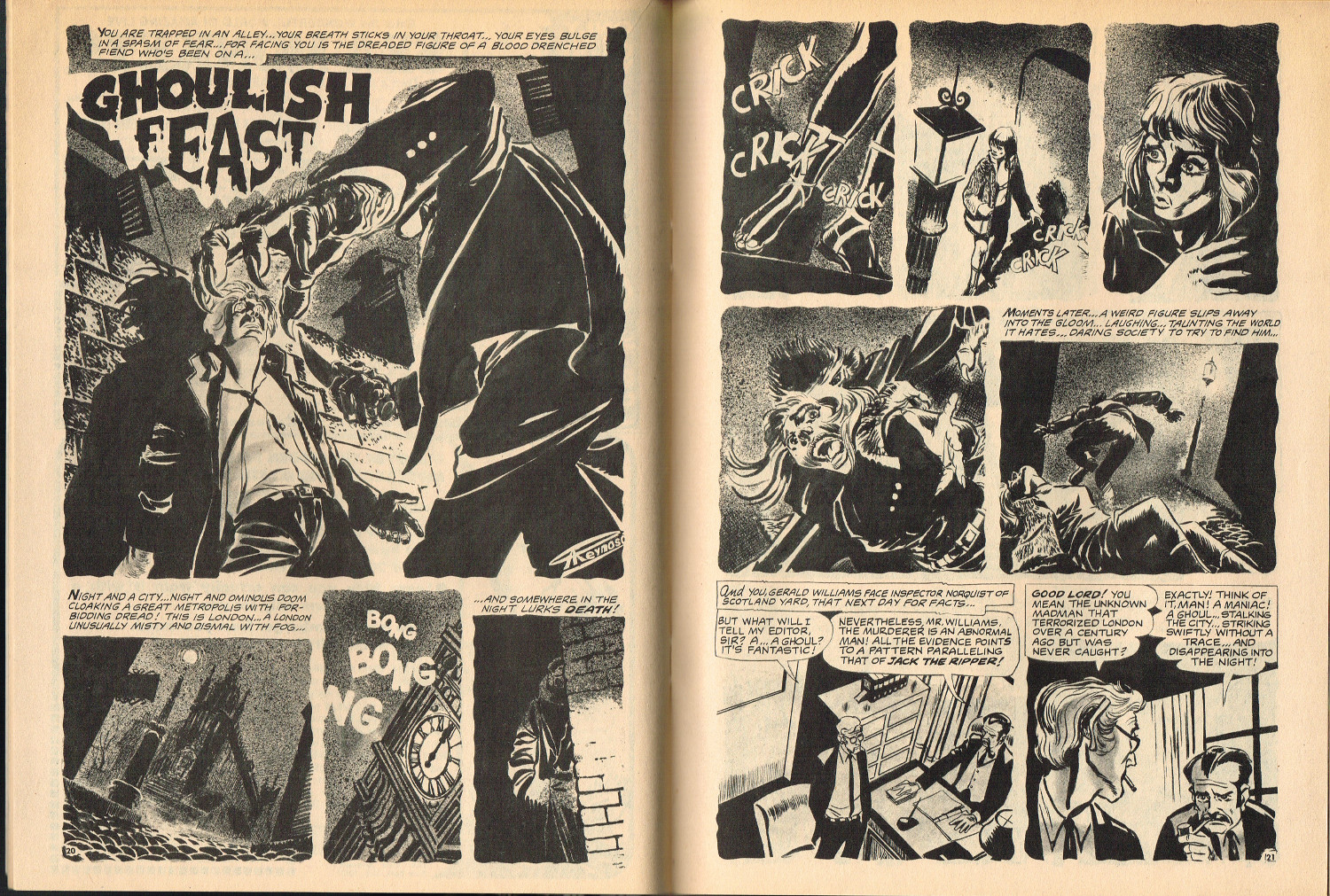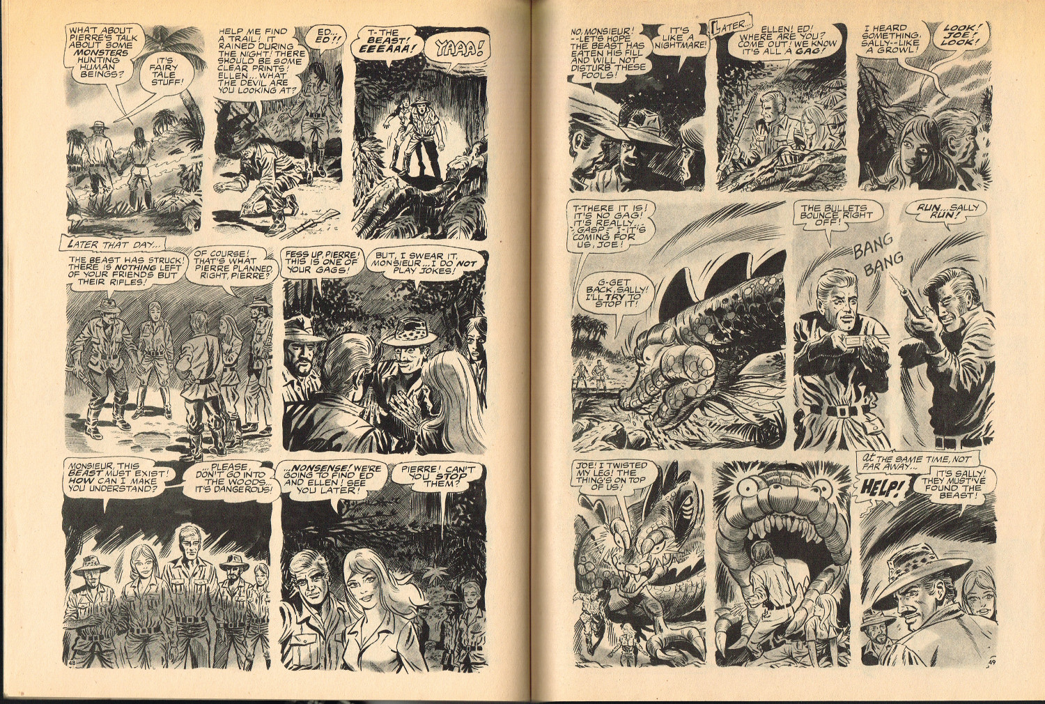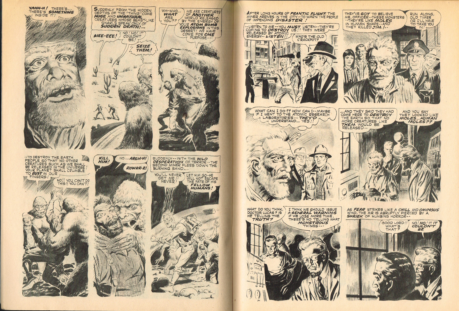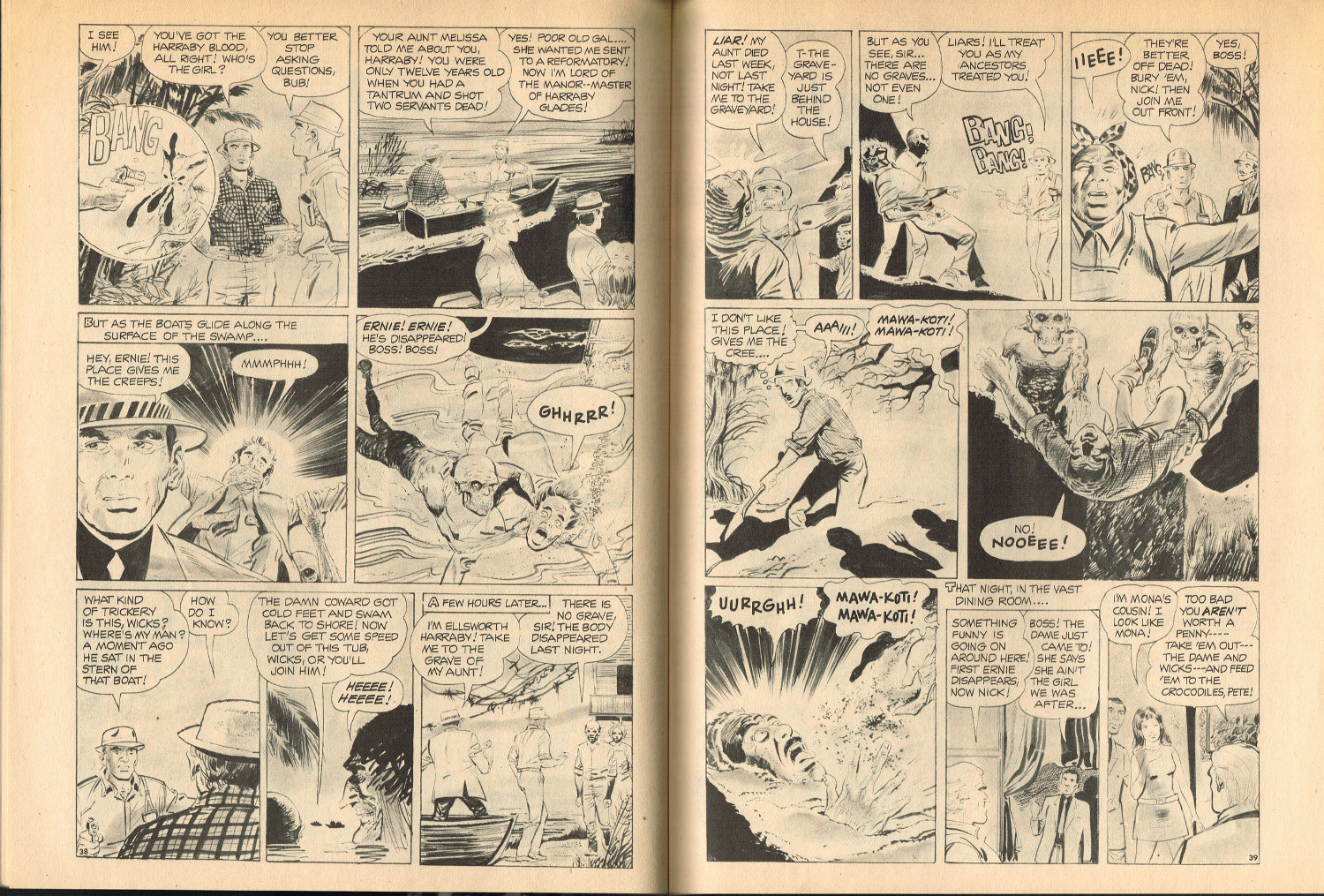 With Eerie Publications not one to waste artwork dollars, the cover for volume 5, issue 4, of Terror Tales combines covers from Tales from the Tomb, August and October issues from 1970. So if you think it's a bit incoherent you're thinking right. In this issue, splendidly murky and swirling panels from Reynoso makes Ghoulish Feast a moody read. Pool of Horror, which leads off this issue, is also good, albeit with word balloons like "There's something evil in the air, I can feel it!" it is a tad contrived. The Swamp Devils hunger for revenge as the Harrabys can't escape their doom, and creatures that look like human moles in Doom Creatures are oblivious to fire and bullets, but not barium! (Say, wasn't barium salts the poison used on Frank Bigelow in the 1950 noir classic, D.O.A?)