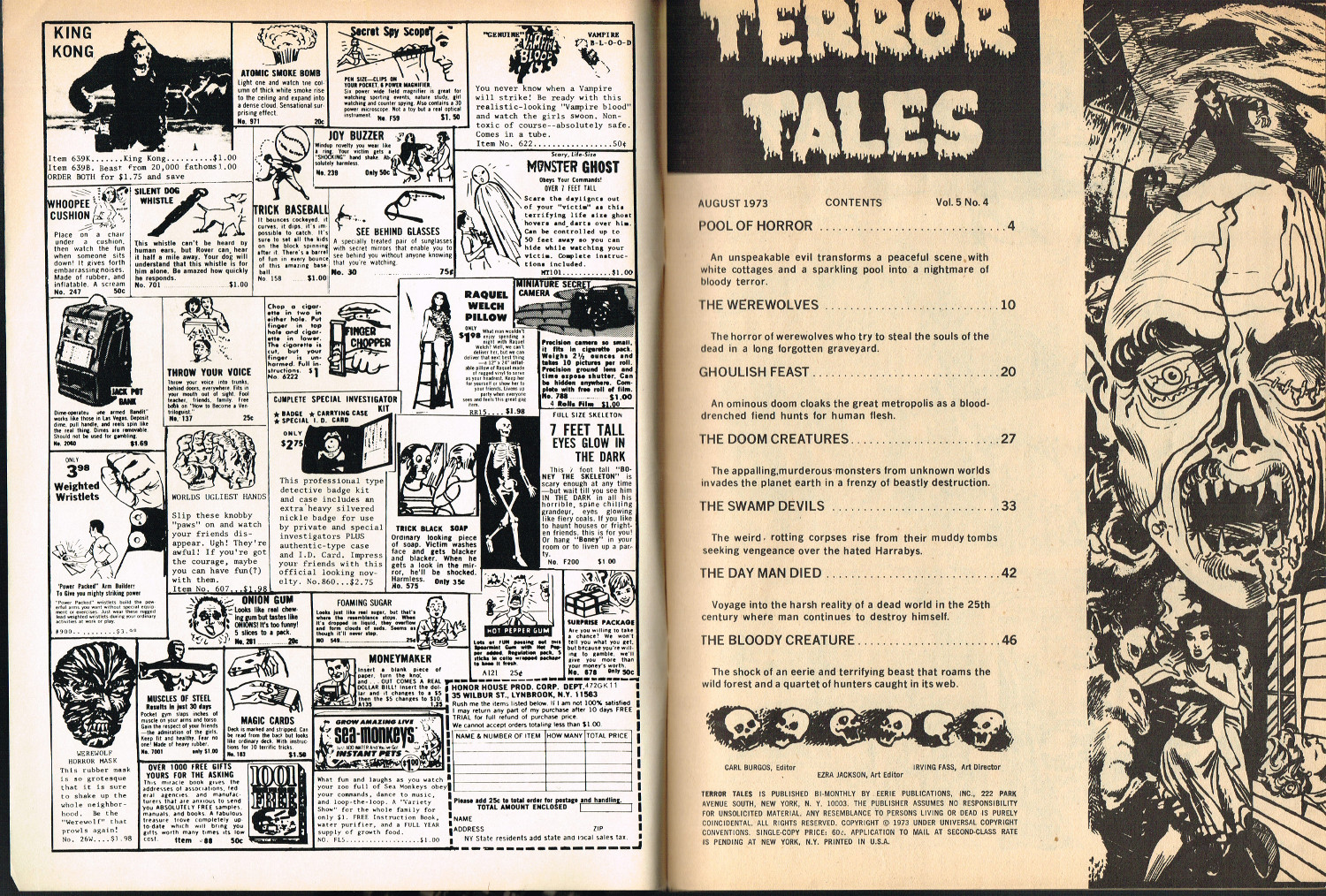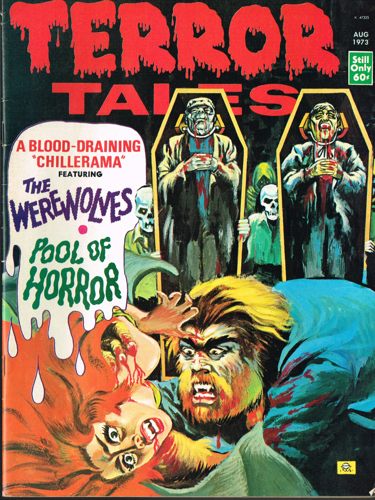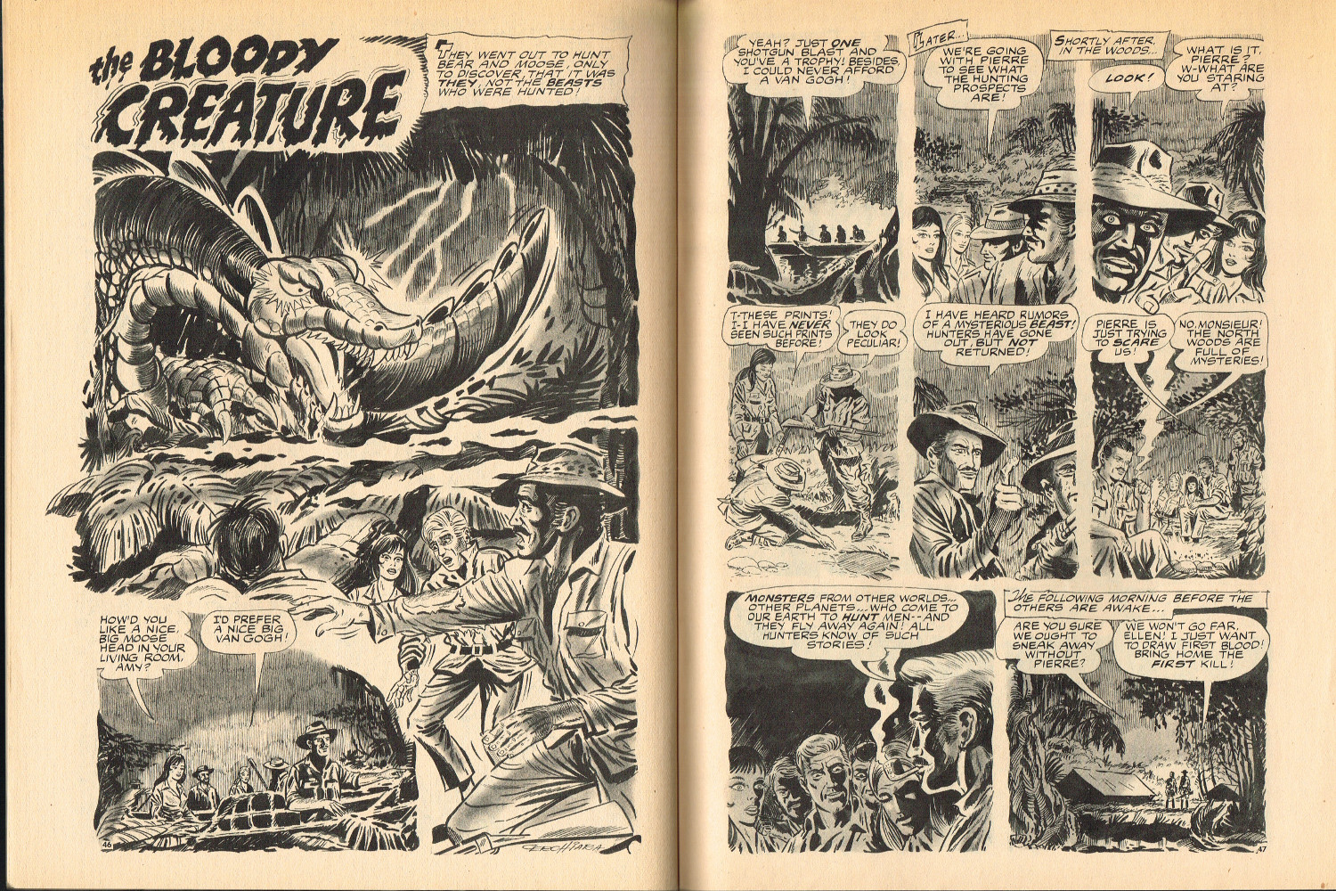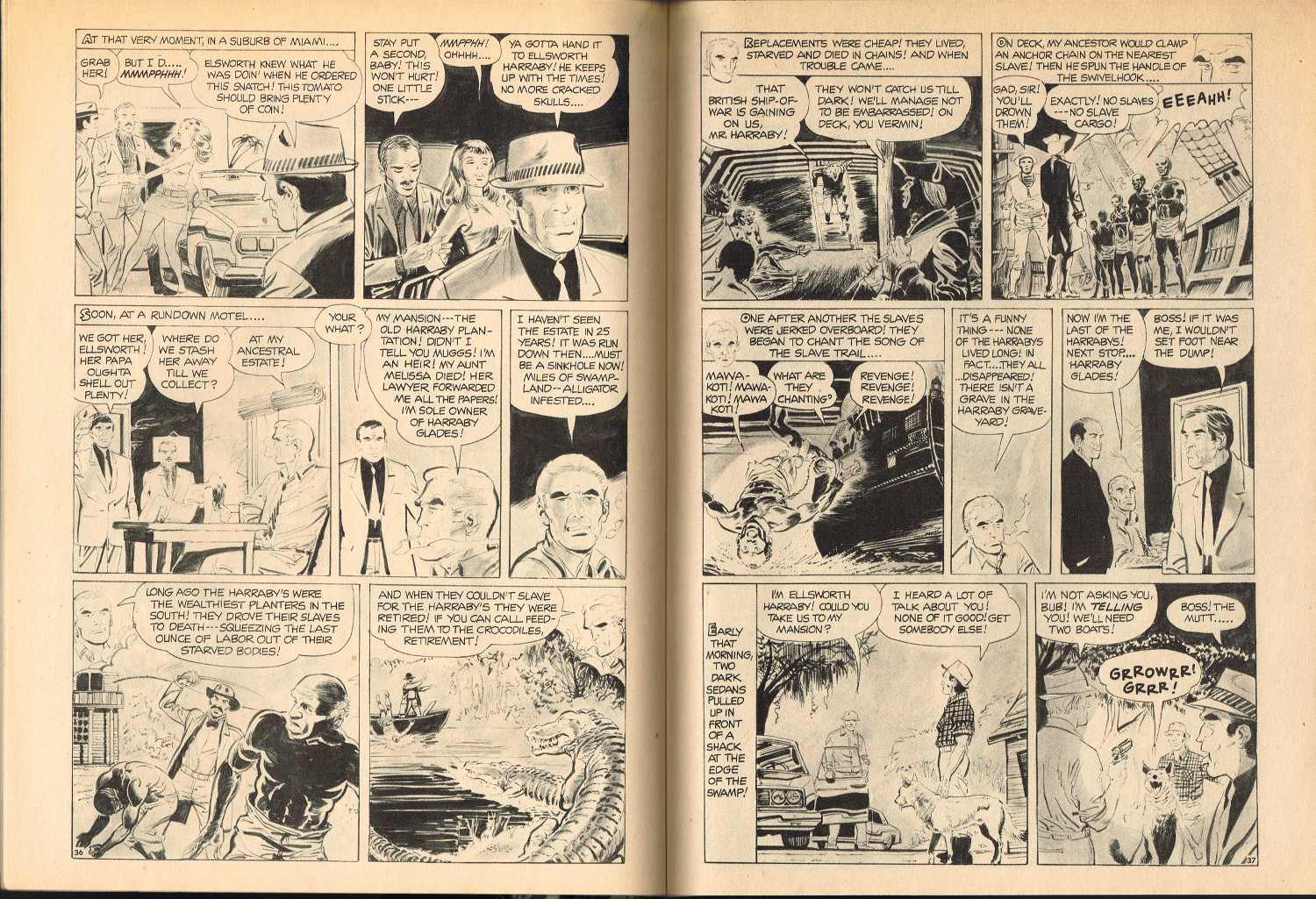 With Eerie Publications not one to waste artwork dollars, the cover for volume 5, issue 4, of Terror Tales combines covers from Tales from the Tomb, August and October issues from 1970. So if you think it's a bit incoherent you're thinking right. In this issue, splendidly murky and swirling panels from Reynoso makes Ghoulish Feast a moody read. Pool of Horror, which leads off this issue, is also good, albeit with word balloons like "There's something evil in the air, I can feel it!" it is a tad contrived. The Swamp Devils hunger for revenge as the Harrabys can't escape their doom, and creatures that look like human moles in Doom Creatures are oblivious to fire and bullets, but not barium! (Say, wasn't barium salts the poison used on Frank Bigelow in the 1950 noir classic, D.O.A?)