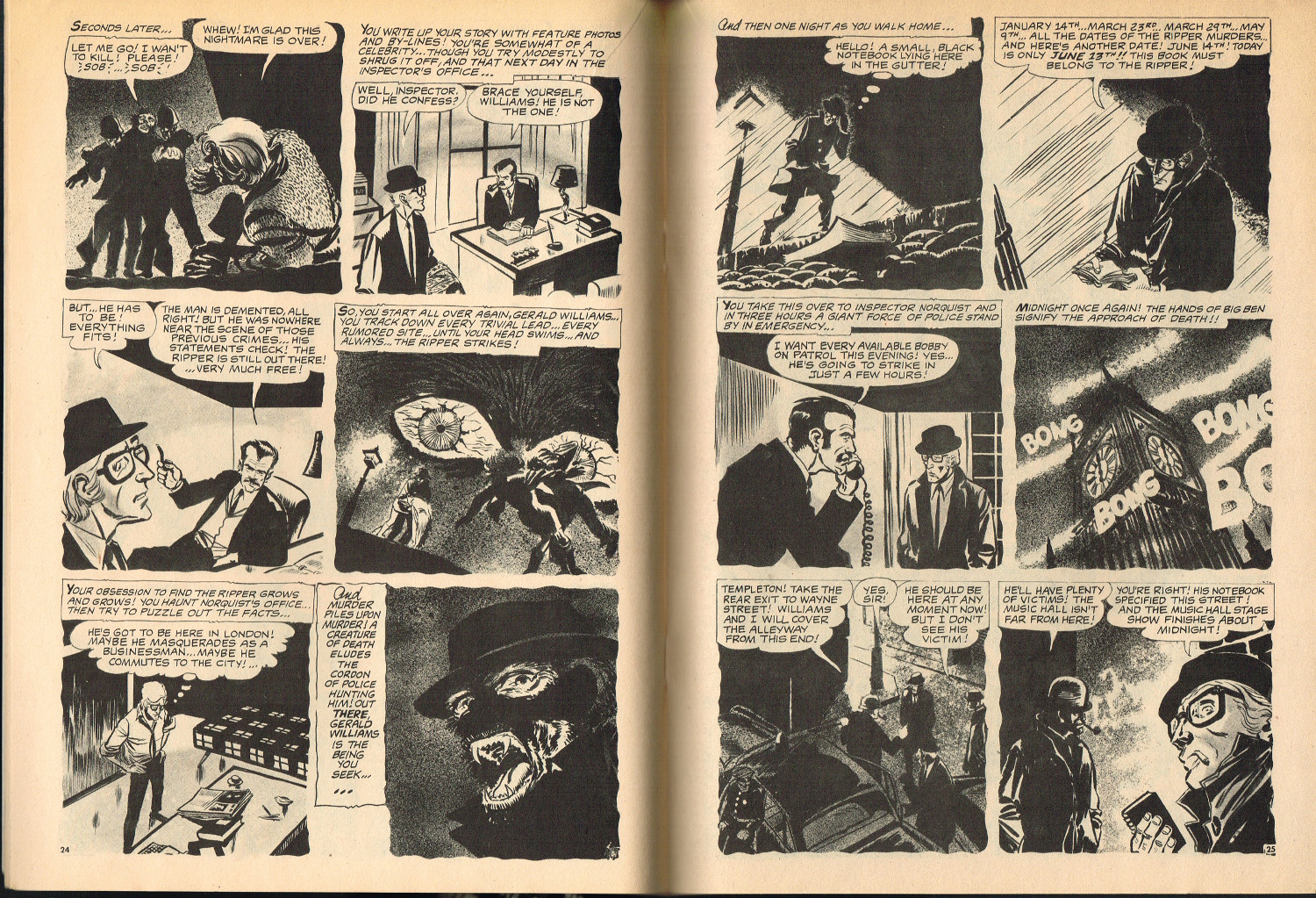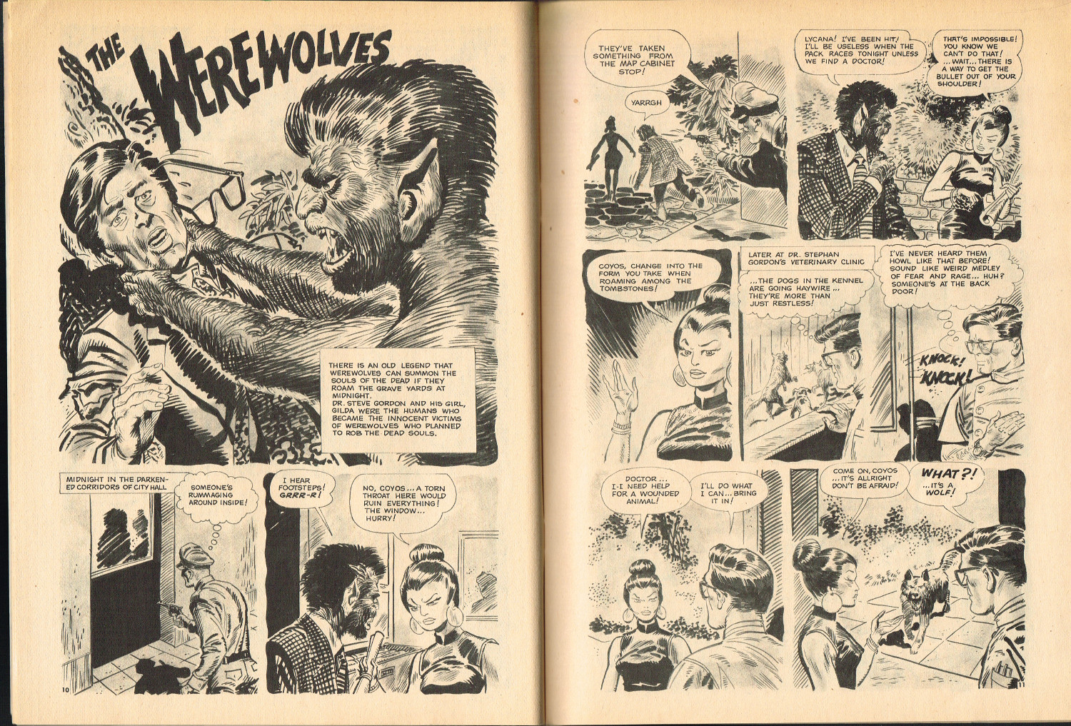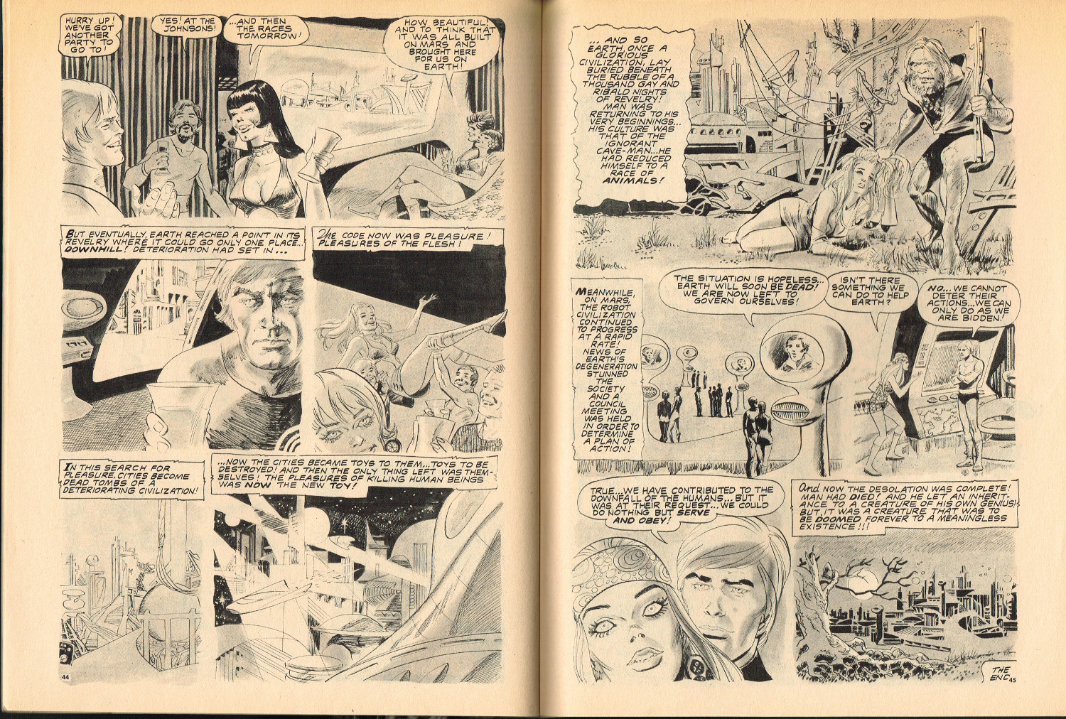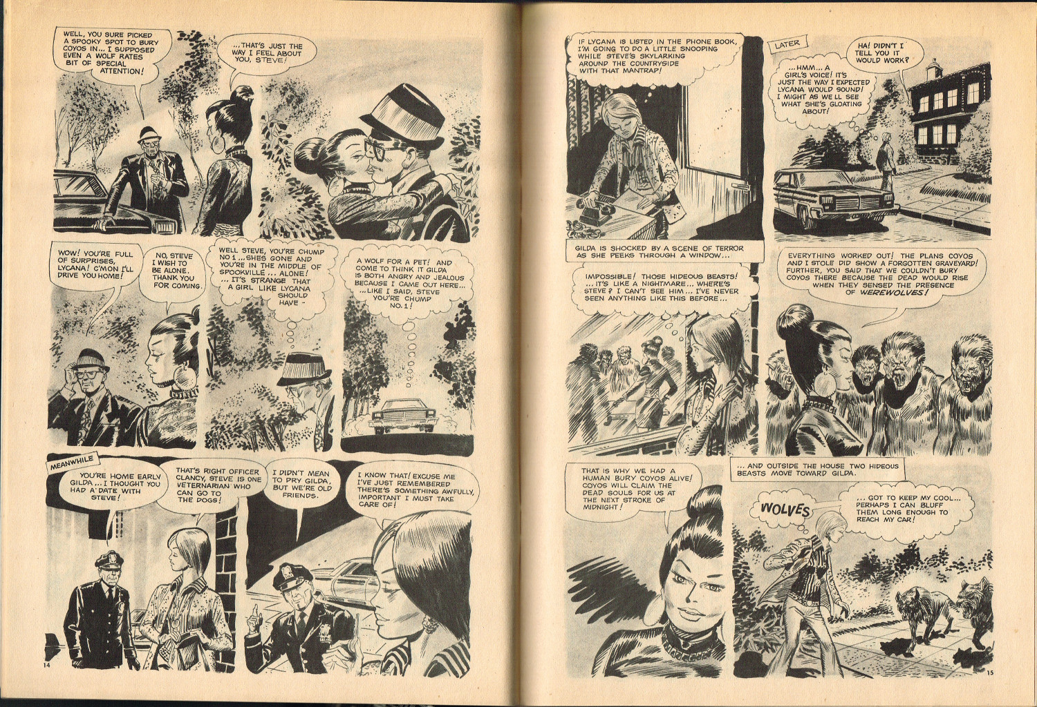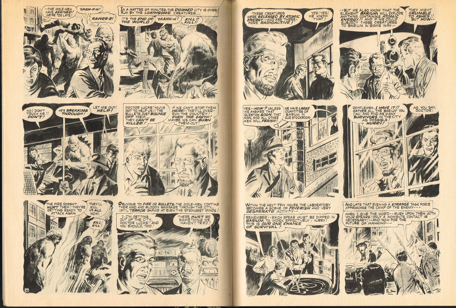 With Eerie Publications not one to waste artwork dollars, the cover for volume 5, issue 4, of Terror Tales combines covers from Tales from the Tomb, August and October issues from 1970. So if you think it's a bit incoherent you're thinking right. In this issue, splendidly murky and swirling panels from Reynoso makes Ghoulish Feast a moody read. Pool of Horror, which leads off this issue, is also good, albeit with word balloons like "There's something evil in the air, I can feel it!" it is a tad contrived. The Swamp Devils hunger for revenge as the Harrabys can't escape their doom, and creatures that look like human moles in Doom Creatures are oblivious to fire and bullets, but not barium! (Say, wasn't barium salts the poison used on Frank Bigelow in the 1950 noir classic, D.O.A?)