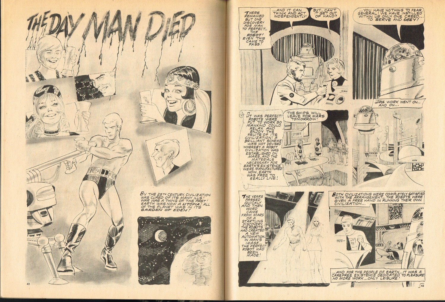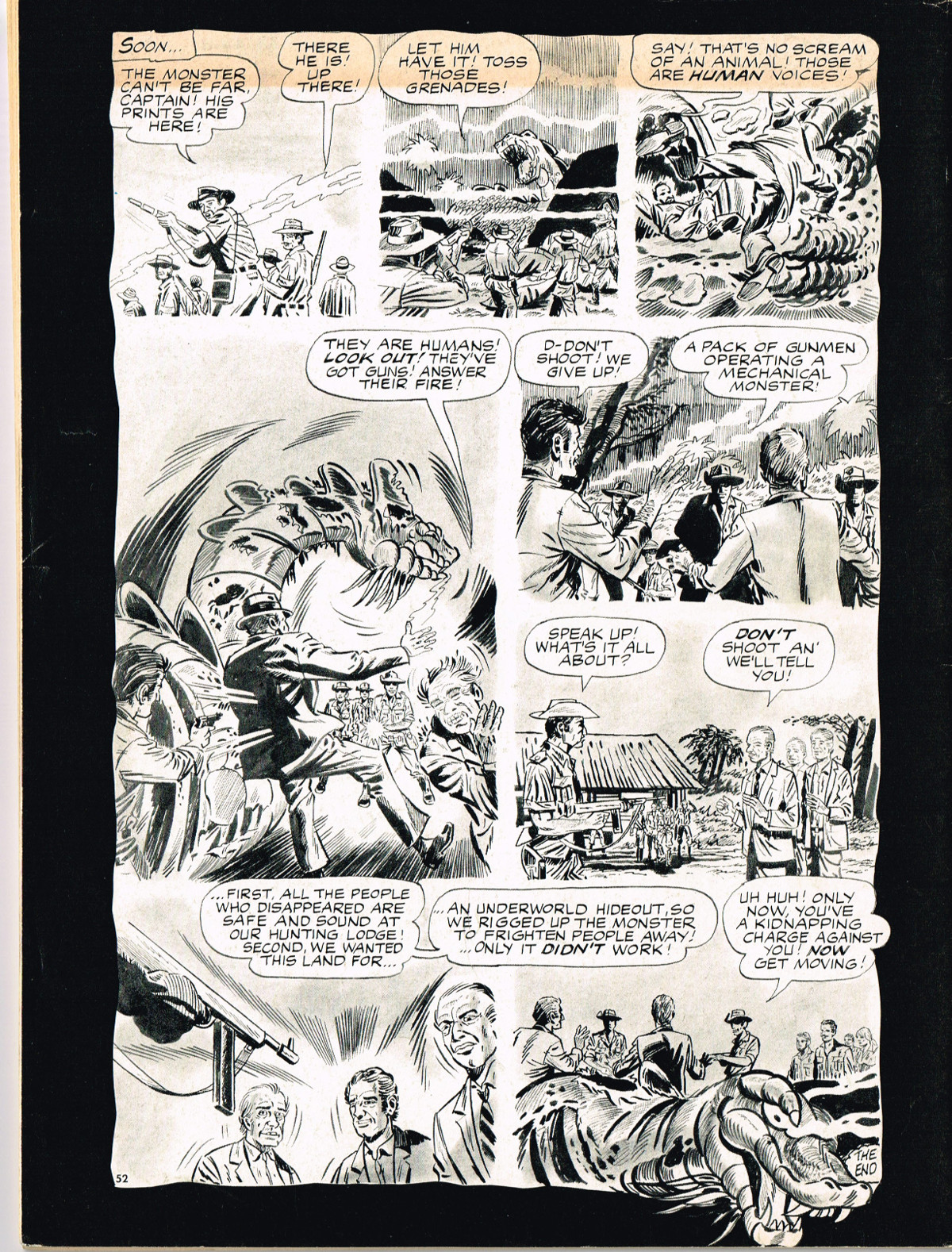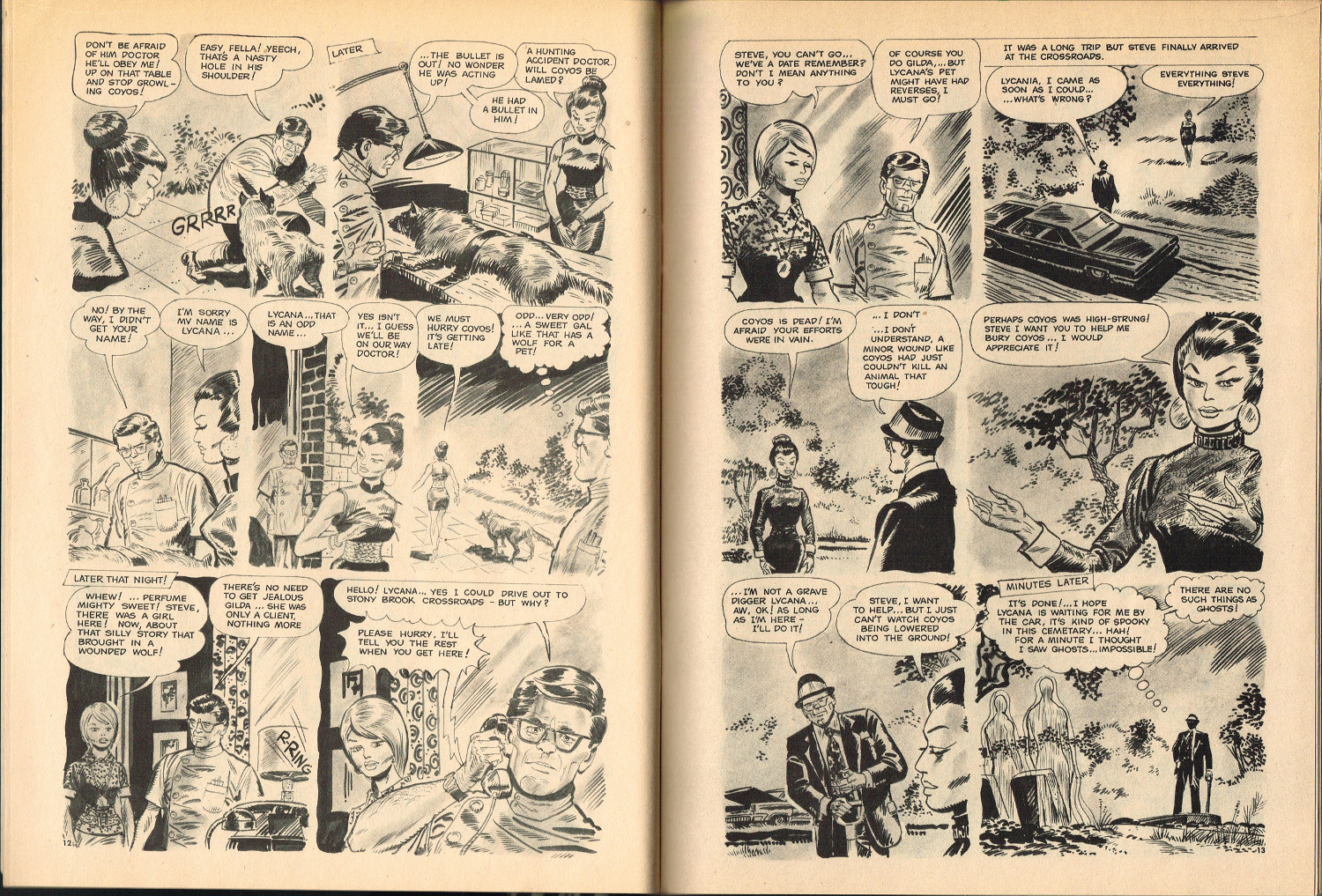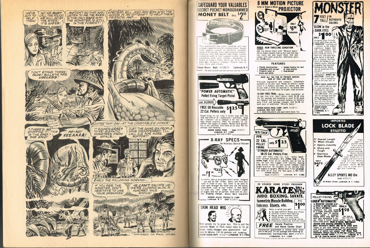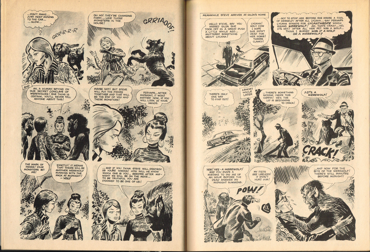 With Eerie Publications not one to waste artwork dollars, the cover for volume 5, issue 4, of Terror Tales combines covers from Tales from the Tomb, August and October issues from 1970. So if you think it's a bit incoherent you're thinking right. In this issue, splendidly murky and swirling panels from Reynoso makes Ghoulish Feast a moody read. Pool of Horror, which leads off this issue, is also good, albeit with word balloons like "There's something evil in the air, I can feel it!" it is a tad contrived. The Swamp Devils hunger for revenge as the Harrabys can't escape their doom, and creatures that look like human moles in Doom Creatures are oblivious to fire and bullets, but not barium! (Say, wasn't barium salts the poison used on Frank Bigelow in the 1950 noir classic, D.O.A?)