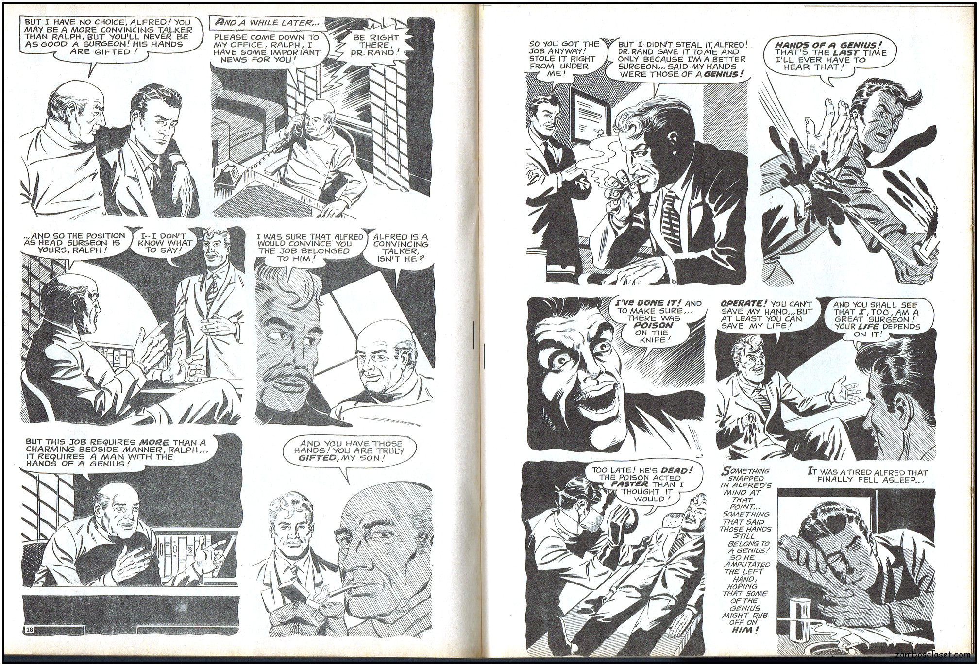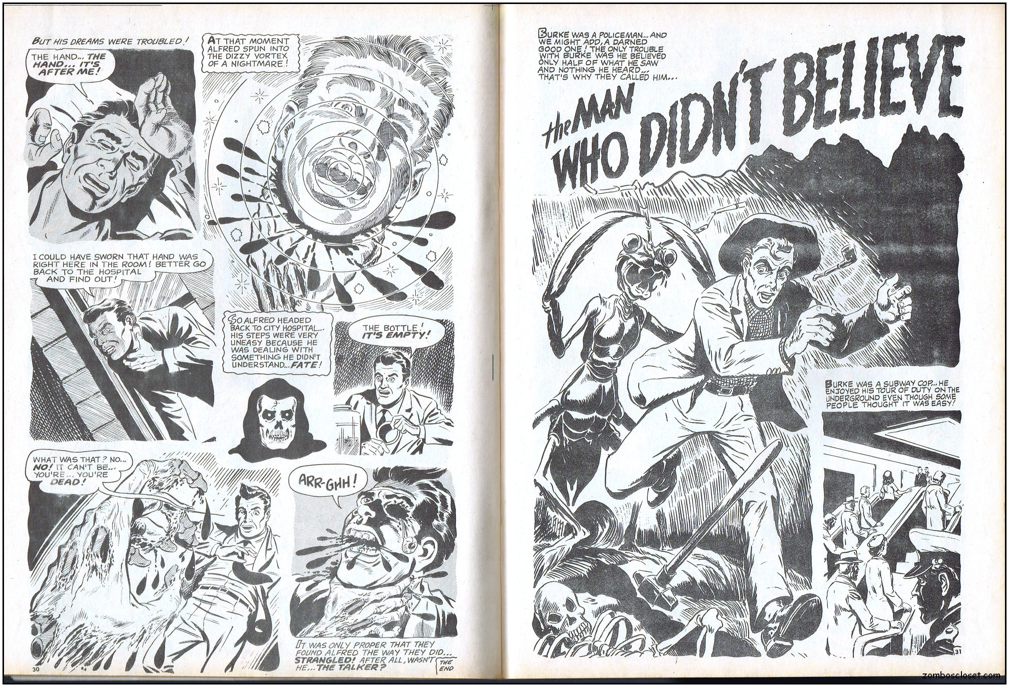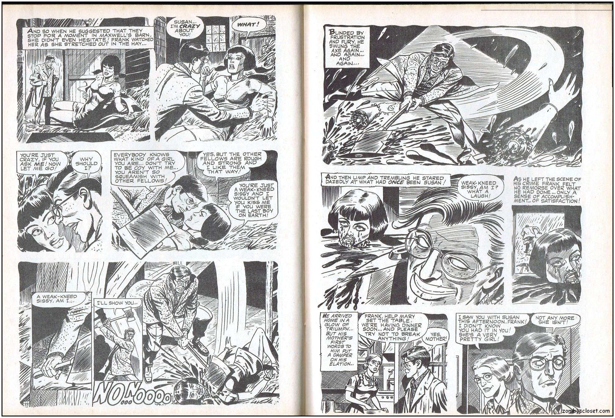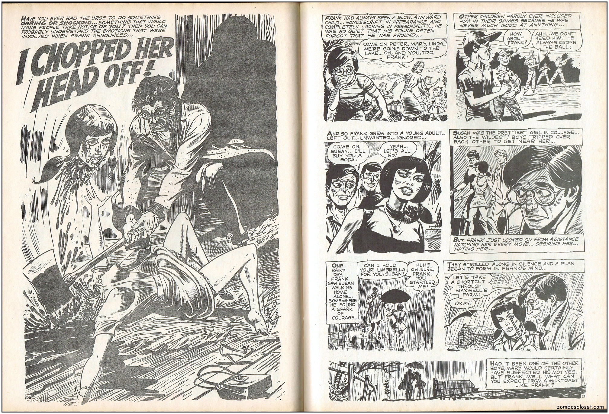 The classic, I Chopped Her Head Off! is in this issue. If you ever wondered why parents and decent citizens (don’t you love that term?) ganged up on the comics industry forcing the bland comics code on us all (but a boon to magazine sales), this one story captures everything you would put on a poster illustrating the evils of comic books. And you can color it in! Yes boys and girls, you too can be seduced by the dark side, just a few color pencils needed. Now that’s one thing I bet you hadn’t thought about. Just print out the pages of this splaterific issue of moral decay and bamm! instant adult coloring book! You can thank me later. Just don’t tell your parents and loved ones where I live. I’ll deny everything.