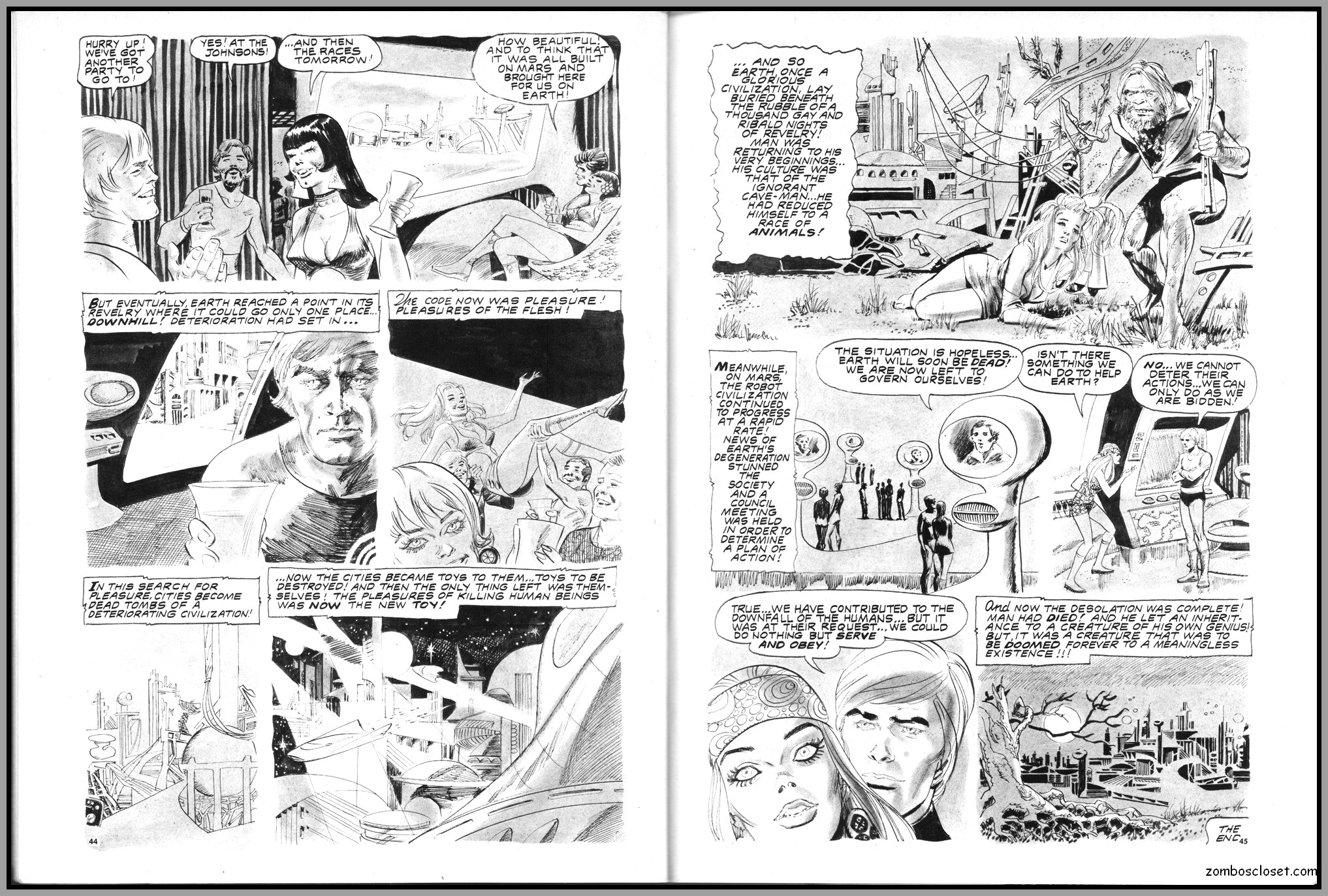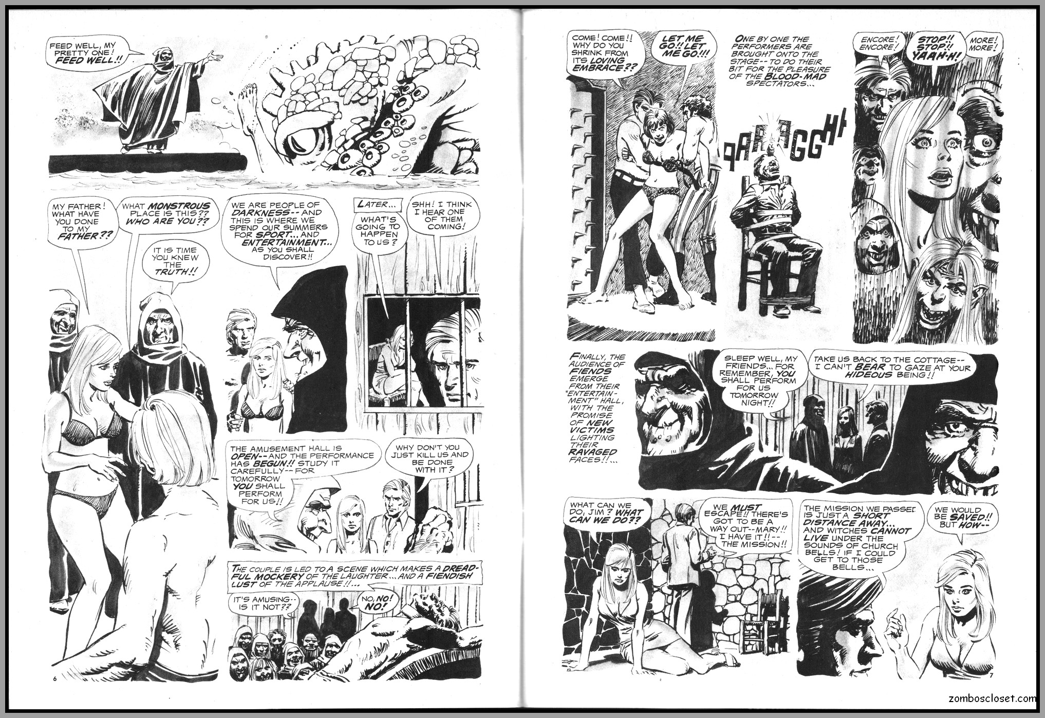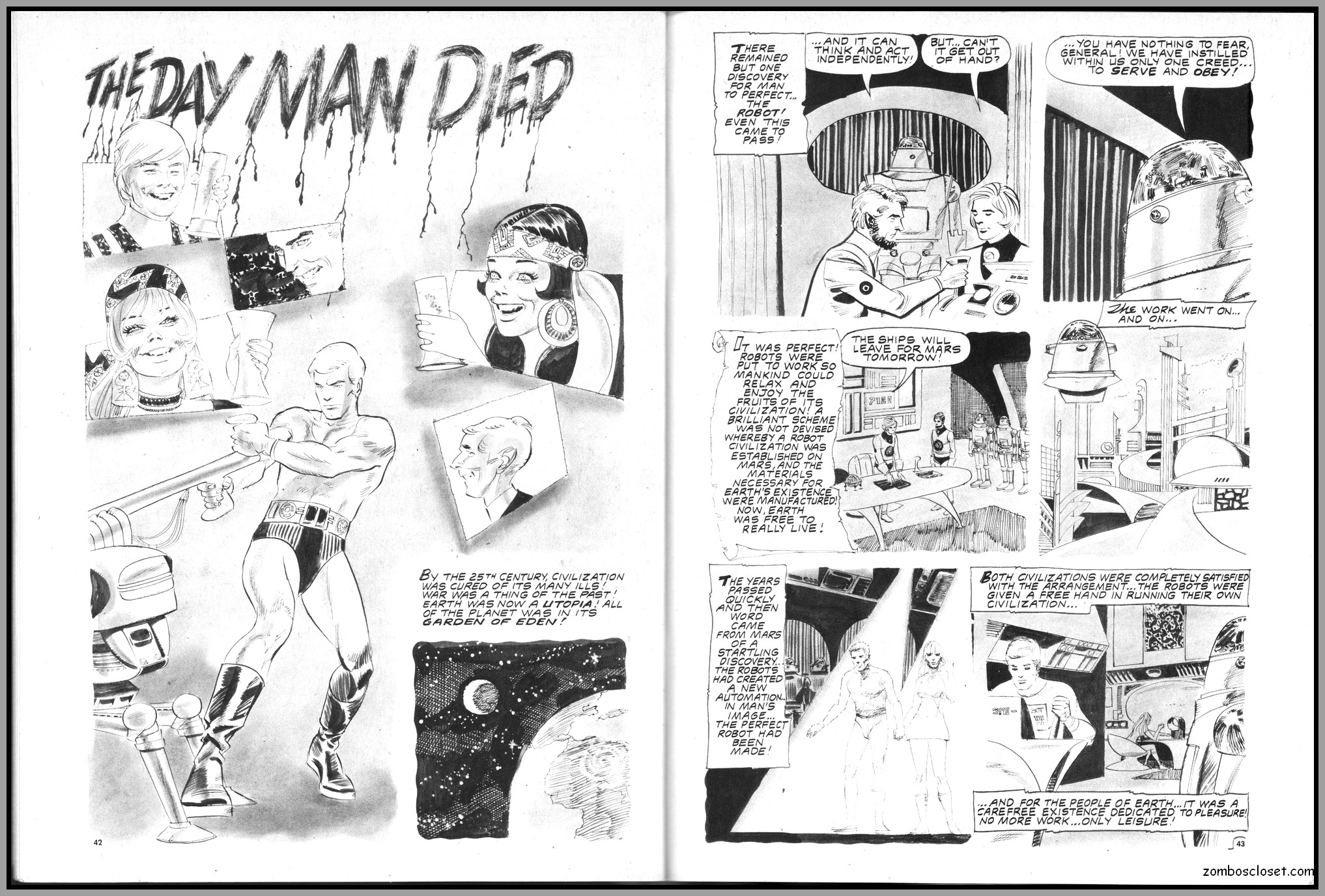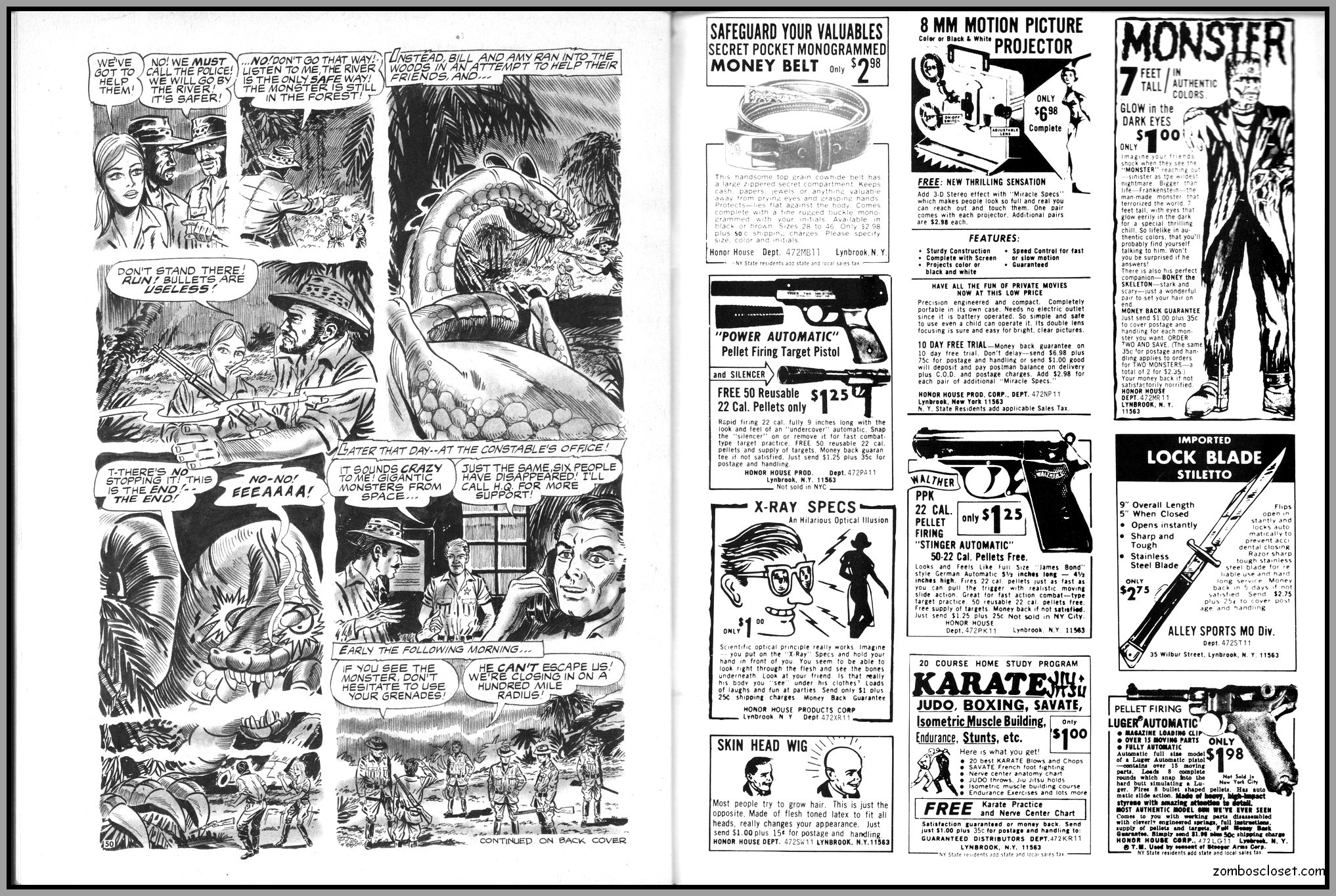 The later issues of Terror Tales, and all other Eerie comics publications, rehashed stories and elements from earlier covers to save money. In this issue, Pool of Horror is reprinted, though I forget from which issue, but hey, enjoy the wonderful black and white art and the usual tropes of political incorrectness (ah, the 1970s), and revel at monsters not caring a wit about it, of course. One story, The Day Man Died, is par for the course of 1960s and 1970s angst about the future, where robots would do all the work. leaving man to idle away his time in endless fun stuff. Seems the writers of these stories forgot the most important thing: You need to buy a robot first, and lord knows how much that will cost. So maybe the story title should have been The Day Those Who Could Afford the Luxury of a Robot Died.