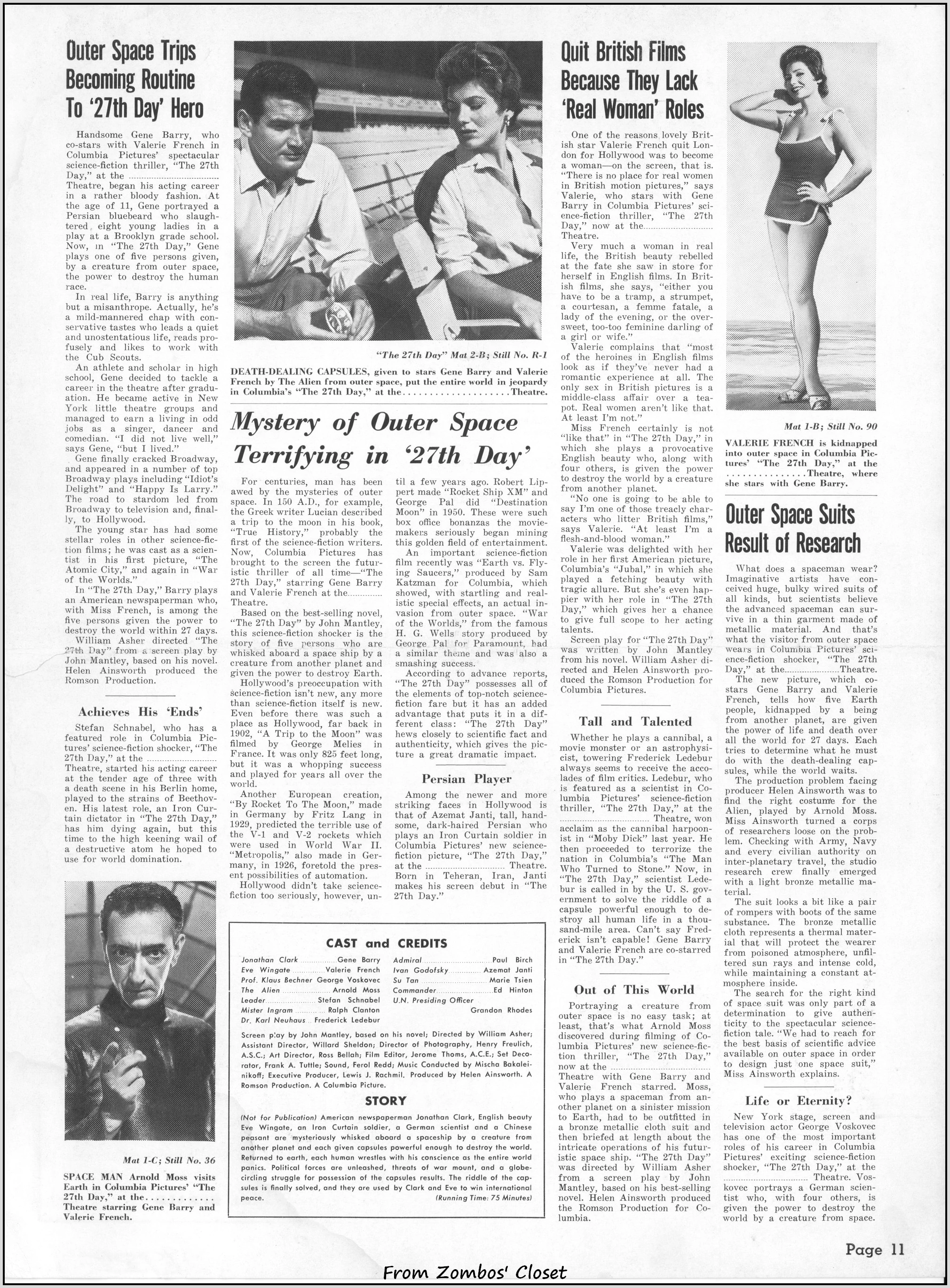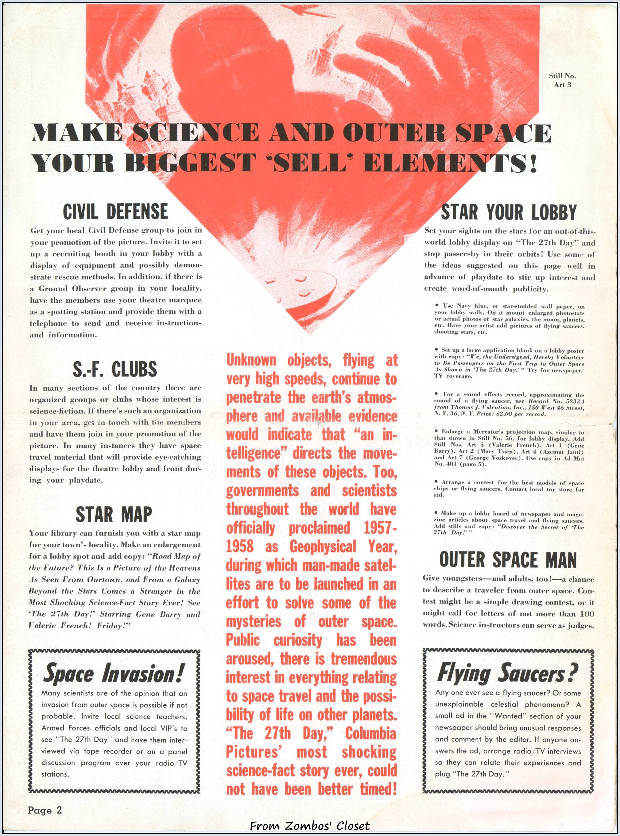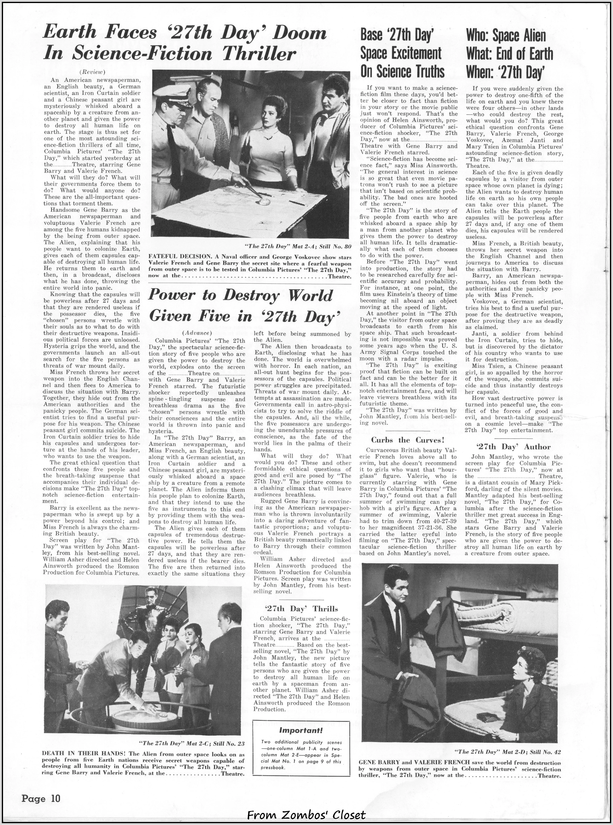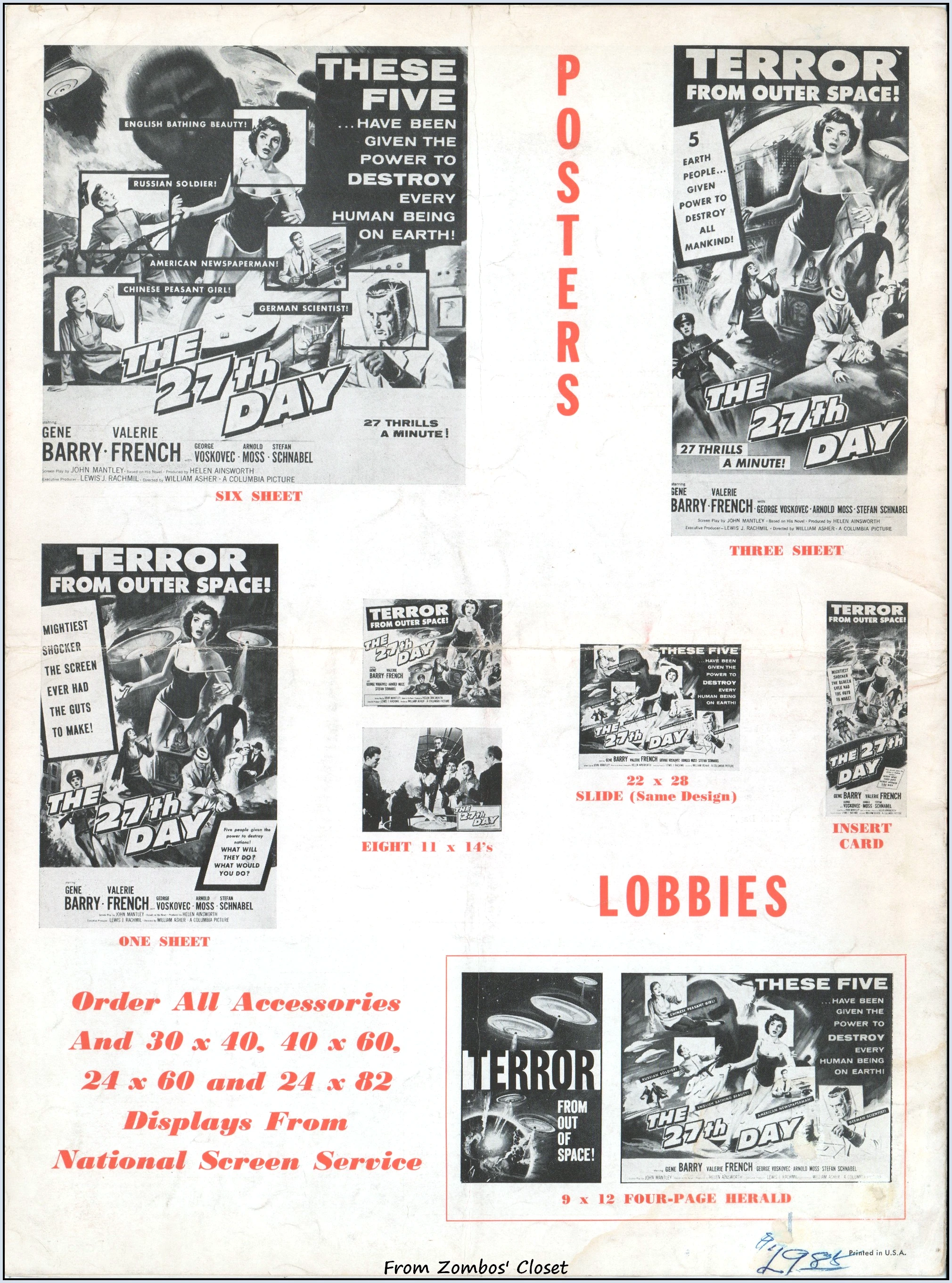 An intriguing movie from the cold war era (or rather, the first one), The 27th Day involves an alien from a dying planet giving five persons the ability to destroy human life on a massive scale. Is it a test? Is it a trick? Directed by William Asher, who did a lot of television-episode directing for I love Lucy and Bewitched, and a screenplay by John Mantley (author of the novel), who went on to write for Gunsmoke, The Wild Wild West, and Buck Rogers in the 25th Century, the story has themes of global destruction, communism, and political tensions that are still relevant today. William Asher also directed the AIP beach party films of the 1960s and a forgotten slasher called Butcher, Baker, Nightmare Maker 1981 (check out Moria for more information). The one shot of the alien spaceship interior is taken from Earth vs. The Flying Saucers (both that movie and this one were produced by Columbia).